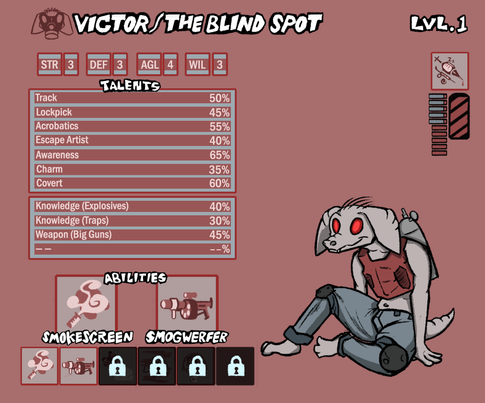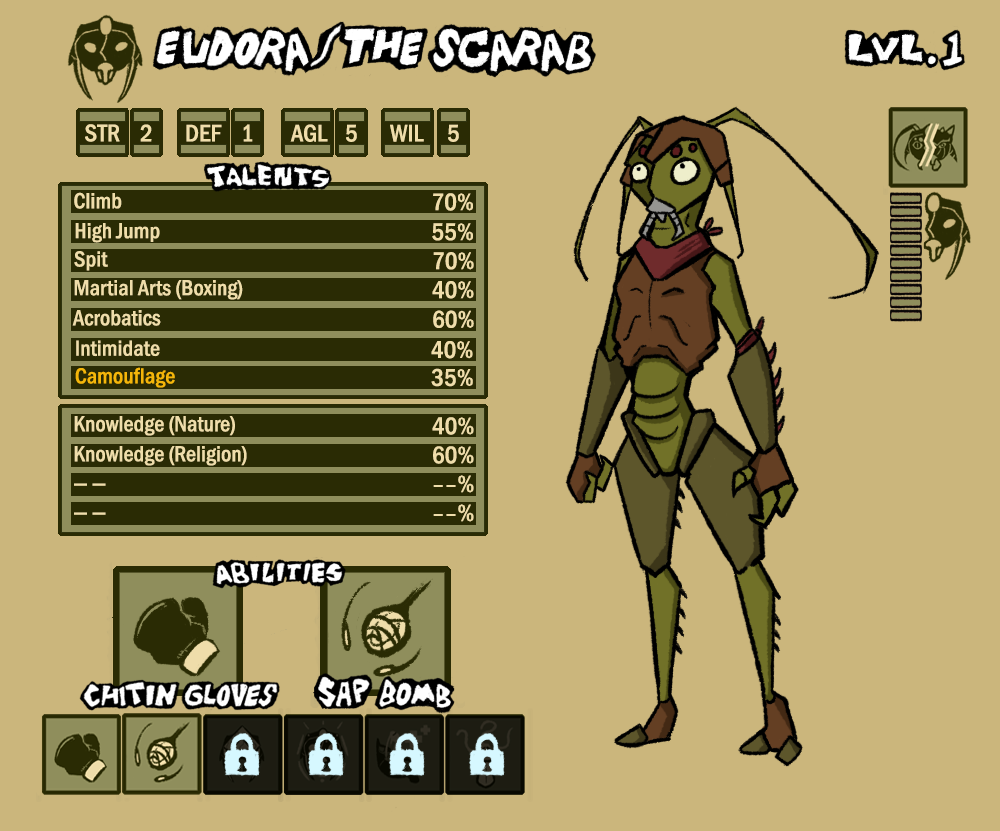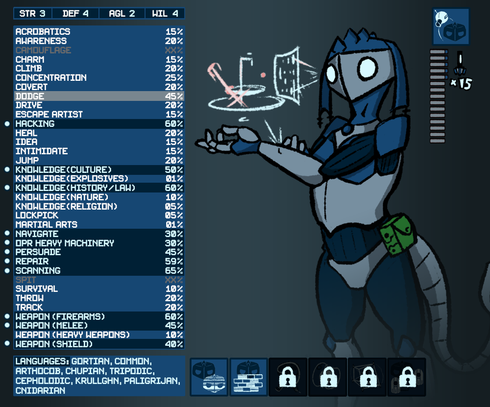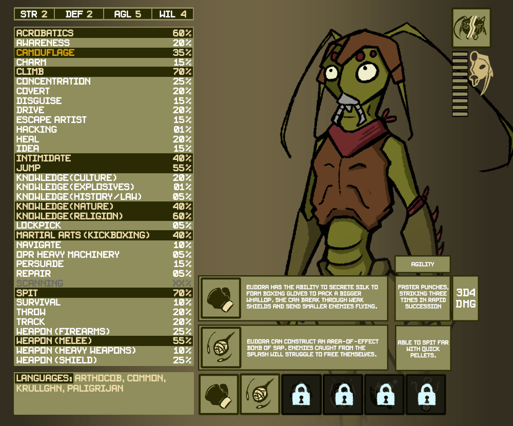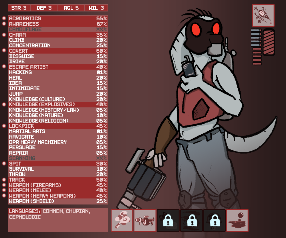 I'm changing things bit by bit, but I believe this could be pretty useful. Pretty much all characters have basic general knowledge and skills. A toughie like Eudora should still have a chance at charming and hacking—even if it's slim—but that's the fun in it. Nothing ventured, nothing gained.