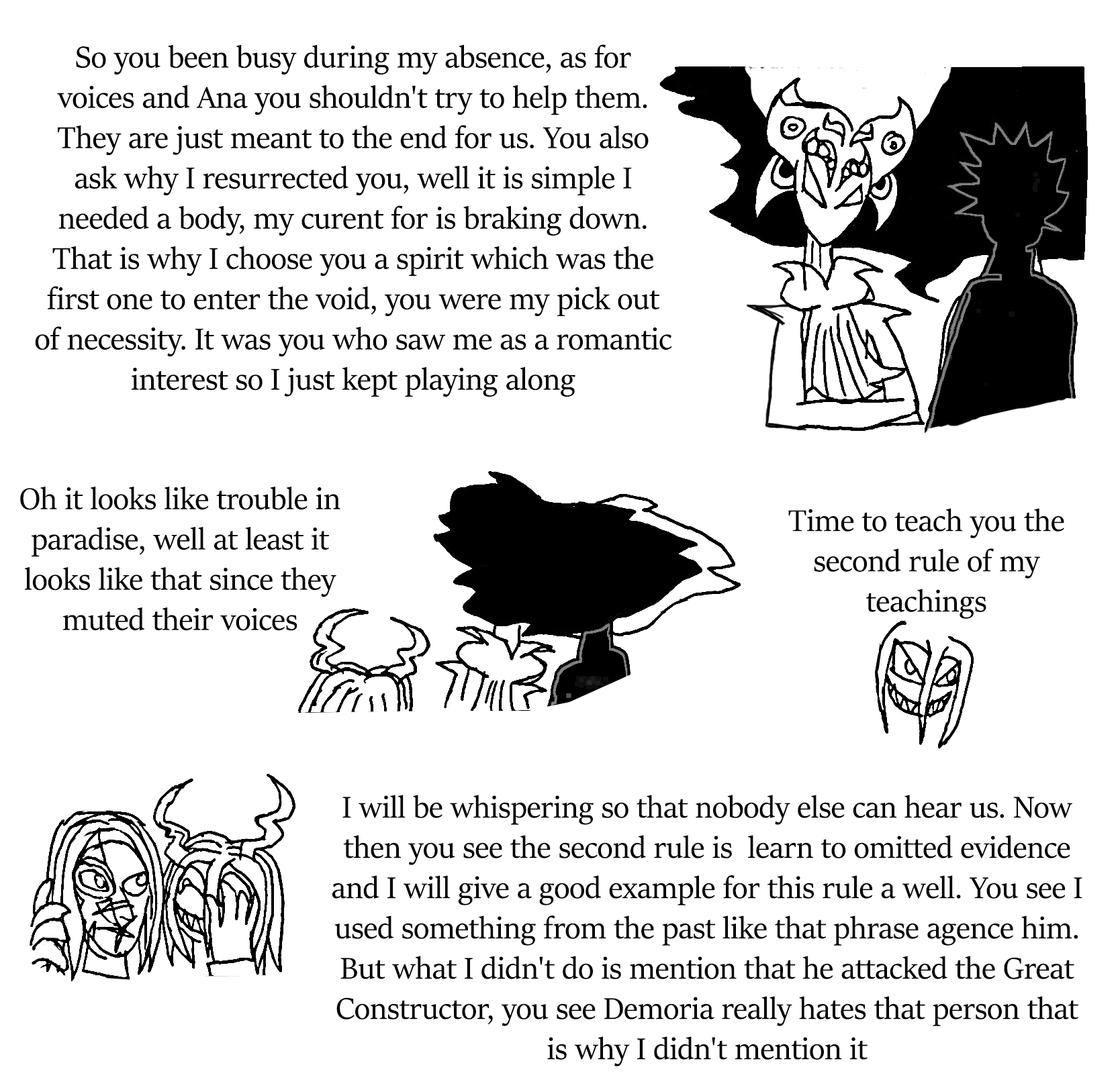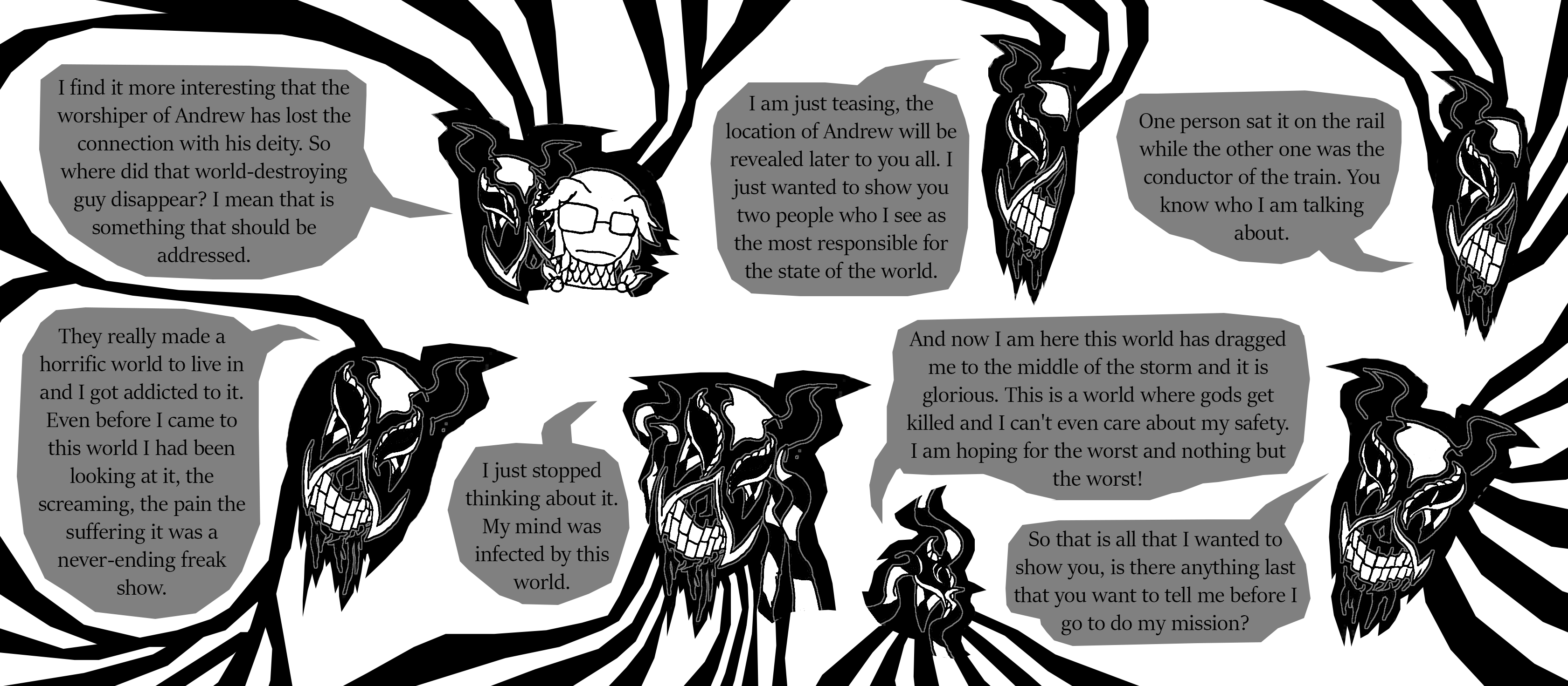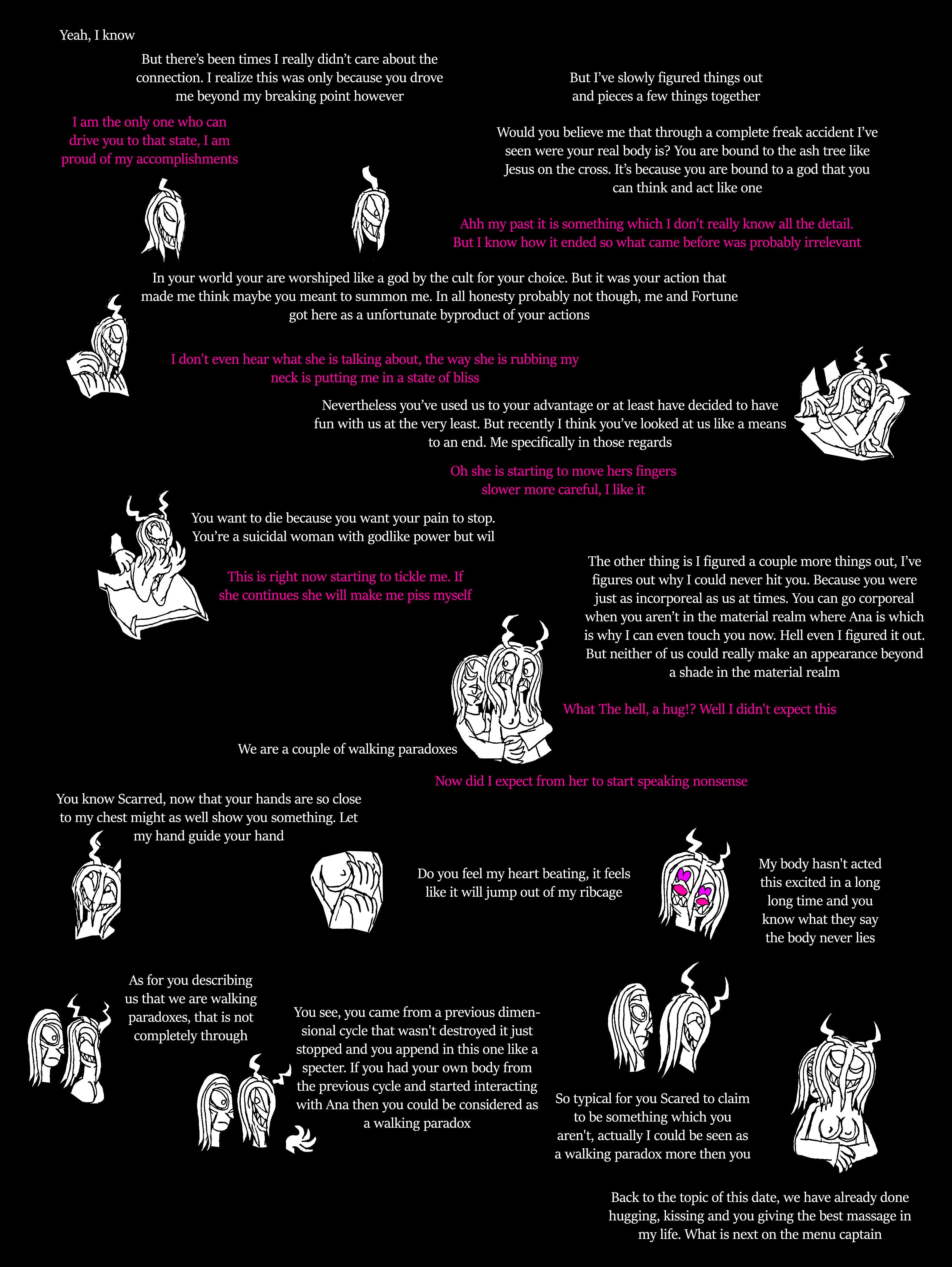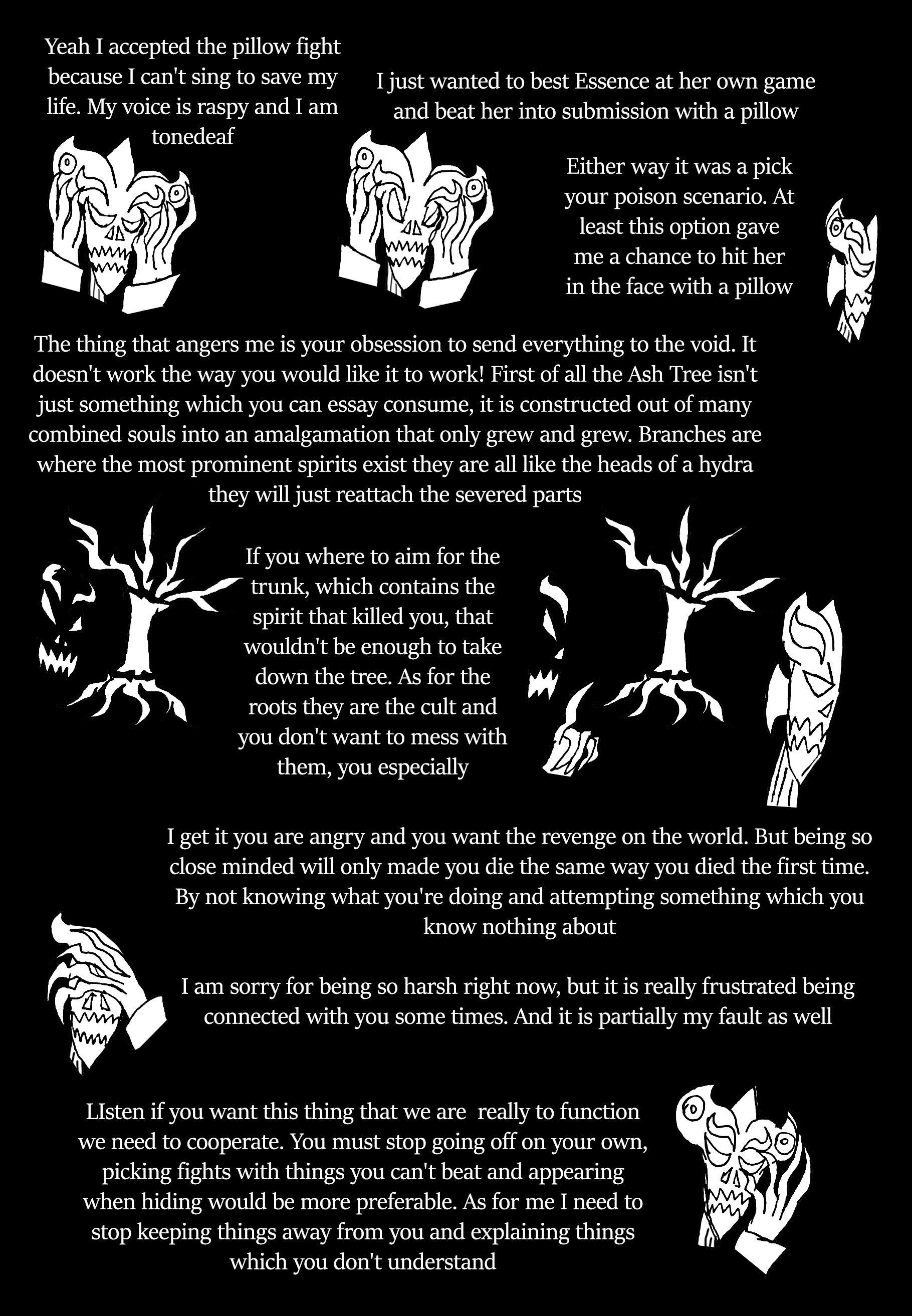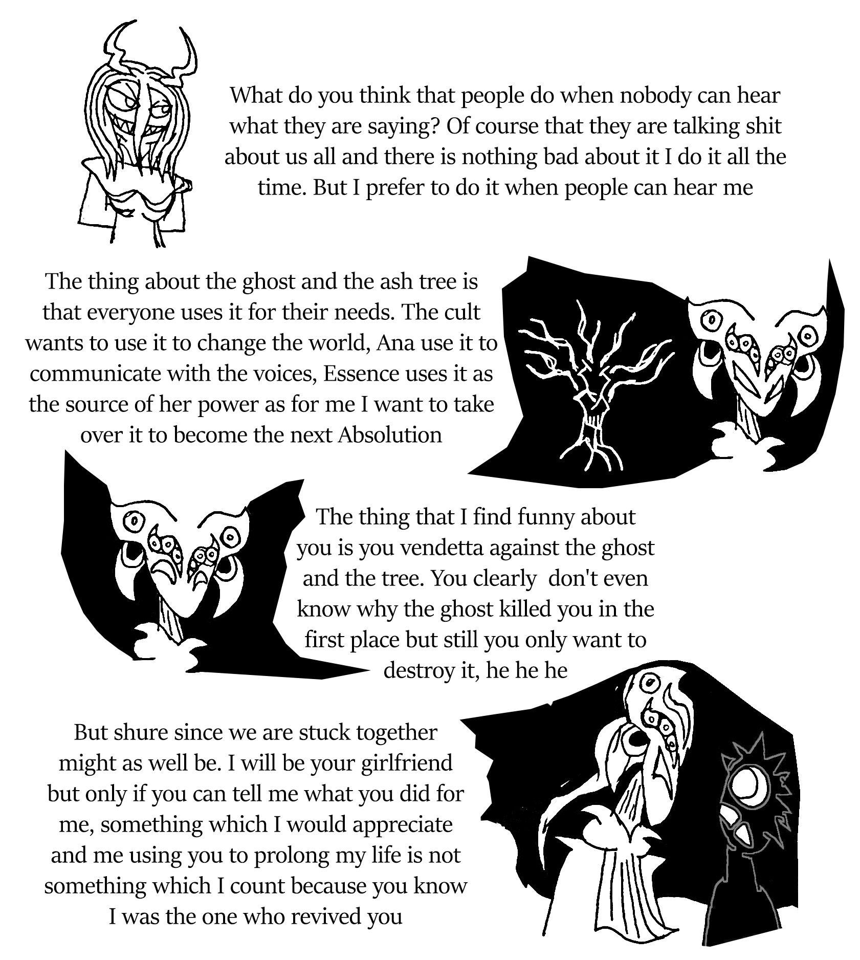 Continuing with the recap, we start with Ana's story. Something, or someone has hijacked her exit from the Astral plane and she see a dream of someone who has a dream of chopping down a tree, but then the tree retaliates and makes the lumberjack a part of itself. The lumberjack awakens and knows "they must protect her at any cost." Remember this "lumberjack" because they will be important later and cause a shit load of trouble for Scarred and Fortune. Speaking of our intrepid duo, the two of them after seeing the events of the side quests have a meeting with the real master of the black fog and the true leader of the Acolytes of the Ash Tree, the demon known as Andrew Goodwill. He makes it clear that the Ash Tree demon is basically his bitch and he uses him like a weapon to fuel his own dark designs, he also reveals that he wanted to punish Root for going against certain order as killing Absolution was not his wish, and that he was the one who granted Scarred and Fortune bodies to beat the shit out of Clara. Andrew then offers Scarred and Fortune a choice of who they would like to see die, for no other reason than his own amusement. However in defiance of him they chose none of them and instead pick someone entirely random (intending for Andrew to pick himself) as they don't want to hurt anyone. However the joke is on them because instead he picks Wildcat, the Curator attached to Ana. They quickly make a bargain for his life, but Andrew proposes a new idea, he takes over Ana's body to further punish Root. Both them promptly refuse, so in order to defuse the situation and save Wild Cat (who I will refer to as WC from here on) they all start to tell some really dirty jokes in order to save him, only highlighting how capricious Andrew Goodwill really is. Scarred comes in handy here as she tells one about a guy fucking a cow to death as well as "The Aristocrats Joke," often considered the dirtiest joke in existence (see here for what she said: https://www.youtube.com/watch?v=aGA0dIz9-Wk) The joke is so filthy that Andrew lets WC live. They all swap some jokes, and Andrew leaves in good humor and WC promises to do his best to help Ana. Andrew returns to Root and warns him to not get so high and mighty again.