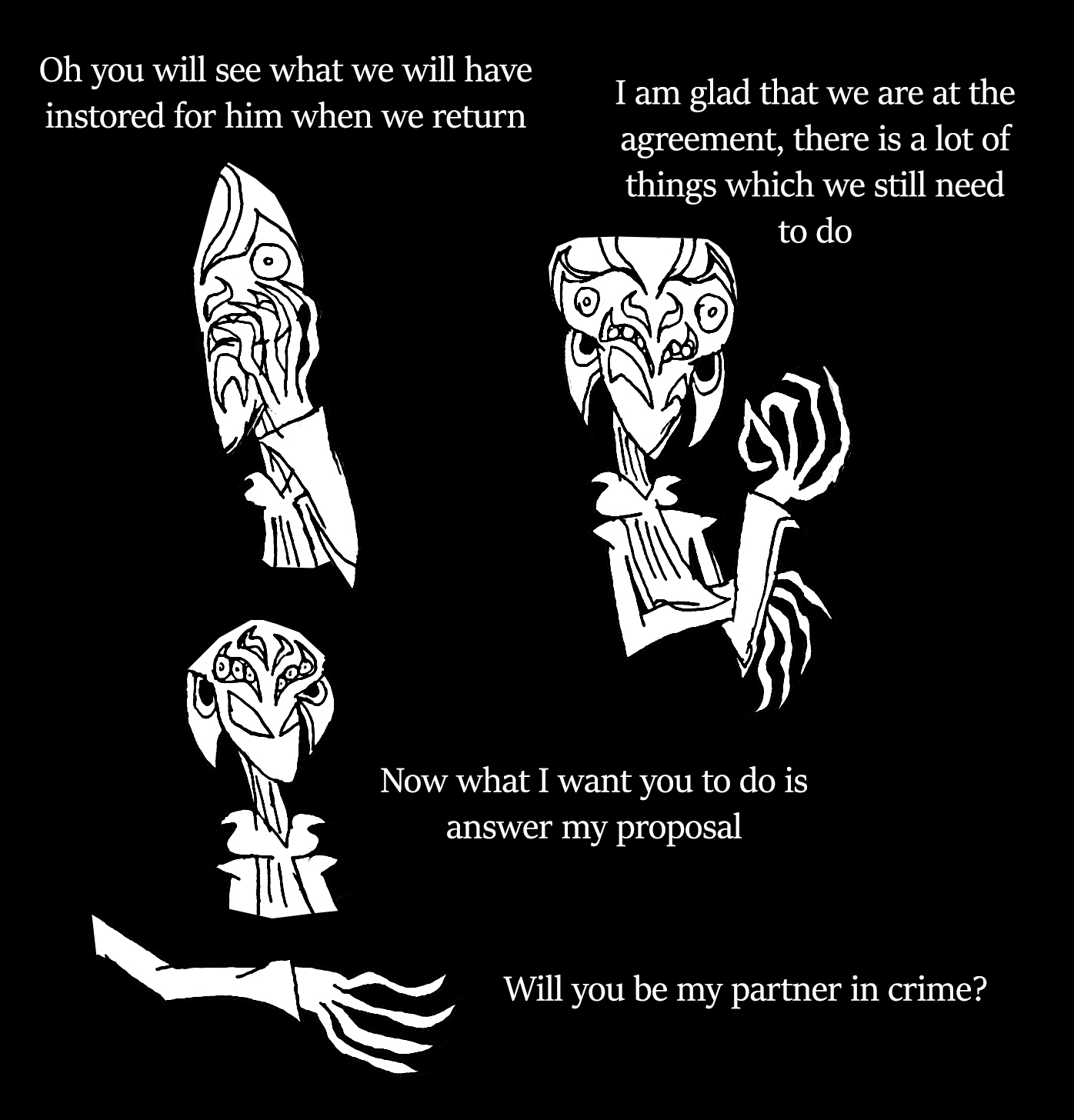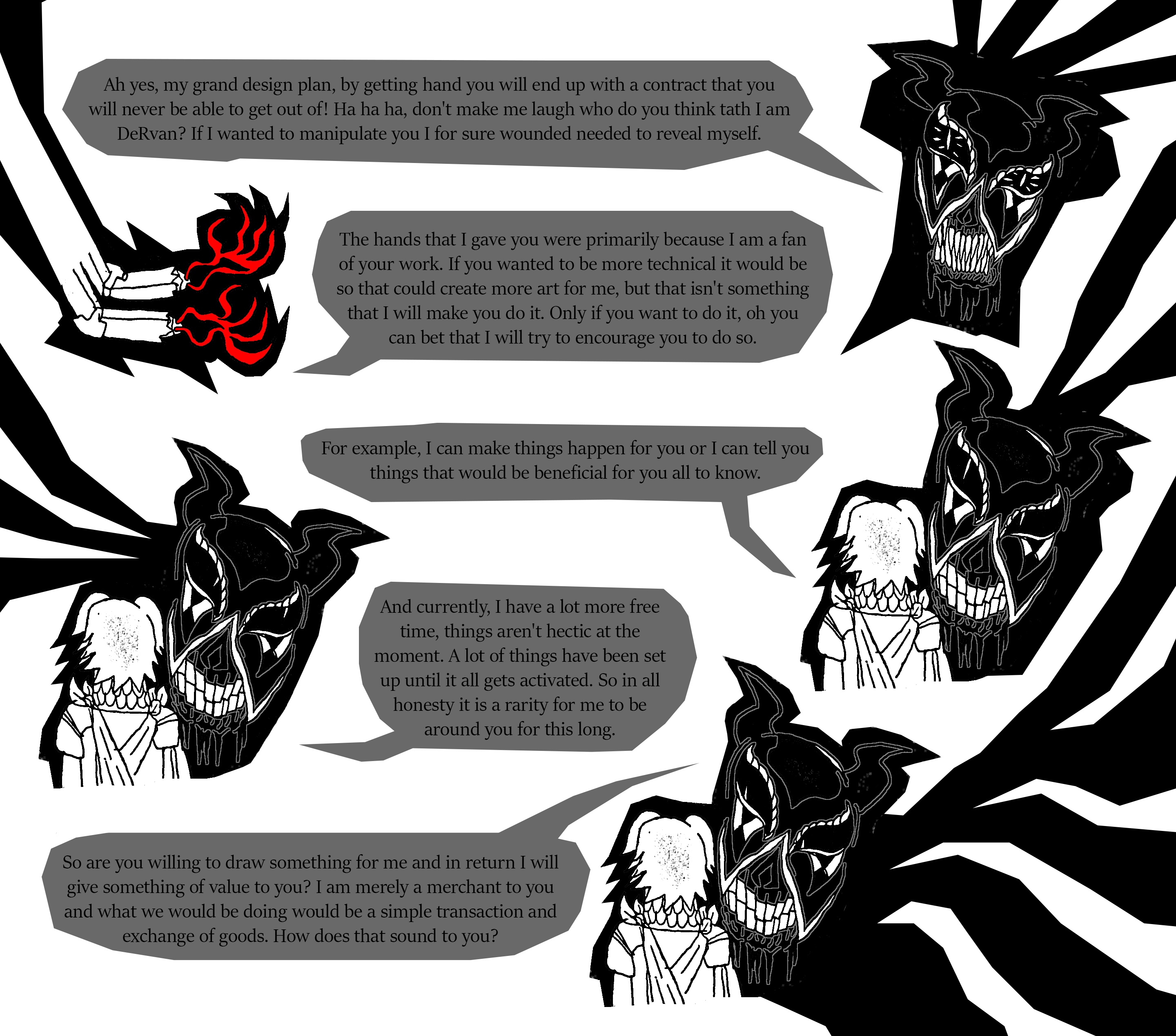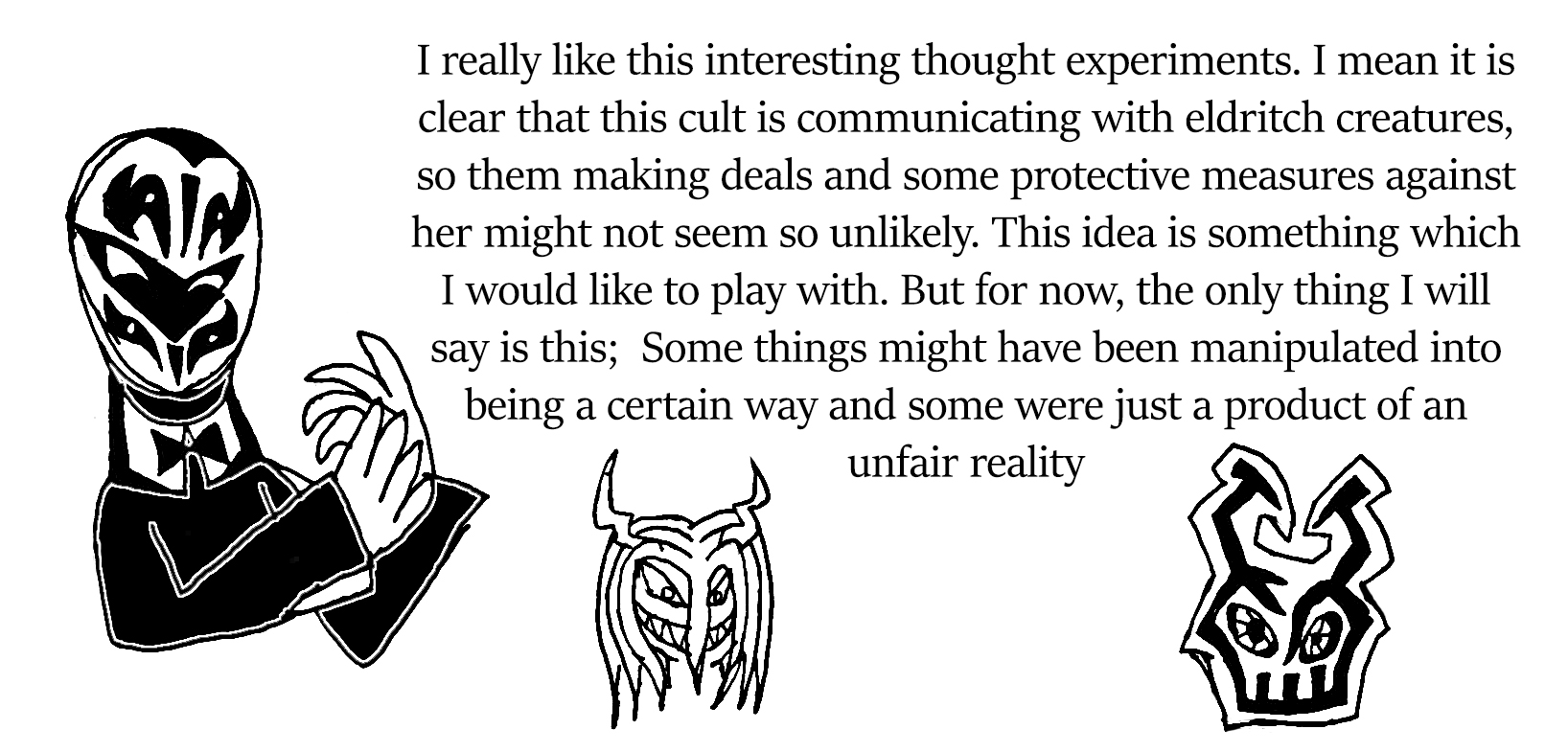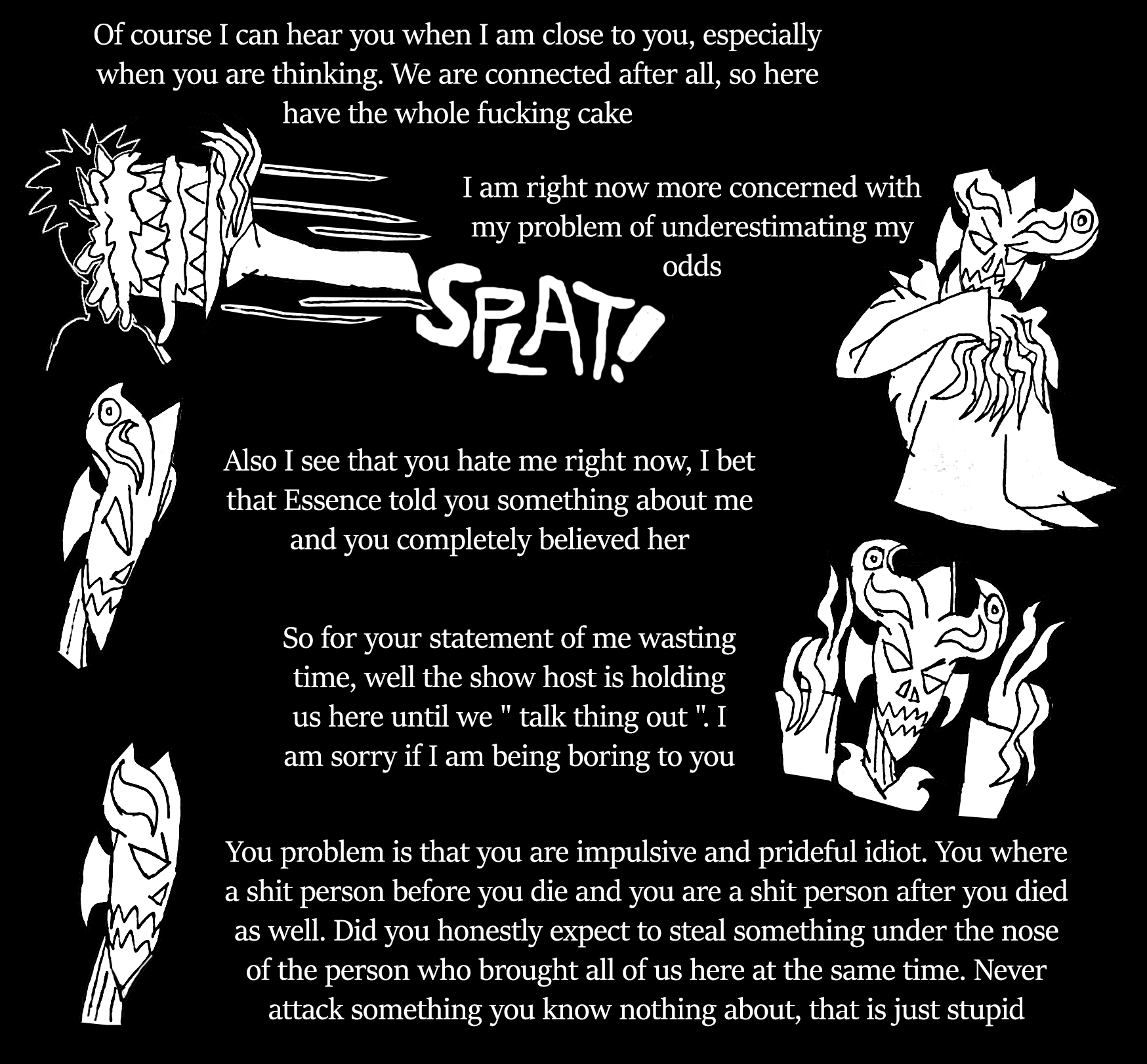 Continuing with the recap, we start with Ana's story. Something, or someone has hijacked her exit from the Astral plane and she see a dream of someone who has a dream of chopping down a tree, but then the tree retaliates and makes the lumberjack a part of itself. The lumberjack awakens and knows "they must protect her at any cost." Remember this "lumberjack" because they will be important later and cause a shit load of trouble for Scarred and Fortune. Speaking of our intrepid duo, the two of them after seeing the events of the side quests have a meeting with the real master of the black fog and the true leader of the Acolytes of the Ash Tree, the demon known as Andrew Goodwill. He makes it clear that the Ash Tree demon is basically his bitch and he uses him like a weapon to fuel his own dark designs, he also reveals that he wanted to punish Root for going against certain order as killing Absolution was not his wish, and that he was the one who granted Scarred and Fortune bodies to beat the shit out of Clara. Andrew then offers Scarred and Fortune a choice of who they would like to see die, for no other reason than his own amusement. However in defiance of him they chose none of them and instead pick someone entirely random (intending for Andrew to pick himself) as they don't want to hurt anyone. However the joke is on them because instead he picks Wildcat, the Curator attached to Ana. They quickly make a bargain for his life, but Andrew proposes a new idea, he takes over Ana's body to further punish Root. Both them promptly refuse, so in order to defuse the situation and save Wild Cat (who I will refer to as WC from here on) they all start to tell some really dirty jokes in order to save him, only highlighting how capricious Andrew Goodwill really is. Scarred comes in handy here as she tells one about a guy fucking a cow to death as well as "The Aristocrats Joke," often considered the dirtiest joke in existence (see here for what she said: https://www.youtube.com/watch?v=aGA0dIz9-Wk) The joke is so filthy that Andrew lets WC live. They all swap some jokes, and Andrew leaves in good humor and WC promises to do his best to help Ana. Andrew returns to Root and warns him to not get so high and mighty again.