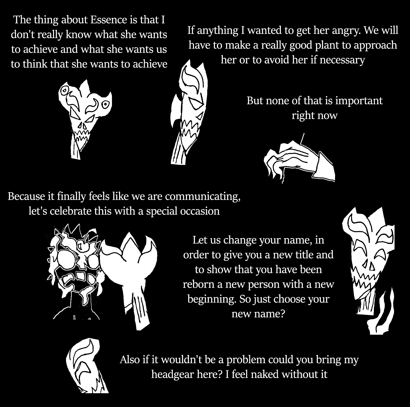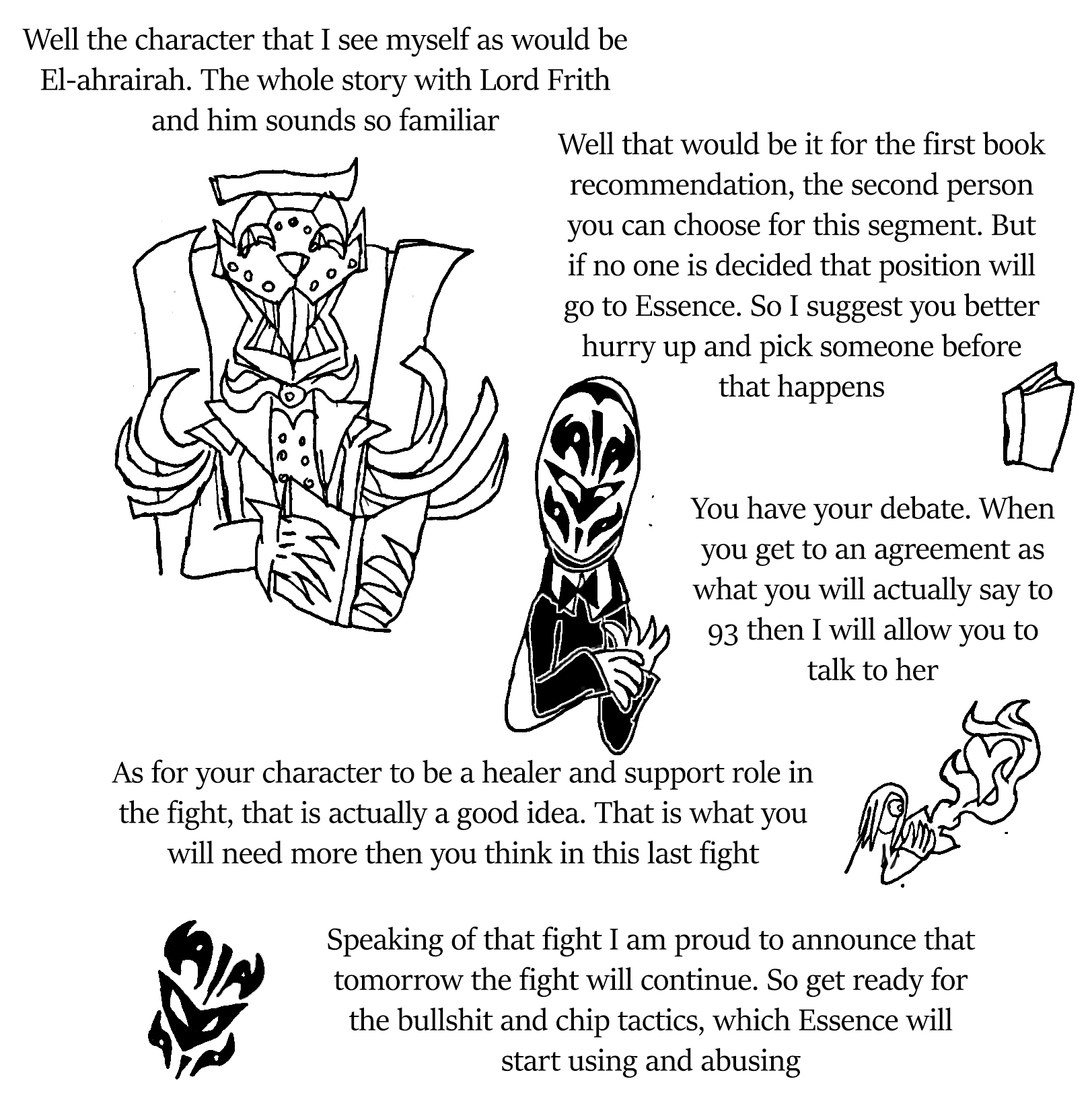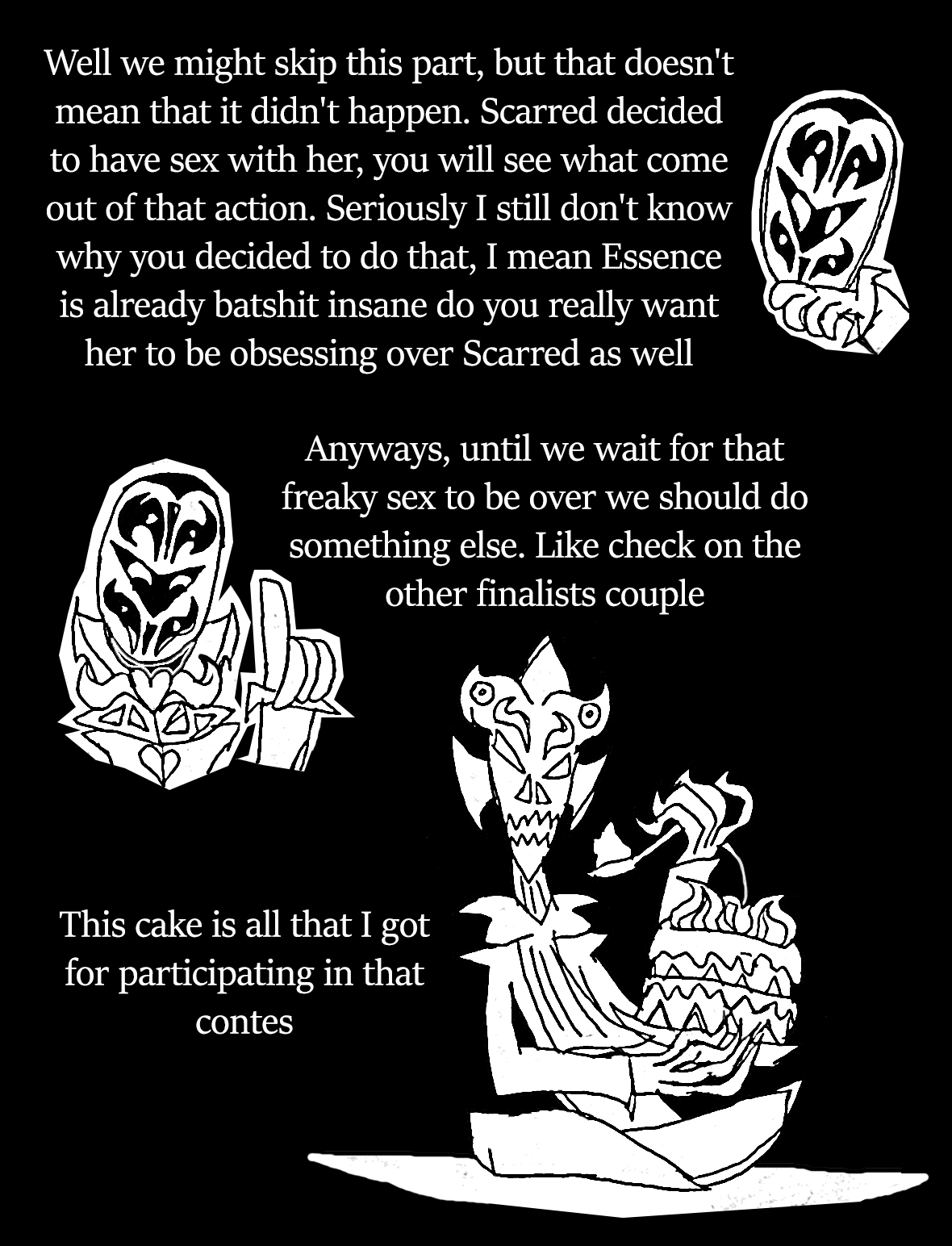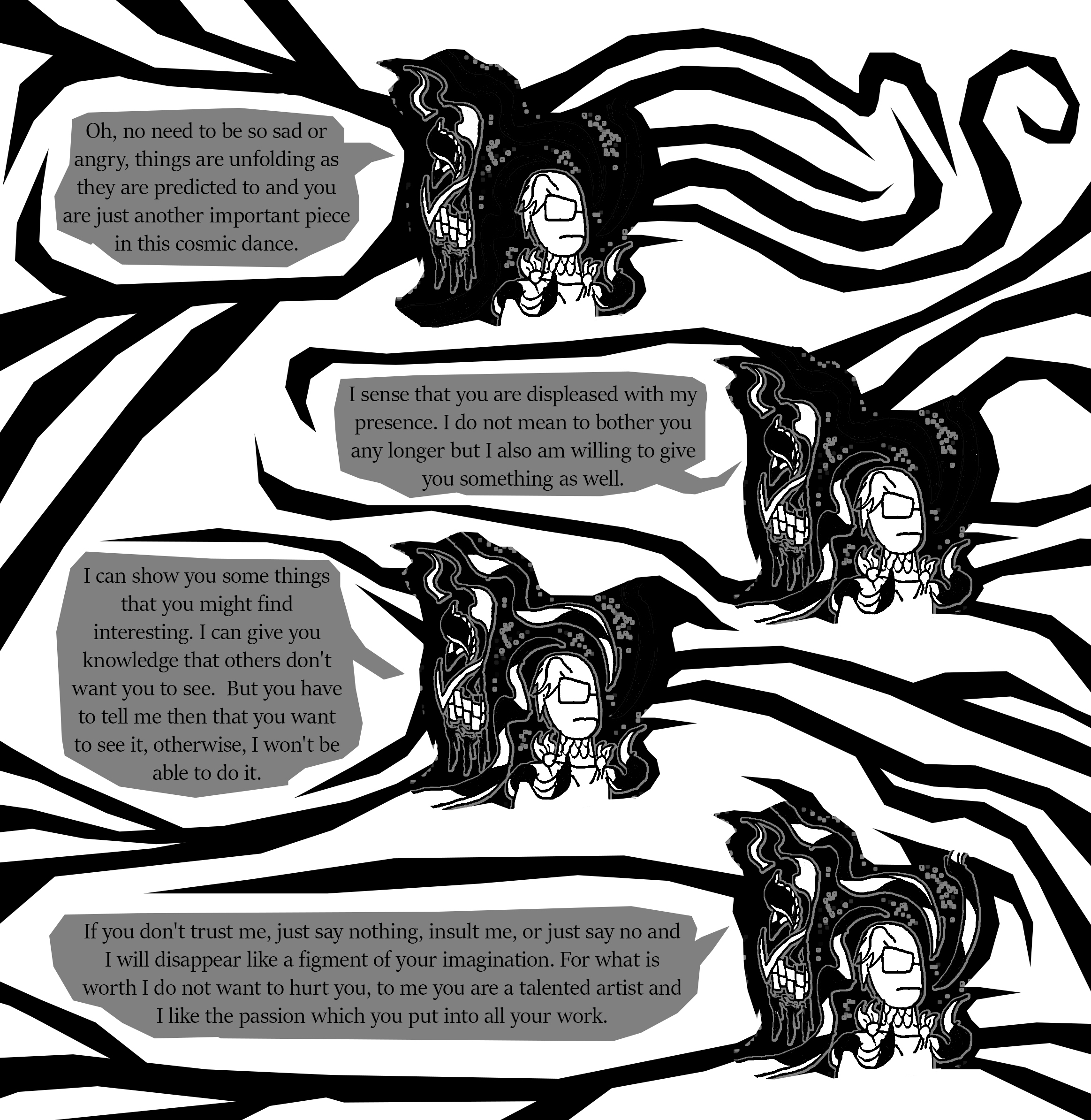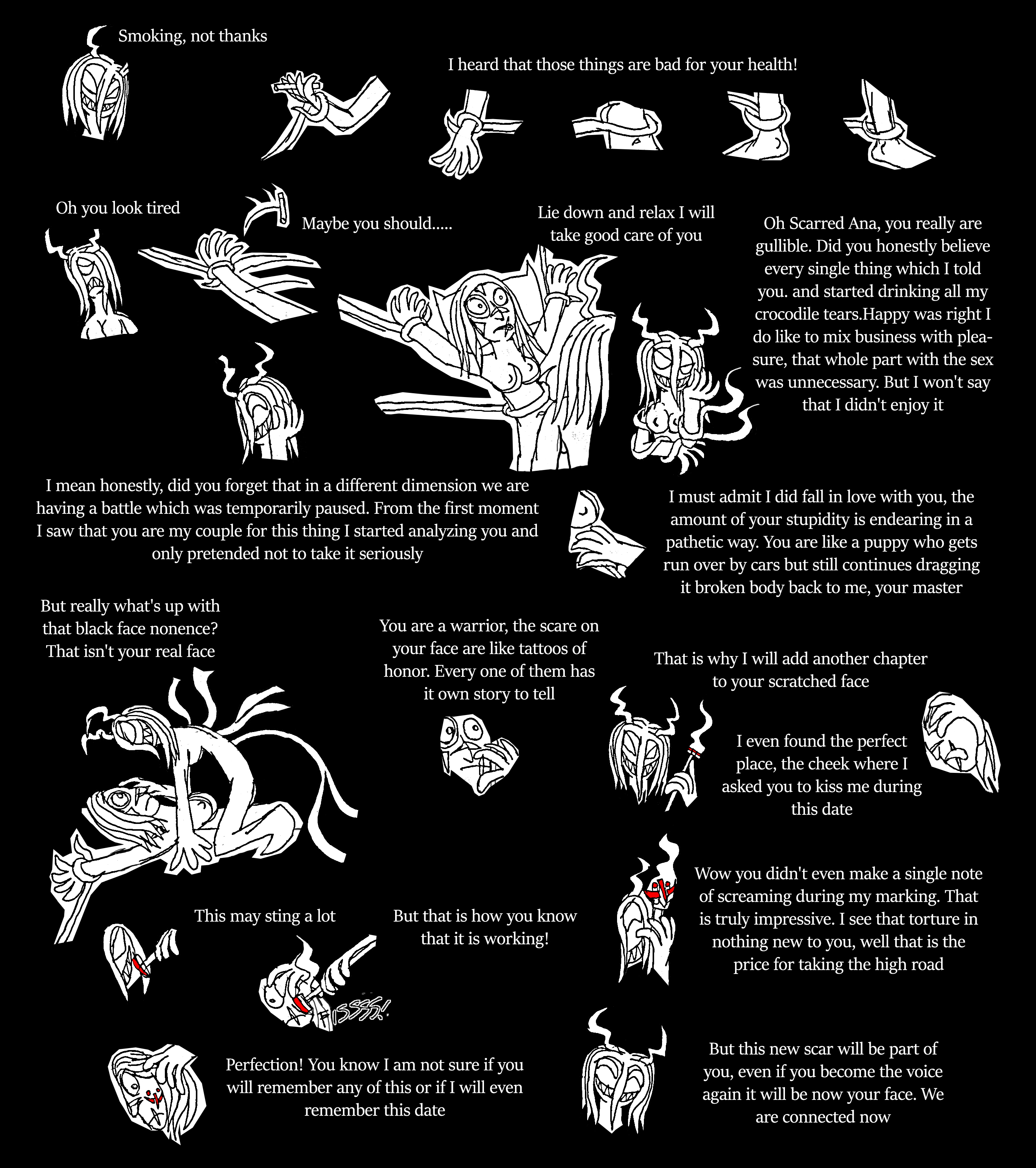 Continuing with the recap, we start with Ana's story. Something, or someone has hijacked her exit from the Astral plane and she see a dream of someone who has a dream of chopping down a tree, but then the tree retaliates and makes the lumberjack a part of itself. The lumberjack awakens and knows "they must protect her at any cost." Remember this "lumberjack" because they will be important later and cause a shit load of trouble for Scarred and Fortune. Speaking of our intrepid duo, the two of them after seeing the events of the side quests have a meeting with the real master of the black fog and the true leader of the Acolytes of the Ash Tree, the demon known as Andrew Goodwill. He makes it clear that the Ash Tree demon is basically his bitch and he uses him like a weapon to fuel his own dark designs, he also reveals that he wanted to punish Root for going against certain order as killing Absolution was not his wish, and that he was the one who granted Scarred and Fortune bodies to beat the shit out of Clara. Andrew then offers Scarred and Fortune a choice of who they would like to see die, for no other reason than his own amusement. However in defiance of him they chose none of them and instead pick someone entirely random (intending for Andrew to pick himself) as they don't want to hurt anyone. However the joke is on them because instead he picks Wildcat, the Curator attached to Ana. They quickly make a bargain for his life, but Andrew proposes a new idea, he takes over Ana's body to further punish Root. Both them promptly refuse, so in order to defuse the situation and save Wild Cat (who I will refer to as WC from here on) they all start to tell some really dirty jokes in order to save him, only highlighting how capricious Andrew Goodwill really is. Scarred comes in handy here as she tells one about a guy fucking a cow to death as well as "The Aristocrats Joke," often considered the dirtiest joke in existence (see here for what she said: https://www.youtube.com/watch?v=aGA0dIz9-Wk) The joke is so filthy that Andrew lets WC live. They all swap some jokes, and Andrew leaves in good humor and WC promises to do his best to help Ana. Andrew returns to Root and warns him to not get so high and mighty again.