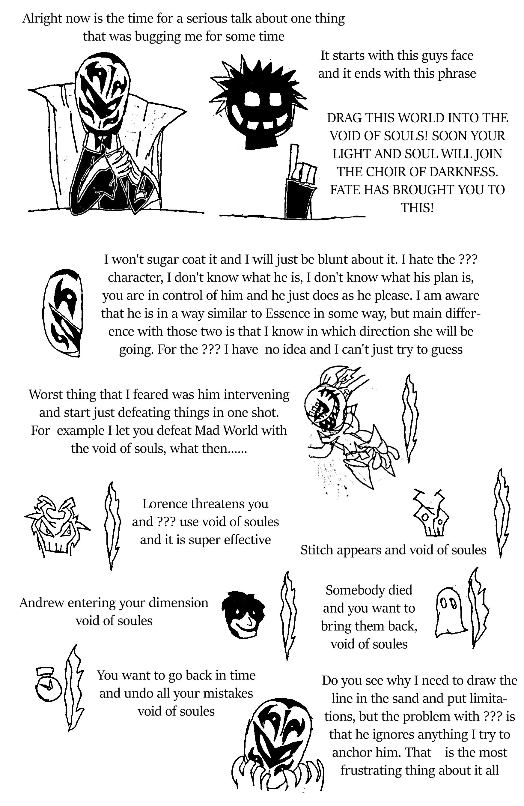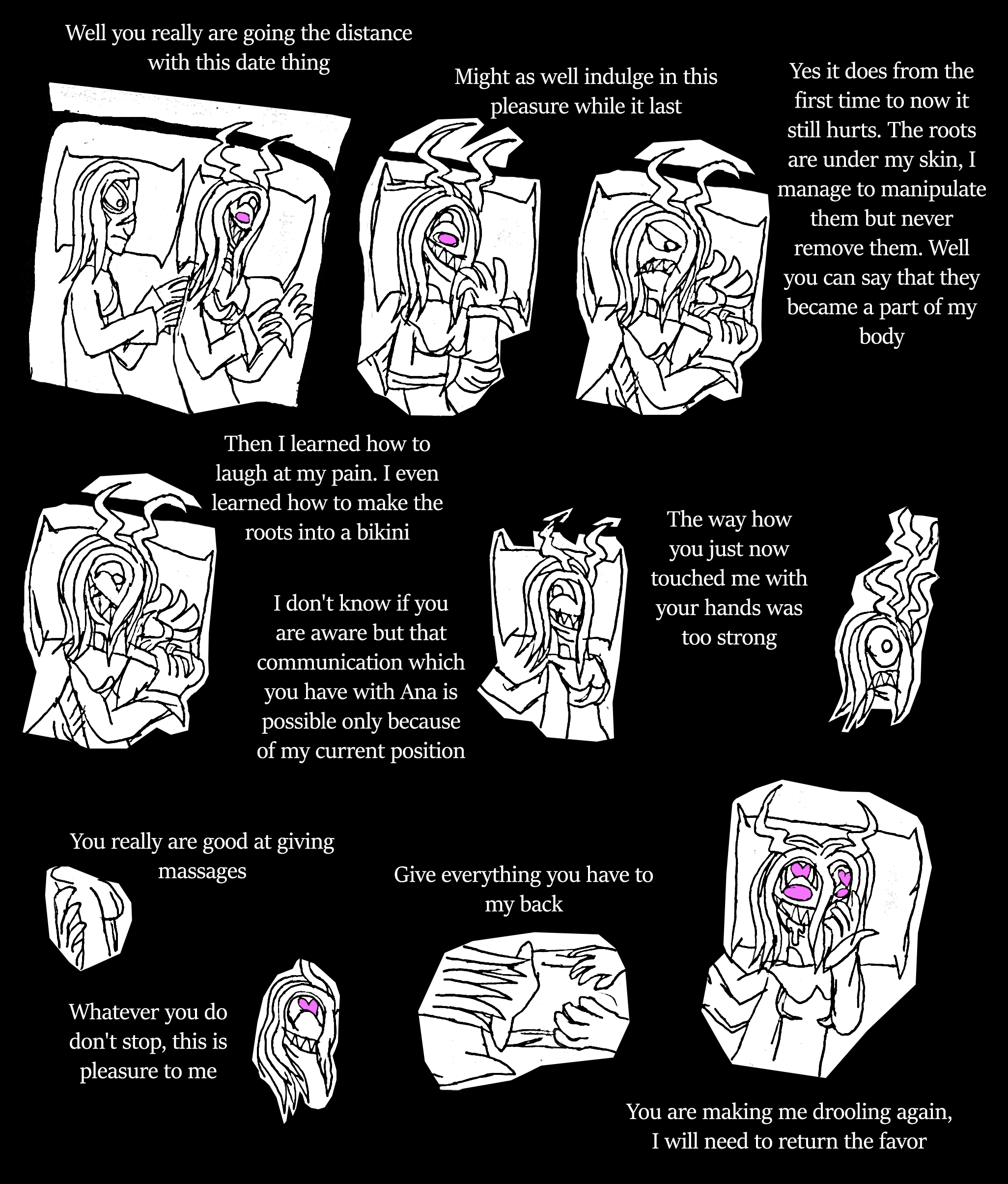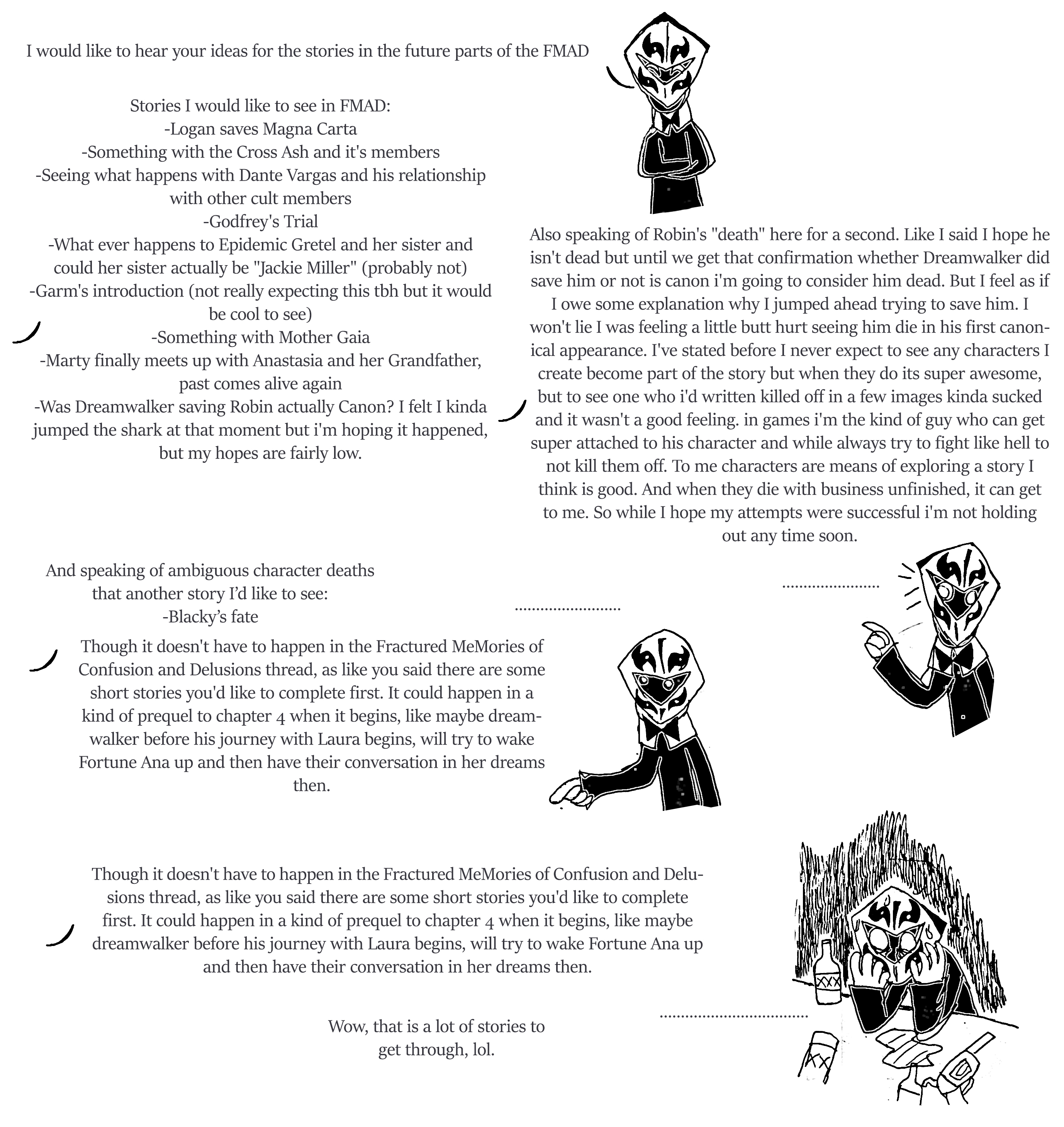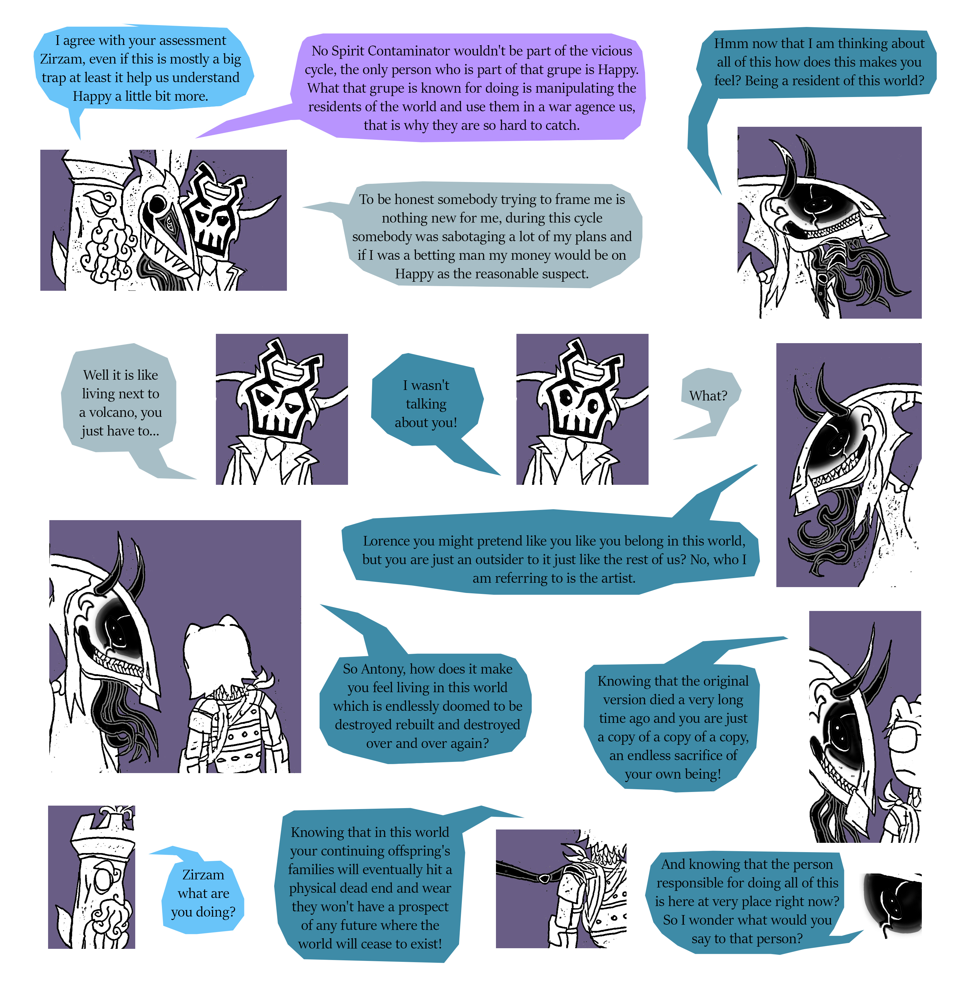 Continuing with the recap, we start with Ana's story. Something, or someone has hijacked her exit from the Astral plane and she see a dream of someone who has a dream of chopping down a tree, but then the tree retaliates and makes the lumberjack a part of itself. The lumberjack awakens and knows "they must protect her at any cost." Remember this "lumberjack" because they will be important later and cause a shit load of trouble for Scarred and Fortune. Speaking of our intrepid duo, the two of them after seeing the events of the side quests have a meeting with the real master of the black fog and the true leader of the Acolytes of the Ash Tree, the demon known as Andrew Goodwill. He makes it clear that the Ash Tree demon is basically his bitch and he uses him like a weapon to fuel his own dark designs, he also reveals that he wanted to punish Root for going against certain order as killing Absolution was not his wish, and that he was the one who granted Scarred and Fortune bodies to beat the shit out of Clara. Andrew then offers Scarred and Fortune a choice of who they would like to see die, for no other reason than his own amusement. However in defiance of him they chose none of them and instead pick someone entirely random (intending for Andrew to pick himself) as they don't want to hurt anyone. However the joke is on them because instead he picks Wildcat, the Curator attached to Ana. They quickly make a bargain for his life, but Andrew proposes a new idea, he takes over Ana's body to further punish Root. Both them promptly refuse, so in order to defuse the situation and save Wild Cat (who I will refer to as WC from here on) they all start to tell some really dirty jokes in order to save him, only highlighting how capricious Andrew Goodwill really is. Scarred comes in handy here as she tells one about a guy fucking a cow to death as well as "The Aristocrats Joke," often considered the dirtiest joke in existence (see here for what she said: https://www.youtube.com/watch?v=aGA0dIz9-Wk) The joke is so filthy that Andrew lets WC live. They all swap some jokes, and Andrew leaves in good humor and WC promises to do his best to help Ana. Andrew returns to Root and warns him to not get so high and mighty again.