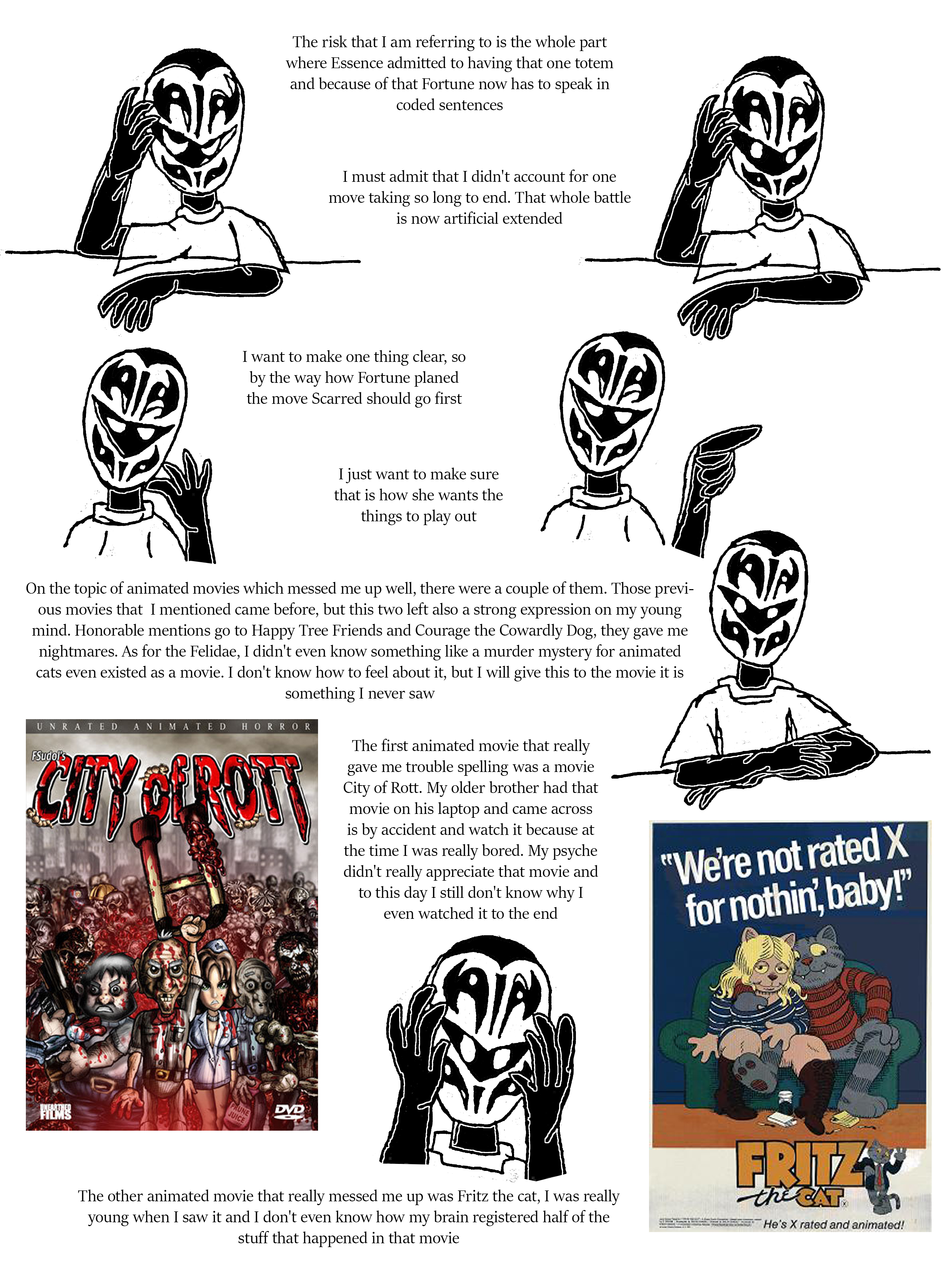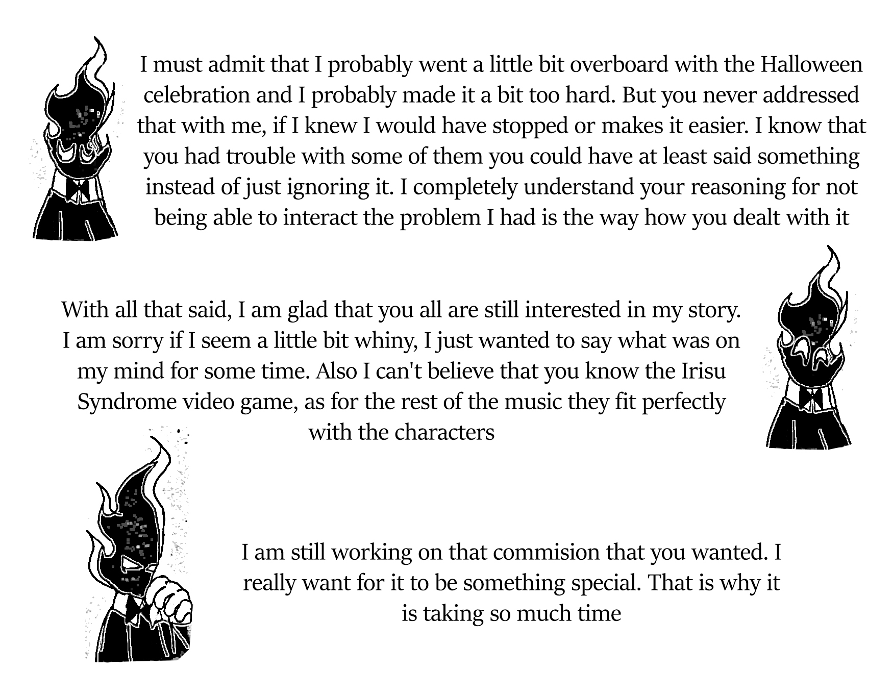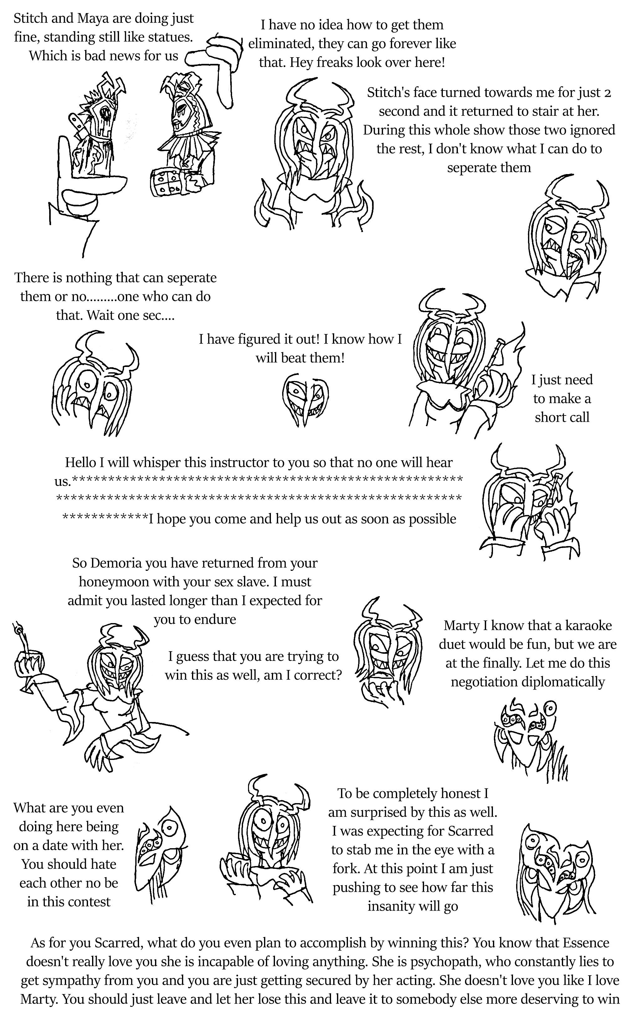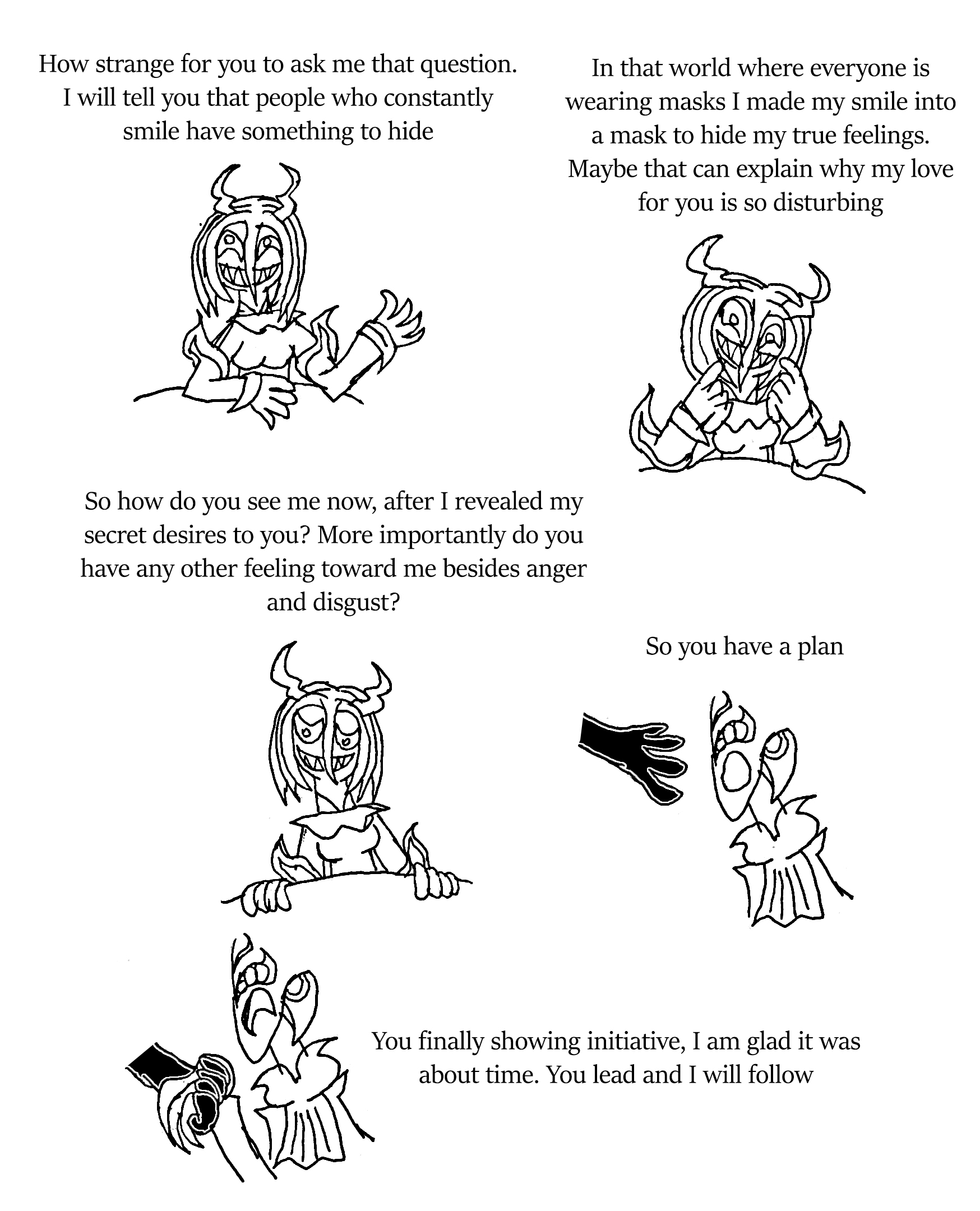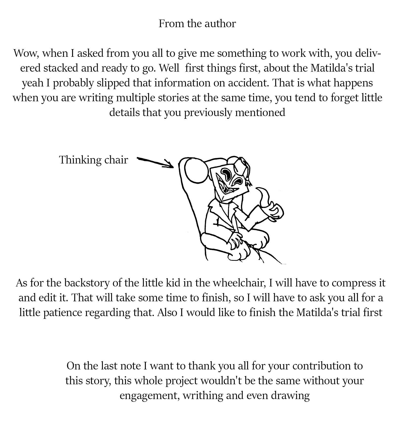 Continuing with the recap, we start with Ana's story. Something, or someone has hijacked her exit from the Astral plane and she see a dream of someone who has a dream of chopping down a tree, but then the tree retaliates and makes the lumberjack a part of itself. The lumberjack awakens and knows "they must protect her at any cost." Remember this "lumberjack" because they will be important later and cause a shit load of trouble for Scarred and Fortune. Speaking of our intrepid duo, the two of them after seeing the events of the side quests have a meeting with the real master of the black fog and the true leader of the Acolytes of the Ash Tree, the demon known as Andrew Goodwill. He makes it clear that the Ash Tree demon is basically his bitch and he uses him like a weapon to fuel his own dark designs, he also reveals that he wanted to punish Root for going against certain order as killing Absolution was not his wish, and that he was the one who granted Scarred and Fortune bodies to beat the shit out of Clara. Andrew then offers Scarred and Fortune a choice of who they would like to see die, for no other reason than his own amusement. However in defiance of him they chose none of them and instead pick someone entirely random (intending for Andrew to pick himself) as they don't want to hurt anyone. However the joke is on them because instead he picks Wildcat, the Curator attached to Ana. They quickly make a bargain for his life, but Andrew proposes a new idea, he takes over Ana's body to further punish Root. Both them promptly refuse, so in order to defuse the situation and save Wild Cat (who I will refer to as WC from here on) they all start to tell some really dirty jokes in order to save him, only highlighting how capricious Andrew Goodwill really is. Scarred comes in handy here as she tells one about a guy fucking a cow to death as well as "The Aristocrats Joke," often considered the dirtiest joke in existence (see here for what she said: https://www.youtube.com/watch?v=aGA0dIz9-Wk) The joke is so filthy that Andrew lets WC live. They all swap some jokes, and Andrew leaves in good humor and WC promises to do his best to help Ana. Andrew returns to Root and warns him to not get so high and mighty again.