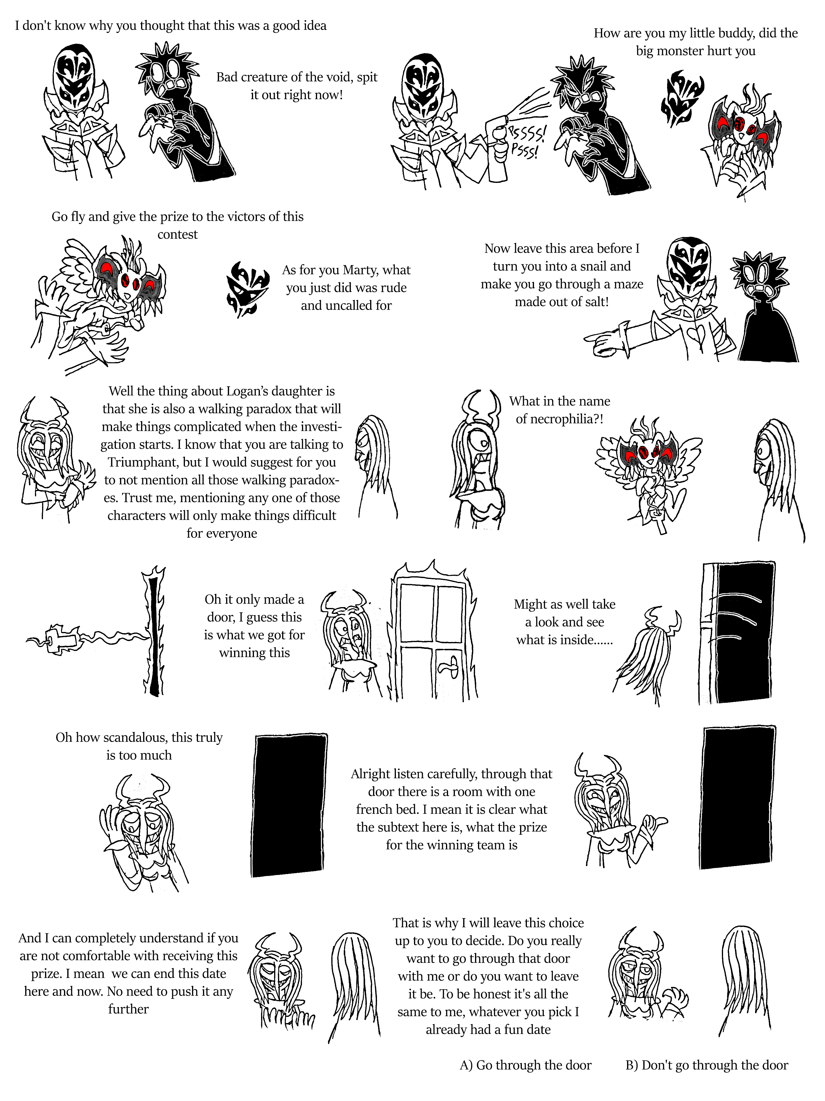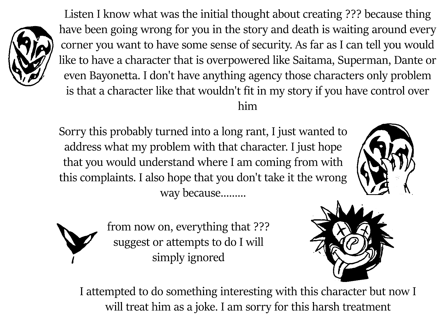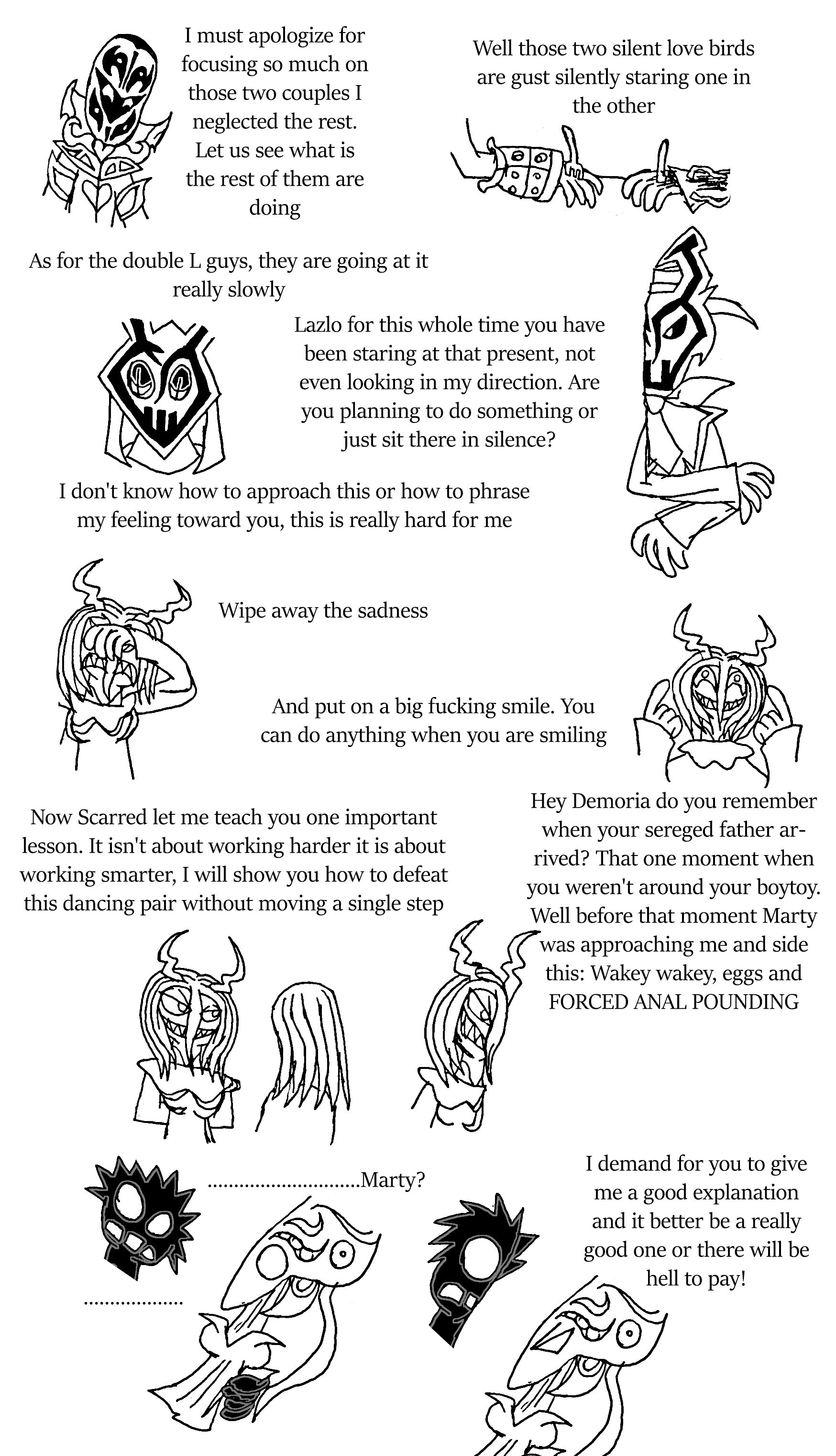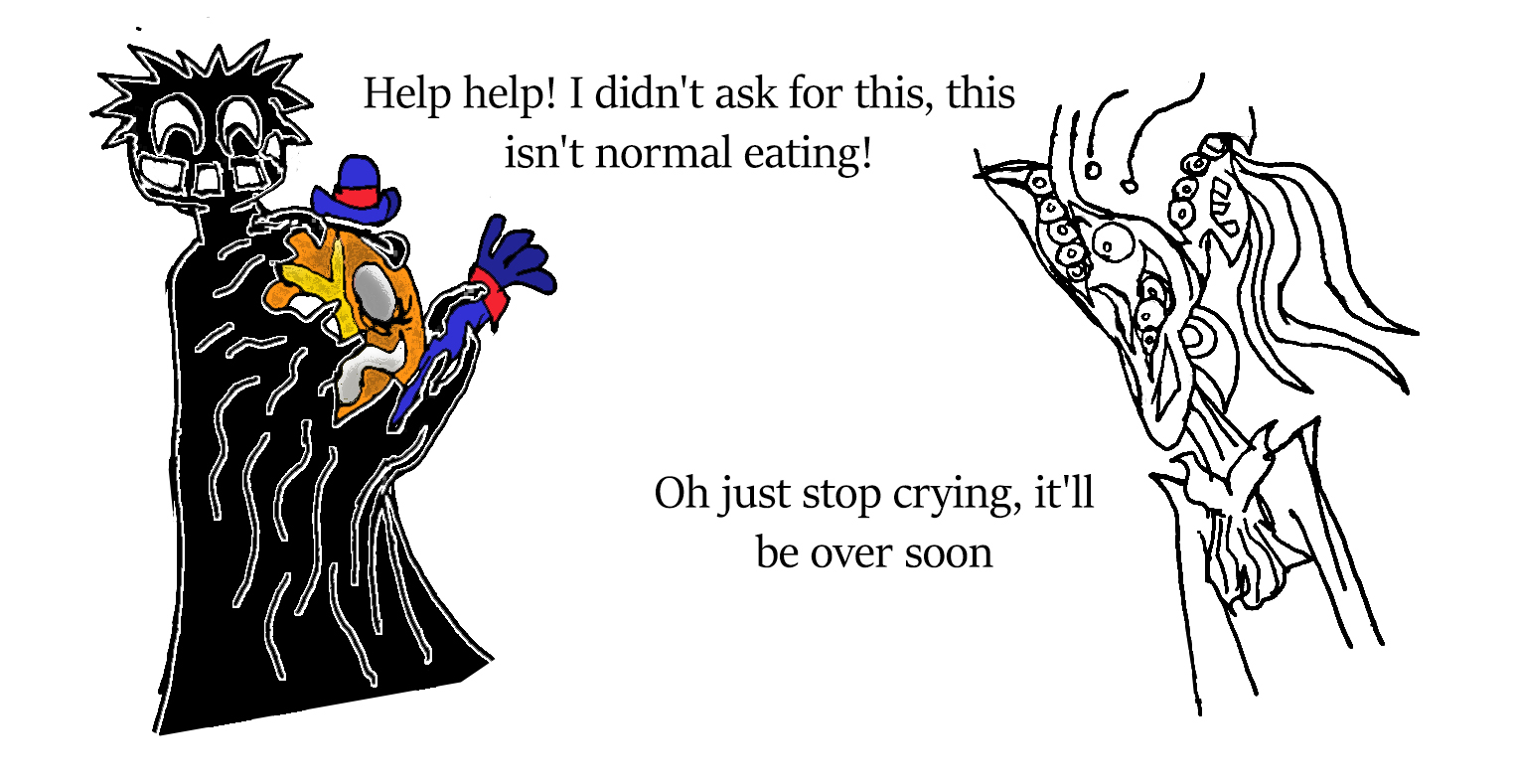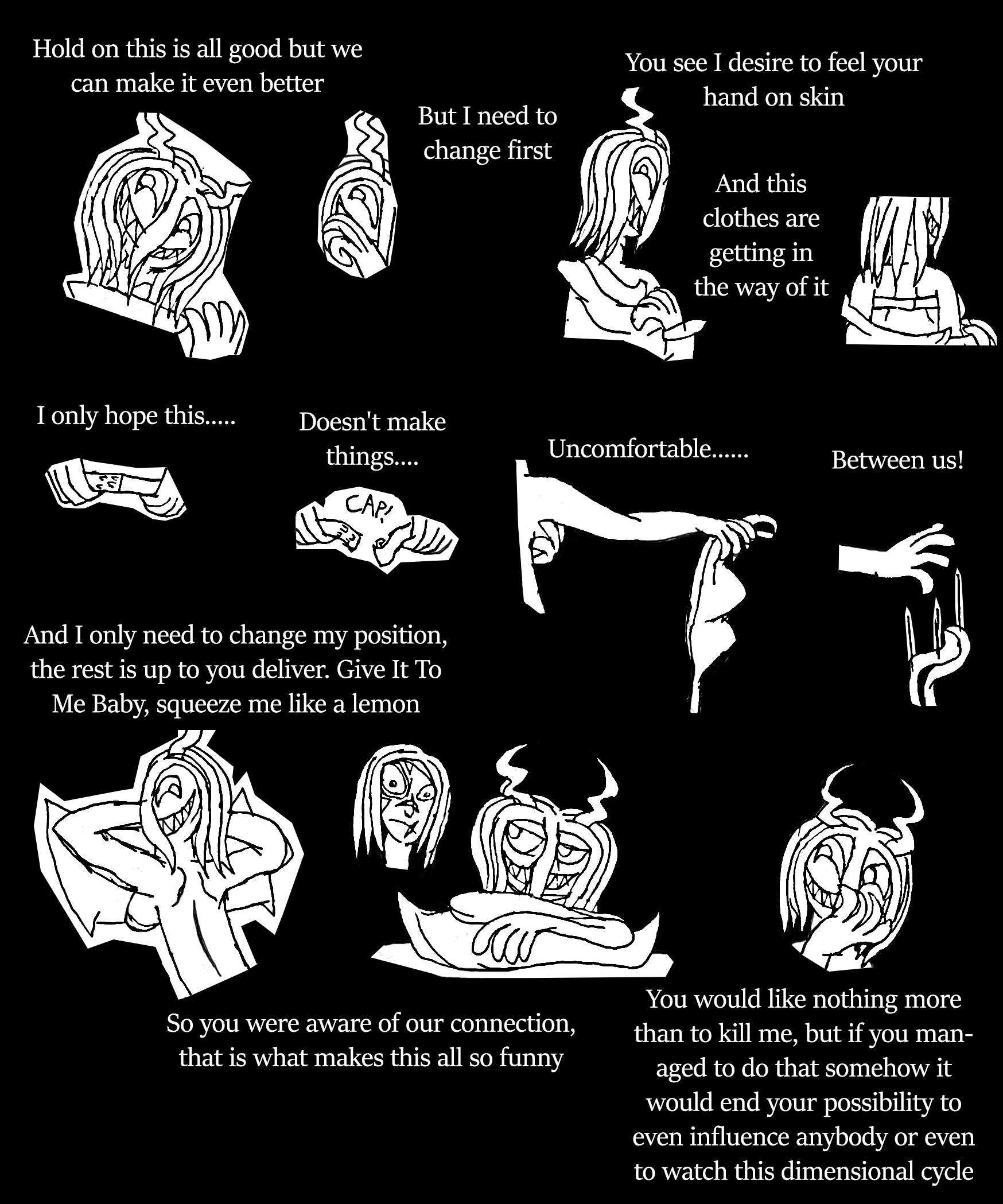 Continuing with the recap, we start with Ana's story. Something, or someone has hijacked her exit from the Astral plane and she see a dream of someone who has a dream of chopping down a tree, but then the tree retaliates and makes the lumberjack a part of itself. The lumberjack awakens and knows "they must protect her at any cost." Remember this "lumberjack" because they will be important later and cause a shit load of trouble for Scarred and Fortune. Speaking of our intrepid duo, the two of them after seeing the events of the side quests have a meeting with the real master of the black fog and the true leader of the Acolytes of the Ash Tree, the demon known as Andrew Goodwill. He makes it clear that the Ash Tree demon is basically his bitch and he uses him like a weapon to fuel his own dark designs, he also reveals that he wanted to punish Root for going against certain order as killing Absolution was not his wish, and that he was the one who granted Scarred and Fortune bodies to beat the shit out of Clara. Andrew then offers Scarred and Fortune a choice of who they would like to see die, for no other reason than his own amusement. However in defiance of him they chose none of them and instead pick someone entirely random (intending for Andrew to pick himself) as they don't want to hurt anyone. However the joke is on them because instead he picks Wildcat, the Curator attached to Ana. They quickly make a bargain for his life, but Andrew proposes a new idea, he takes over Ana's body to further punish Root. Both them promptly refuse, so in order to defuse the situation and save Wild Cat (who I will refer to as WC from here on) they all start to tell some really dirty jokes in order to save him, only highlighting how capricious Andrew Goodwill really is. Scarred comes in handy here as she tells one about a guy fucking a cow to death as well as "The Aristocrats Joke," often considered the dirtiest joke in existence (see here for what she said: https://www.youtube.com/watch?v=aGA0dIz9-Wk) The joke is so filthy that Andrew lets WC live. They all swap some jokes, and Andrew leaves in good humor and WC promises to do his best to help Ana. Andrew returns to Root and warns him to not get so high and mighty again.