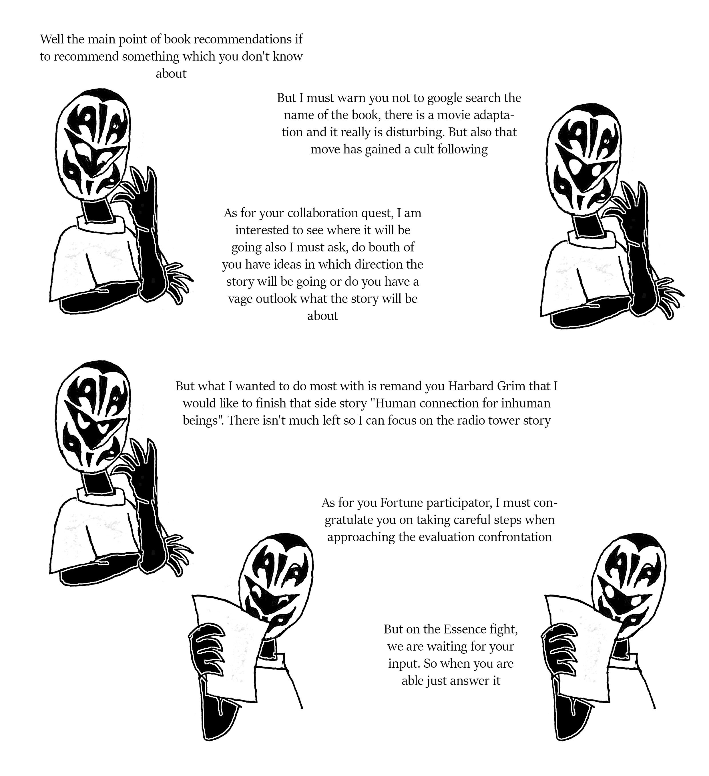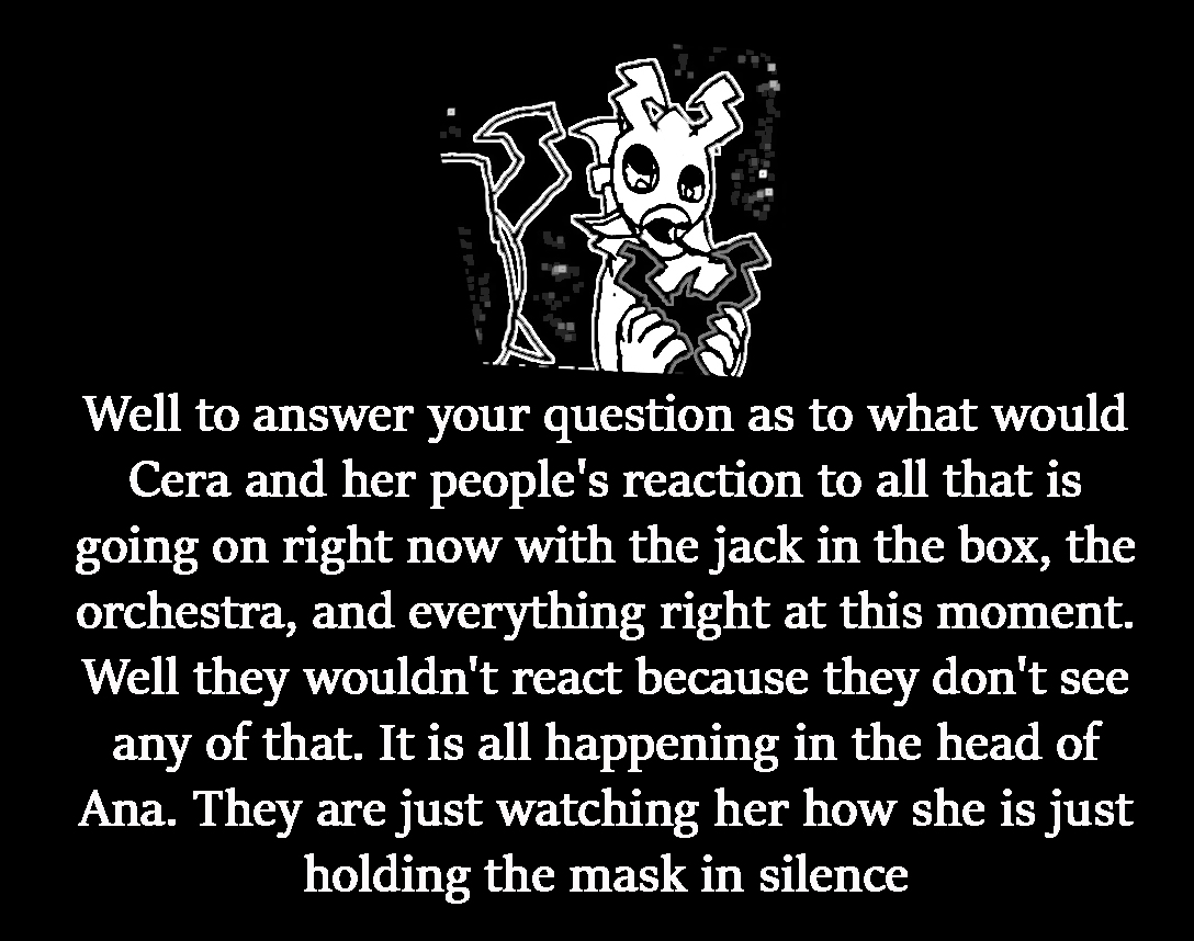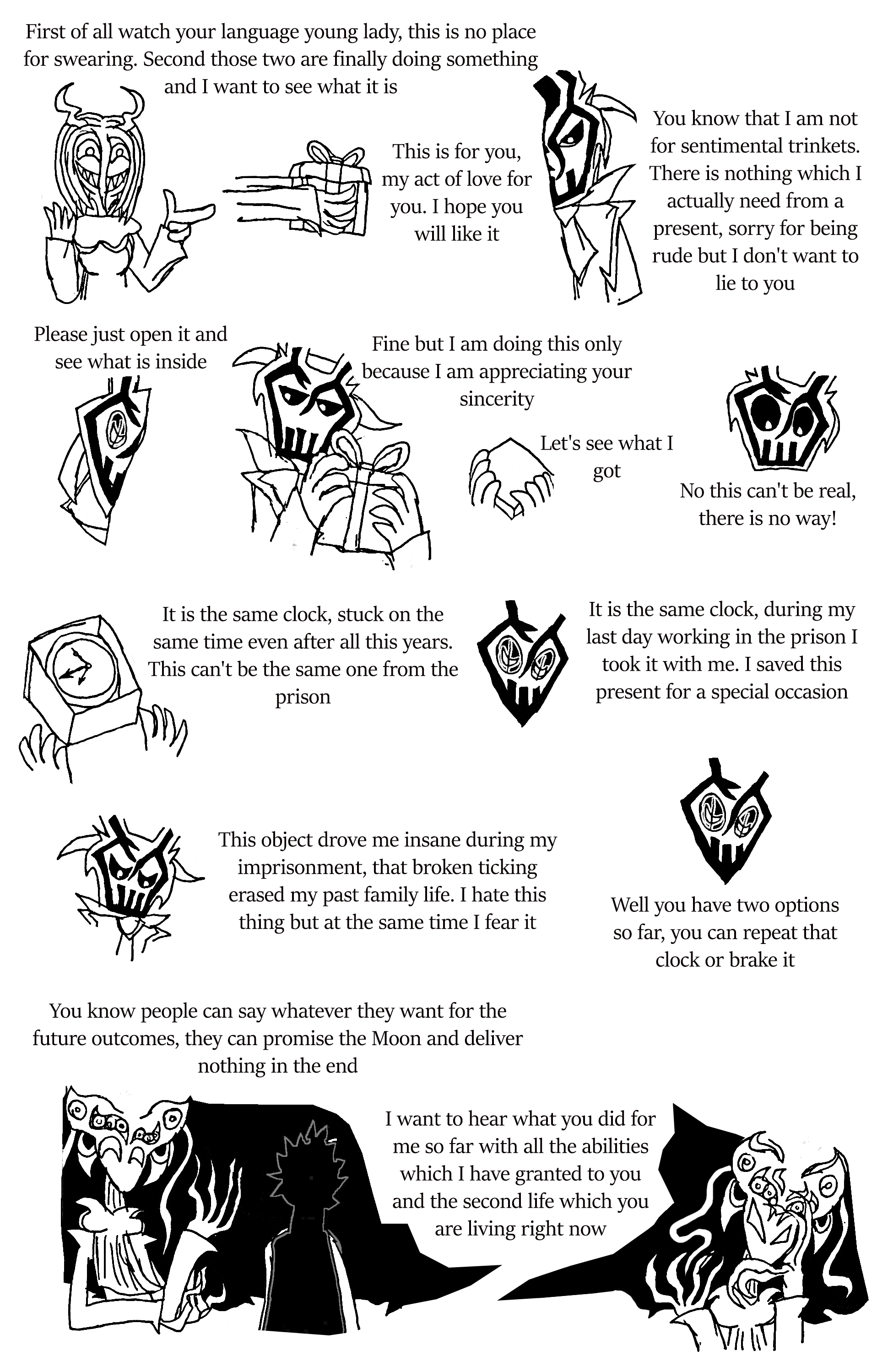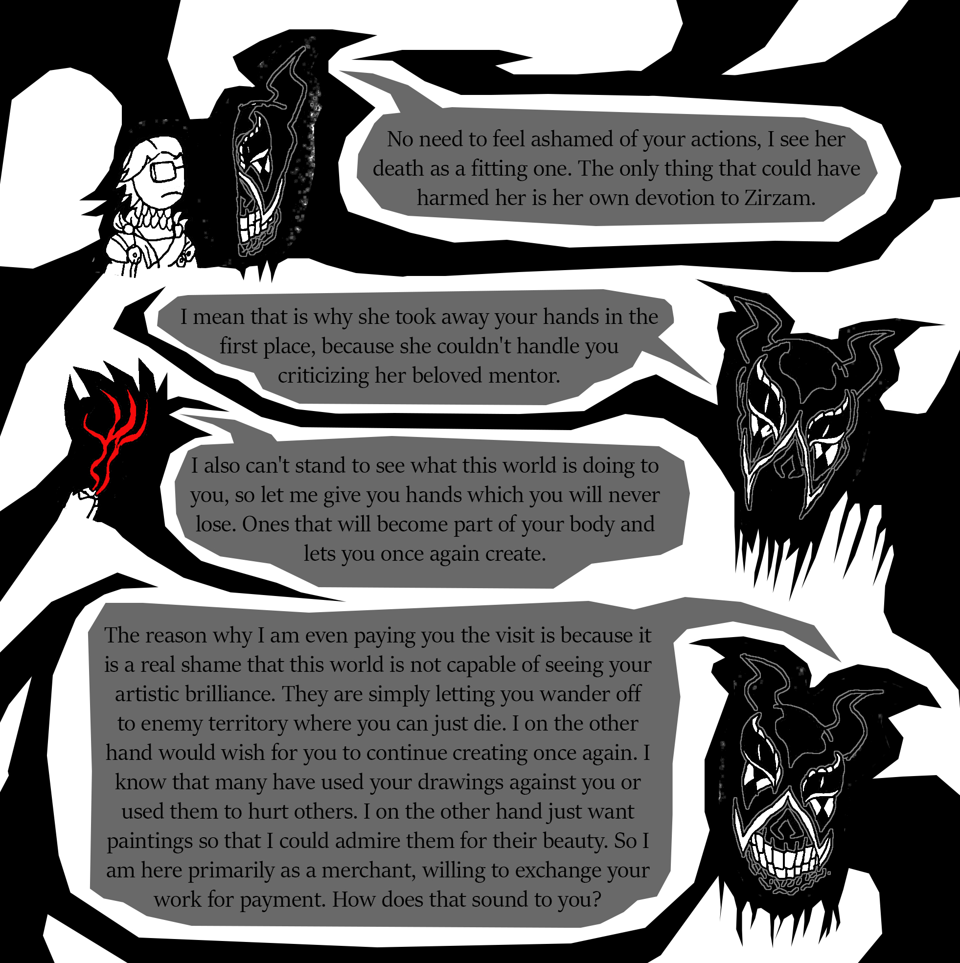 After the two of them leave WC requests using a small silver hand bell that he gave them when they first met. The bell opens up a small pocket dimension where a curator and shopkeeper named "One Horned Jack" runs a business selling good and information. One Horned Jack isn't his real name but it's what he goes by as a curator. Apparently on this pocket dimension Scarred and Fortune also have seeable forms, although they can't interact or touch anything, they are still able to talk and be heard by both the curators and Ana. Ana makes a brief radio call to Anatasia to test out the radio and they establish code names and she learns the cult is pulling corpses out on the streets and burning them. WC and Jack leave to talk business and Ana looks at what is for sale. Turns out Jack isn't just a shopkeeper but a man who will literally sell everything under the sun from items to secrets. Ana buys some healing items called "the needles of life," which can heal any injury no matter their severity. Jack and WC come back from talking business and as it turns out, owes a debt to Scarred and Fortune because they saved his daughter's life. Jack's daughter is Matilda who was on trial earlier and he gives them some information about who buys from his shop, mostly cult members needing medical supplies or even drugs. They negotiate the distribution of some needles of life to people who need them like Lester who as you remember will be stabbed later on and this may save his life. The shop also has a young blacksmith there who simply goes by "Blacky." . She also gives a new mask order for Blacky to fill out as the cult has already begun to recognize her by her fish mask, as well as gets a new weapon head for her hockey stick. Blacky turns it into a Svardstav, a swedish weapon that's a kind of long spear with a short sword on the end rather than just a regular spear head. Black leaves to complete the weapon order after it has been placed.