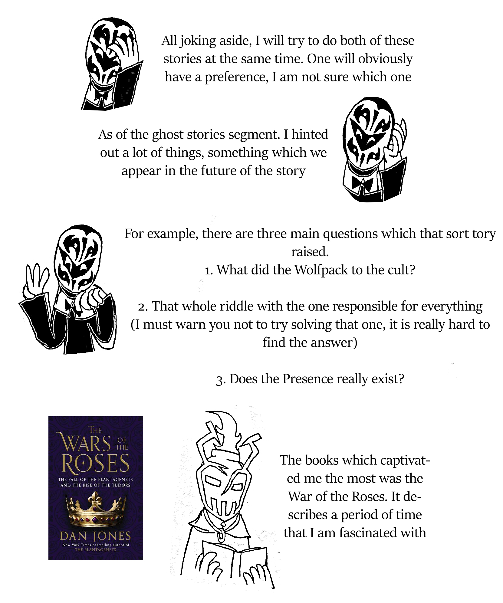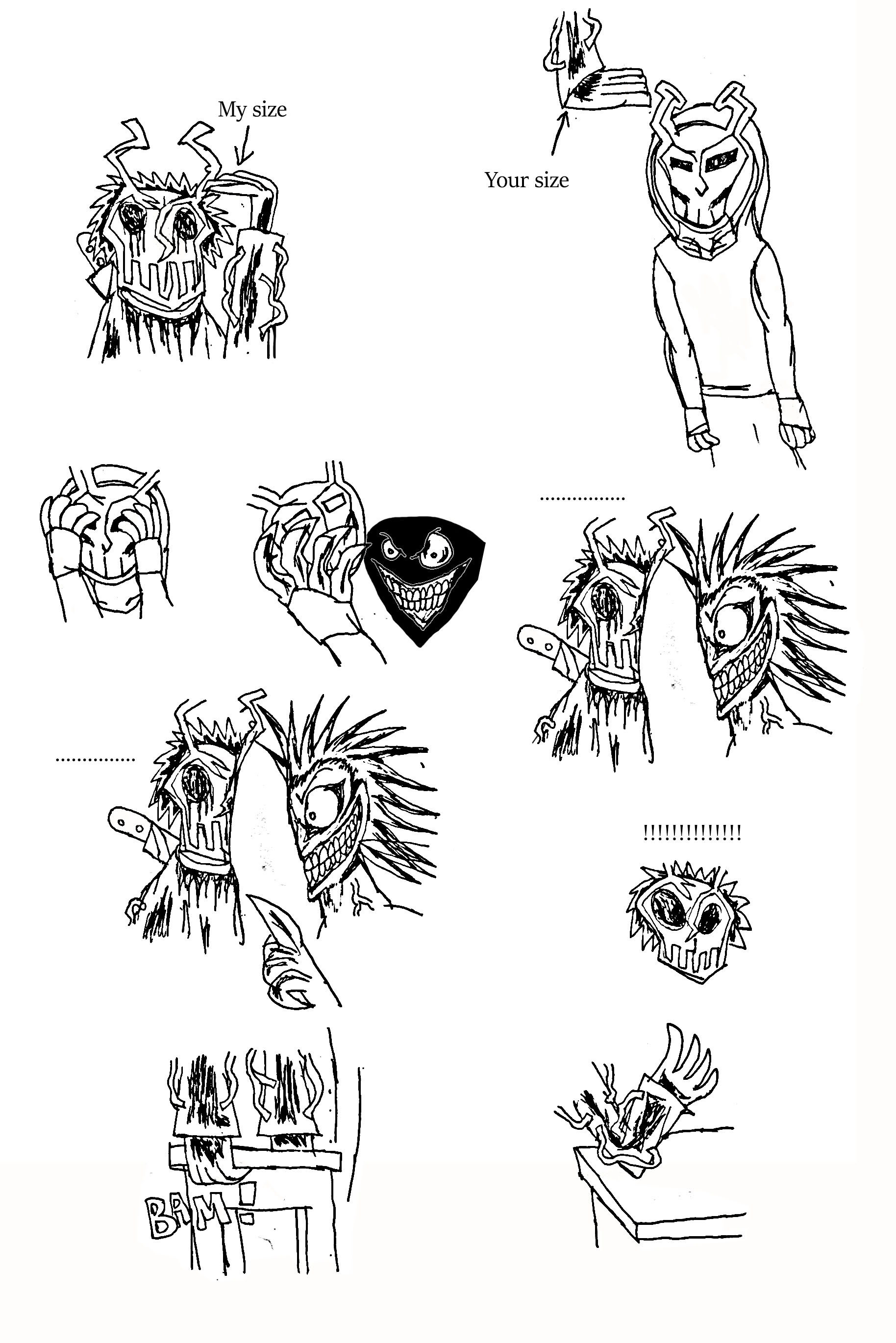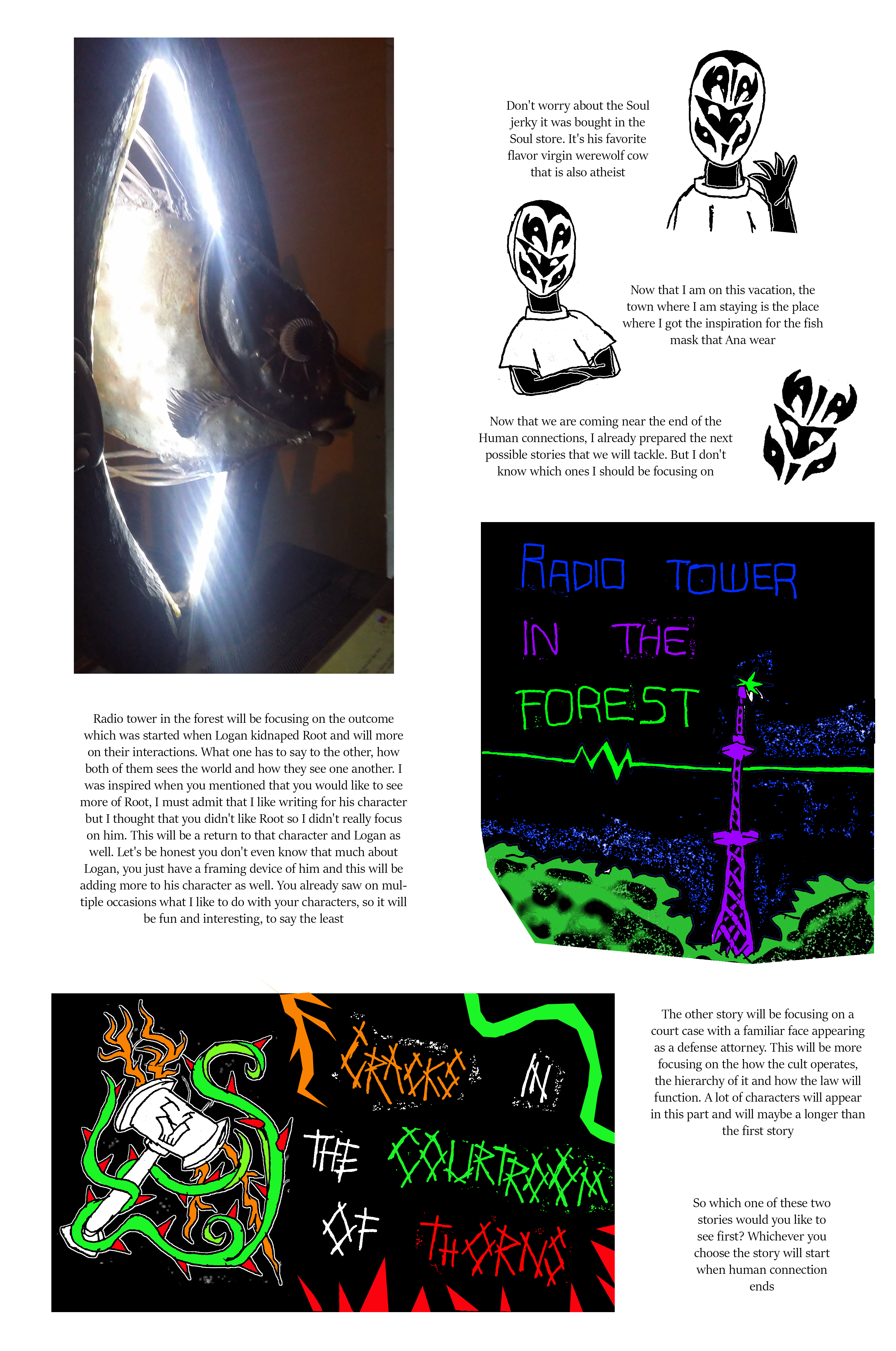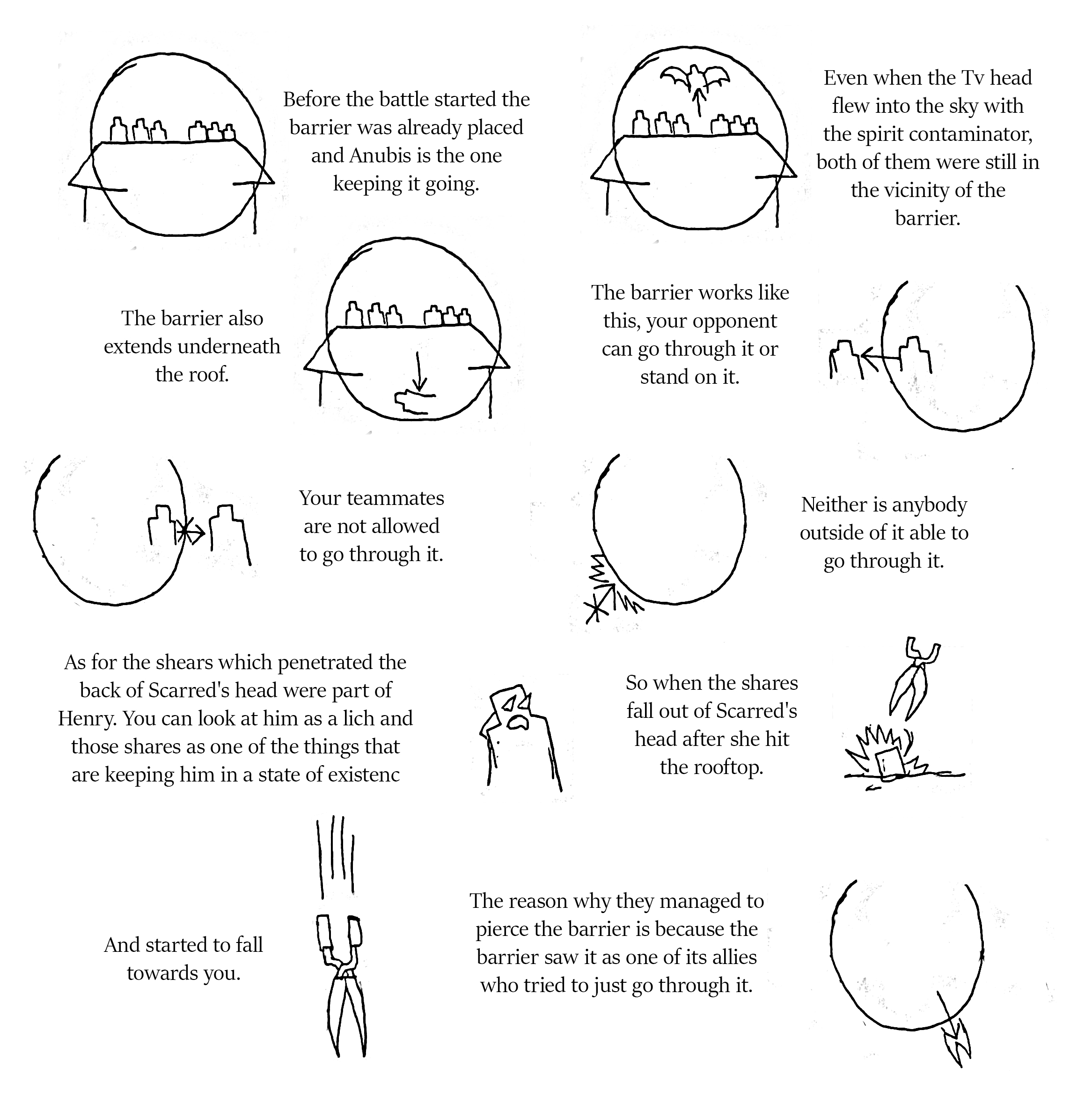 After the two of them leave WC requests using a small silver hand bell that he gave them when they first met. The bell opens up a small pocket dimension where a curator and shopkeeper named "One Horned Jack" runs a business selling good and information. One Horned Jack isn't his real name but it's what he goes by as a curator. Apparently on this pocket dimension Scarred and Fortune also have seeable forms, although they can't interact or touch anything, they are still able to talk and be heard by both the curators and Ana. Ana makes a brief radio call to Anatasia to test out the radio and they establish code names and she learns the cult is pulling corpses out on the streets and burning them. WC and Jack leave to talk business and Ana looks at what is for sale. Turns out Jack isn't just a shopkeeper but a man who will literally sell everything under the sun from items to secrets. Ana buys some healing items called "the needles of life," which can heal any injury no matter their severity. Jack and WC come back from talking business and as it turns out, owes a debt to Scarred and Fortune because they saved his daughter's life. Jack's daughter is Matilda who was on trial earlier and he gives them some information about who buys from his shop, mostly cult members needing medical supplies or even drugs. They negotiate the distribution of some needles of life to people who need them like Lester who as you remember will be stabbed later on and this may save his life. The shop also has a young blacksmith there who simply goes by "Blacky." . She also gives a new mask order for Blacky to fill out as the cult has already begun to recognize her by her fish mask, as well as gets a new weapon head for her hockey stick. Blacky turns it into a Svardstav, a swedish weapon that's a kind of long spear with a short sword on the end rather than just a regular spear head. Black leaves to complete the weapon order after it has been placed.
