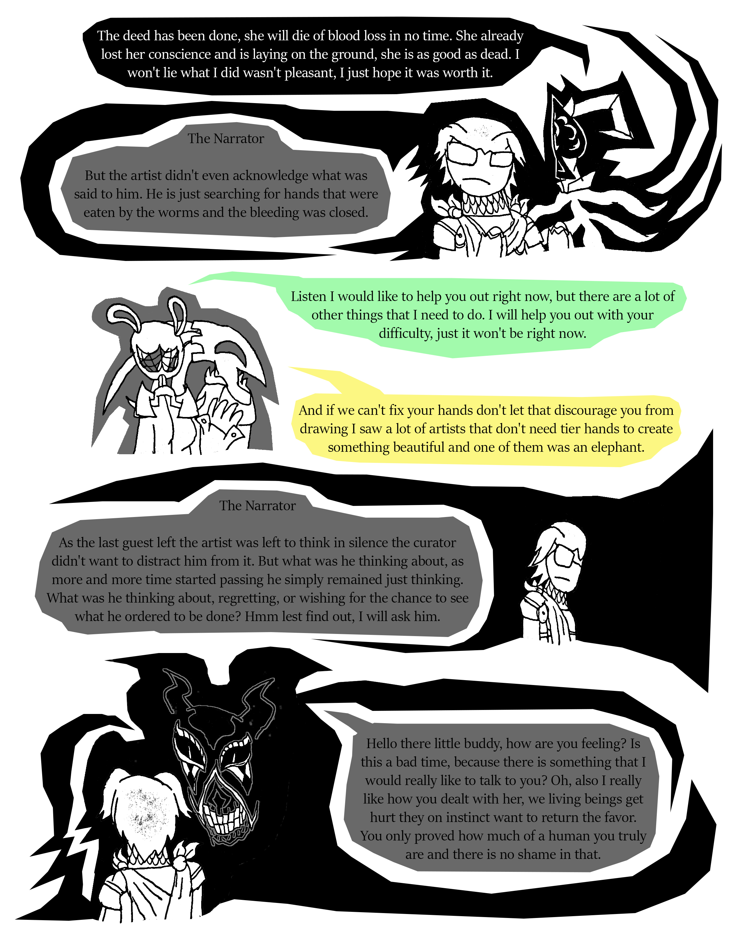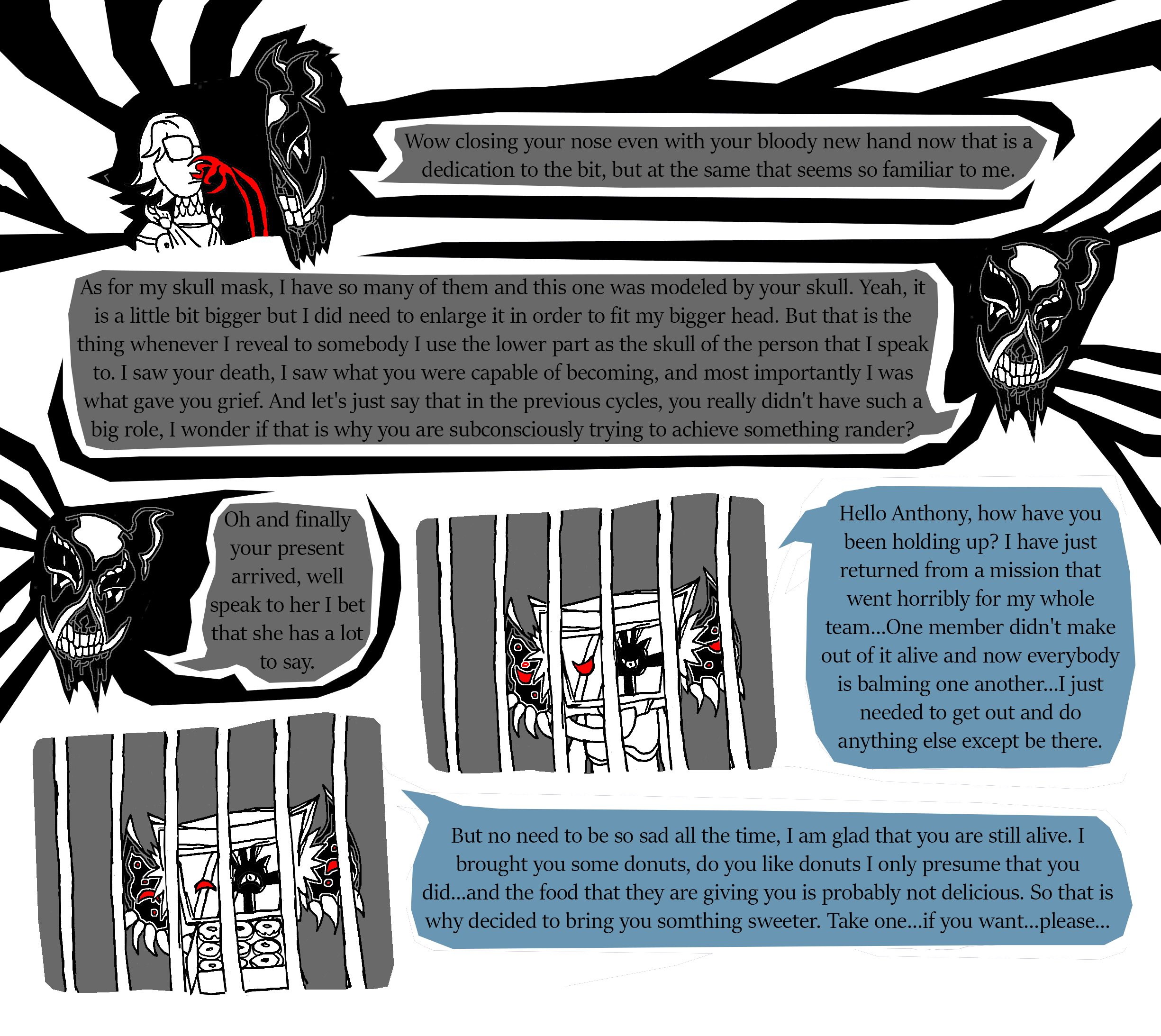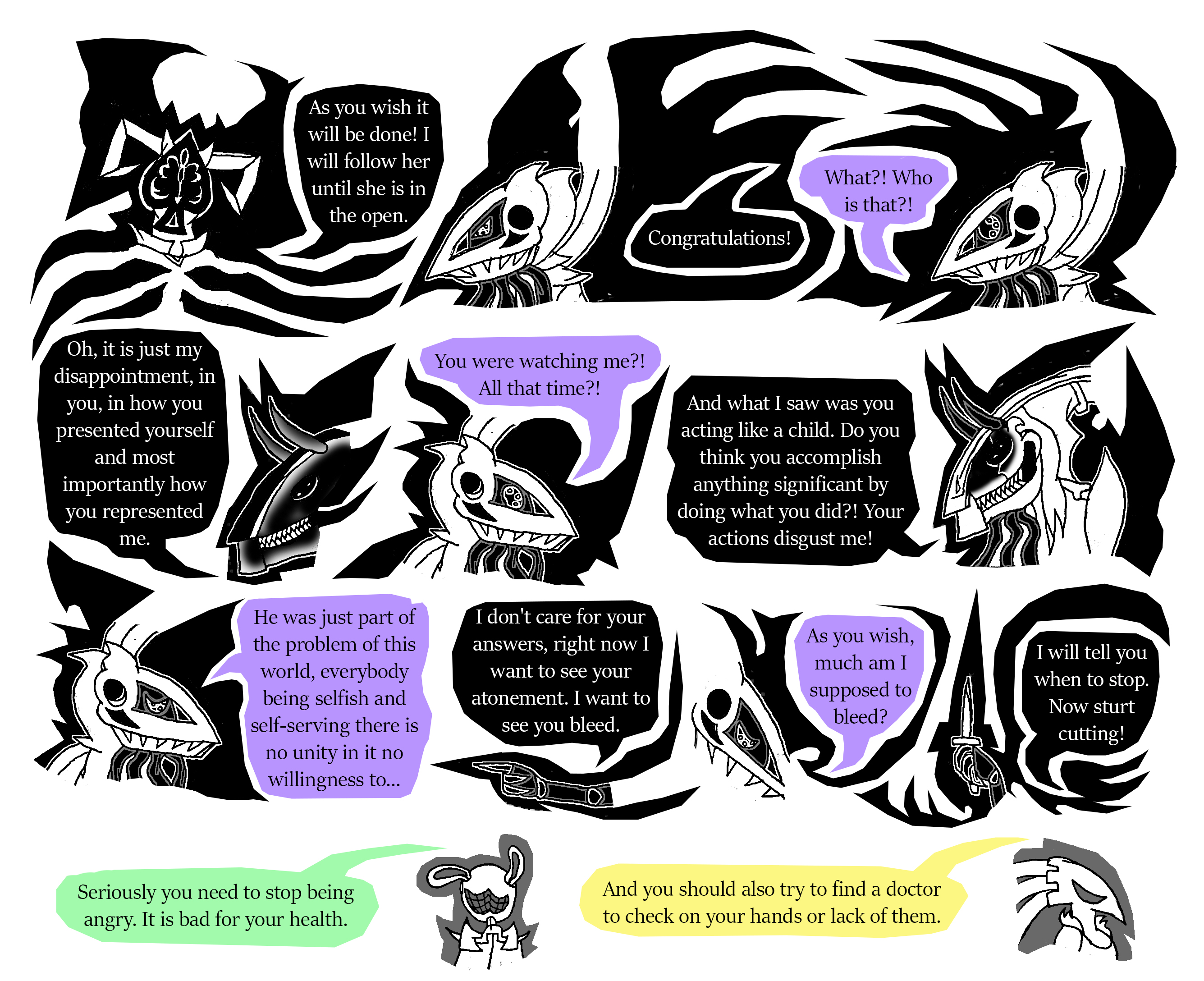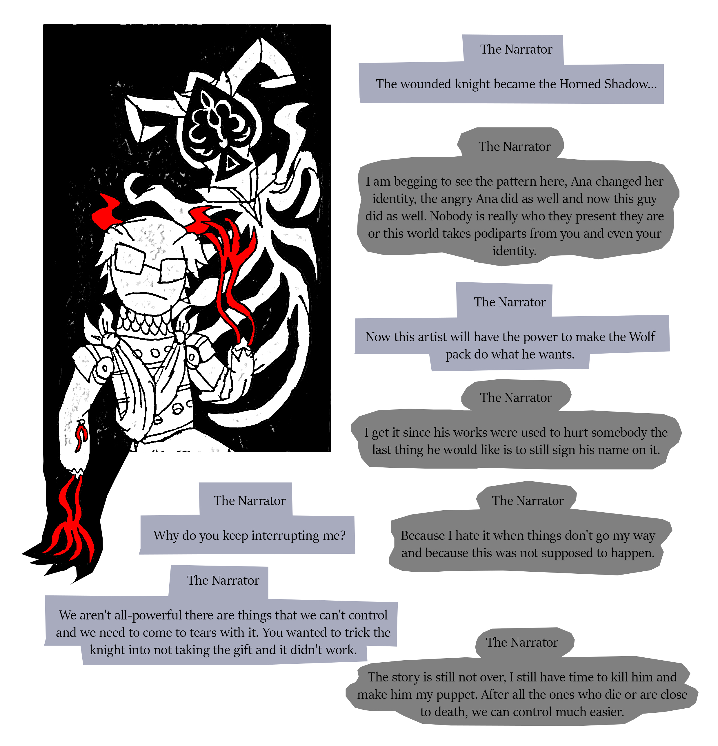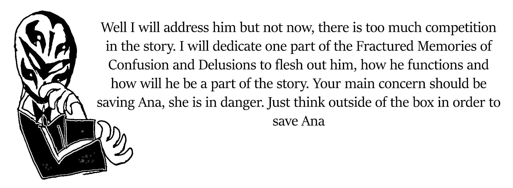 They place the call to the Ambassador who agrees to be her bodyguard after some very odd words and questions. He agrees to be her bodyguard as he was once a mortal and wants to gain more power, and even take over the Acolytes of Ash. It's made clear he sees her as something of a means to an end but at the same time she also agrees and the two form a rather tense alliance. After some very choice words the two end the call only for it to be revealed that Root's bodyguard, a silent monster named Stitch, is standing behind Ana, still acting on his previous order to find her and kill her. Stitch is a silent killer and a frankenstein's monster of an abomination. Ana freaks out but Blacky, gods bless his heart tells her to ring the bell again which will send her out of the pocket dimension. She does so just in time before Stitch has a chance to put his knife (which he keeps lodged in his neck) through her heart. However, Stitch is furious at Black for telling them how to escape. Stitch begins to break all of the bones in Blacky's hand except for Dreamwalker who is able to disguise himself uses his power to turn into Root, and he gives the order to not kill him. Stitch obeys but it doesn't mean "don't hurt him," and he breaks both the arms of Blacky and rips one of them off before putting a smile on his mask for Ana as she leaves watching all of this in horror.