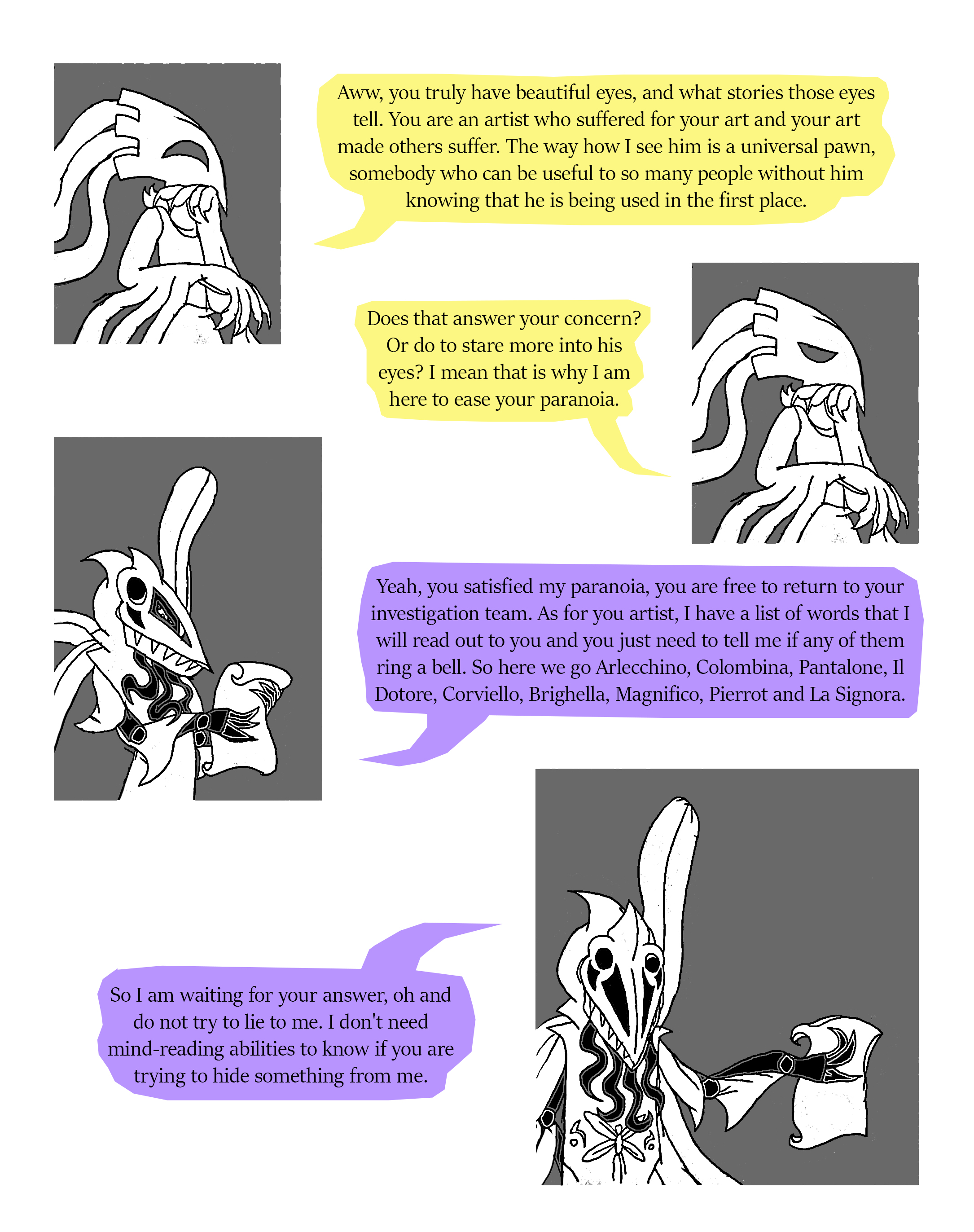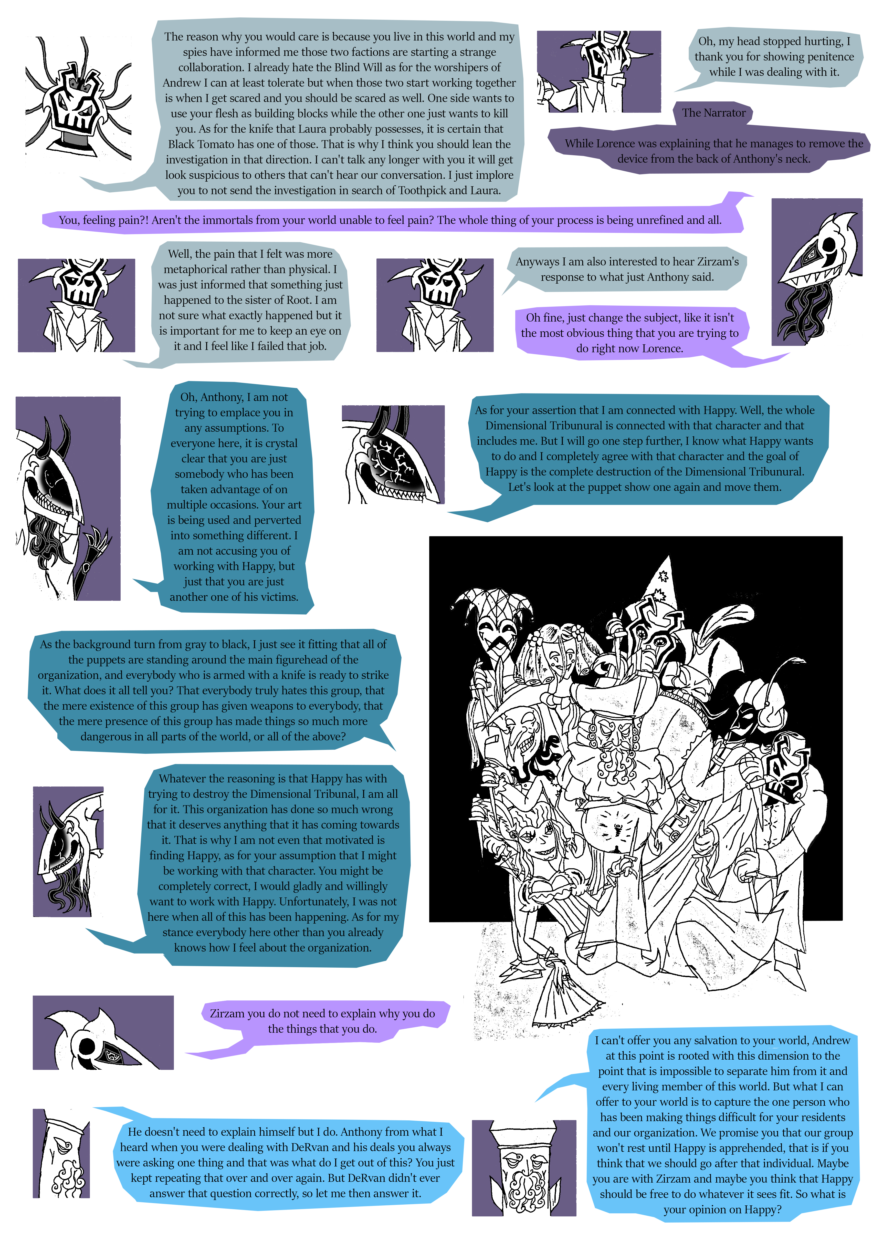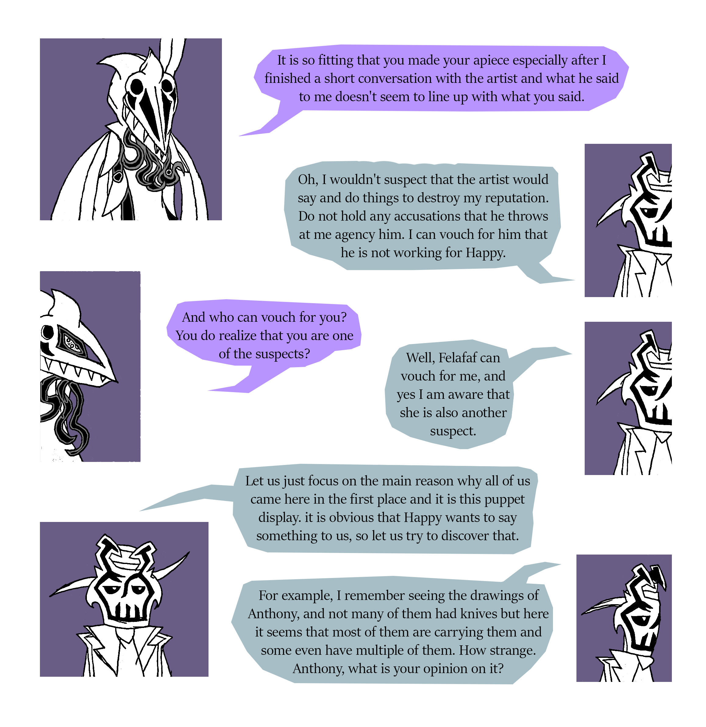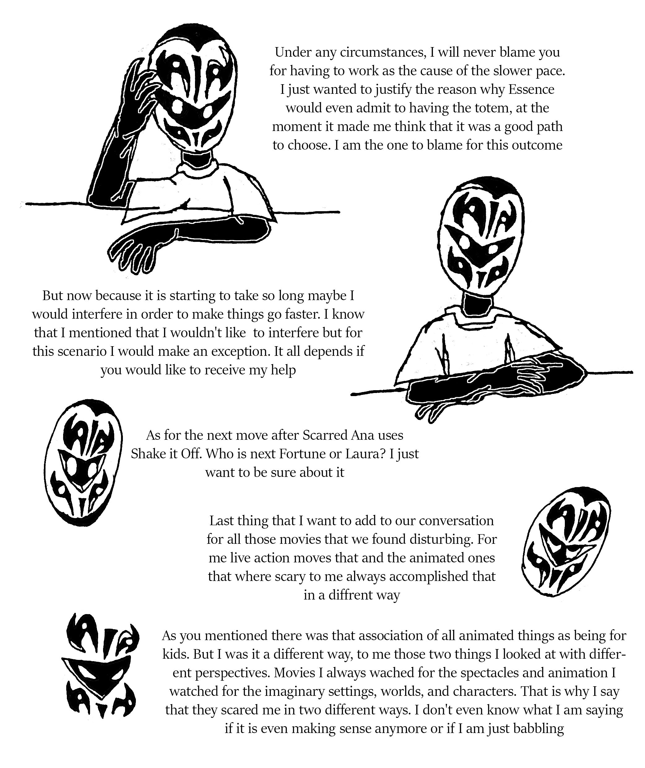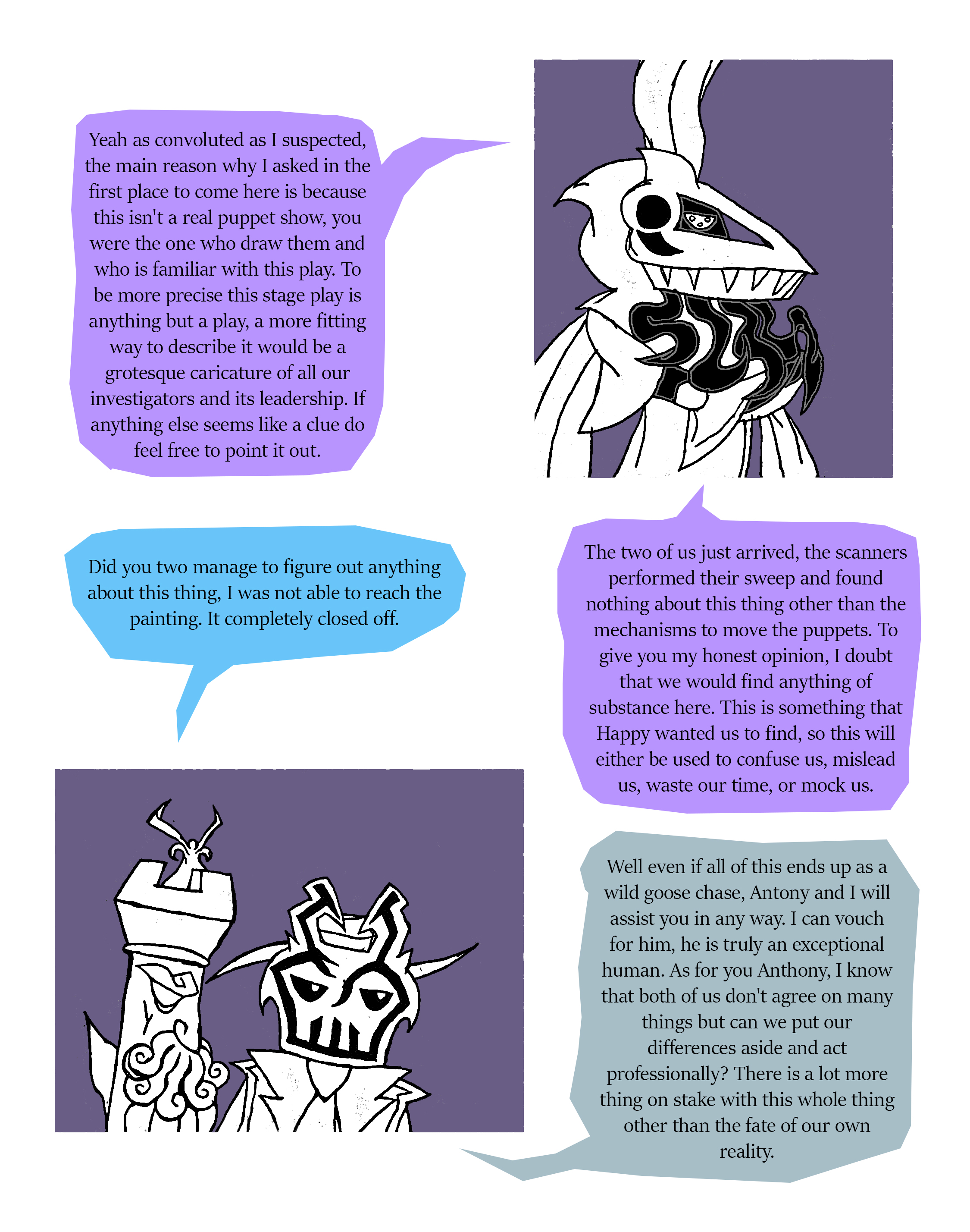 They place the call to the Ambassador who agrees to be her bodyguard after some very odd words and questions. He agrees to be her bodyguard as he was once a mortal and wants to gain more power, and even take over the Acolytes of Ash. It's made clear he sees her as something of a means to an end but at the same time she also agrees and the two form a rather tense alliance. After some very choice words the two end the call only for it to be revealed that Root's bodyguard, a silent monster named Stitch, is standing behind Ana, still acting on his previous order to find her and kill her. Stitch is a silent killer and a frankenstein's monster of an abomination. Ana freaks out but Blacky, gods bless his heart tells her to ring the bell again which will send her out of the pocket dimension. She does so just in time before Stitch has a chance to put his knife (which he keeps lodged in his neck) through her heart. However, Stitch is furious at Black for telling them how to escape. Stitch begins to break all of the bones in Blacky's hand except for Dreamwalker who is able to disguise himself uses his power to turn into Root, and he gives the order to not kill him. Stitch obeys but it doesn't mean "don't hurt him," and he breaks both the arms of Blacky and rips one of them off before putting a smile on his mask for Ana as she leaves watching all of this in horror.