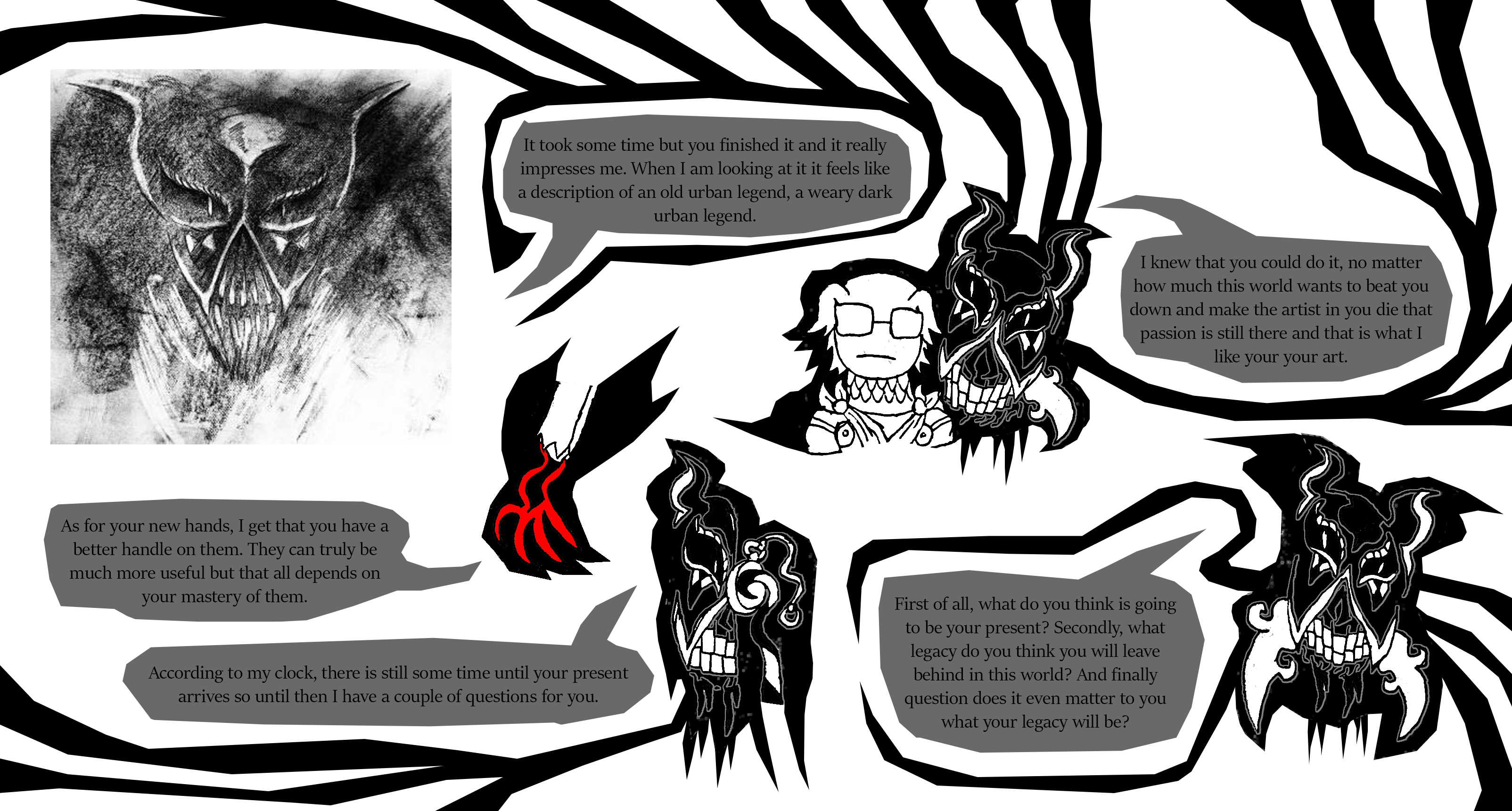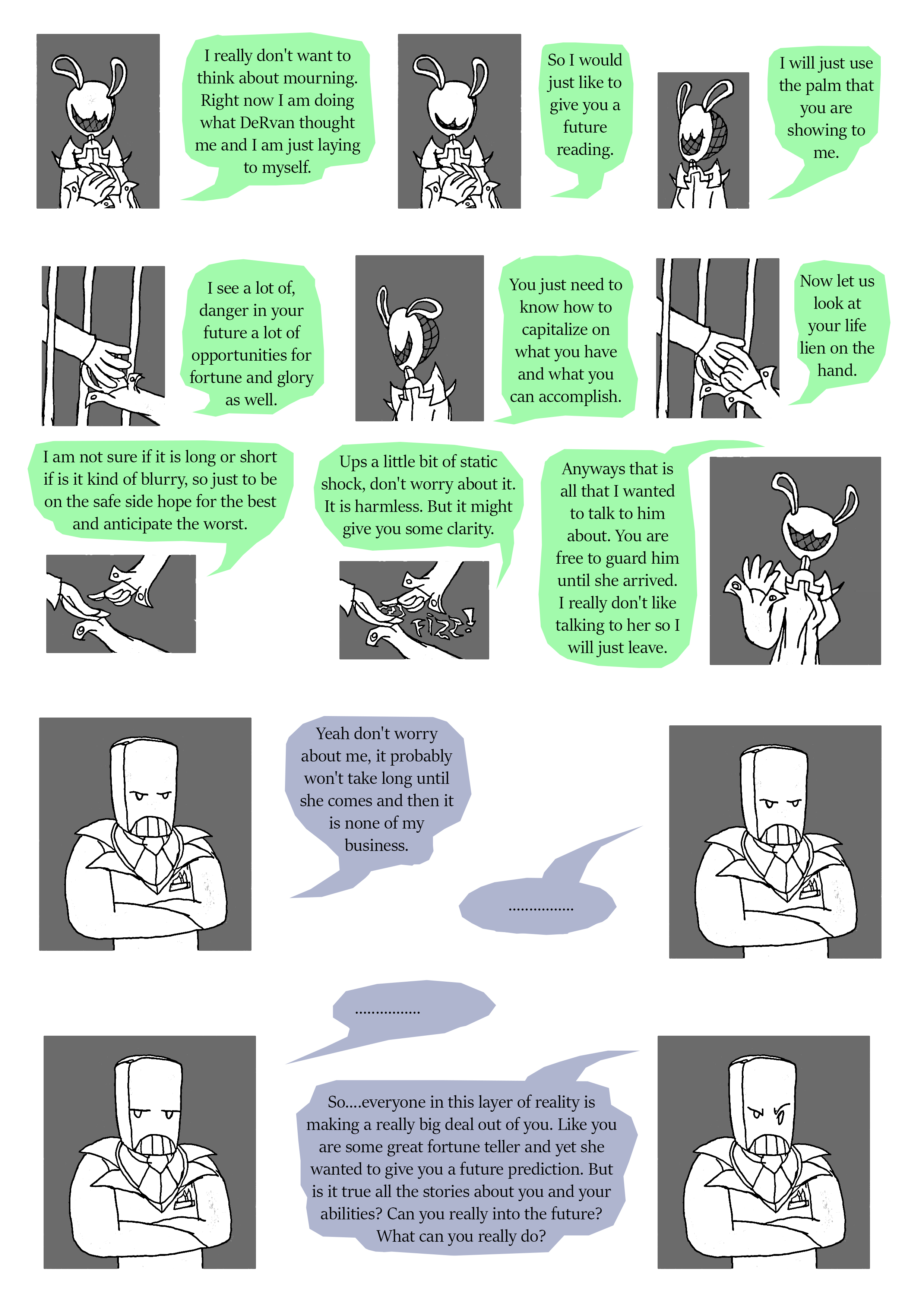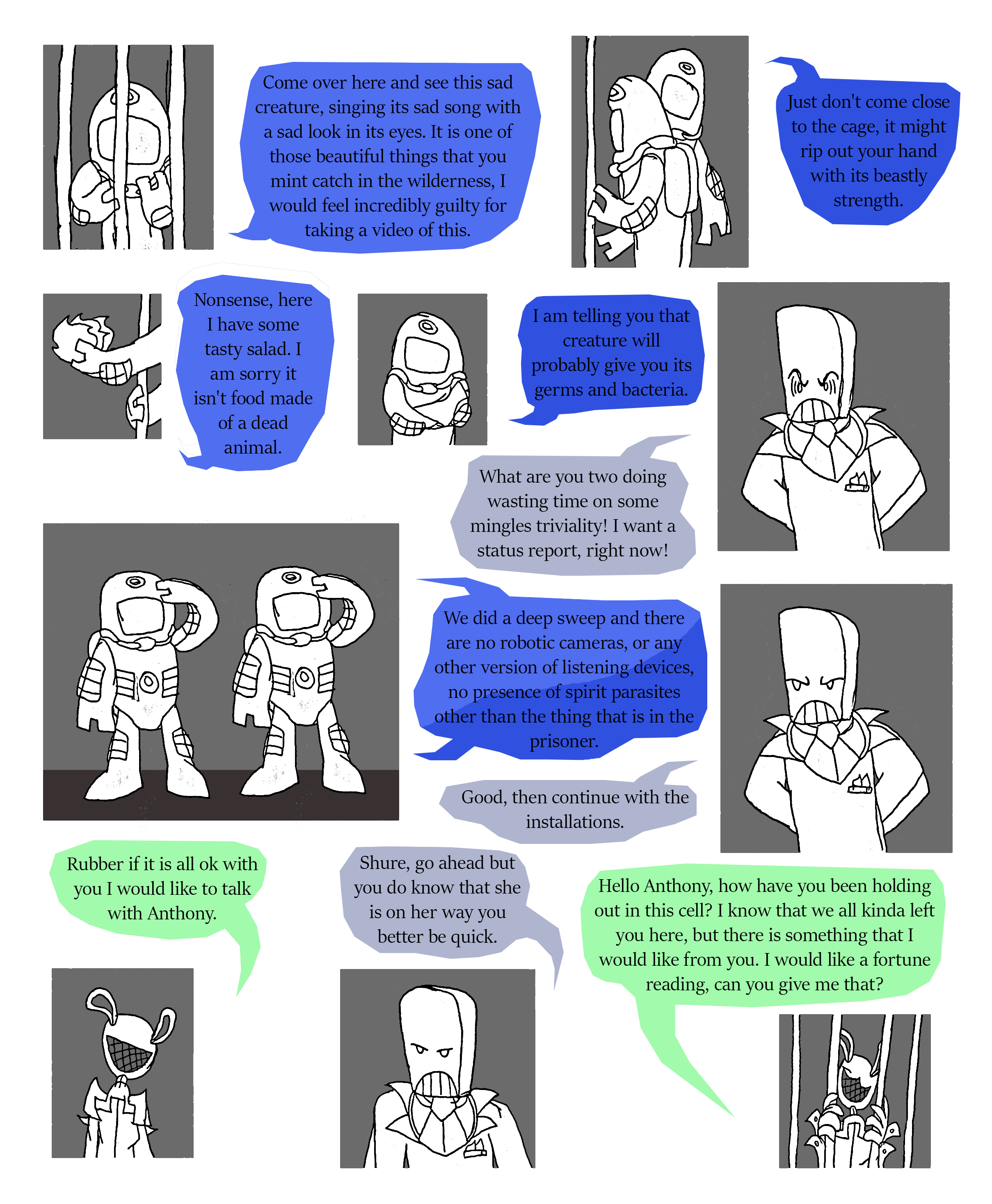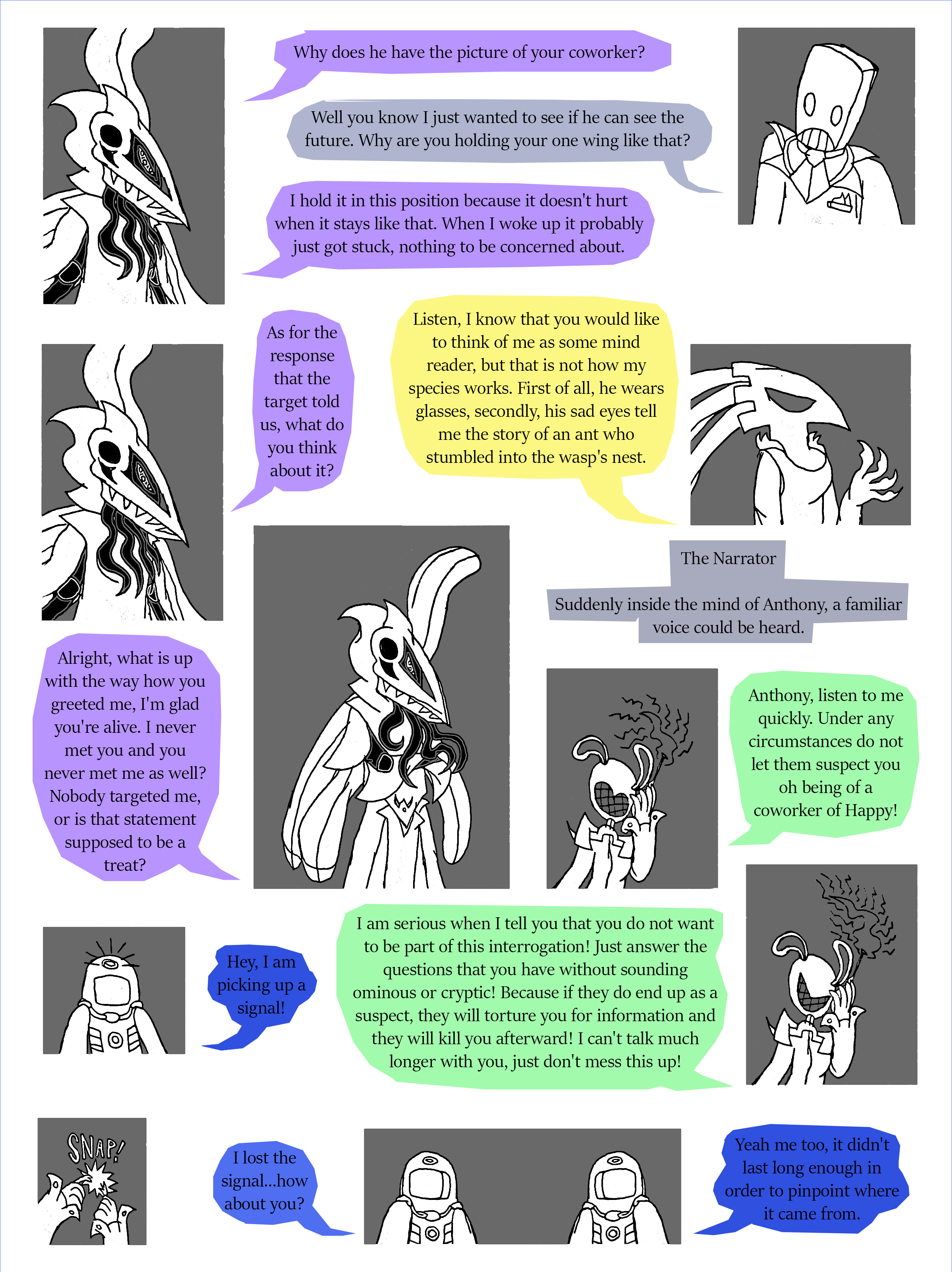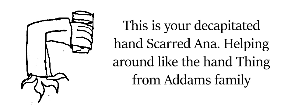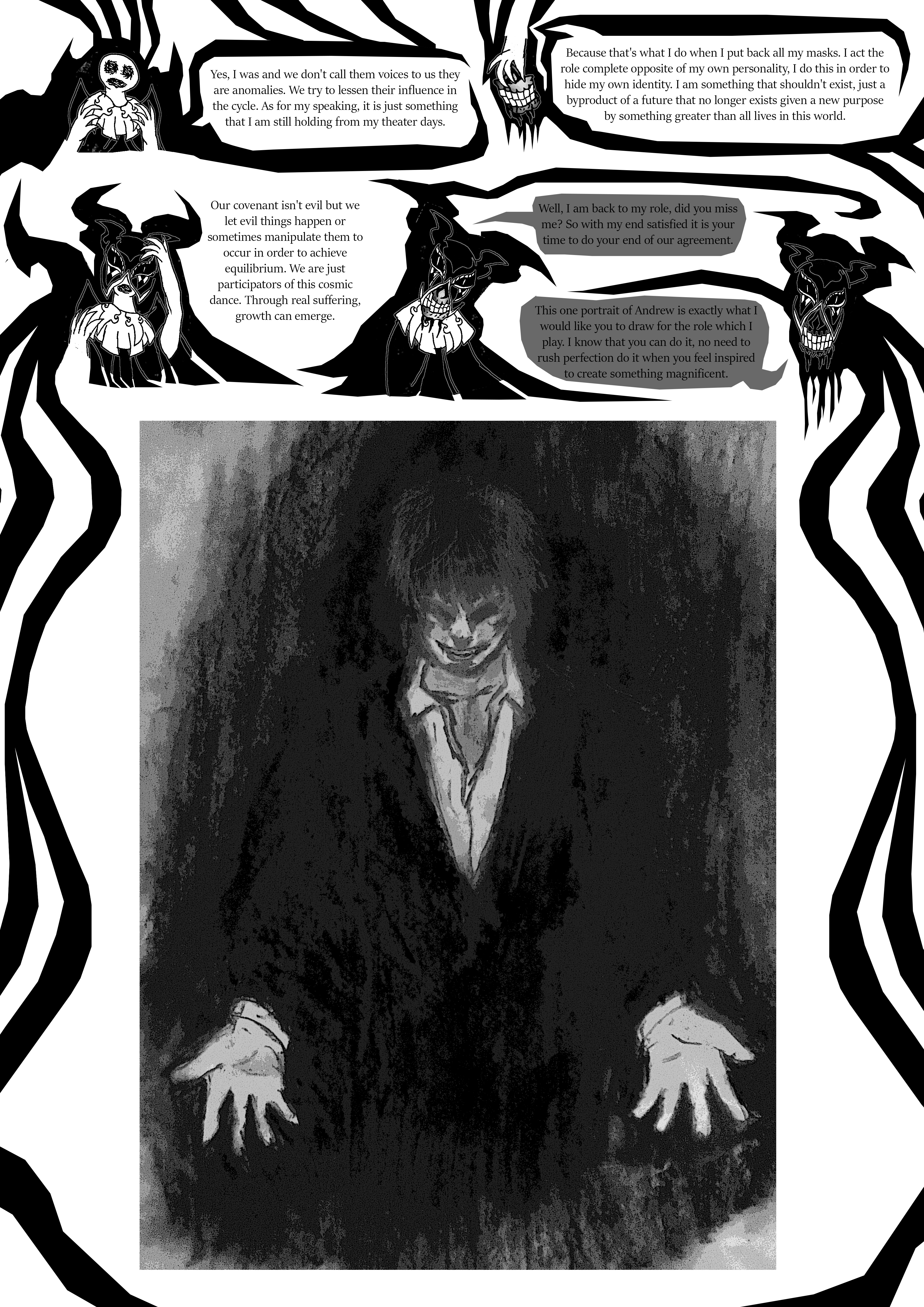 They place the call to the Ambassador who agrees to be her bodyguard after some very odd words and questions. He agrees to be her bodyguard as he was once a mortal and wants to gain more power, and even take over the Acolytes of Ash. It's made clear he sees her as something of a means to an end but at the same time she also agrees and the two form a rather tense alliance. After some very choice words the two end the call only for it to be revealed that Root's bodyguard, a silent monster named Stitch, is standing behind Ana, still acting on his previous order to find her and kill her. Stitch is a silent killer and a frankenstein's monster of an abomination. Ana freaks out but Blacky, gods bless his heart tells her to ring the bell again which will send her out of the pocket dimension. She does so just in time before Stitch has a chance to put his knife (which he keeps lodged in his neck) through her heart. However, Stitch is furious at Black for telling them how to escape. Stitch begins to break all of the bones in Blacky's hand except for Dreamwalker who is able to disguise himself uses his power to turn into Root, and he gives the order to not kill him. Stitch obeys but it doesn't mean "don't hurt him," and he breaks both the arms of Blacky and rips one of them off before putting a smile on his mask for Ana as she leaves watching all of this in horror.