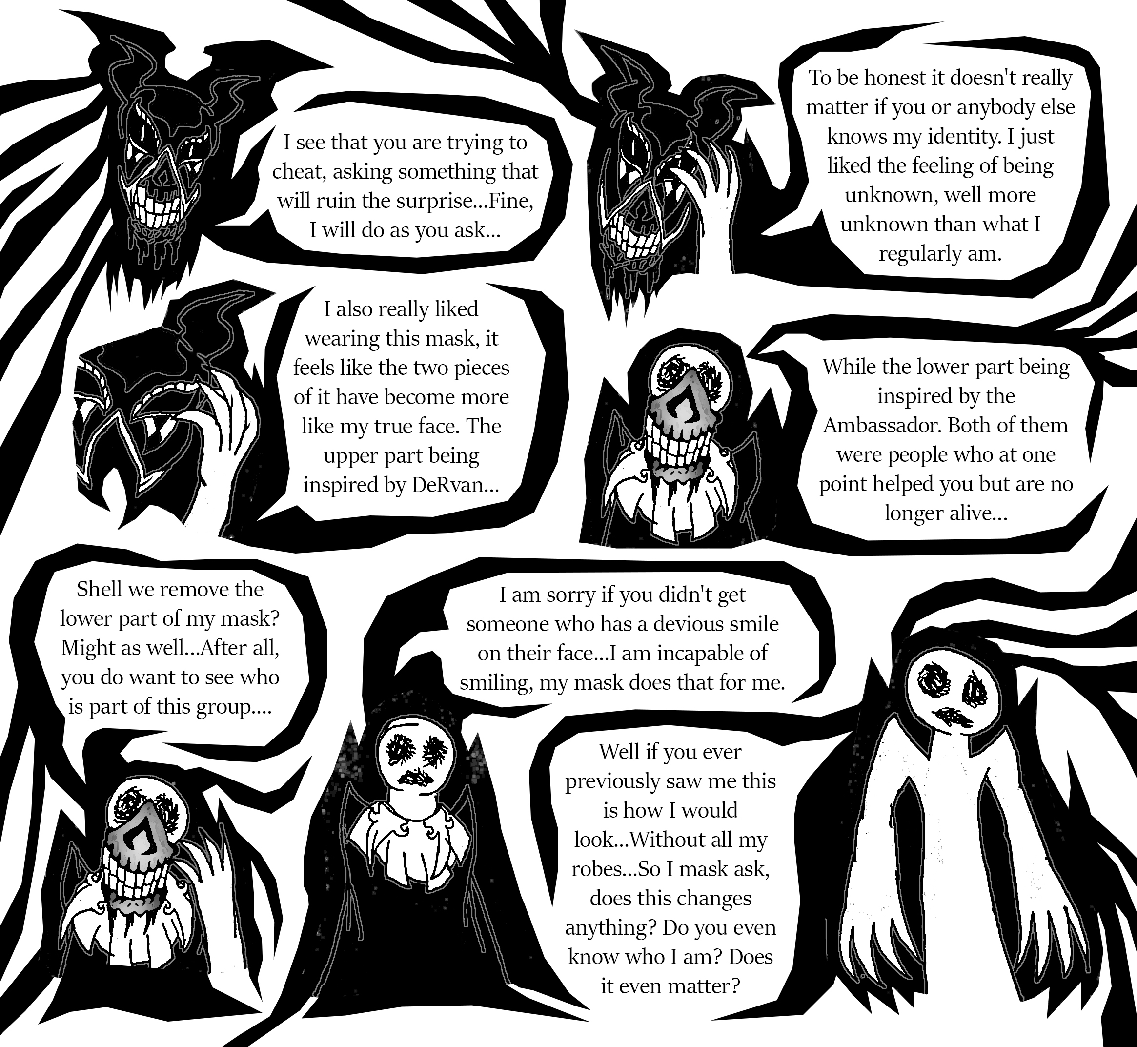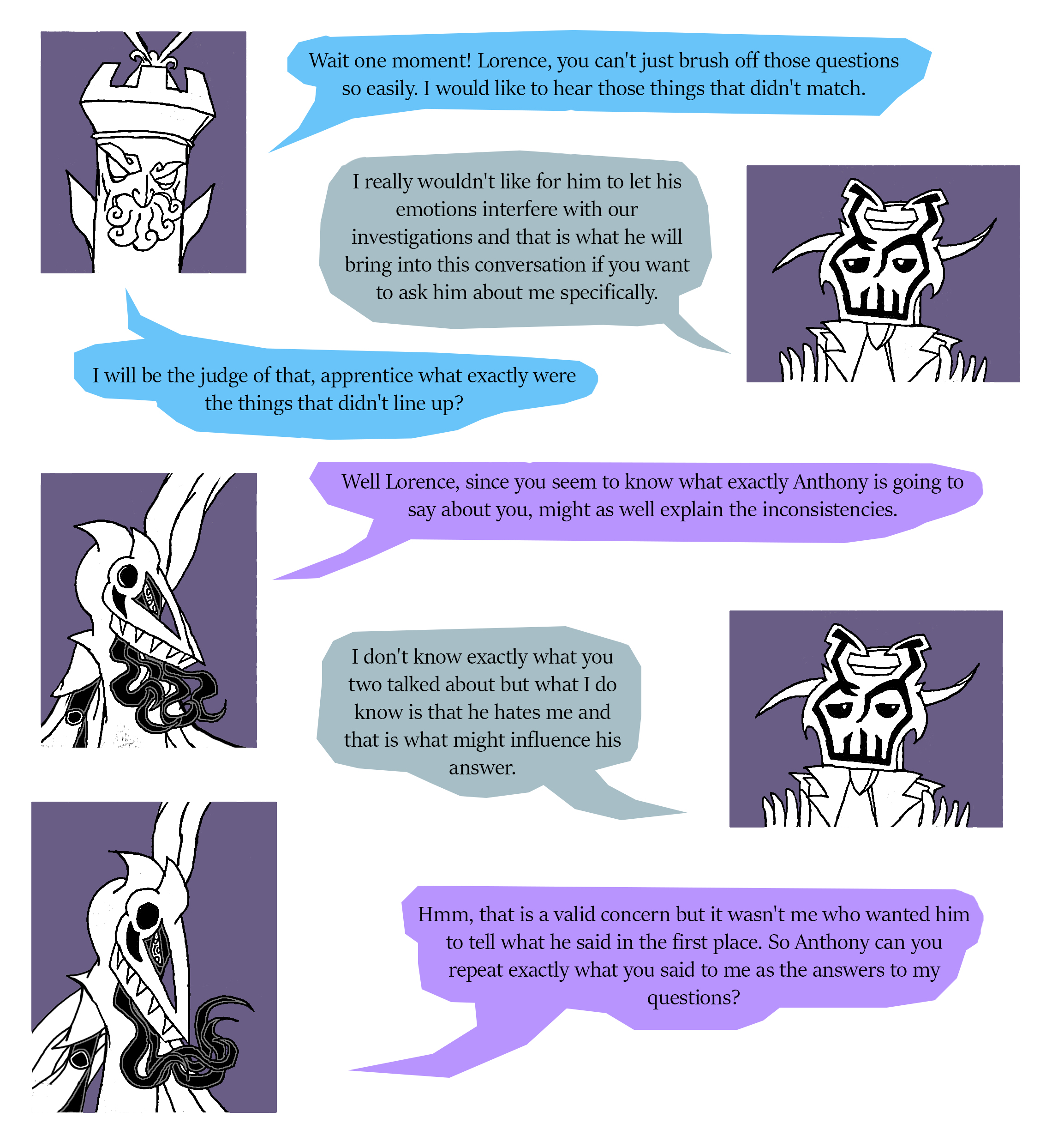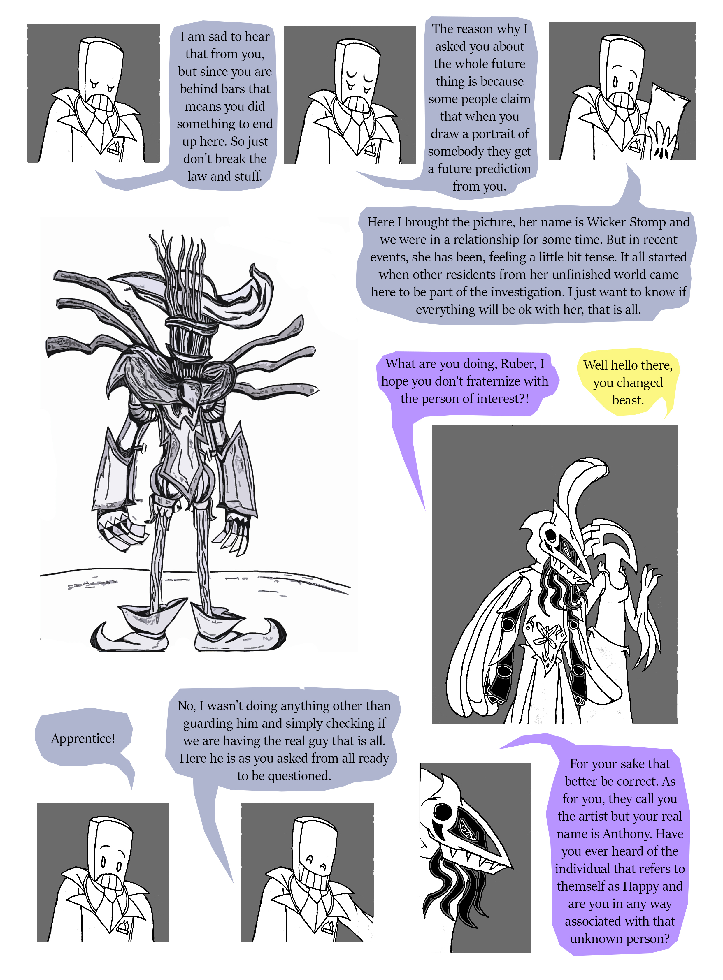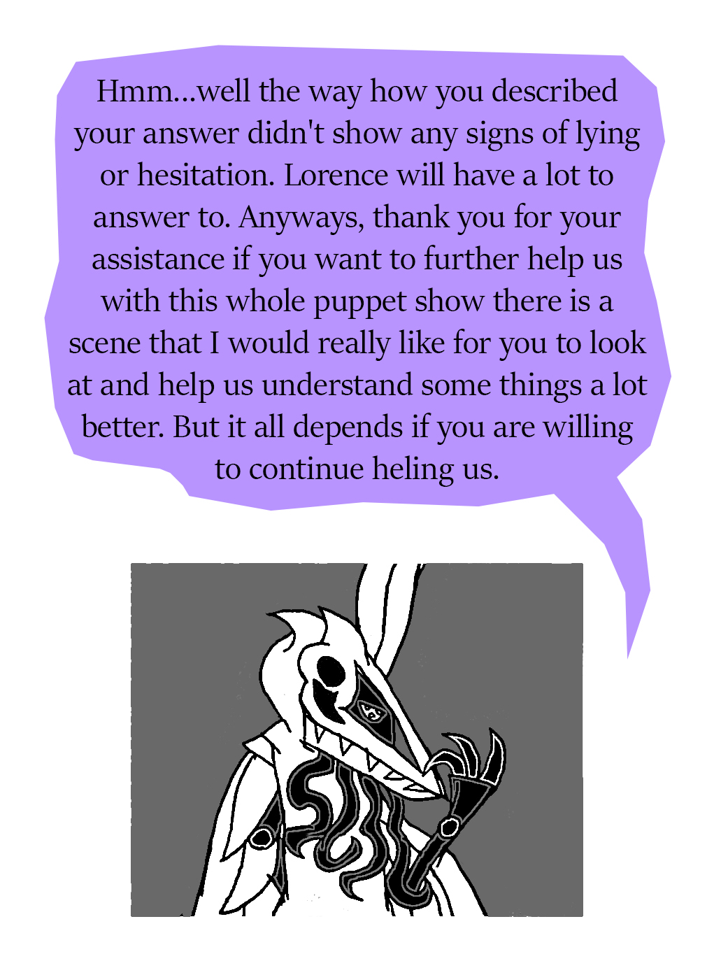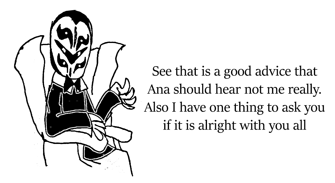 They place the call to the Ambassador who agrees to be her bodyguard after some very odd words and questions. He agrees to be her bodyguard as he was once a mortal and wants to gain more power, and even take over the Acolytes of Ash. It's made clear he sees her as something of a means to an end but at the same time she also agrees and the two form a rather tense alliance. After some very choice words the two end the call only for it to be revealed that Root's bodyguard, a silent monster named Stitch, is standing behind Ana, still acting on his previous order to find her and kill her. Stitch is a silent killer and a frankenstein's monster of an abomination. Ana freaks out but Blacky, gods bless his heart tells her to ring the bell again which will send her out of the pocket dimension. She does so just in time before Stitch has a chance to put his knife (which he keeps lodged in his neck) through her heart. However, Stitch is furious at Black for telling them how to escape. Stitch begins to break all of the bones in Blacky's hand except for Dreamwalker who is able to disguise himself uses his power to turn into Root, and he gives the order to not kill him. Stitch obeys but it doesn't mean "don't hurt him," and he breaks both the arms of Blacky and rips one of them off before putting a smile on his mask for Ana as she leaves watching all of this in horror.