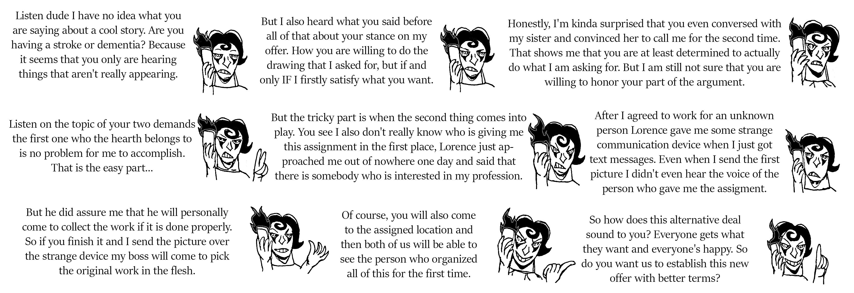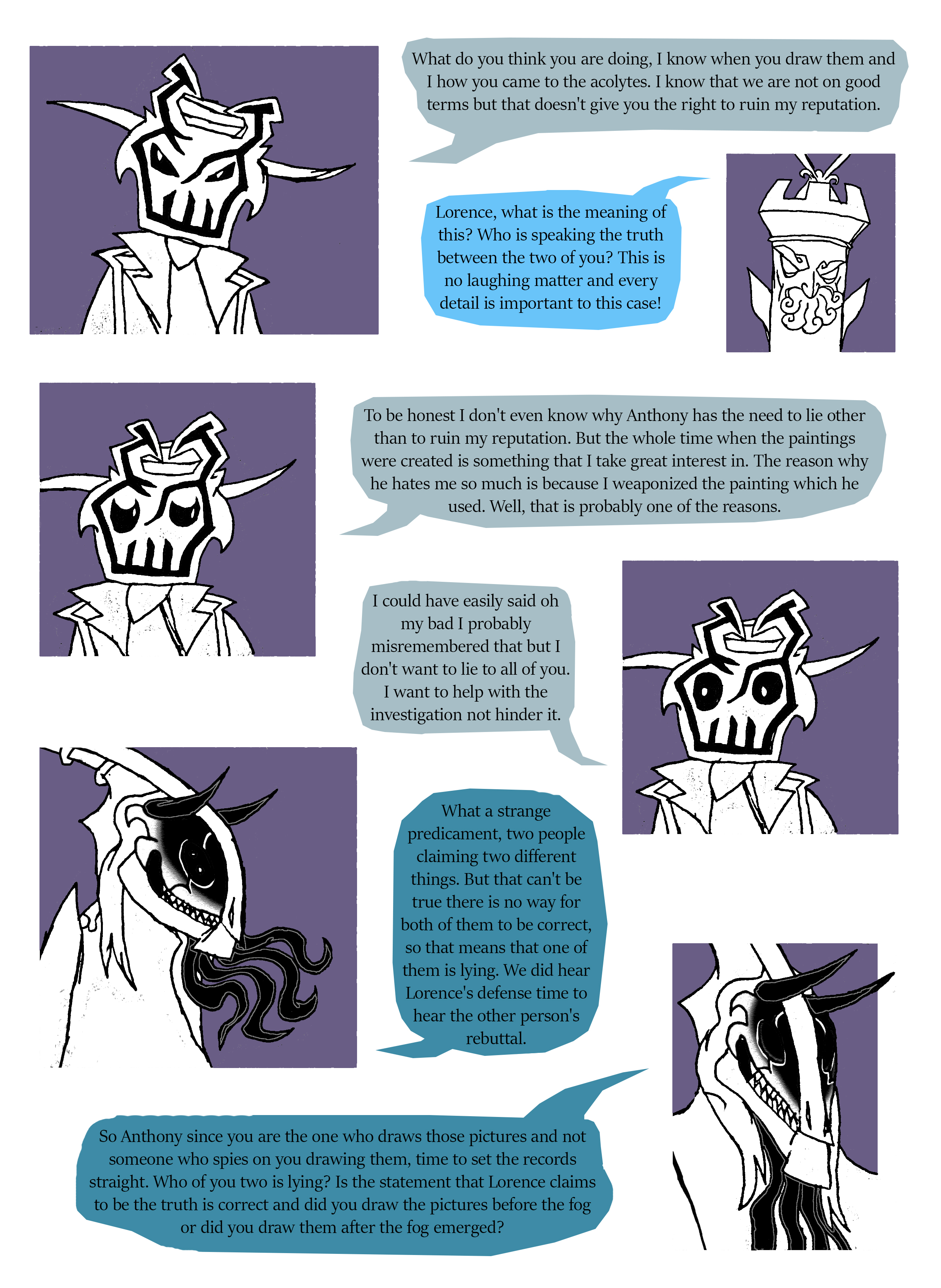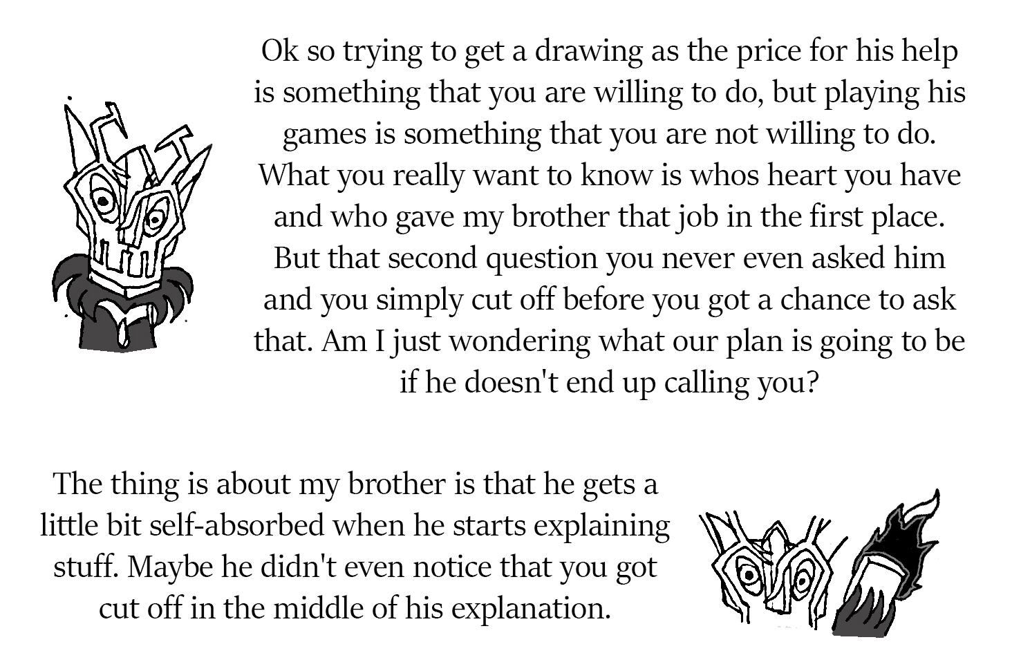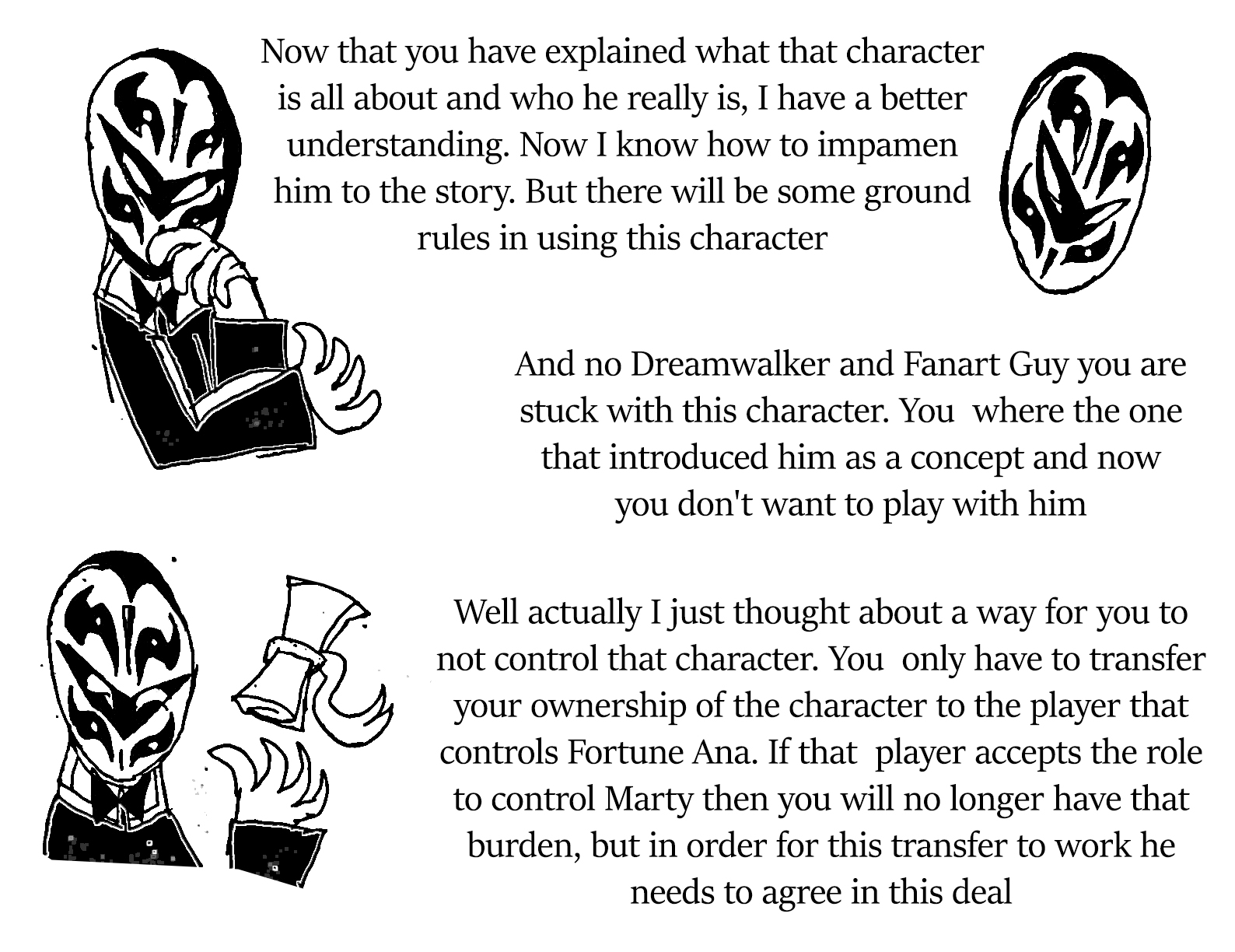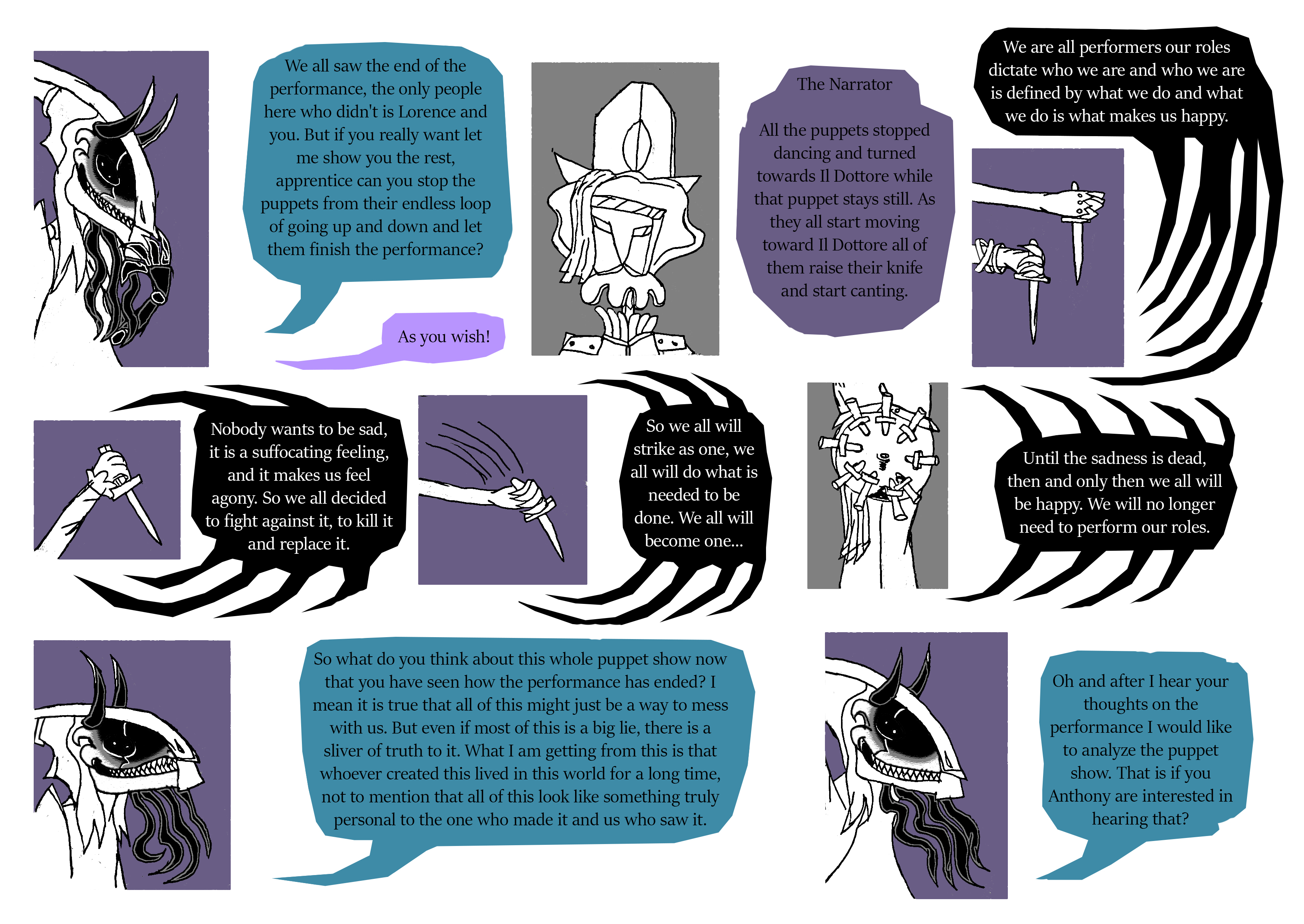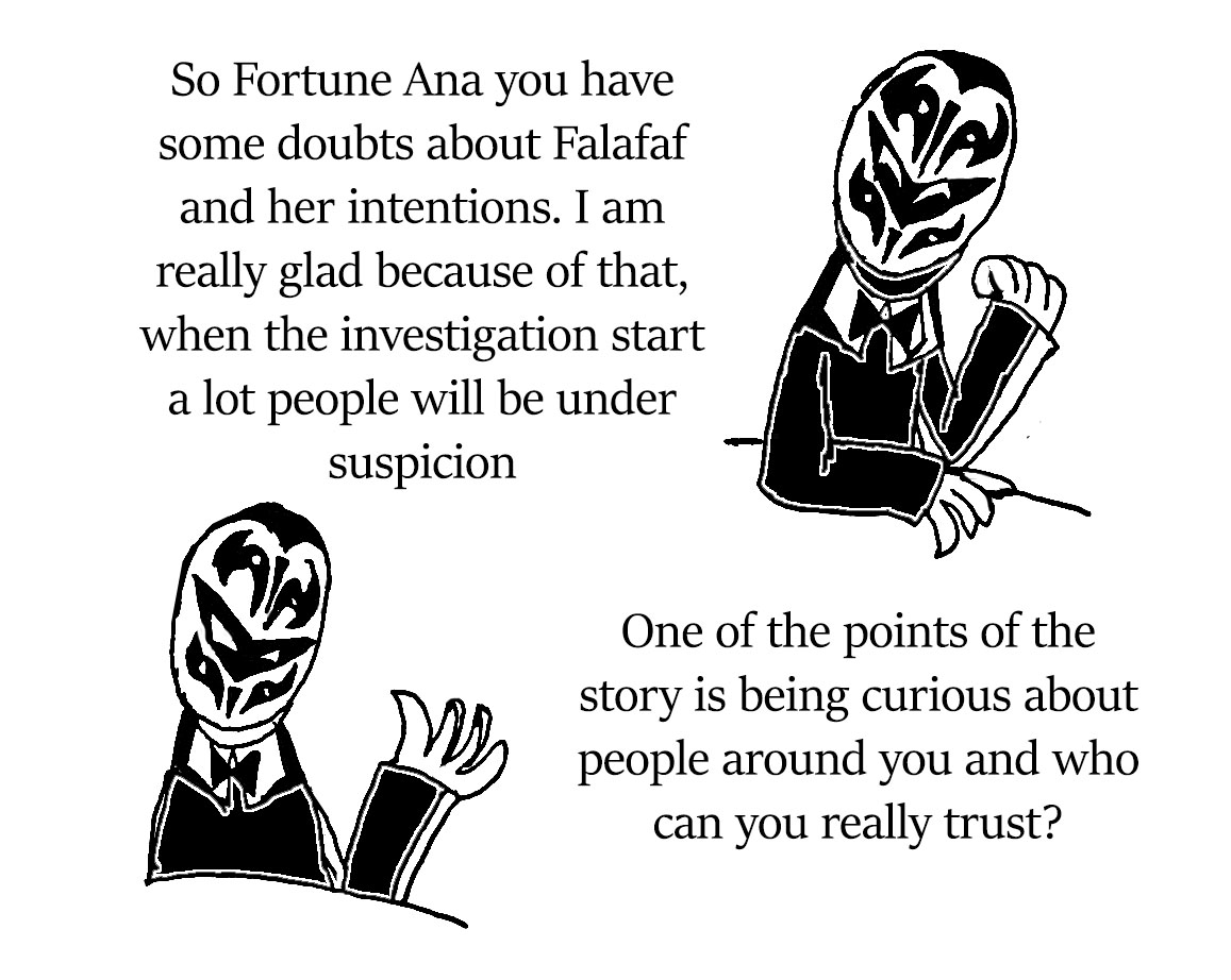They place the call to the Ambassador who agrees to be her bodyguard after some very odd words and questions. He agrees to be her bodyguard as he was once a mortal and wants to gain more power, and even take over the Acolytes of Ash. It's made clear he sees her as something of a means to an end but at the same time she also agrees and the two form a rather tense alliance. After some very choice words the two end the call only for it to be revealed that Root's bodyguard, a silent monster named Stitch, is standing behind Ana, still acting on his previous order to find her and kill her. Stitch is a silent killer and a frankenstein's monster of an abomination. Ana freaks out but Blacky, gods bless his heart tells her to ring the bell again which will send her out of the pocket dimension. She does so just in time before Stitch has a chance to put his knife (which he keeps lodged in his neck) through her heart. However, Stitch is furious at Black for telling them how to escape. Stitch begins to break all of the bones in Blacky's hand except for Dreamwalker who is able to disguise himself uses his power to turn into Root, and he gives the order to not kill him. Stitch obeys but it doesn't mean "don't hurt him," and he breaks both the arms of Blacky and rips one of them off before putting a smile on his mask for Ana as she leaves watching all of this in horror.