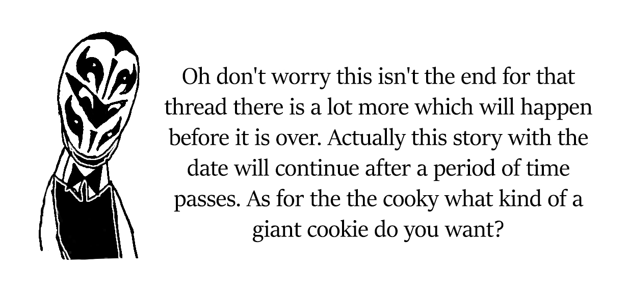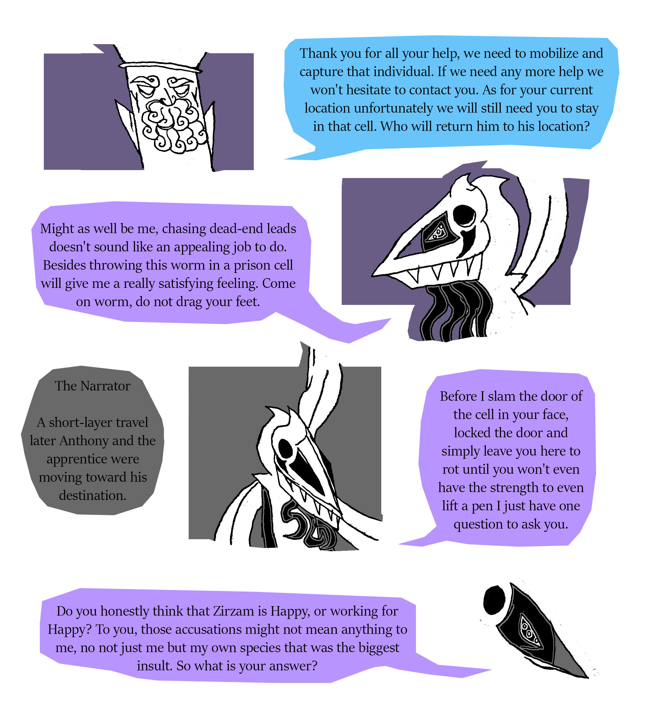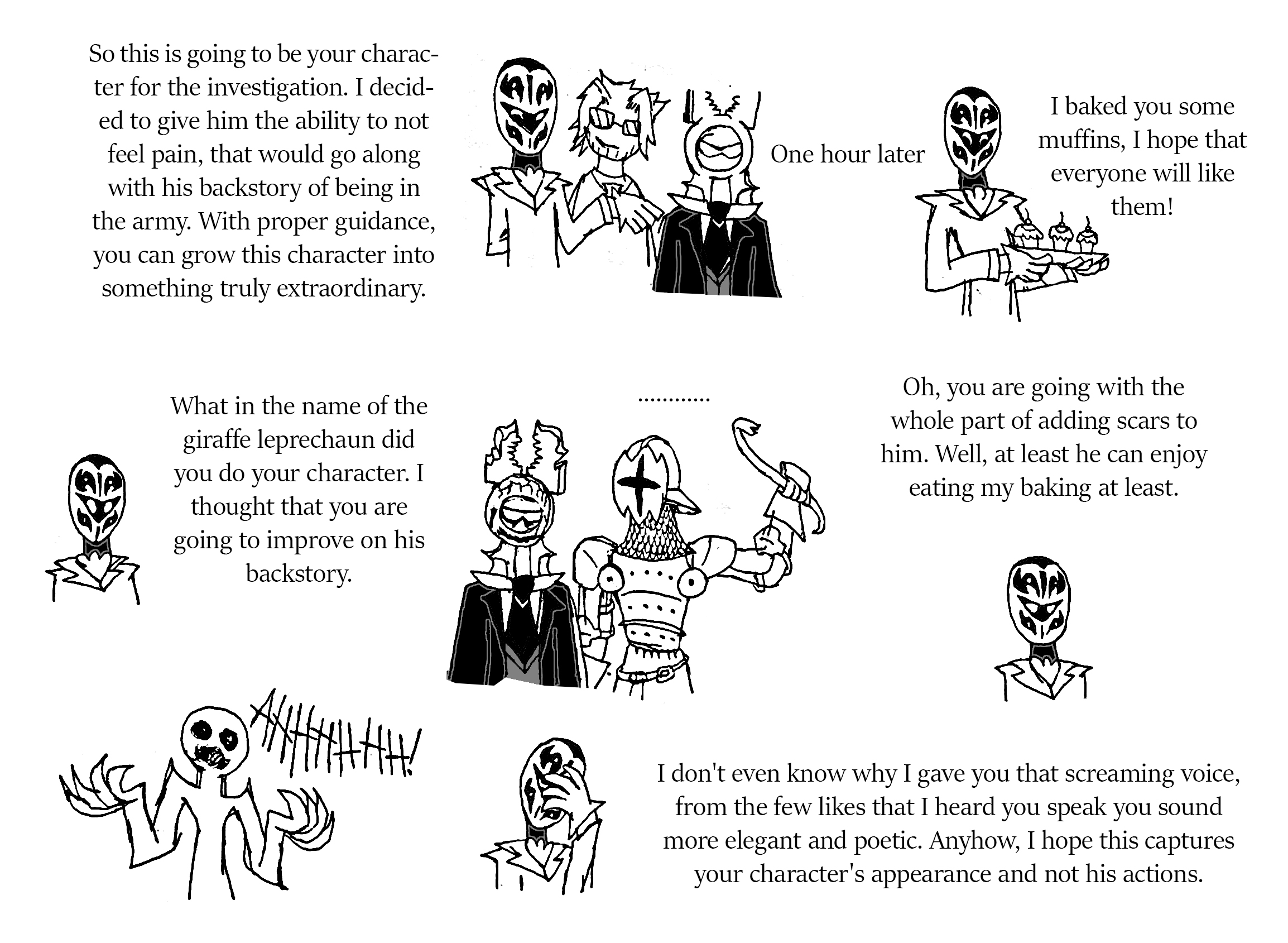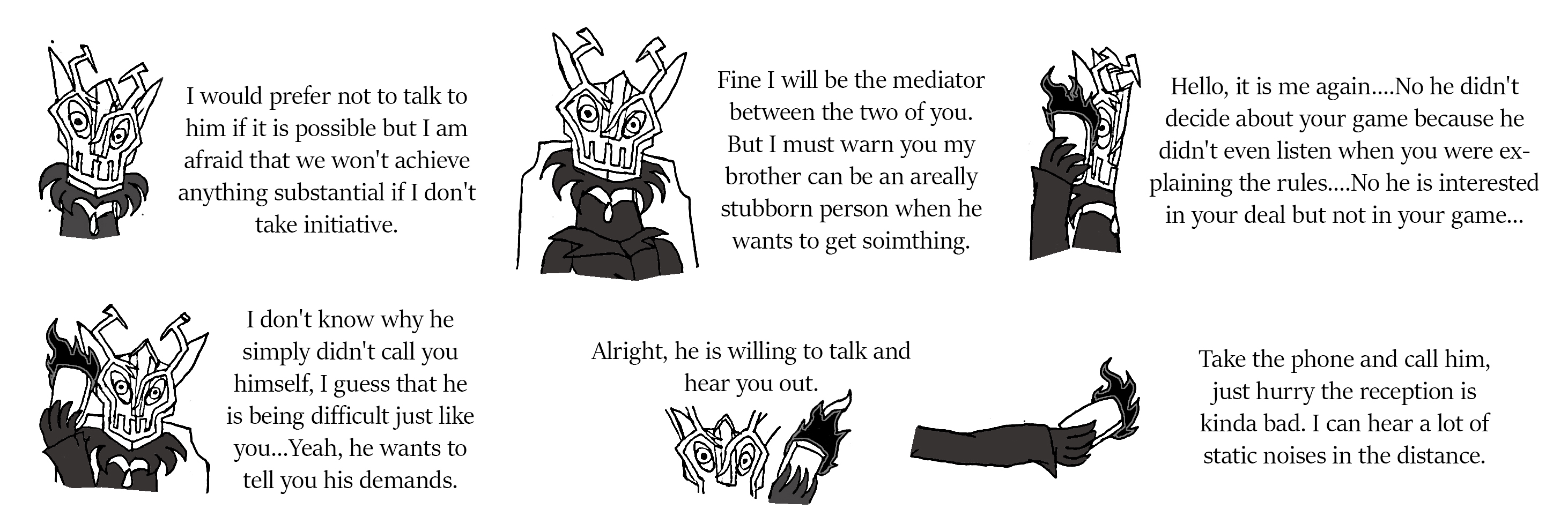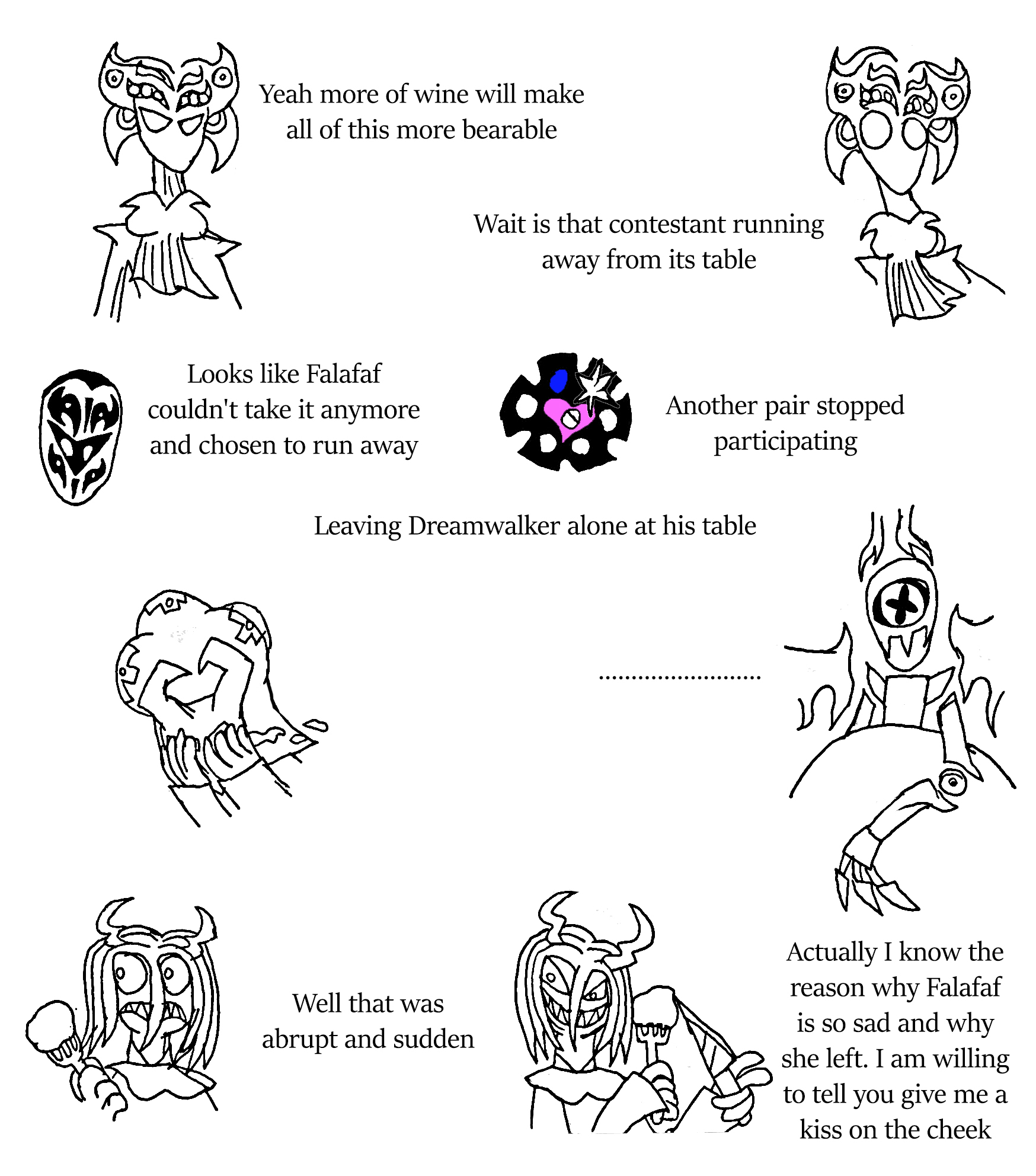 They place the call to the Ambassador who agrees to be her bodyguard after some very odd words and questions. He agrees to be her bodyguard as he was once a mortal and wants to gain more power, and even take over the Acolytes of Ash. It's made clear he sees her as something of a means to an end but at the same time she also agrees and the two form a rather tense alliance. After some very choice words the two end the call only for it to be revealed that Root's bodyguard, a silent monster named Stitch, is standing behind Ana, still acting on his previous order to find her and kill her. Stitch is a silent killer and a frankenstein's monster of an abomination. Ana freaks out but Blacky, gods bless his heart tells her to ring the bell again which will send her out of the pocket dimension. She does so just in time before Stitch has a chance to put his knife (which he keeps lodged in his neck) through her heart. However, Stitch is furious at Black for telling them how to escape. Stitch begins to break all of the bones in Blacky's hand except for Dreamwalker who is able to disguise himself uses his power to turn into Root, and he gives the order to not kill him. Stitch obeys but it doesn't mean "don't hurt him," and he breaks both the arms of Blacky and rips one of them off before putting a smile on his mask for Ana as she leaves watching all of this in horror.