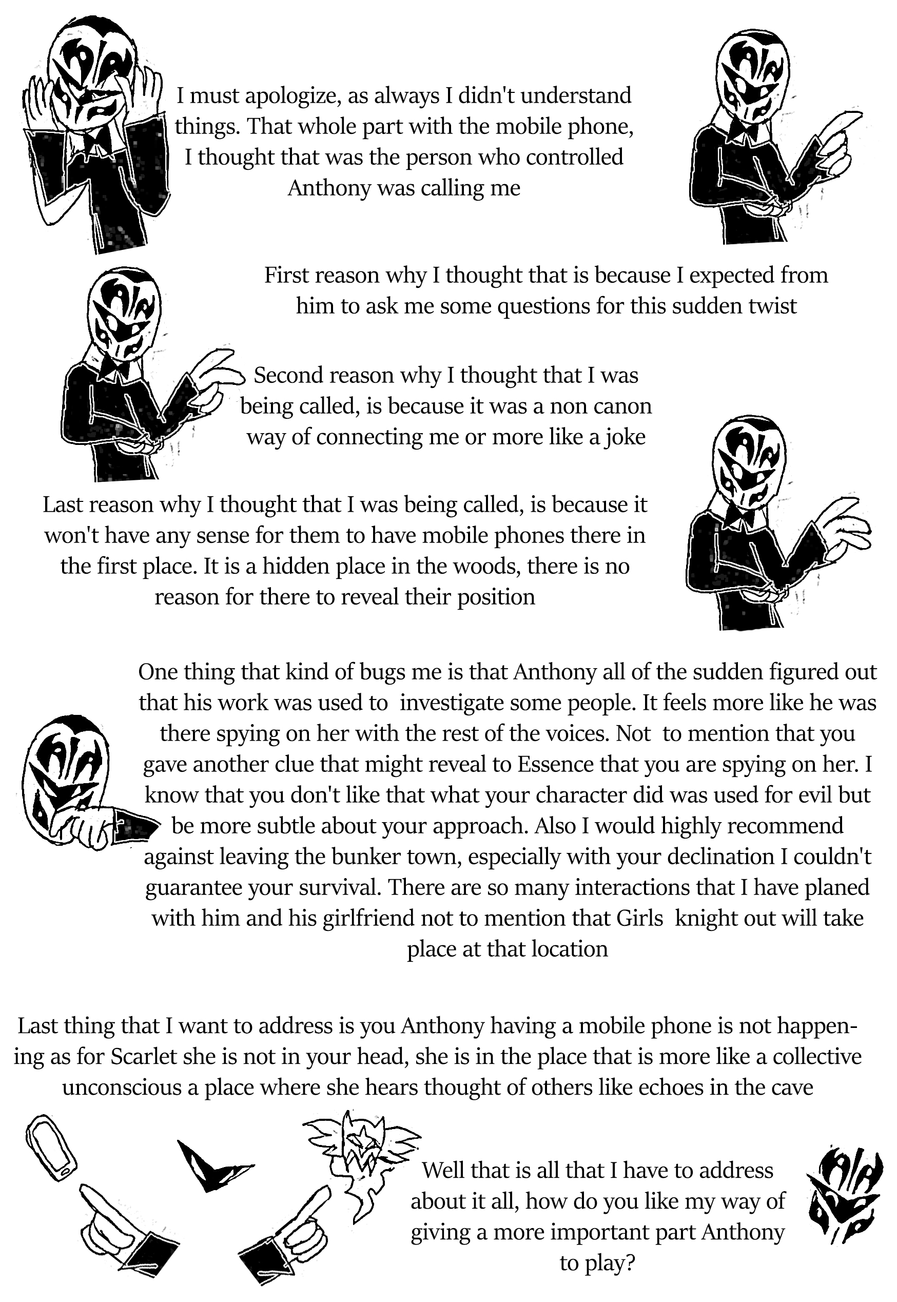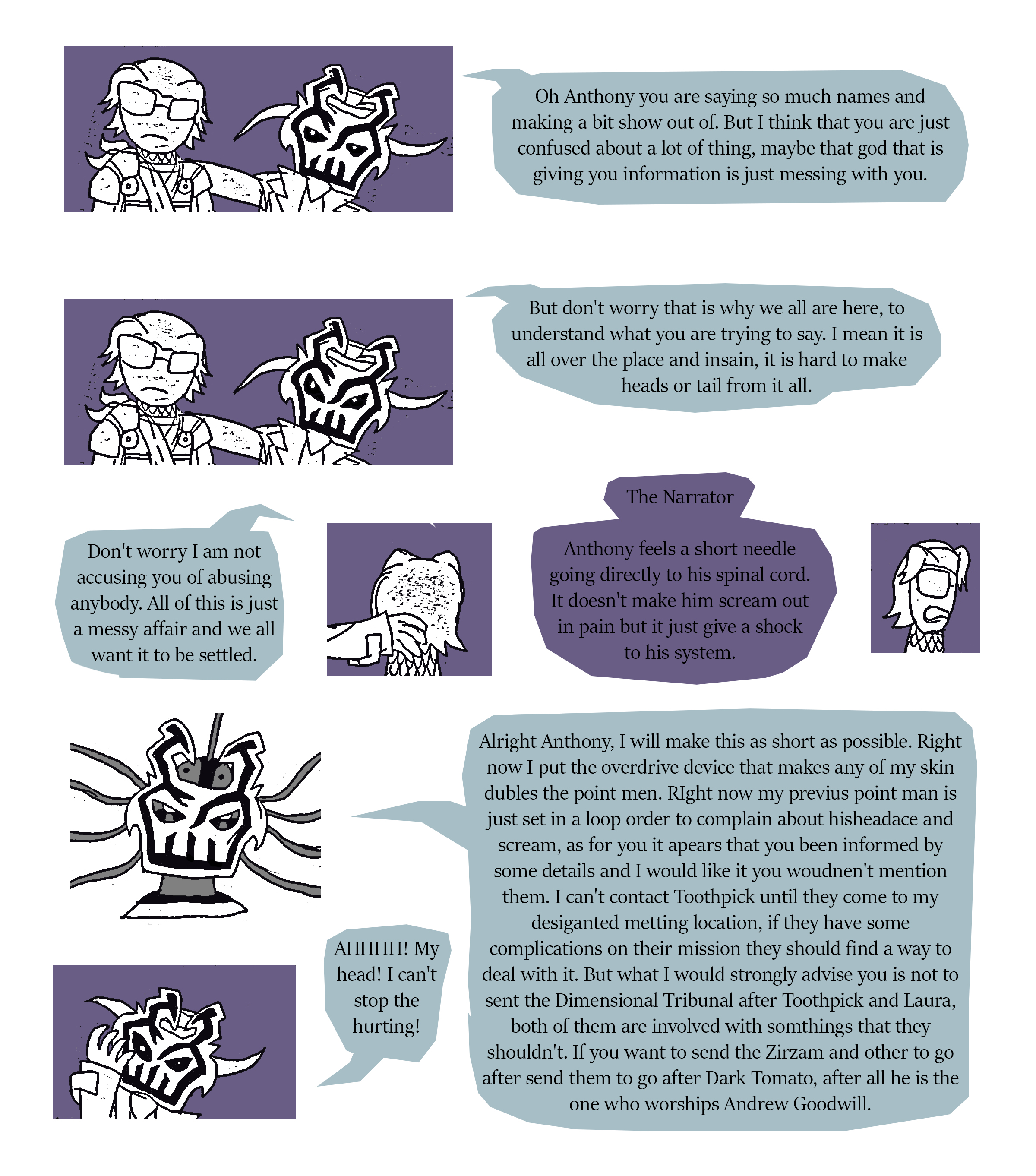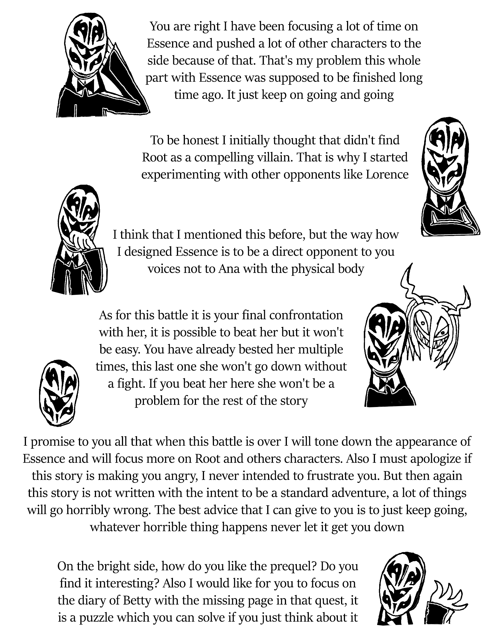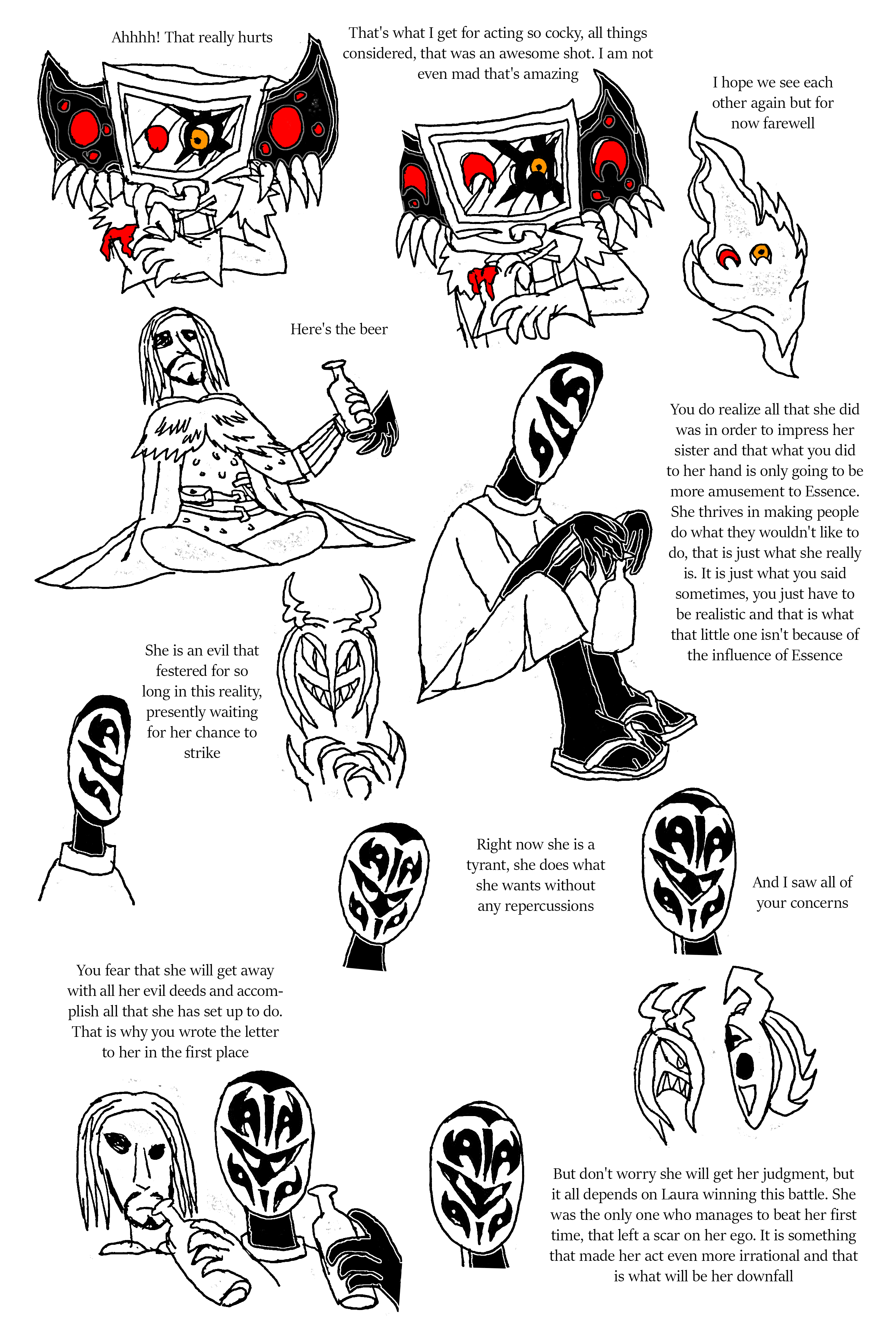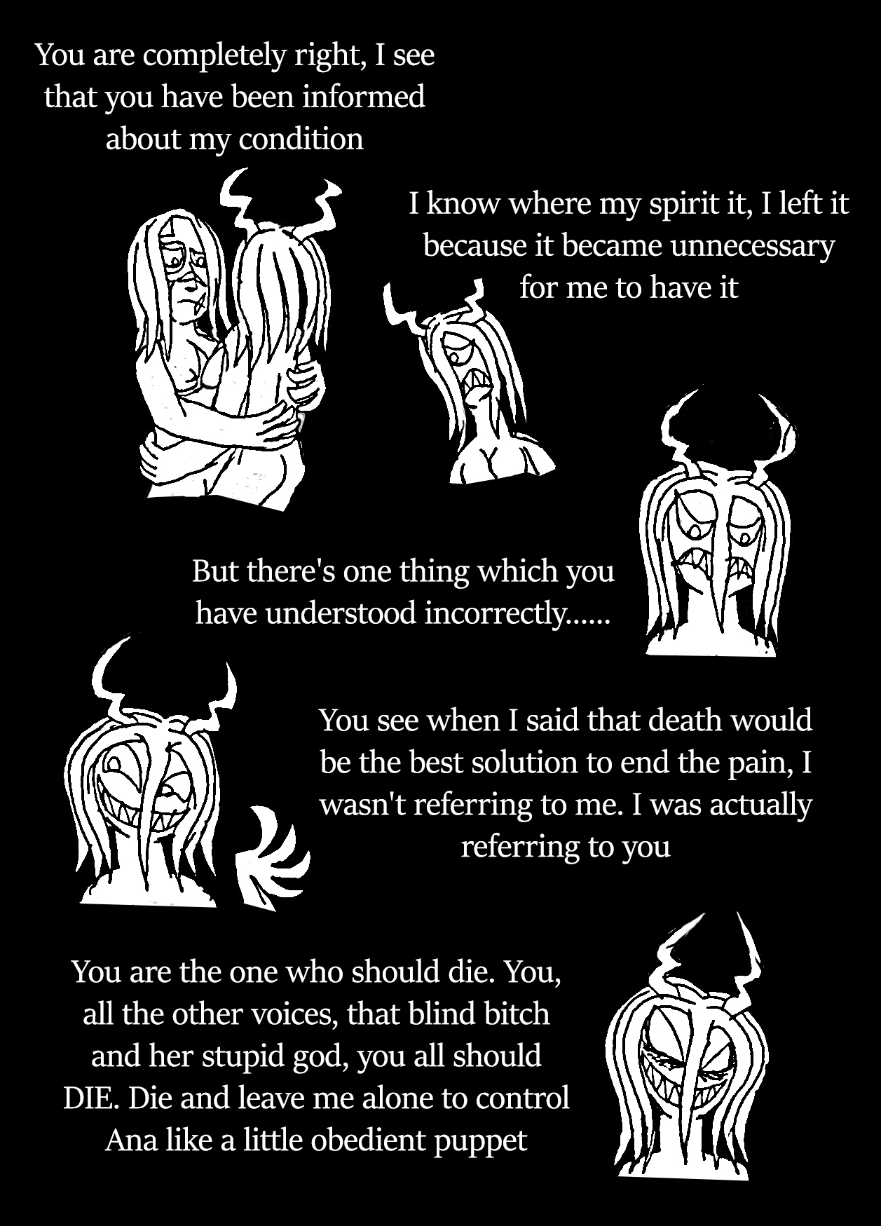 Meanwhile all of this going on Ana is talking with the young offspring of Mother Gaia and Absolution, who is promptly named Absolution Jr, and from this point on goes by AJ. AJ shows her that now with him acting as her right eye, Ana now has access to basic magic abilities. Ana is able to summon fireball and shoot it like a bullet from her finger. However this is the extent of her power so far, and it's all AJ can give her at the moment as WC is actually hindering her and AJ's ability to evolve and grow further at the moment, they will still grow however but at a slower rate. When suddenly, who should appear by Andrew Goodwill again. He reveals that Clara suddenly attacking was against his order and that Root was the one who ordered the death of Absolution due to receiving knowledge of another universe that had a far greater impact with magic and that he needed to die in order stop such a cataclysmic future. As stated this was against Andrew's orders and so he feels Root needs to be punished for his insubordination. He also plays the blame game and tries to convince Ana that her voices are actually a hinderance to her but it doesn't really work, although he does give some convincing arguments. In response Andrew gives Ana a sudden nightmare of her being attacked by a singing Root and immediately tries to blame it on the newest arrival to this meeting.
