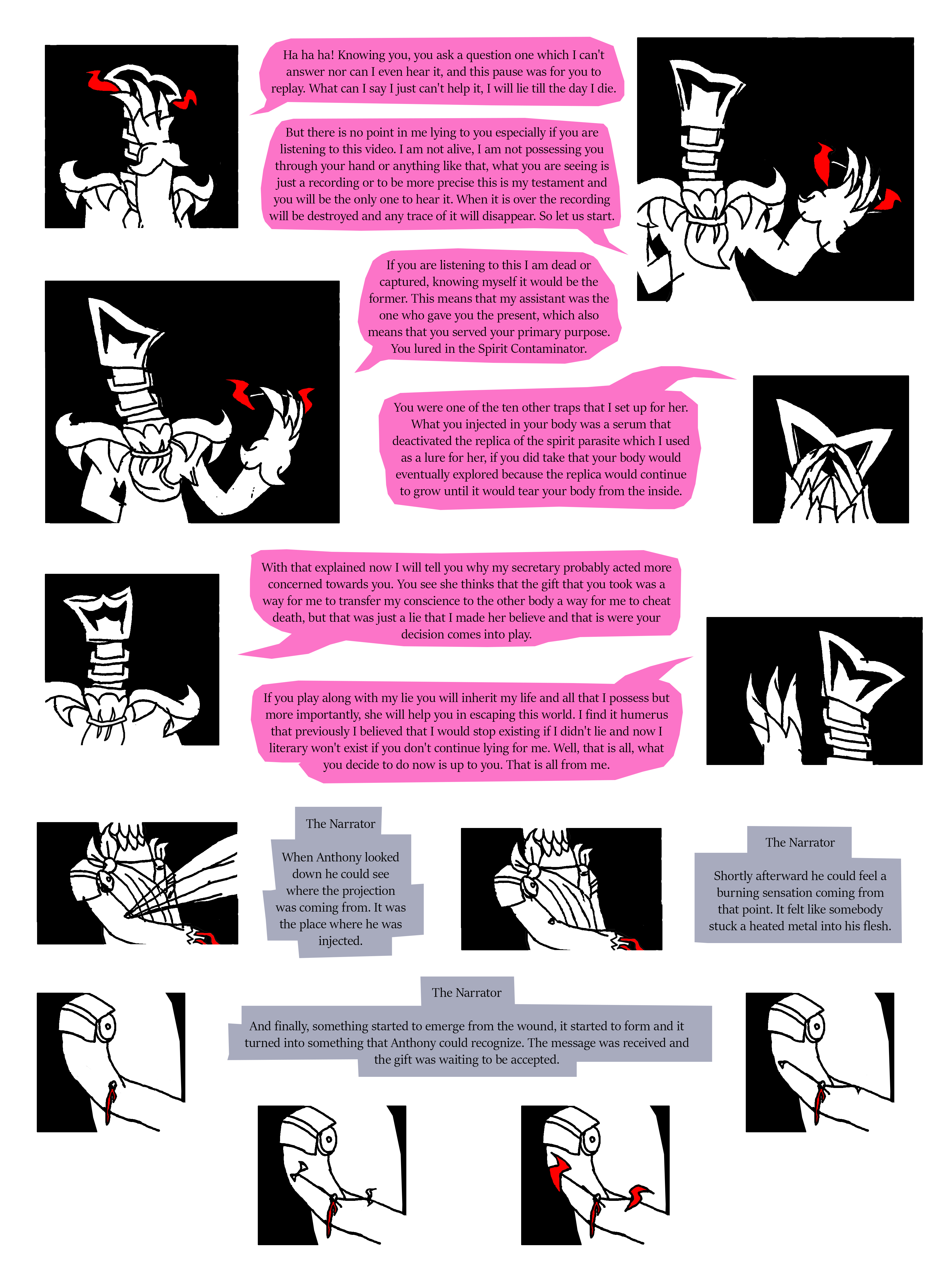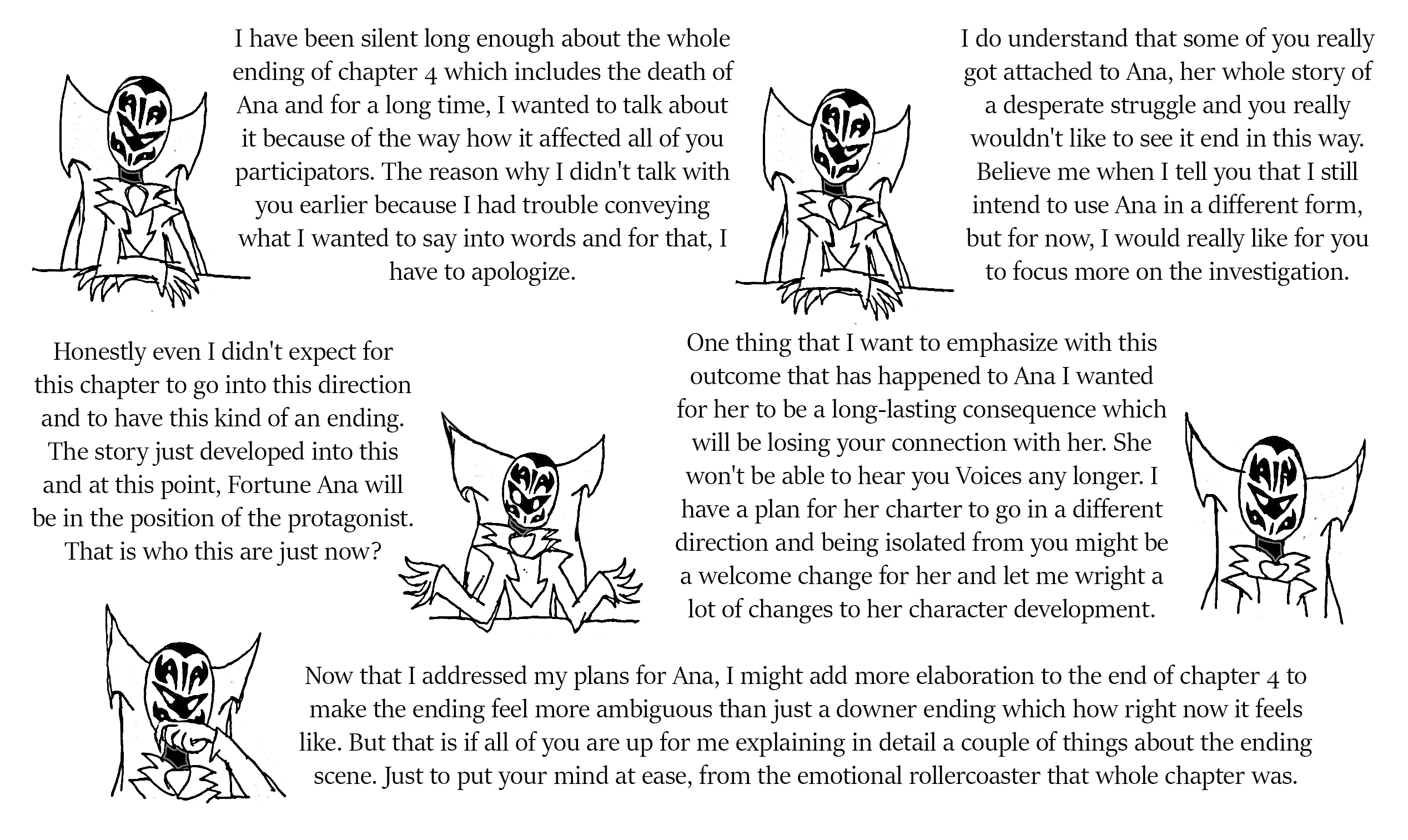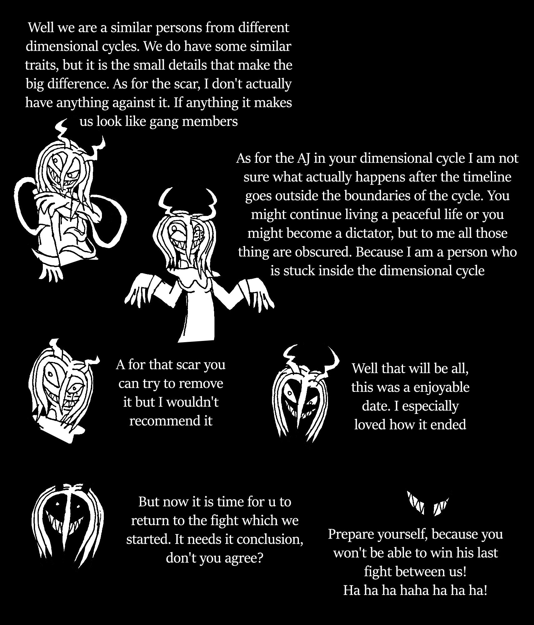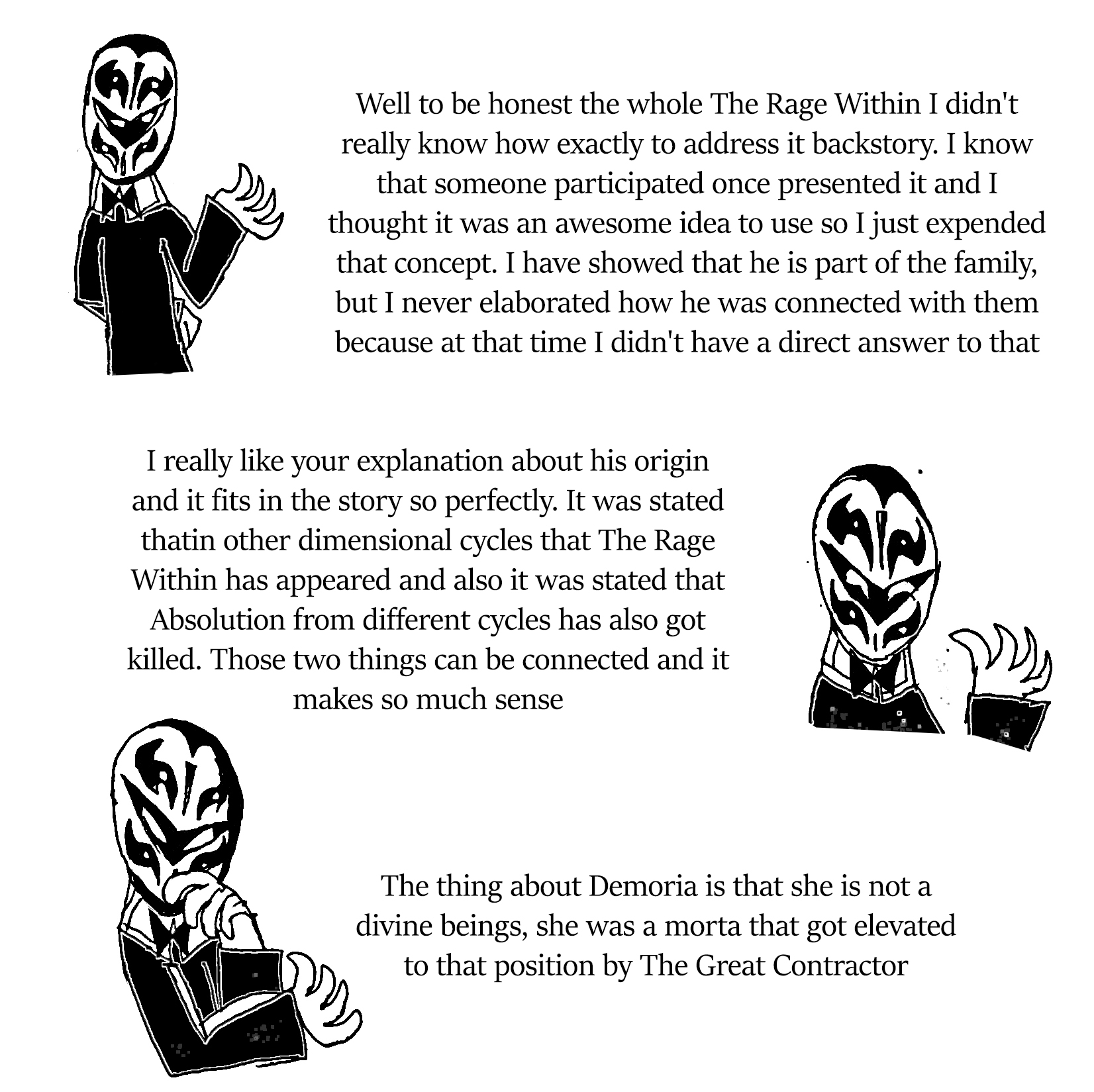 Meanwhile all of this going on Ana is talking with the young offspring of Mother Gaia and Absolution, who is promptly named Absolution Jr, and from this point on goes by AJ. AJ shows her that now with him acting as her right eye, Ana now has access to basic magic abilities. Ana is able to summon fireball and shoot it like a bullet from her finger. However this is the extent of her power so far, and it's all AJ can give her at the moment as WC is actually hindering her and AJ's ability to evolve and grow further at the moment, they will still grow however but at a slower rate. When suddenly, who should appear by Andrew Goodwill again. He reveals that Clara suddenly attacking was against his order and that Root was the one who ordered the death of Absolution due to receiving knowledge of another universe that had a far greater impact with magic and that he needed to die in order stop such a cataclysmic future. As stated this was against Andrew's orders and so he feels Root needs to be punished for his insubordination. He also plays the blame game and tries to convince Ana that her voices are actually a hinderance to her but it doesn't really work, although he does give some convincing arguments. In response Andrew gives Ana a sudden nightmare of her being attacked by a singing Root and immediately tries to blame it on the newest arrival to this meeting.