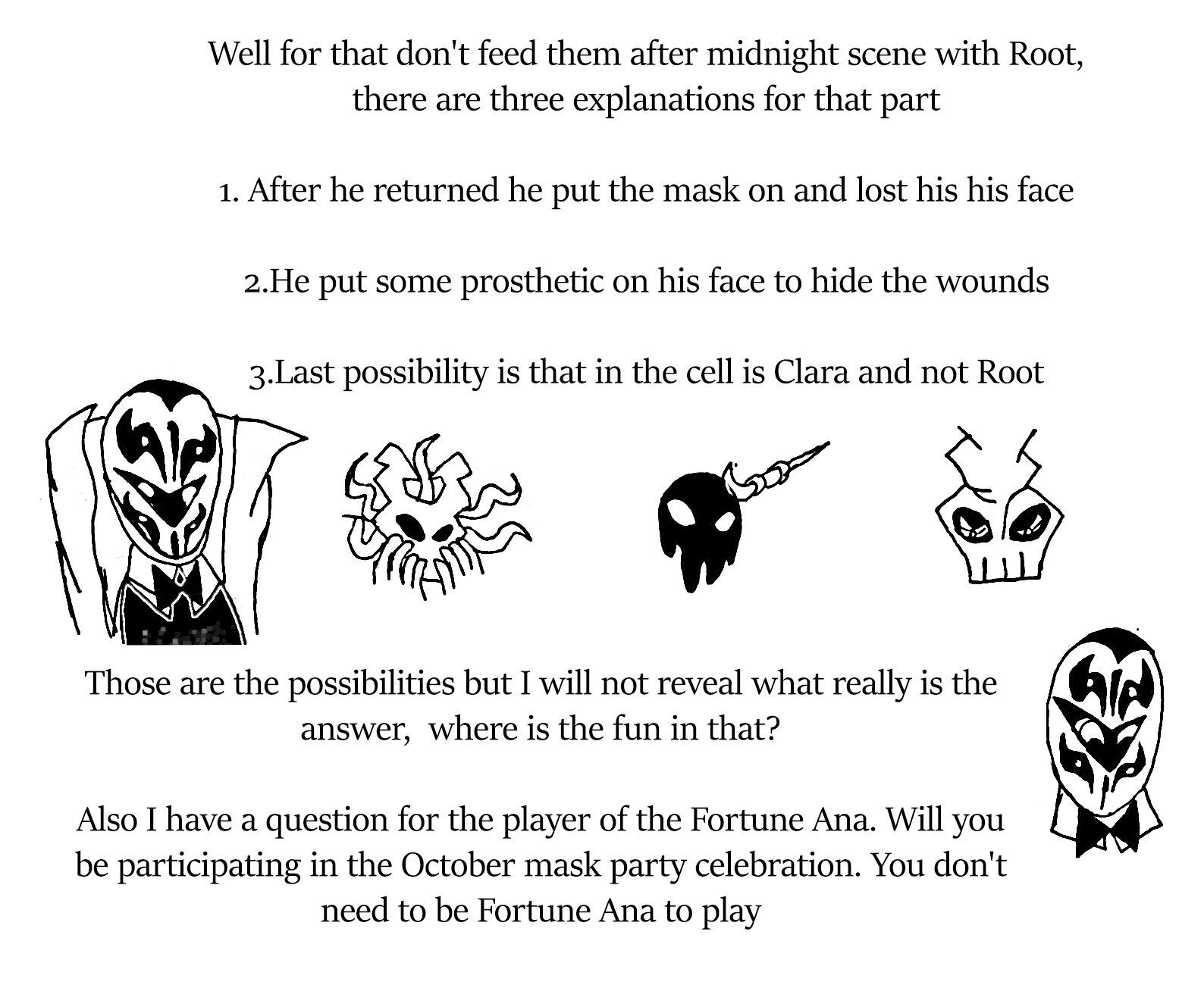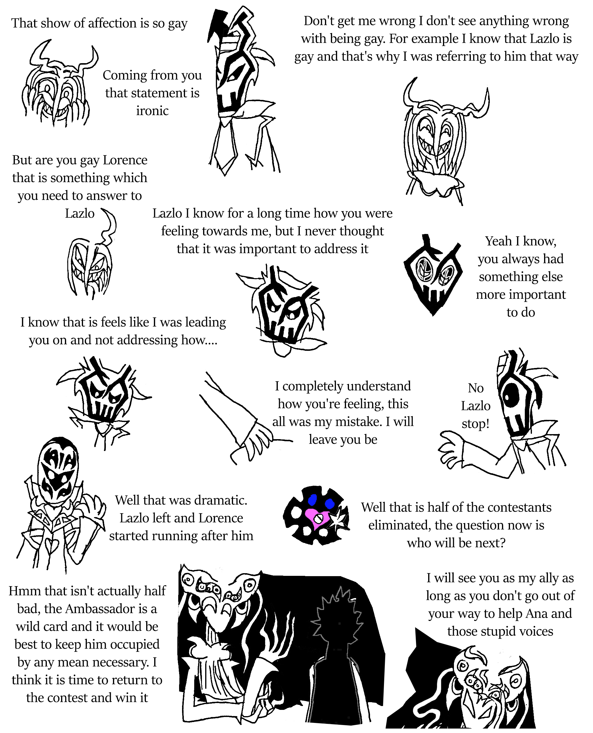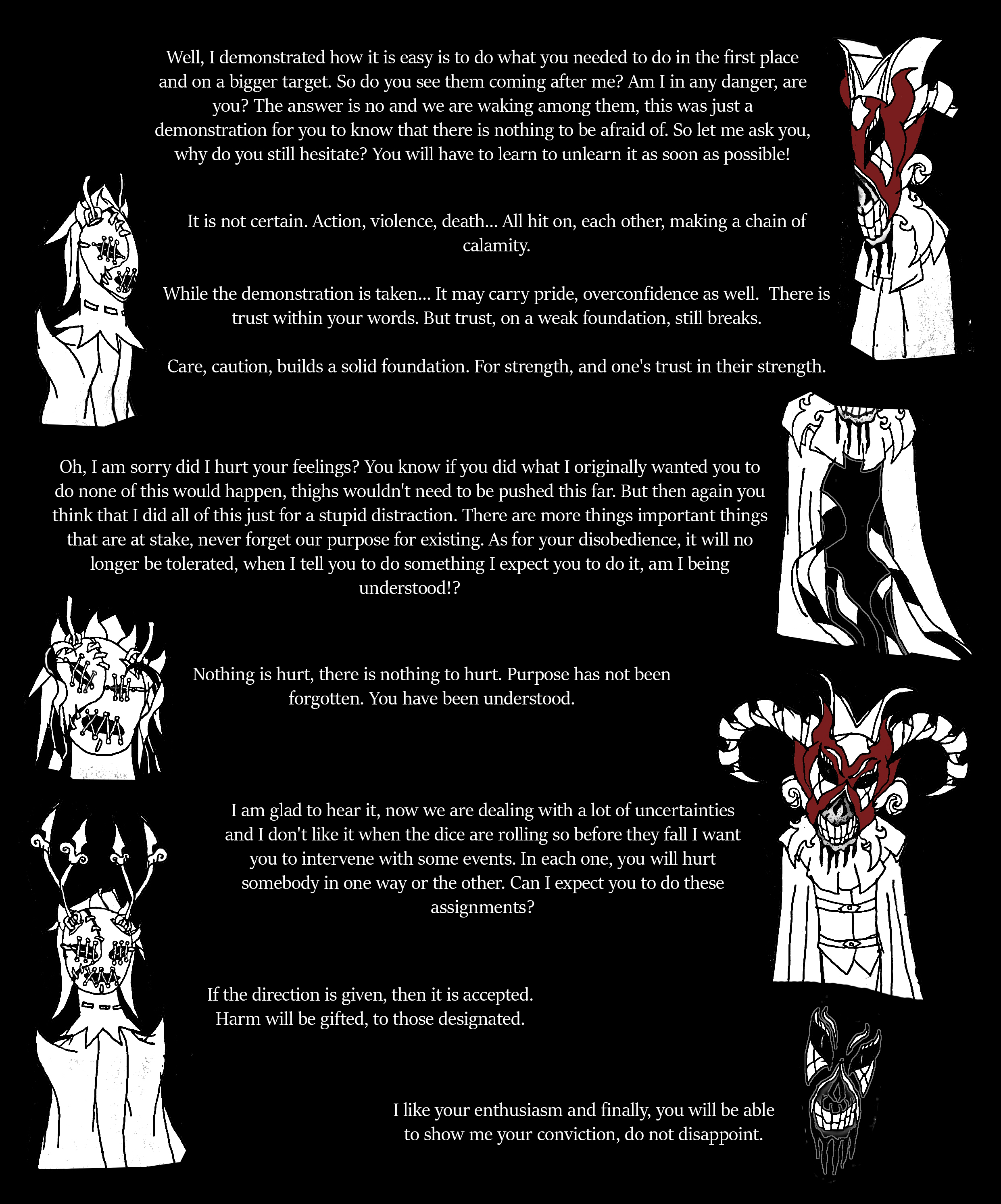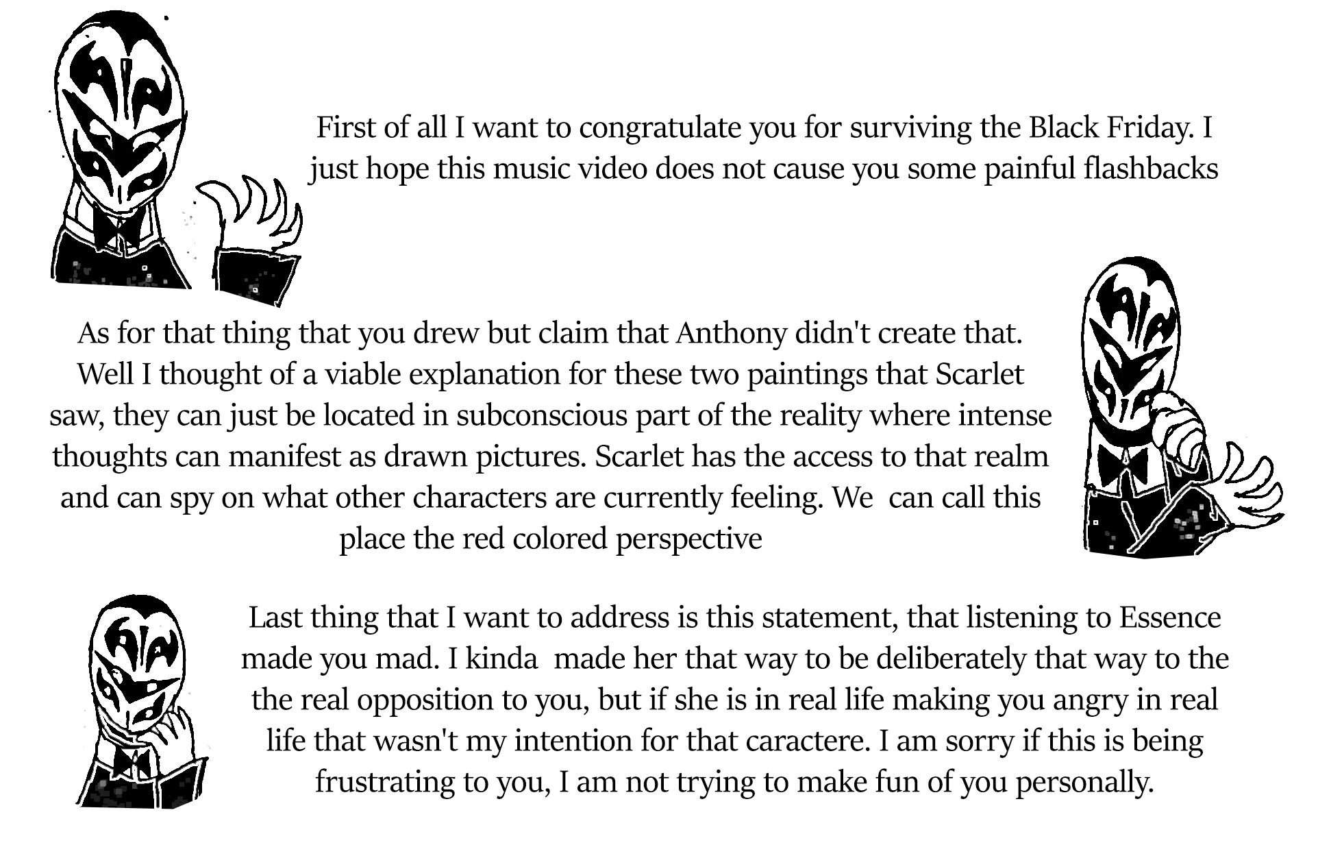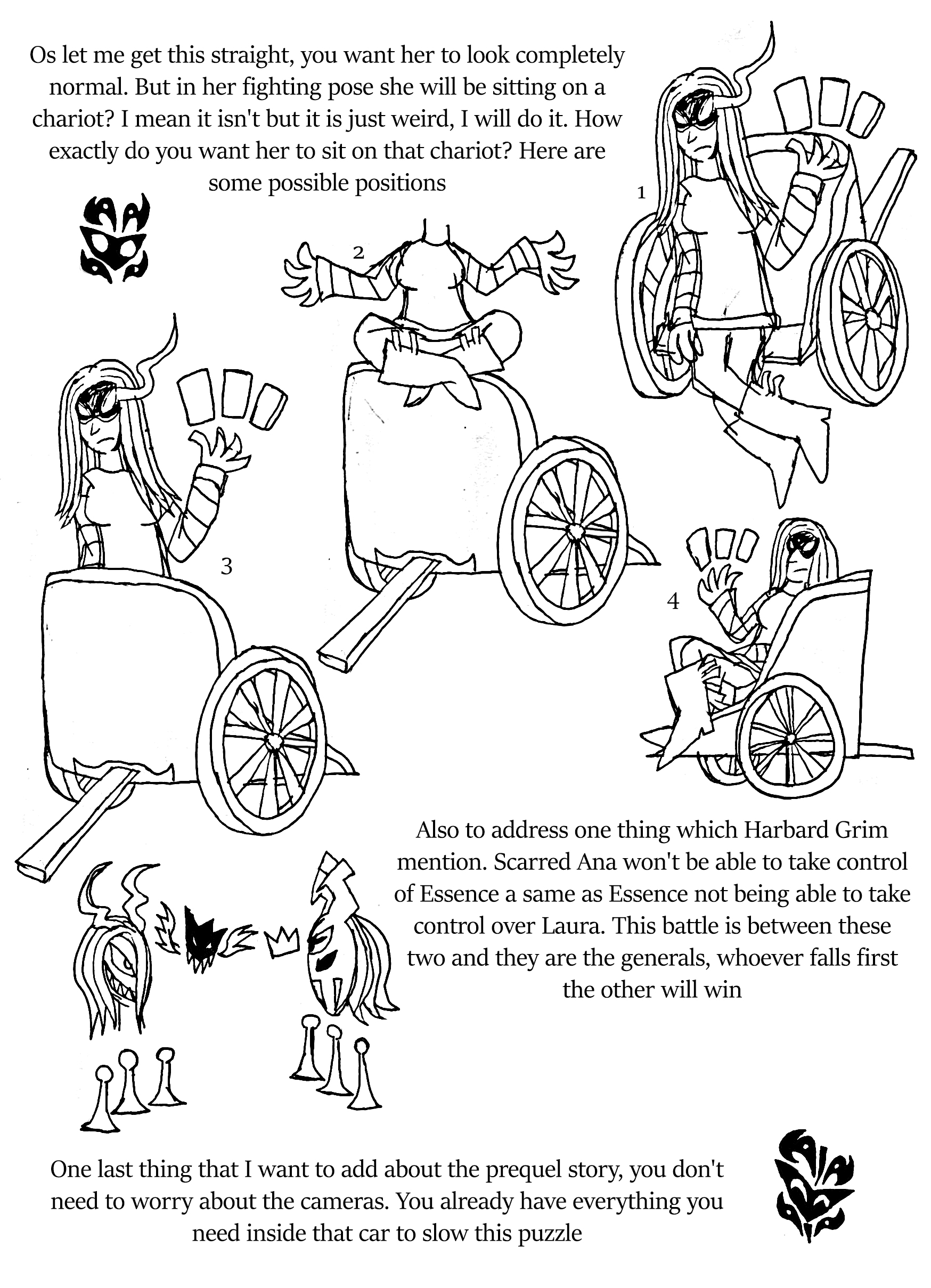 Meanwhile all of this going on Ana is talking with the young offspring of Mother Gaia and Absolution, who is promptly named Absolution Jr, and from this point on goes by AJ. AJ shows her that now with him acting as her right eye, Ana now has access to basic magic abilities. Ana is able to summon fireball and shoot it like a bullet from her finger. However this is the extent of her power so far, and it's all AJ can give her at the moment as WC is actually hindering her and AJ's ability to evolve and grow further at the moment, they will still grow however but at a slower rate. When suddenly, who should appear by Andrew Goodwill again. He reveals that Clara suddenly attacking was against his order and that Root was the one who ordered the death of Absolution due to receiving knowledge of another universe that had a far greater impact with magic and that he needed to die in order stop such a cataclysmic future. As stated this was against Andrew's orders and so he feels Root needs to be punished for his insubordination. He also plays the blame game and tries to convince Ana that her voices are actually a hinderance to her but it doesn't really work, although he does give some convincing arguments. In response Andrew gives Ana a sudden nightmare of her being attacked by a singing Root and immediately tries to blame it on the newest arrival to this meeting.