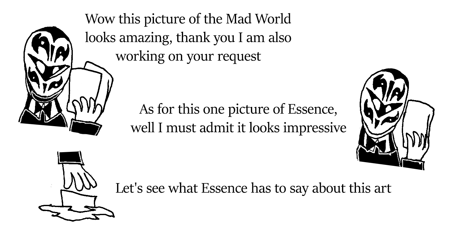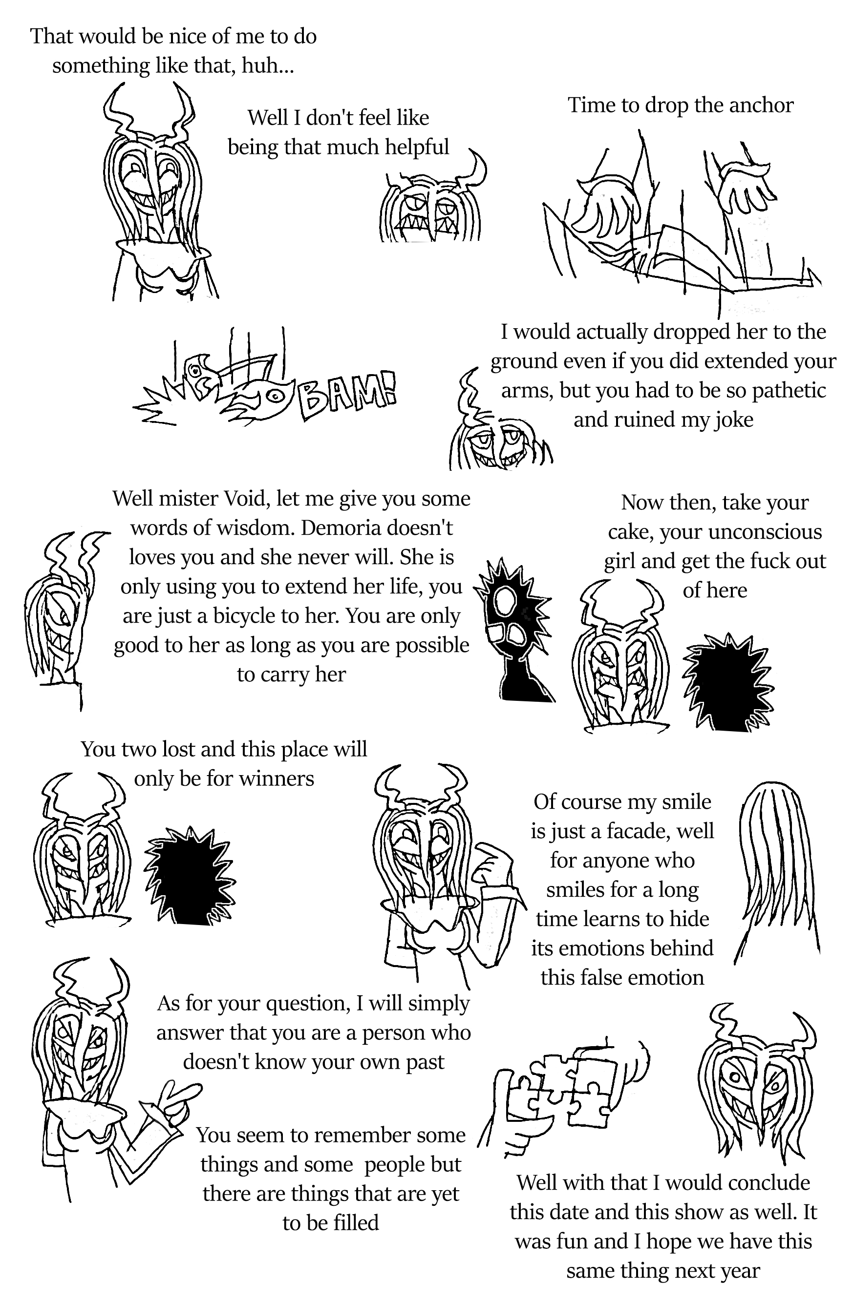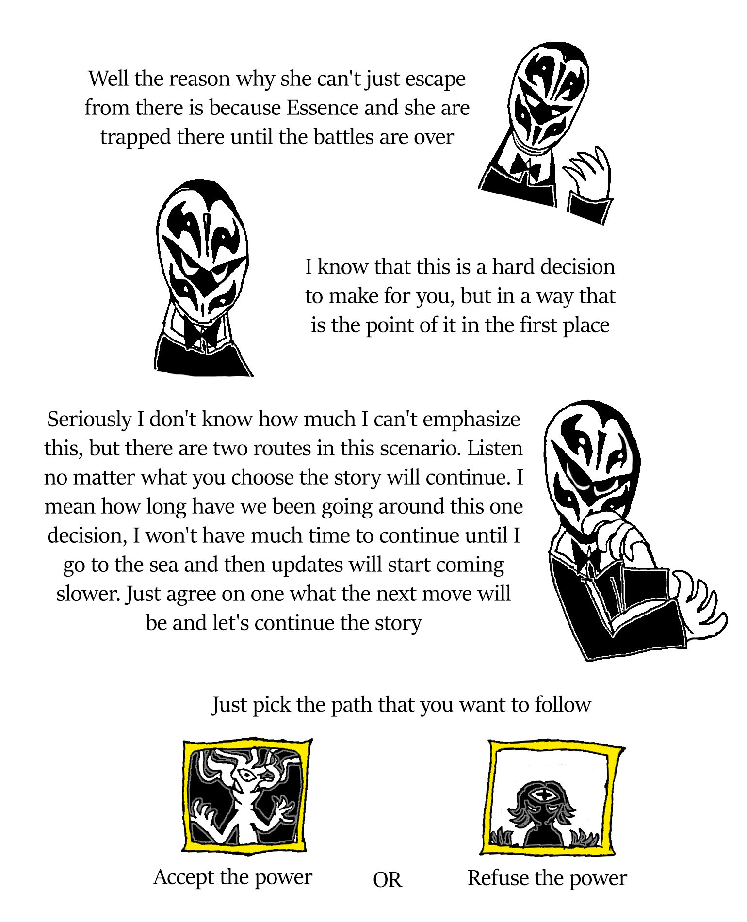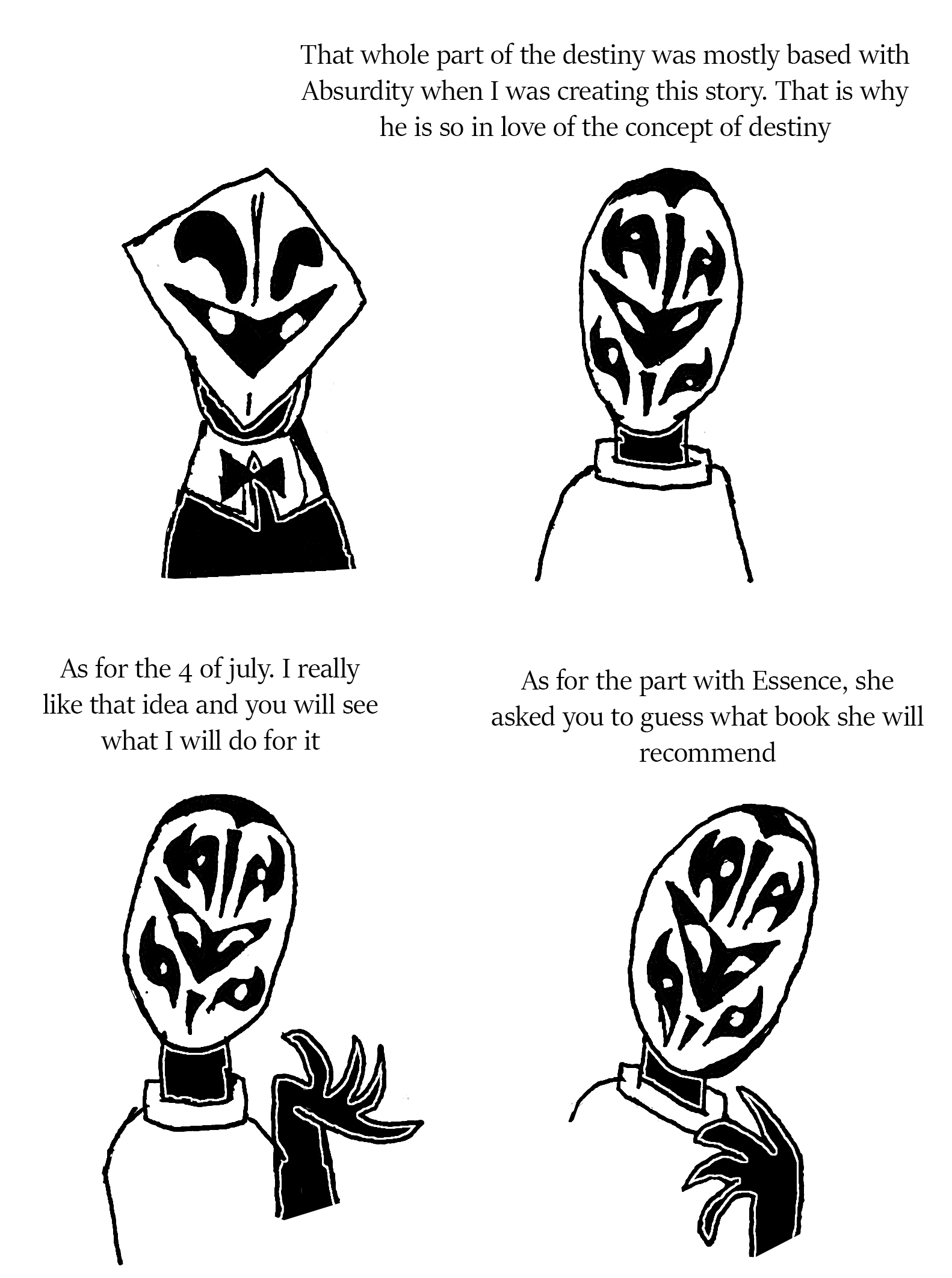 Meanwhile all of this going on Ana is talking with the young offspring of Mother Gaia and Absolution, who is promptly named Absolution Jr, and from this point on goes by AJ. AJ shows her that now with him acting as her right eye, Ana now has access to basic magic abilities. Ana is able to summon fireball and shoot it like a bullet from her finger. However this is the extent of her power so far, and it's all AJ can give her at the moment as WC is actually hindering her and AJ's ability to evolve and grow further at the moment, they will still grow however but at a slower rate. When suddenly, who should appear by Andrew Goodwill again. He reveals that Clara suddenly attacking was against his order and that Root was the one who ordered the death of Absolution due to receiving knowledge of another universe that had a far greater impact with magic and that he needed to die in order stop such a cataclysmic future. As stated this was against Andrew's orders and so he feels Root needs to be punished for his insubordination. He also plays the blame game and tries to convince Ana that her voices are actually a hinderance to her but it doesn't really work, although he does give some convincing arguments. In response Andrew gives Ana a sudden nightmare of her being attacked by a singing Root and immediately tries to blame it on the newest arrival to this meeting.