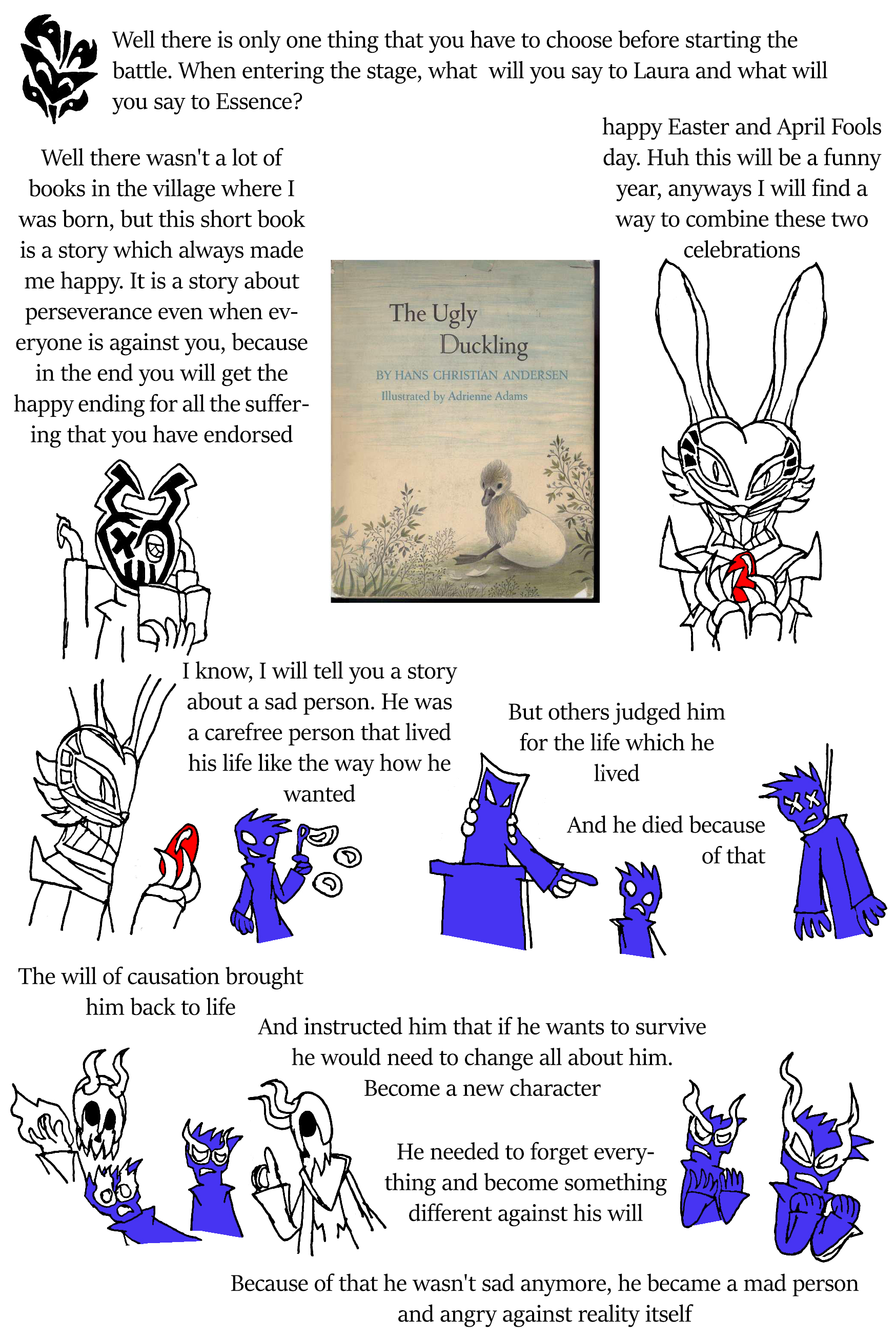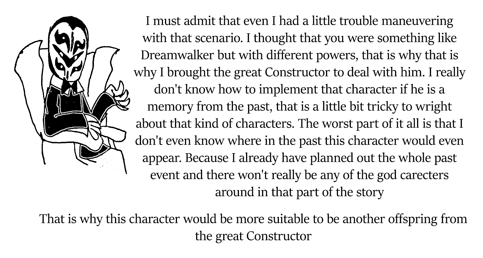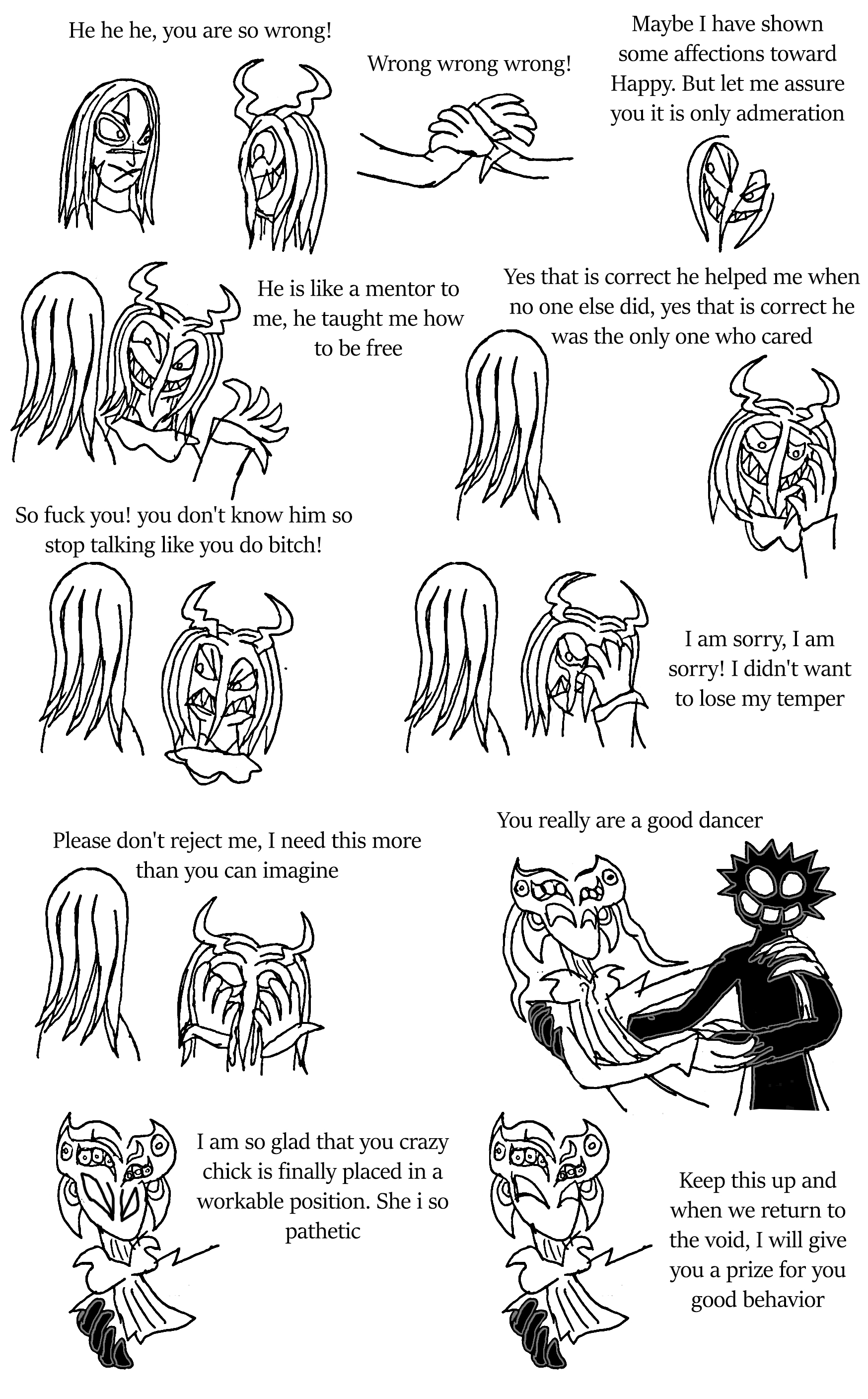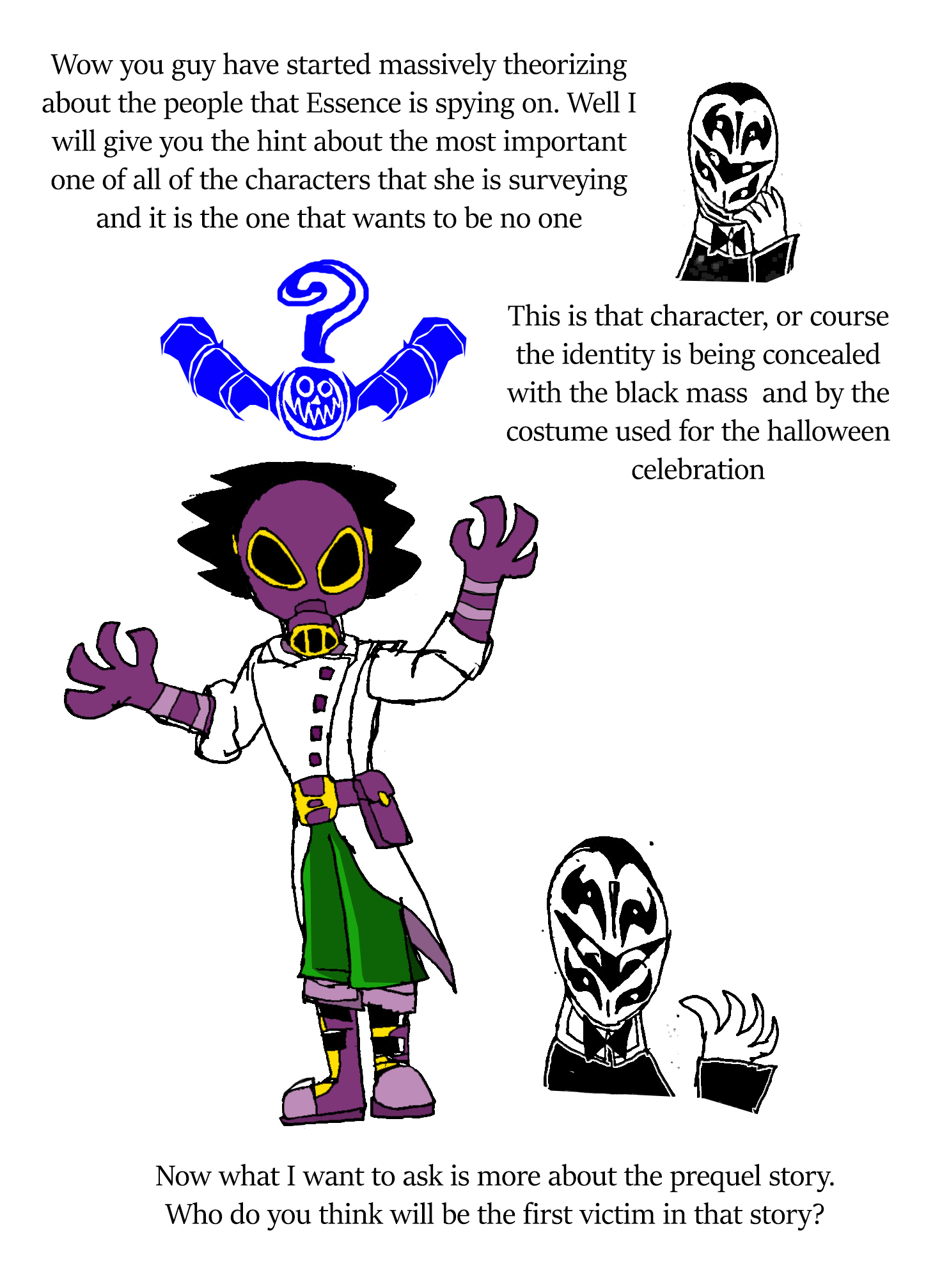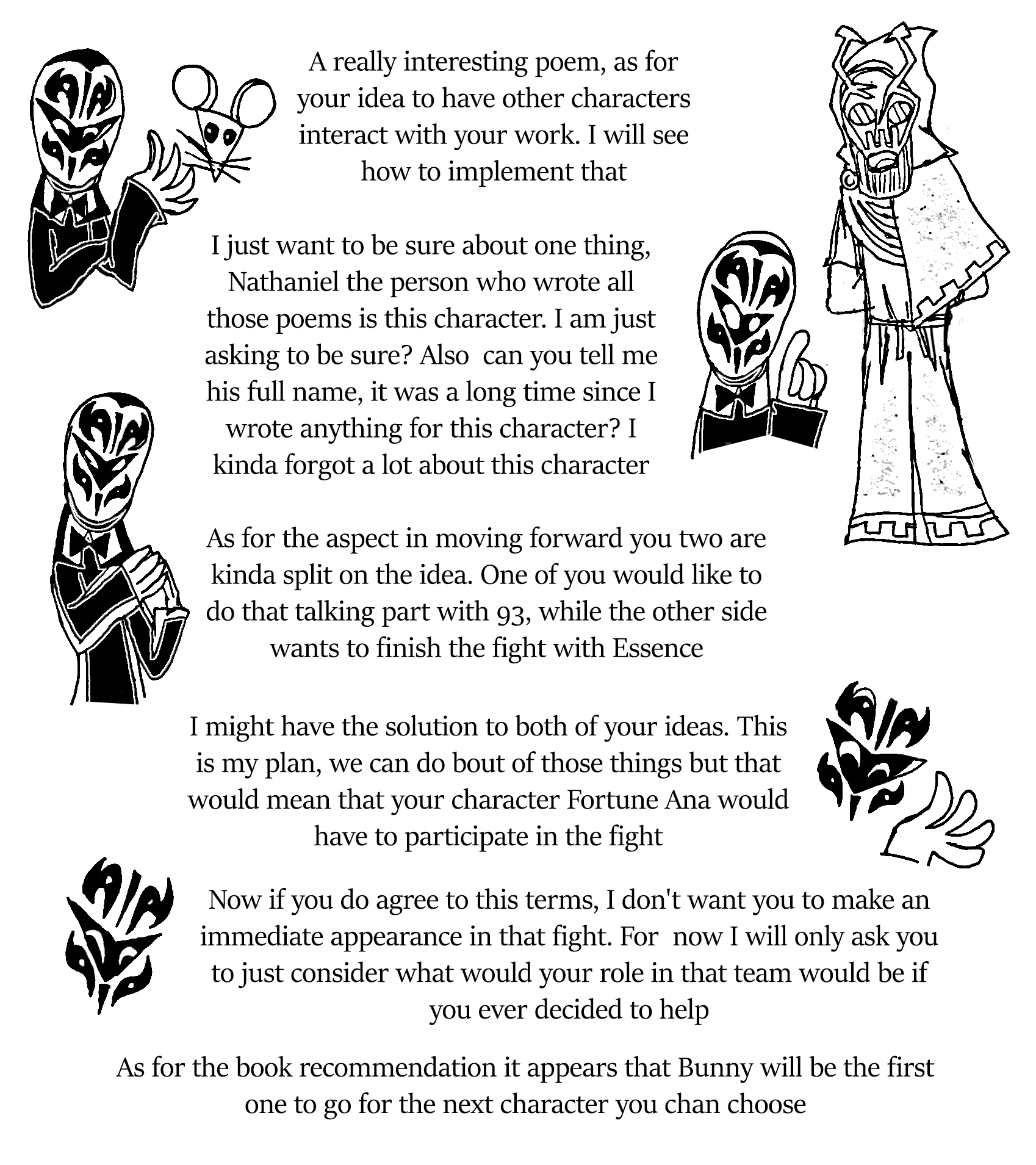Meanwhile all of this going on Ana is talking with the young offspring of Mother Gaia and Absolution, who is promptly named Absolution Jr, and from this point on goes by AJ. AJ shows her that now with him acting as her right eye, Ana now has access to basic magic abilities. Ana is able to summon fireball and shoot it like a bullet from her finger. However this is the extent of her power so far, and it's all AJ can give her at the moment as WC is actually hindering her and AJ's ability to evolve and grow further at the moment, they will still grow however but at a slower rate. When suddenly, who should appear by Andrew Goodwill again. He reveals that Clara suddenly attacking was against his order and that Root was the one who ordered the death of Absolution due to receiving knowledge of another universe that had a far greater impact with magic and that he needed to die in order stop such a cataclysmic future. As stated this was against Andrew's orders and so he feels Root needs to be punished for his insubordination. He also plays the blame game and tries to convince Ana that her voices are actually a hinderance to her but it doesn't really work, although he does give some convincing arguments. In response Andrew gives Ana a sudden nightmare of her being attacked by a singing Root and immediately tries to blame it on the newest arrival to this meeting.