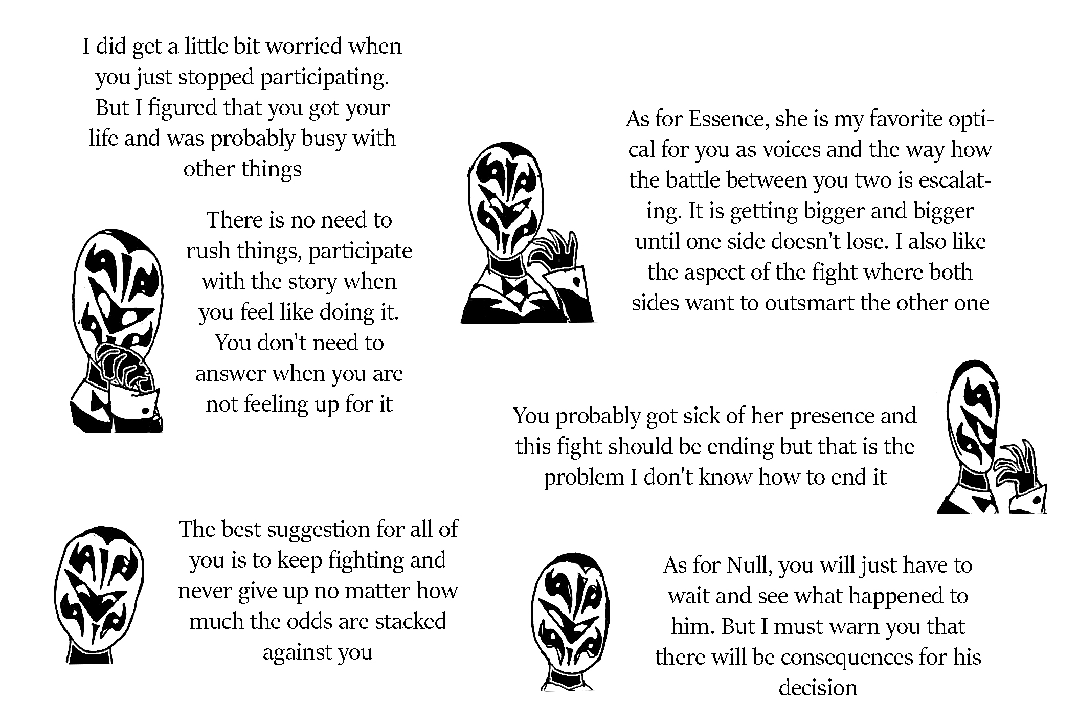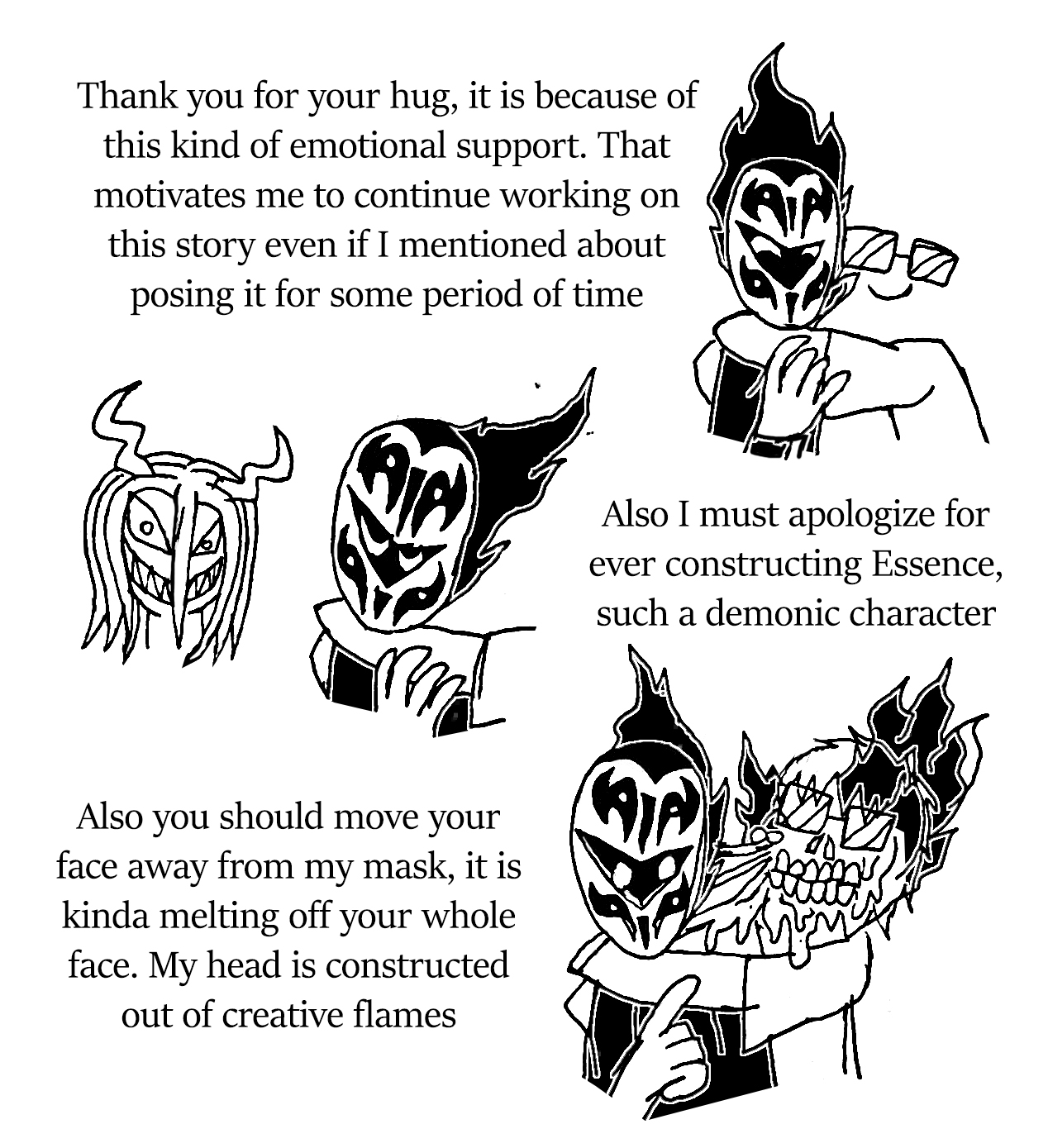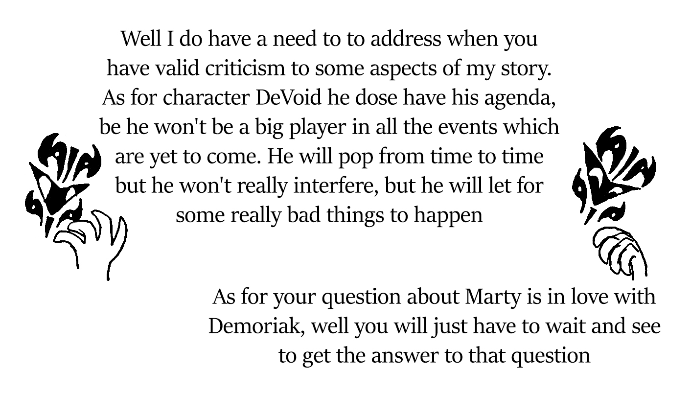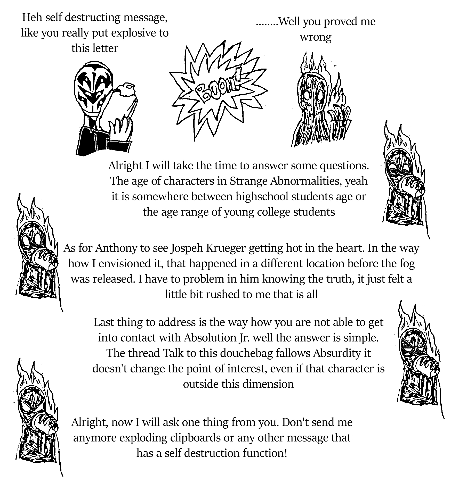 Meanwhile all of this going on Ana is talking with the young offspring of Mother Gaia and Absolution, who is promptly named Absolution Jr, and from this point on goes by AJ. AJ shows her that now with him acting as her right eye, Ana now has access to basic magic abilities. Ana is able to summon fireball and shoot it like a bullet from her finger. However this is the extent of her power so far, and it's all AJ can give her at the moment as WC is actually hindering her and AJ's ability to evolve and grow further at the moment, they will still grow however but at a slower rate. When suddenly, who should appear by Andrew Goodwill again. He reveals that Clara suddenly attacking was against his order and that Root was the one who ordered the death of Absolution due to receiving knowledge of another universe that had a far greater impact with magic and that he needed to die in order stop such a cataclysmic future. As stated this was against Andrew's orders and so he feels Root needs to be punished for his insubordination. He also plays the blame game and tries to convince Ana that her voices are actually a hinderance to her but it doesn't really work, although he does give some convincing arguments. In response Andrew gives Ana a sudden nightmare of her being attacked by a singing Root and immediately tries to blame it on the newest arrival to this meeting.