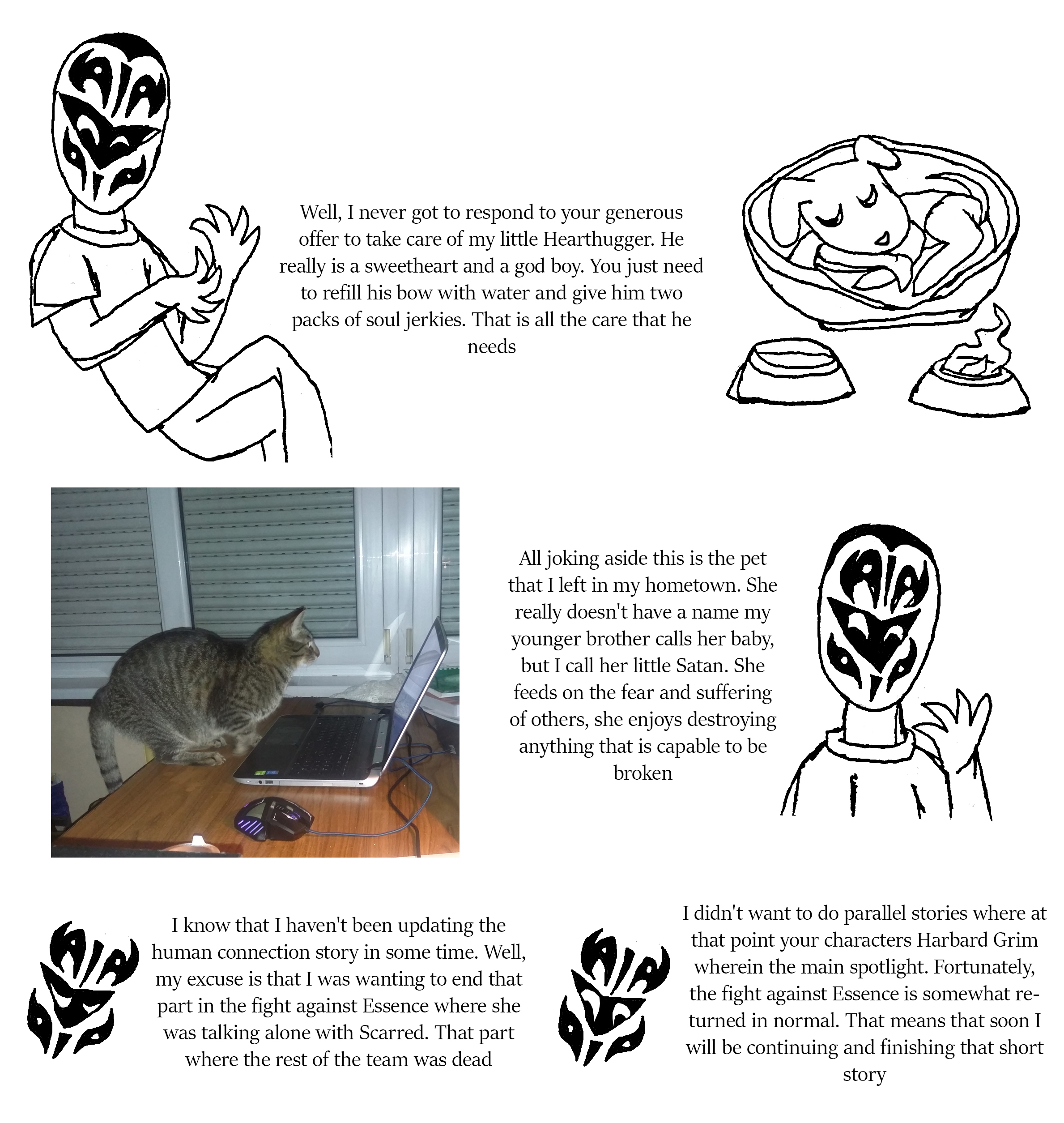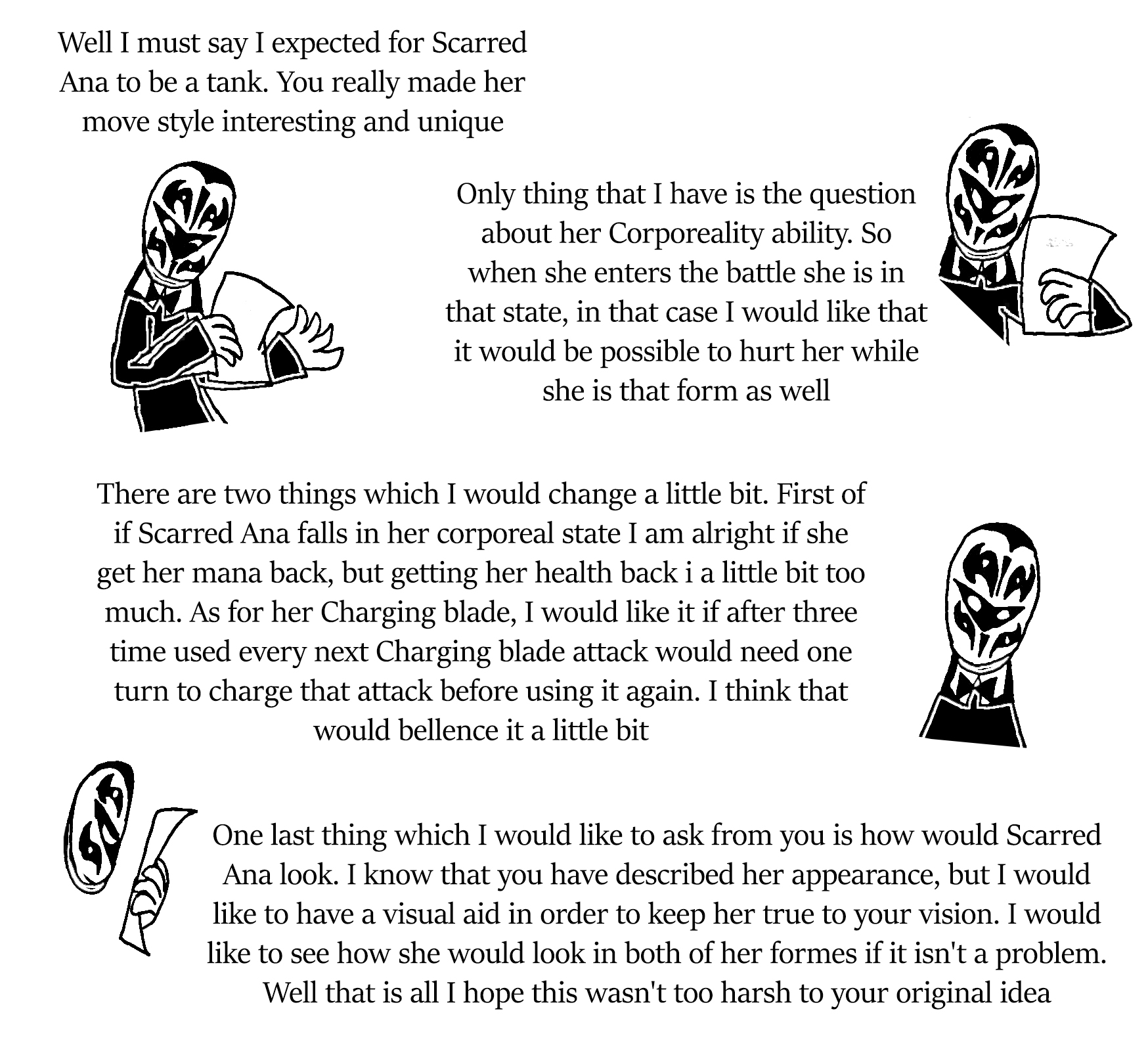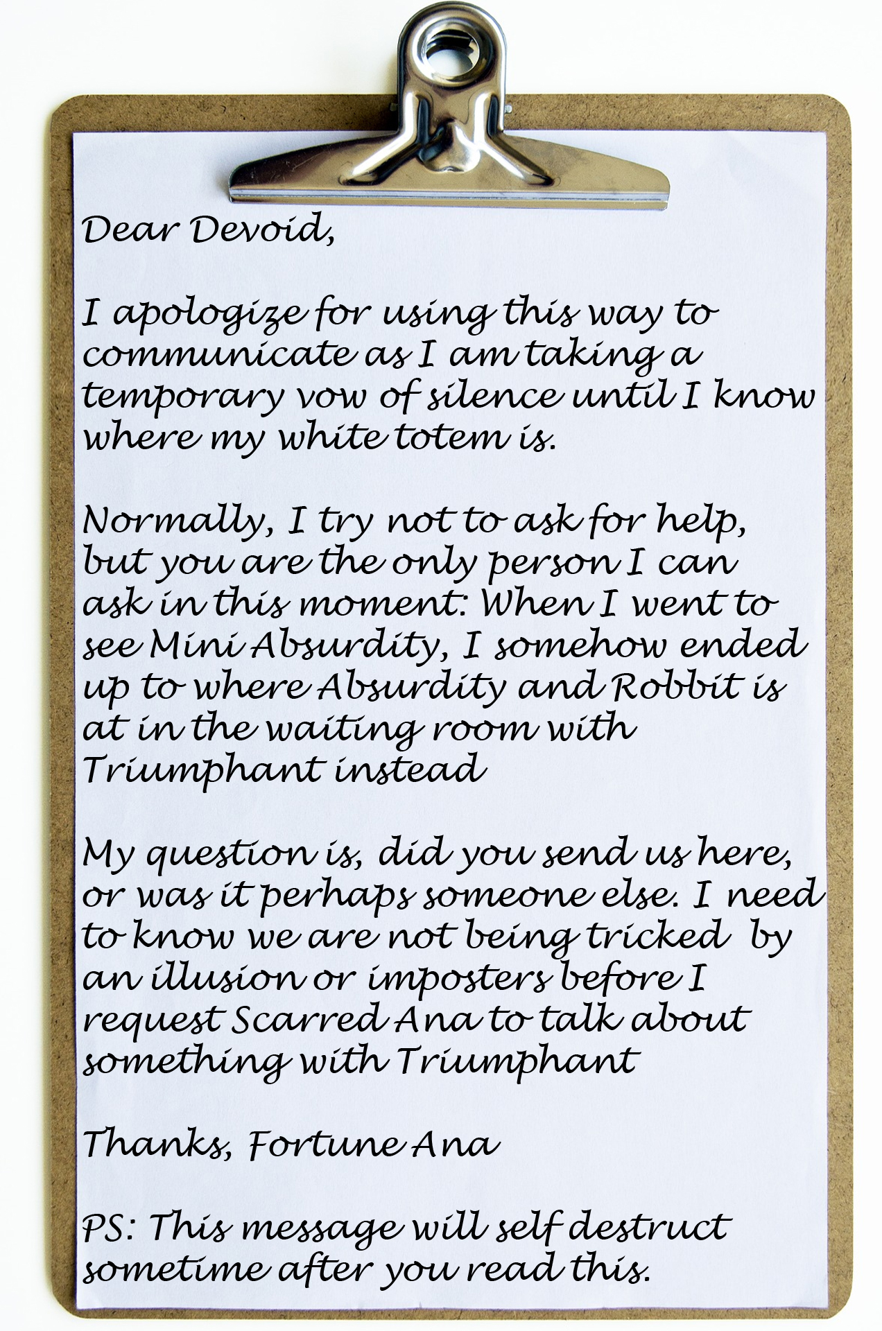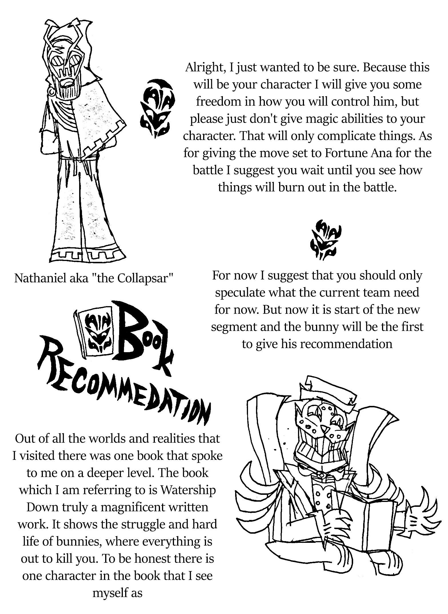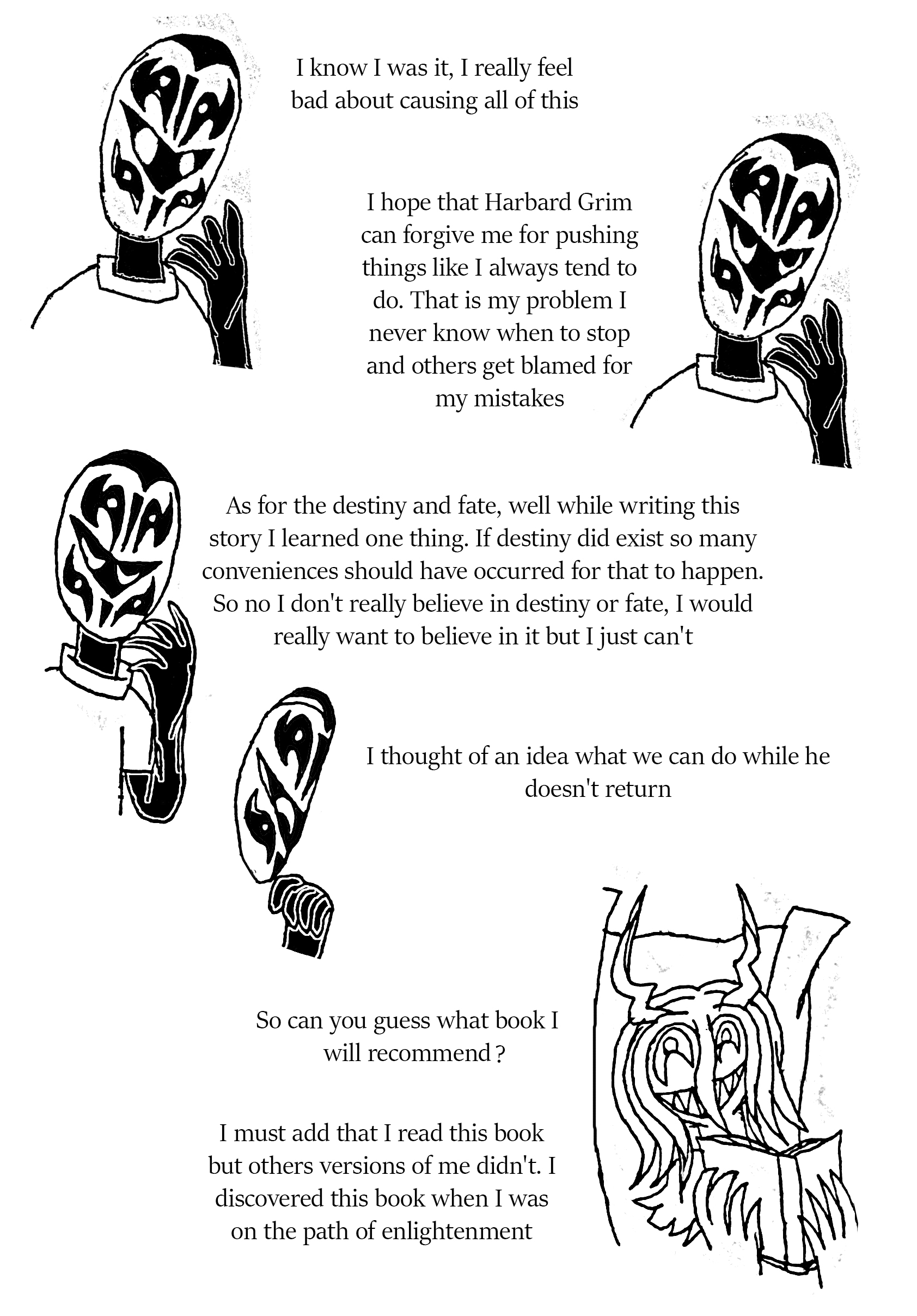 Meanwhile all of this going on Ana is talking with the young offspring of Mother Gaia and Absolution, who is promptly named Absolution Jr, and from this point on goes by AJ. AJ shows her that now with him acting as her right eye, Ana now has access to basic magic abilities. Ana is able to summon fireball and shoot it like a bullet from her finger. However this is the extent of her power so far, and it's all AJ can give her at the moment as WC is actually hindering her and AJ's ability to evolve and grow further at the moment, they will still grow however but at a slower rate. When suddenly, who should appear by Andrew Goodwill again. He reveals that Clara suddenly attacking was against his order and that Root was the one who ordered the death of Absolution due to receiving knowledge of another universe that had a far greater impact with magic and that he needed to die in order stop such a cataclysmic future. As stated this was against Andrew's orders and so he feels Root needs to be punished for his insubordination. He also plays the blame game and tries to convince Ana that her voices are actually a hinderance to her but it doesn't really work, although he does give some convincing arguments. In response Andrew gives Ana a sudden nightmare of her being attacked by a singing Root and immediately tries to blame it on the newest arrival to this meeting.