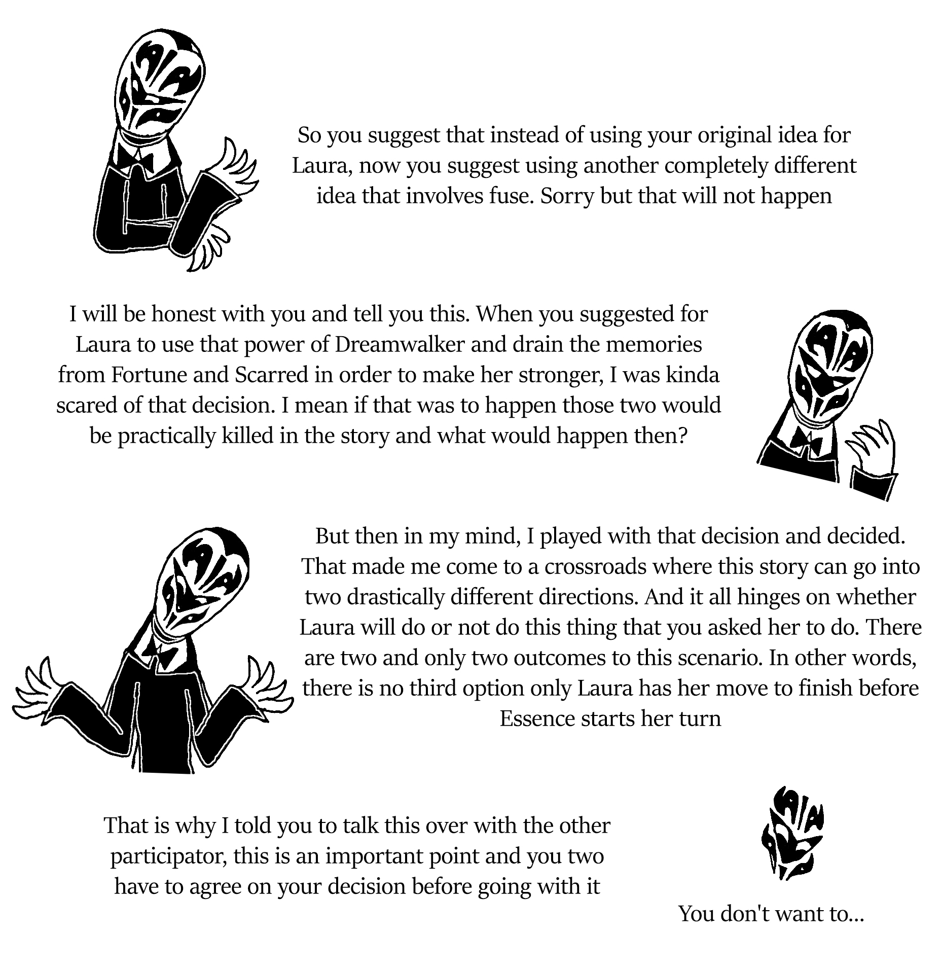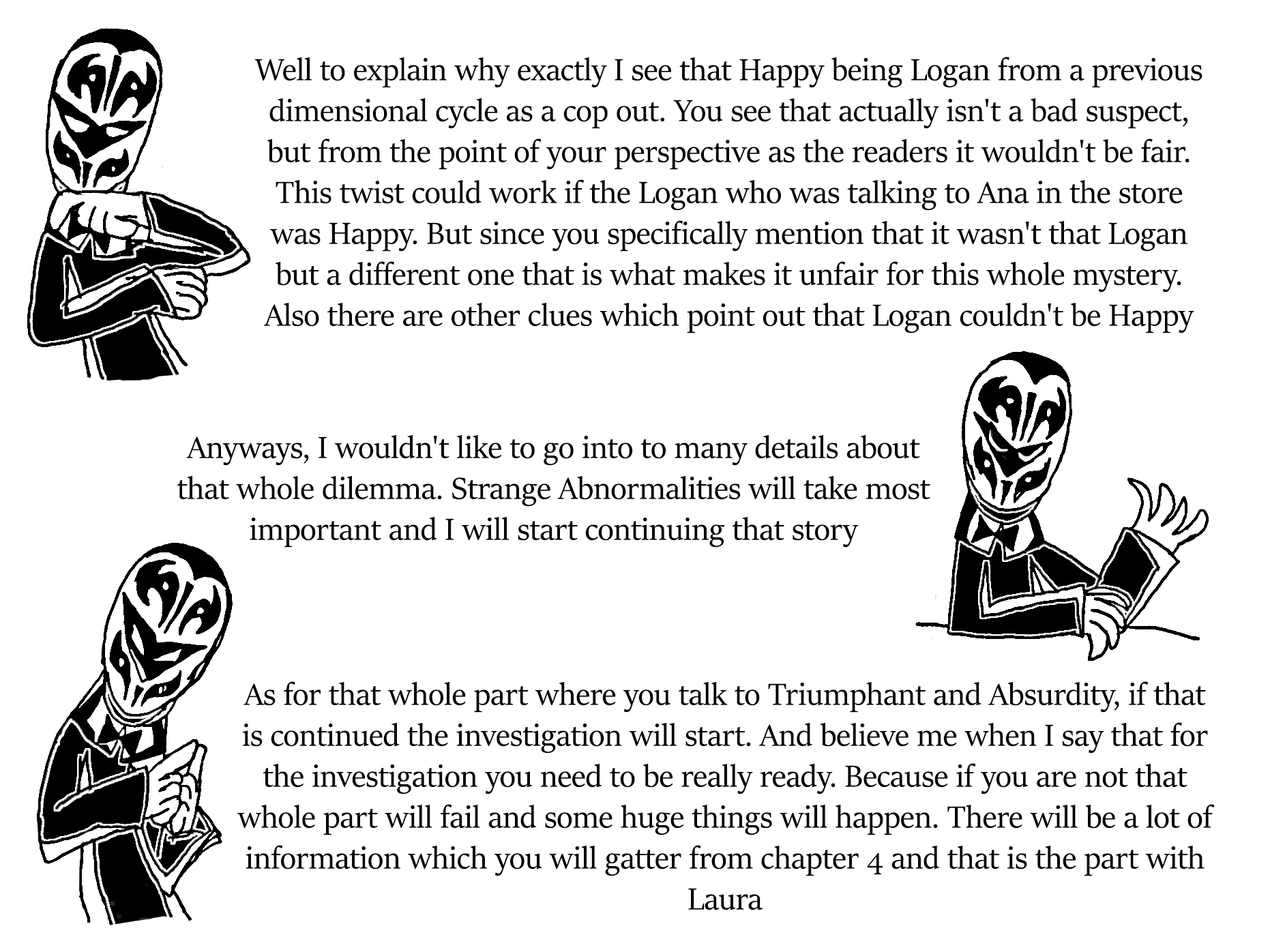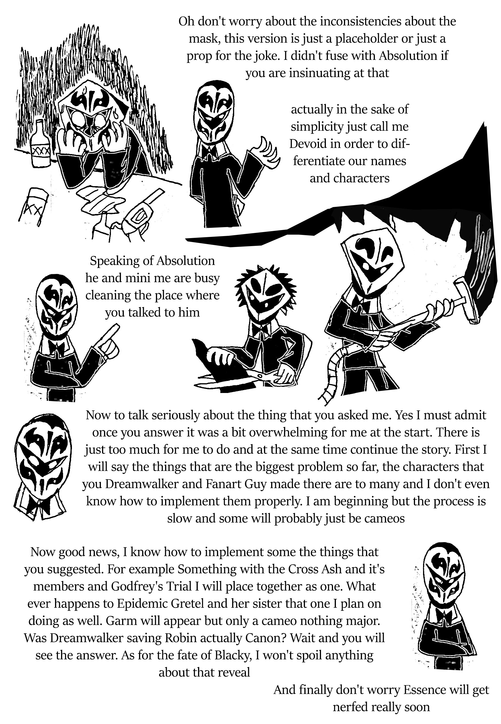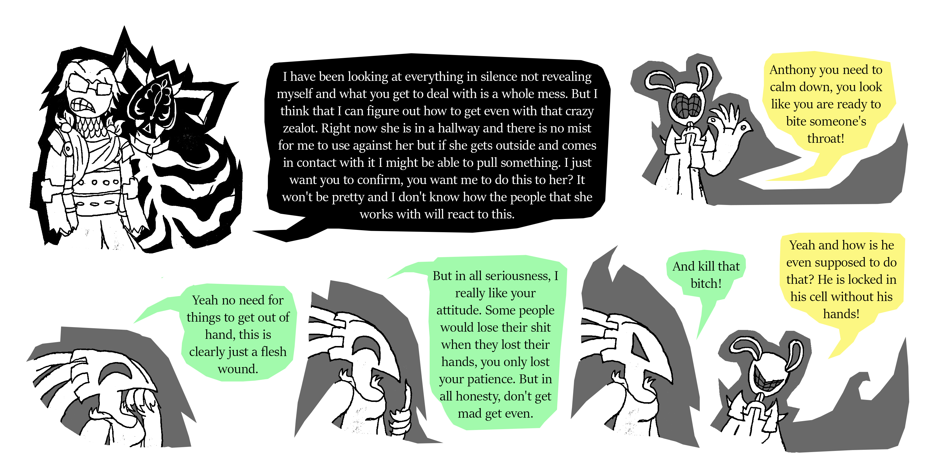 Both Ana and Dreamwalker are horrified, Dreamwalker confesses he looked into the mind of Stitch while they were at it and there was just, nothing cohesive, like voices trying to call out from a black hole and even to a god like him it was horrifying. Ana wants to take a minute to think everything over but isn't given the chance as she looks out and see a woman dressed as plague doctor getting beaten up by three people in masks. Ana goes out to at least check it out and listen in on what's going on. As it turns out the plague doctor isn't one of the Acolytes of Ash but is instead someone who gives out masks to people so they can live in the fog. The people beating her are panicking and scared of what's going on and continue beating her. Scarred convinces Fortune and Ana that they need to help and Ana leaps out gun ready and one of the others also pulls out a gun and there's a stand off moment, Ana does the whole "Look behind you!" trick only for it not to be a trick. As it turns out this plague doctor named Epidemic Gretel also has a bodyguard, and it's none other than Bleeding Jimmy. Jimmy jumps down from roof he was standing on top of and attack with scythe. Ana like a champ calls out for Jimmy to stop.