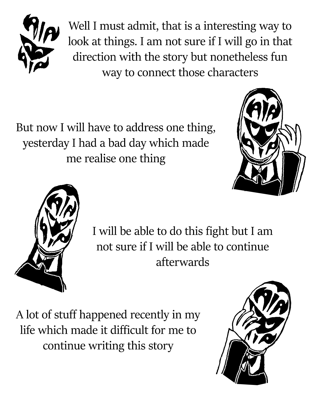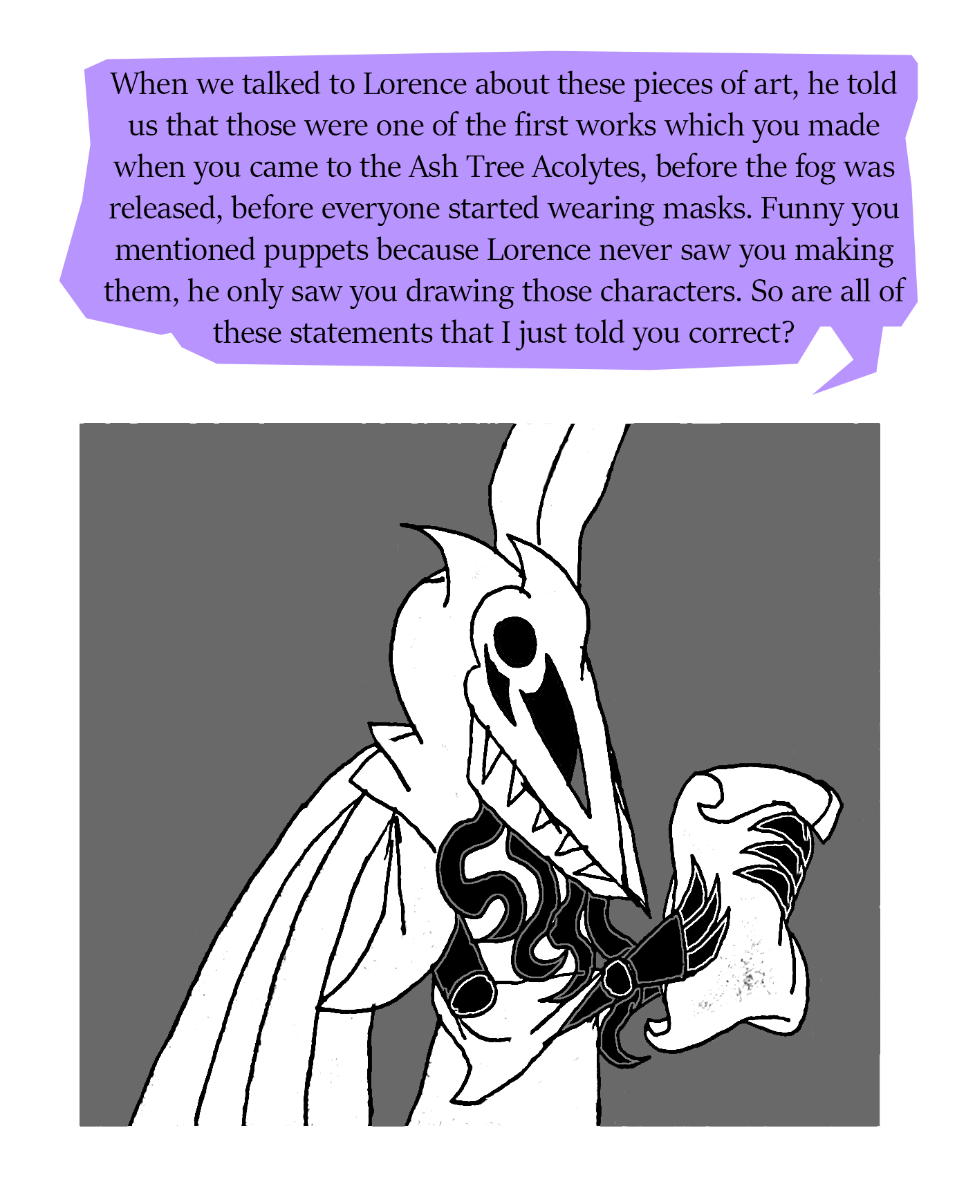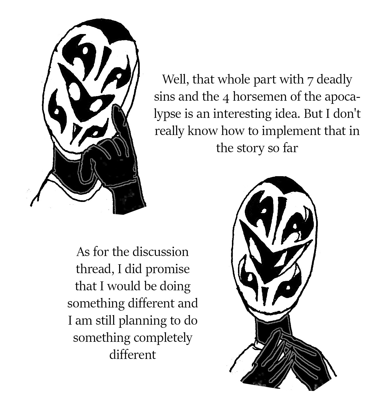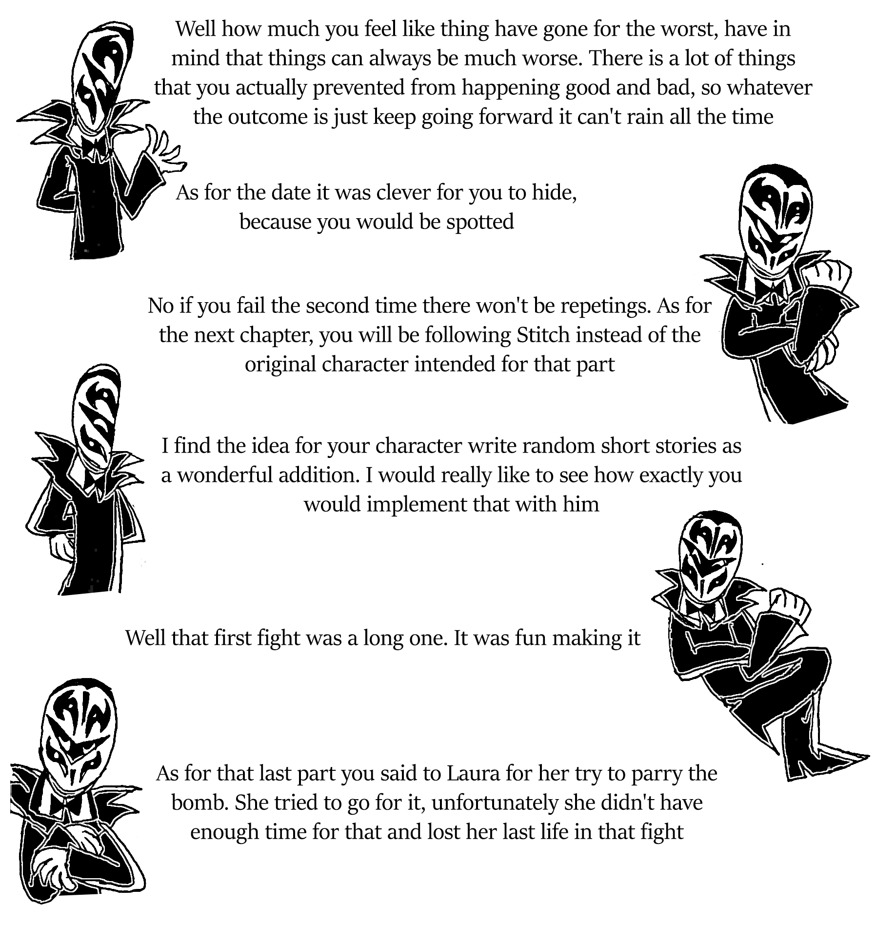Both Ana and Dreamwalker are horrified, Dreamwalker confesses he looked into the mind of Stitch while they were at it and there was just, nothing cohesive, like voices trying to call out from a black hole and even to a god like him it was horrifying. Ana wants to take a minute to think everything over but isn't given the chance as she looks out and see a woman dressed as plague doctor getting beaten up by three people in masks. Ana goes out to at least check it out and listen in on what's going on. As it turns out the plague doctor isn't one of the Acolytes of Ash but is instead someone who gives out masks to people so they can live in the fog. The people beating her are panicking and scared of what's going on and continue beating her. Scarred convinces Fortune and Ana that they need to help and Ana leaps out gun ready and one of the others also pulls out a gun and there's a stand off moment, Ana does the whole "Look behind you!" trick only for it not to be a trick. As it turns out this plague doctor named Epidemic Gretel also has a bodyguard, and it's none other than Bleeding Jimmy. Jimmy jumps down from roof he was standing on top of and attack with scythe. Ana like a champ calls out for Jimmy to stop.