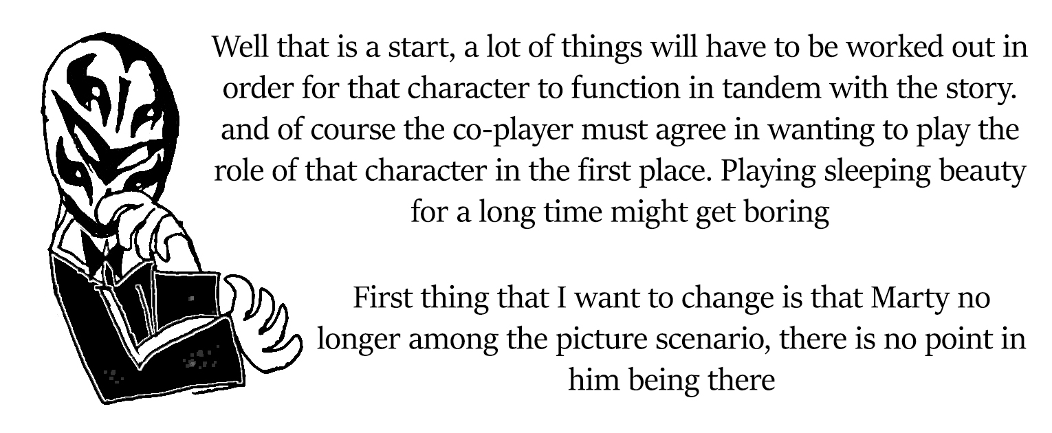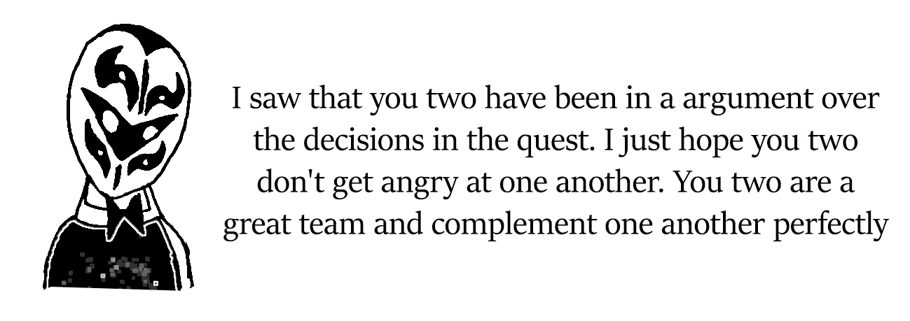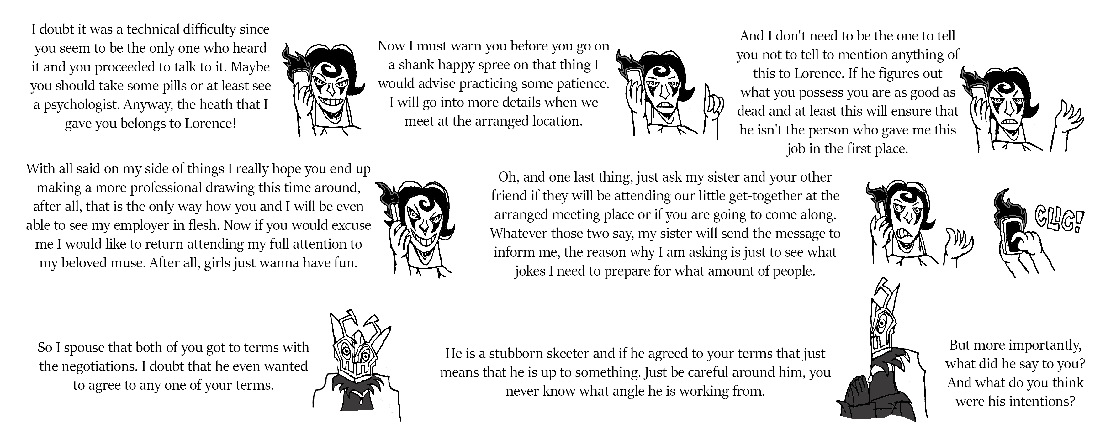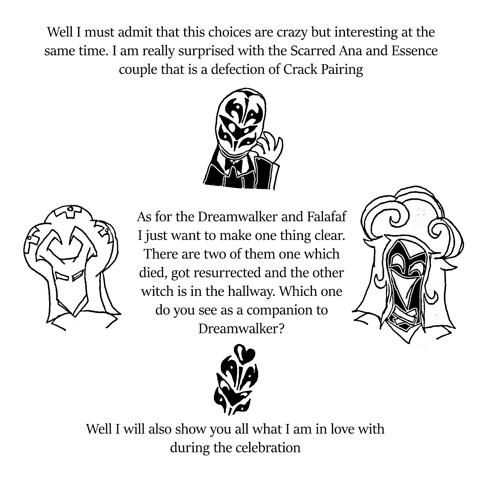 Suddenly, who should break into this pocket dimension by Logan the Magus himself. Ana attempts to be cordial, and Scarred is delighted to see the man who became her husband, but Logan is furious and demands she hand over AJ immediately. Logan reveals he knows that Andrew Goodwill is aware of his presence but he isn't the one he is worried about, and he demands she hand him over as he sees him as a little brother. Suddenly Dreamwalker shows up who was apparently disguised as one of Ana's voices and has been following her since she woke up and he helps defuse some of the tension in the air and points out some areas of information that Logan was missing. Ana however breaks down in tears and says that she knows her actions may very well be what got Absolution killed. She takes of her mask and offers to let Logan take AJ. But seeing her cry seems to have softened Logan up a little bit and he admits that he was too harsh and that the psychic connection has already been made between Ana and AJ. Jack comes back and offers both Logan a letter from Root. Upon opening the letter however it establishes a kind of ghost communication with Root and he invites Logan to his dinner party claiming that both he and Logan as well as Ana are all friends and allies. Both of them just see him as a sick fuck and while Logan agrees to "attend." Jack is also reprimanded by Lorence who shows up on the line and says that by serving Ana Jack fucked up and will need to have a performance review It's revealed this invitation is how Logan showed up at the dinner party in the side quest and how he was able to kidnap Root and kill off certain cult members. Logan says he has to leave soon and see someone who he isn't really wanting to see but it's a complicated situation and he must attend. Before he goes he warns Ana about someone called "The Ambassador" and that he's a dangerous and creepy person but he is definitely someone better to have on your side than against you.