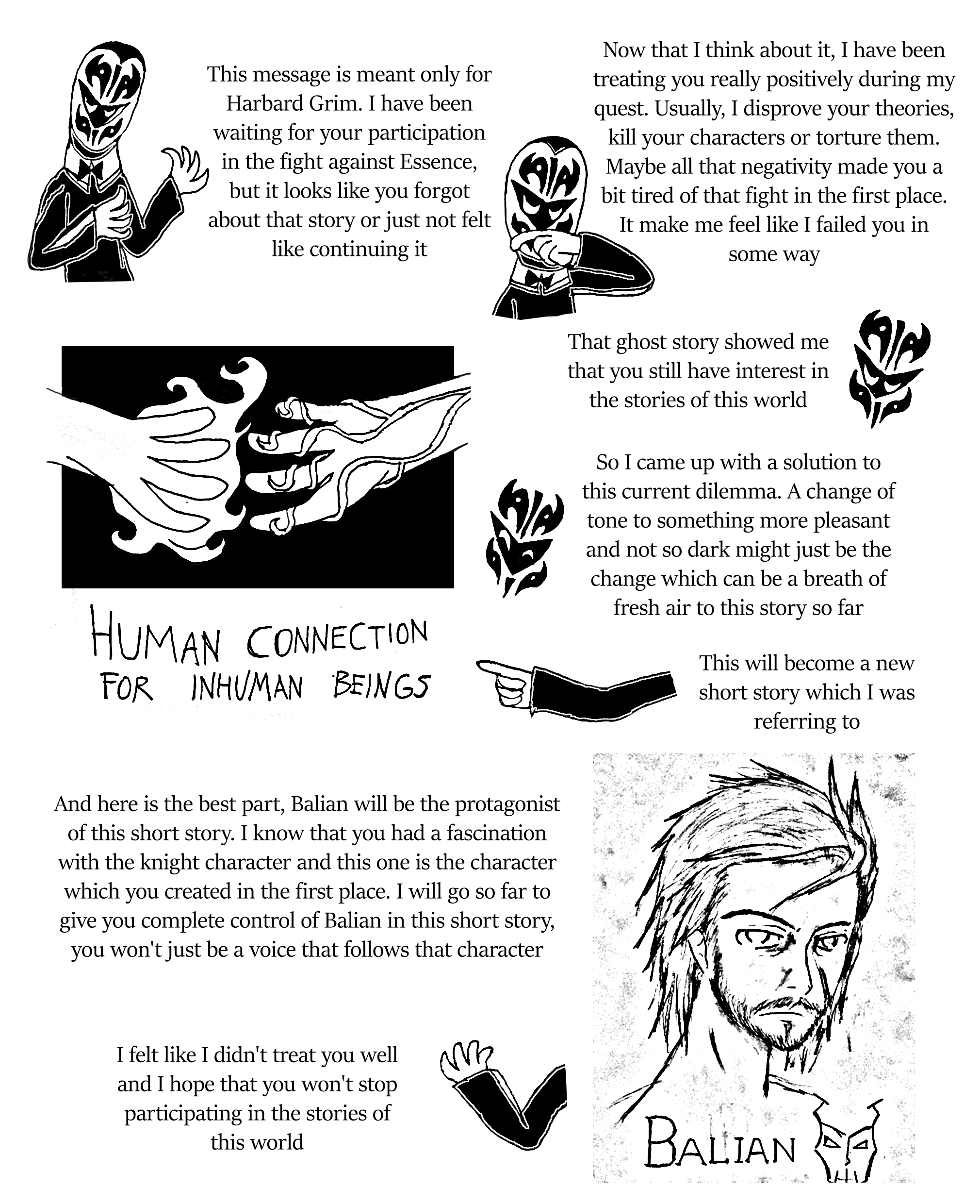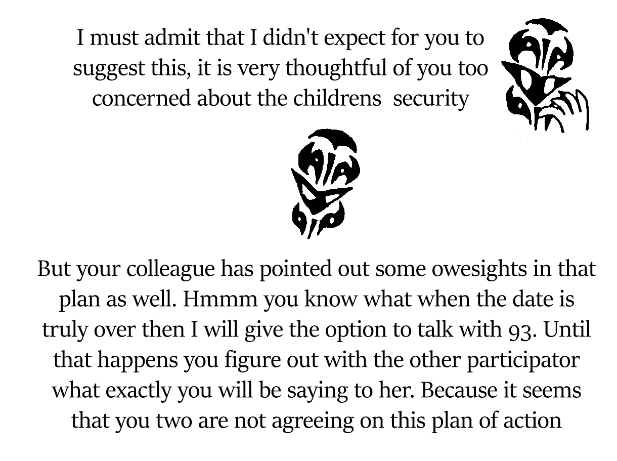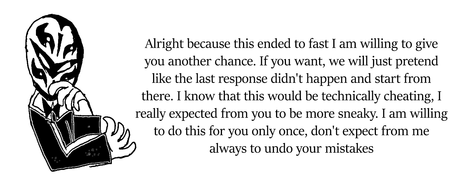 Suddenly, who should break into this pocket dimension by Logan the Magus himself. Ana attempts to be cordial, and Scarred is delighted to see the man who became her husband, but Logan is furious and demands she hand over AJ immediately. Logan reveals he knows that Andrew Goodwill is aware of his presence but he isn't the one he is worried about, and he demands she hand him over as he sees him as a little brother. Suddenly Dreamwalker shows up who was apparently disguised as one of Ana's voices and has been following her since she woke up and he helps defuse some of the tension in the air and points out some areas of information that Logan was missing. Ana however breaks down in tears and says that she knows her actions may very well be what got Absolution killed. She takes of her mask and offers to let Logan take AJ. But seeing her cry seems to have softened Logan up a little bit and he admits that he was too harsh and that the psychic connection has already been made between Ana and AJ. Jack comes back and offers both Logan a letter from Root. Upon opening the letter however it establishes a kind of ghost communication with Root and he invites Logan to his dinner party claiming that both he and Logan as well as Ana are all friends and allies. Both of them just see him as a sick fuck and while Logan agrees to "attend." Jack is also reprimanded by Lorence who shows up on the line and says that by serving Ana Jack fucked up and will need to have a performance review It's revealed this invitation is how Logan showed up at the dinner party in the side quest and how he was able to kidnap Root and kill off certain cult members. Logan says he has to leave soon and see someone who he isn't really wanting to see but it's a complicated situation and he must attend. Before he goes he warns Ana about someone called "The Ambassador" and that he's a dangerous and creepy person but he is definitely someone better to have on your side than against you.