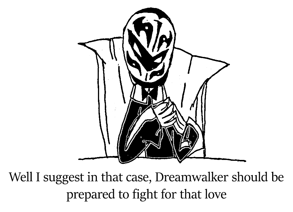 It's here Ana meets the brother of Absolution, the one who has placed a curse on the entire cult of the Ash Tree for the death of his brother. Morpheus the Dreamwalker, God of Imagination, progress and innovation, and dreams and nightmares. Dreamwalker makes it very clear that by siding with the cult, and for the deaths of his brother he has sworn vengeance on Root and by proxy, Andrew Goodwill. However some very odd peace negotiations occur in which Andrew tries and fails again to get more people on his side, but Dreamwalker will not be moved. Dreamwalker pledges to help Ana in anyway he can provided she takes care of AJ, his nephew. Andrew leaves in something of a huff and Dreamwalker helps Ana wake up back on the material plane.