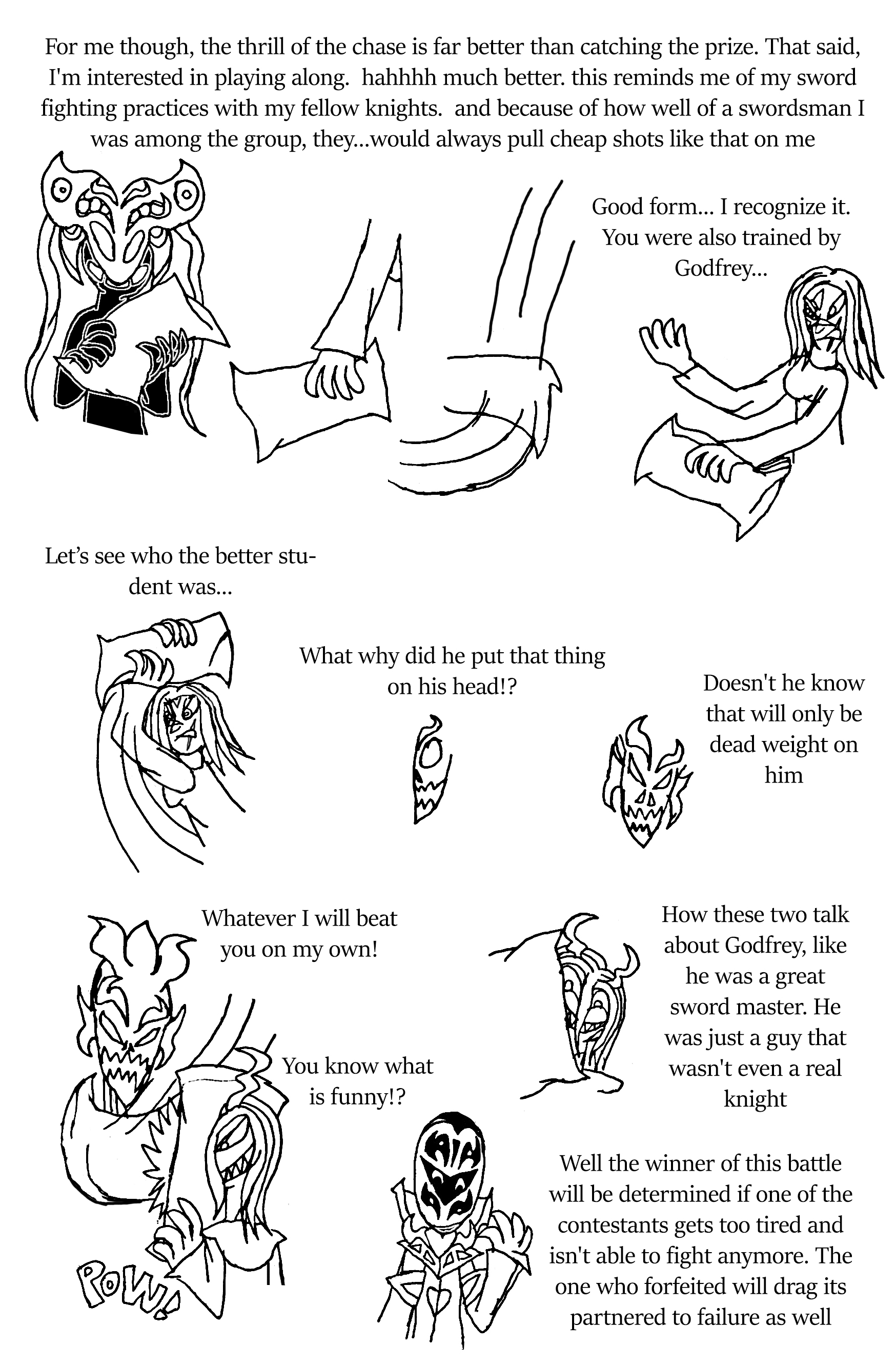 Scarred Ana recognizes everyone except for Rosaline, and is especially excited to see Godfrey as she learned how to fight from him. Ana says that she will surrender to Godfrey but not to the others, or she will have an honorable duel with Flint with her freedom if she lives. This causes a disturbance among the group as Godfrey doesn't know Ana and Flint wants the glory to himself and doesn't want to take the deal. It also reveals that Godfrey's mission and goals within the Acolyte of Ash are already under scrutiny from Lorence and others like him in the cult. Ana convinces the others that Flint is acting like a spoiled child and that this only proves Godfrey's in league with Ana. Godfrey responds by drawing his sword on Flint and telling him to essentially cut the shit. Flint, coward that he is agrees to let Godfrey take Ana. But then surprise entrance by The Ambassador who was listening in the whole time! He says he likes the idea of the duel better, and it quickly becomes a fighting tournament to see who will win. But since Flint's side has both himself, Raphael, Rosaline, Fire of Hate,and Godfrey and Ana's side has only herself and Boxhead, Godfrey joins Ana as he doesn't want to see innocents hurt.