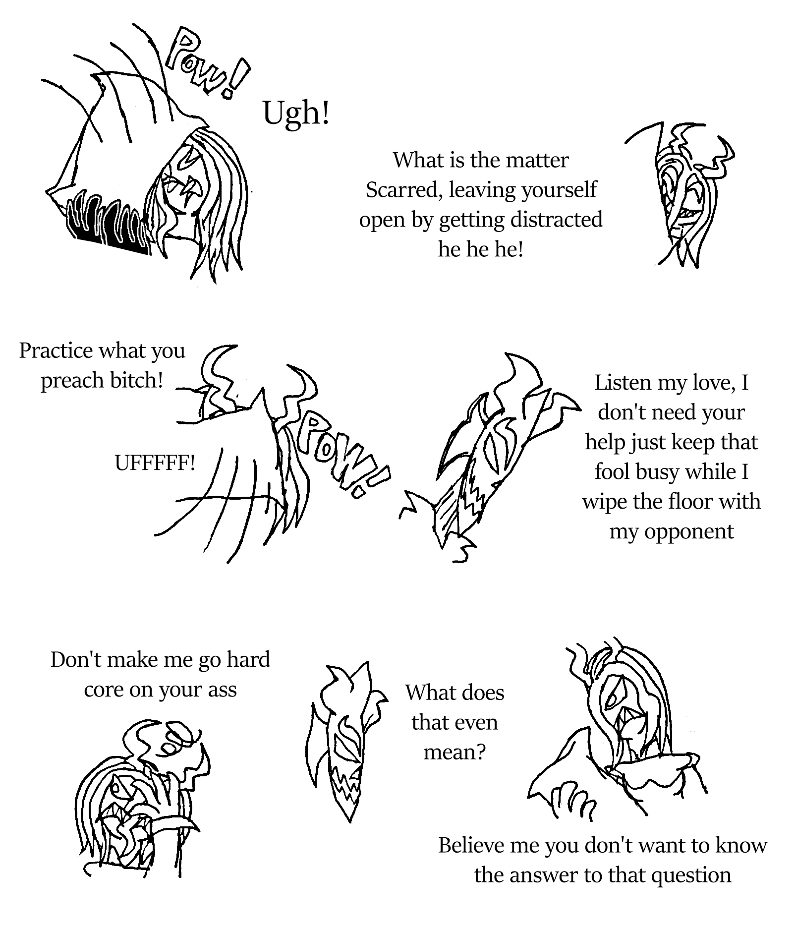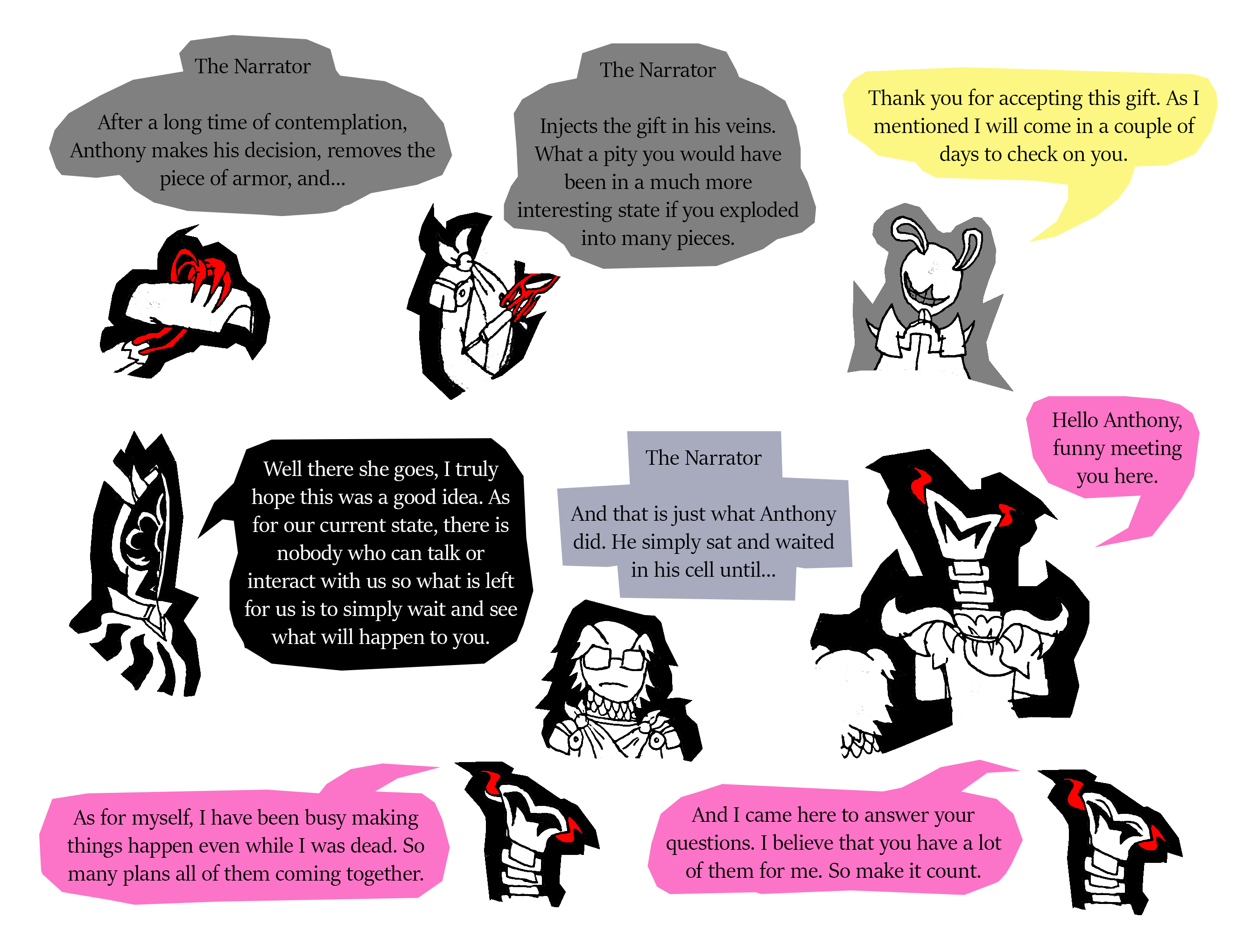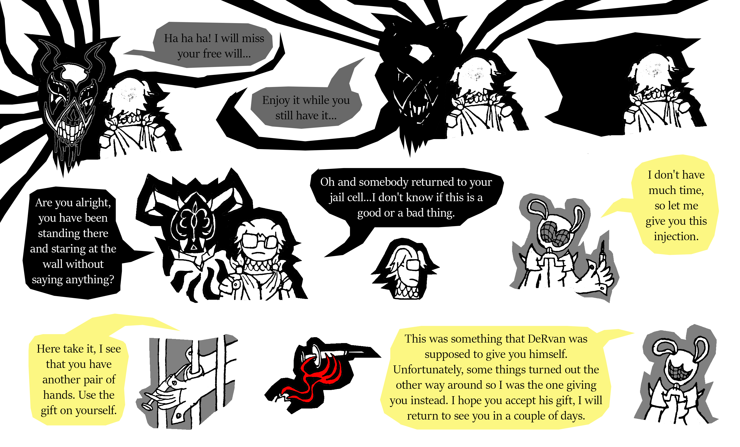 Scarred and Fortune ask for a damage report when suddenly a strange and very angry voice appears and tells Ana to get up and tells her to use it's magic to transform herself. Scarred and Fortune are horrified and see what it is doing this. It's the being known as "The Rage Within" which is later revealed to be a different side Absolution. If Absolution was law and justice and magic this thing is Anarchy and survival of the fittest, and pure primal rage. It is a being of pure rage and malice seeking blood. In the old days it was worshipped by berserkers who called it "The Blood God." Even Dreamwalker can't look at it and is horrified by it's presence. It was reborn with AJ and it's here it also escapes as Ana refuses to listen to it or either doesn't hear it. She pulls the needles out of her back which as it turns out healed as soon as she did it and healed up her wounds too. Amazingly they are needles of life. Jimmy has attached a note thanks for not joining us, and that while she's not a bad person she can't have them with them anyway as Jimmy wants to protect Gretel. We later find out in a separate sequence that Jimmy isn't really a man at all but in fact a young woman and Gretel's younger sister. The whole "Bleeding Jimmy" thing was all an act and she is actually very afraid for both her sister and Blacky. Funny enough in Scarred Ana's timeline Jimmy went by a different name, Alora "Jackie" Miller and both her and Gretel as well as Blacky who later gets new metal arms and calls himself "Weyland" become generals and part of her inner circle.