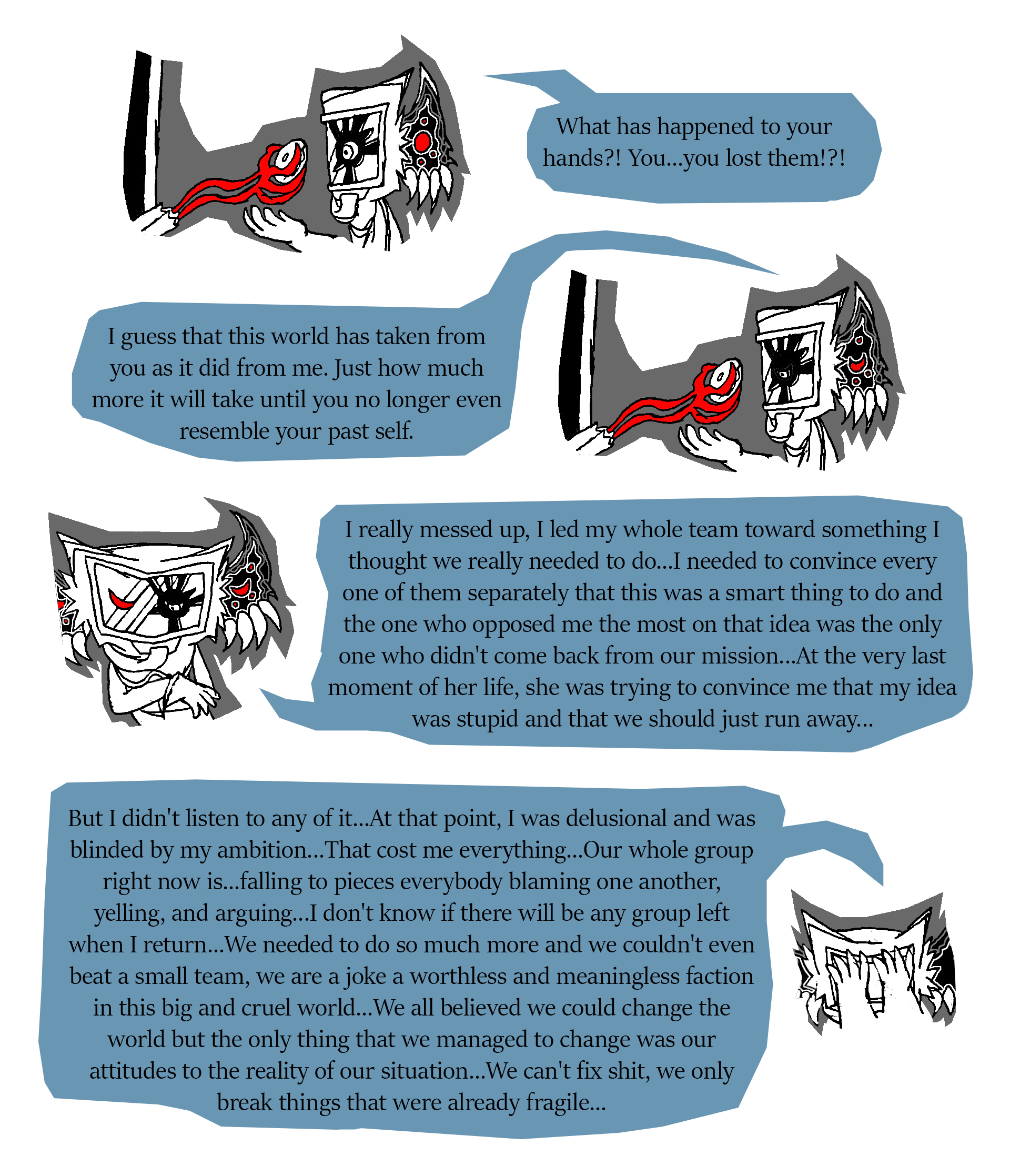 They talk for a bit and Boxhead says that he has a sawed off shotgun in case he gets into trouble but otherwise prefers to avoid it whenever possible. Living on the streets and being an old army vet he learned how to survive and Ana asks if he want to come with her as both Scarred and Fortune recognize his tone as someone who is planning on using that shotgun on themselves. It takes some convincing but he does decide to join them, mostly because Ana did it via threats. This becomes something of a bad trend for Ana as she often makes the mistake of taking what Scarred and Fortune say she should do and then going either too hard on it or not enough. Boxhead does admit he is at least somewhat glad to have Ana with him as he was actually planning on doing something like suicide. Together the two of them make for an abandoned hotel that Boxhead sometimes sleeps in.