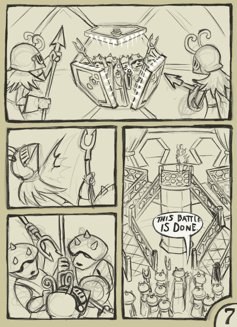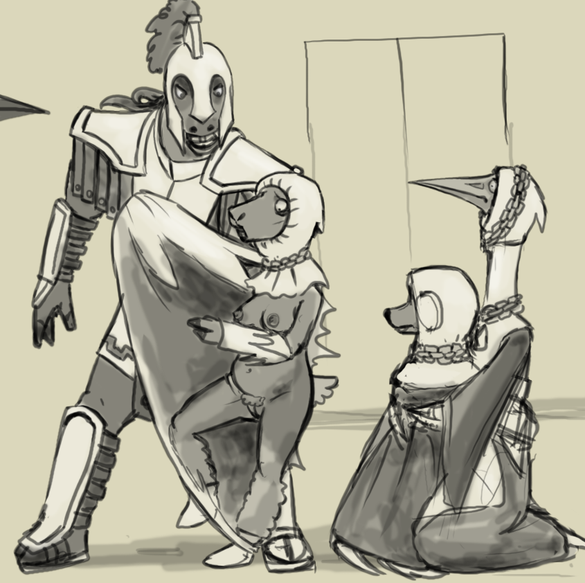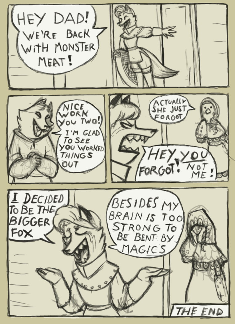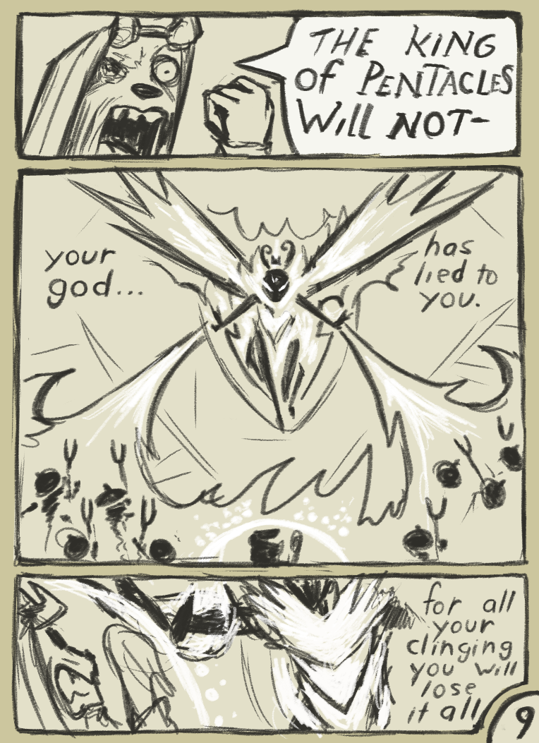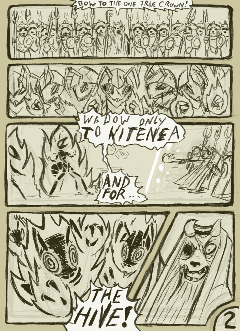 King of Pentacles I think has a better chance. It leans closest to being a simple quest by the above categories but pushes a bit beyond that by the quantity of the characters to control and the "stats" and abilities being hidden. If it were to be theoretically redone I would start with a simpler and faster intro encounter to give a chance for the mechanics to be explored/explained more quickly (for example, instead of facing the heroes right away maybe we start with a scene of only one or two of the tax collectors guarding their stuff in a town at night while the others are sleeping, and facing off against one or two bandits; or perhaps one or two tax collectors scouting ahead of the group along the road and fighting just one of the heroes). You could also have put in some sort of "tutorial narrator" who could comment on the fight while it was happening, like maybe the queen herself watching by magic, or some nearby wanderer, or perhaps a veteran but invalid tax collector character who can only sit and shout orders at the others, or something like that. I would also (and this could still be done) just put up a straight gamey "UI" or a stat screen shown at the start of each round, where we can see the characters' health and morale as bars as well as their condition and maybe a little list of their special qualities and their "level" to show how powerful they are.