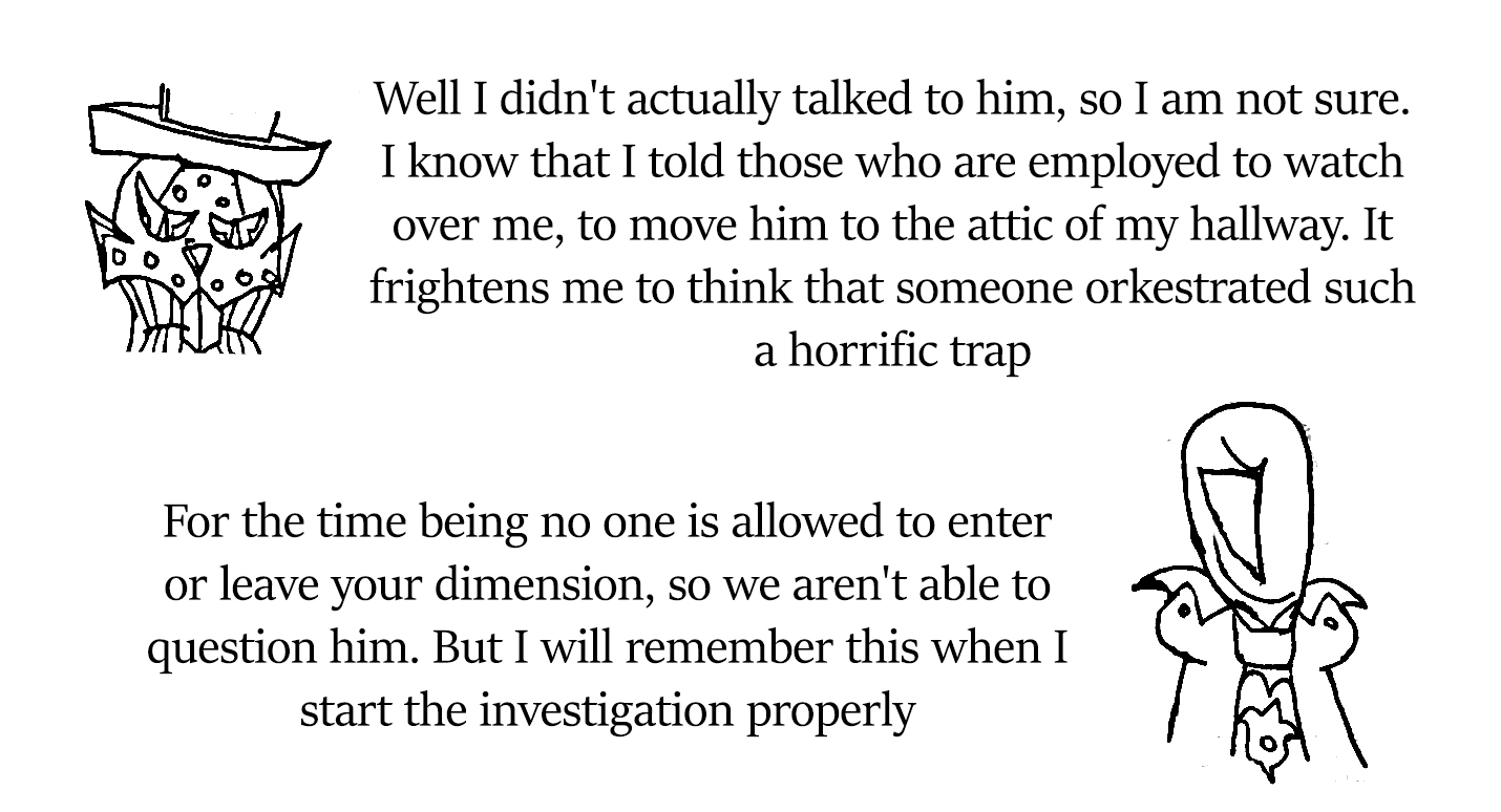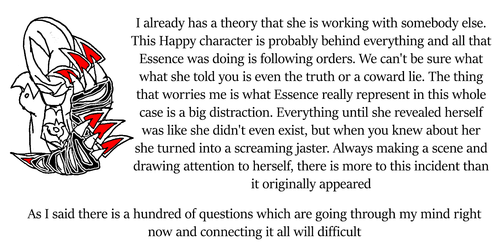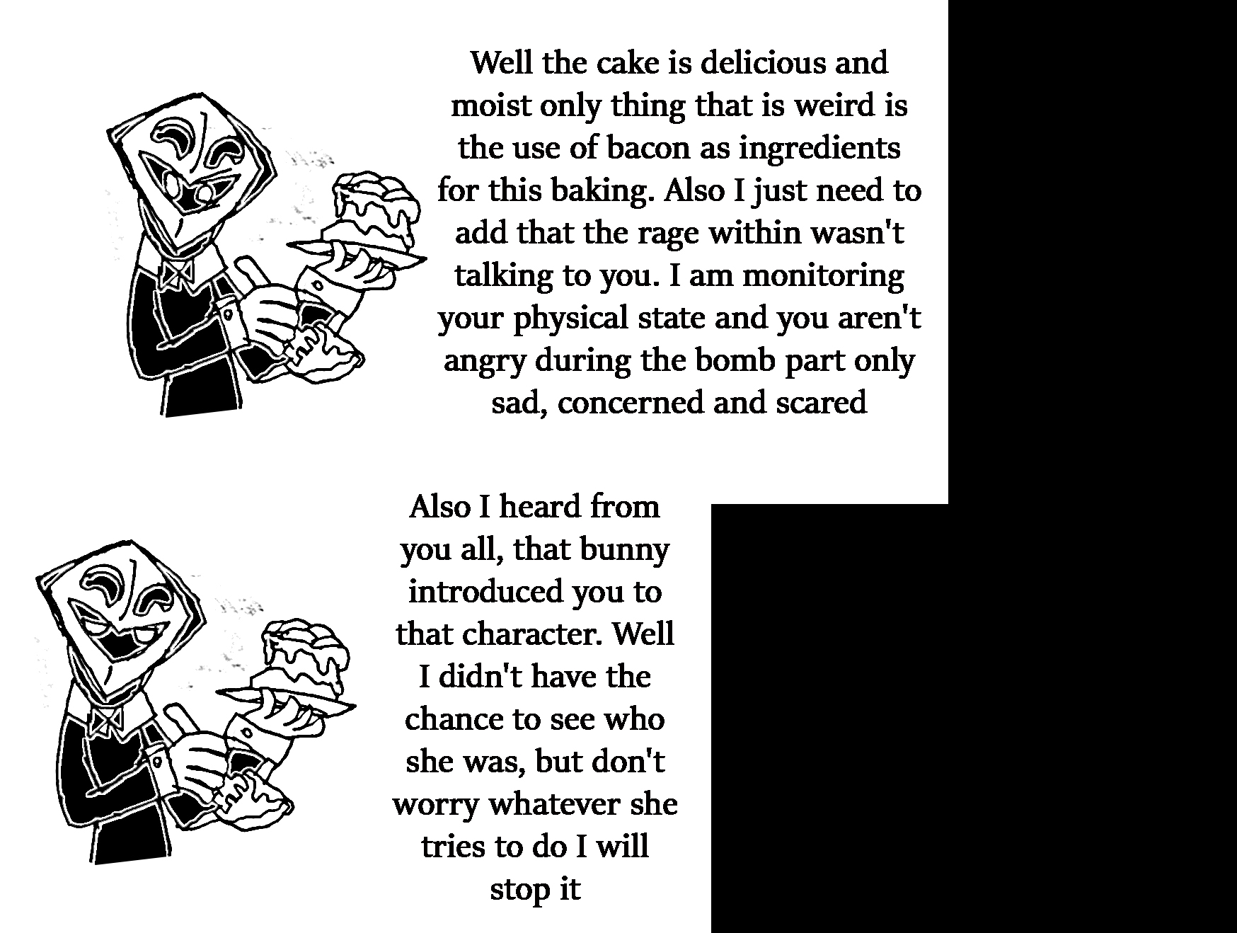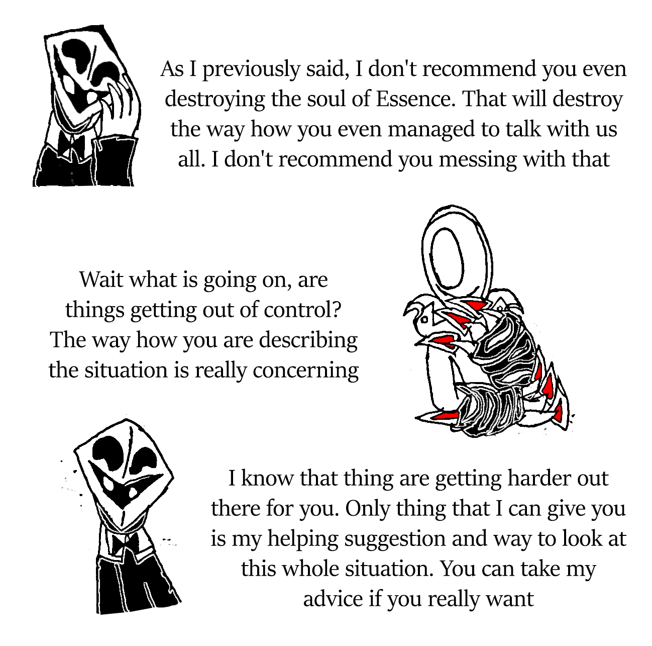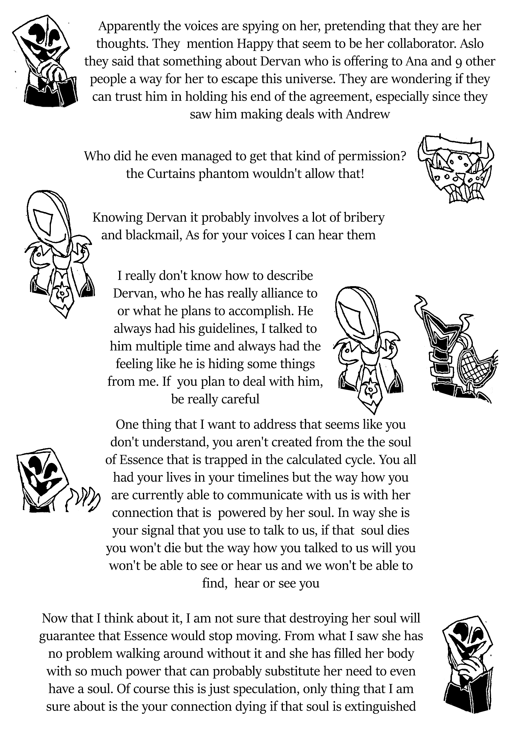 Sixth: you might not like what I might say, but I think Falafaf is on her way to death soon. remember the paper with the horns and Essence crossed off one of them after future Falafaf died? I do not think that means only future Falafaf is dead, I think that applies to present Falafaf as well, and she is marked for death. That said, to keep yourself from getting clouded by deep emotions, I don't want you to get too attached to her anymore. I'm not saying don't talk to her, just be prepared for that outcome.