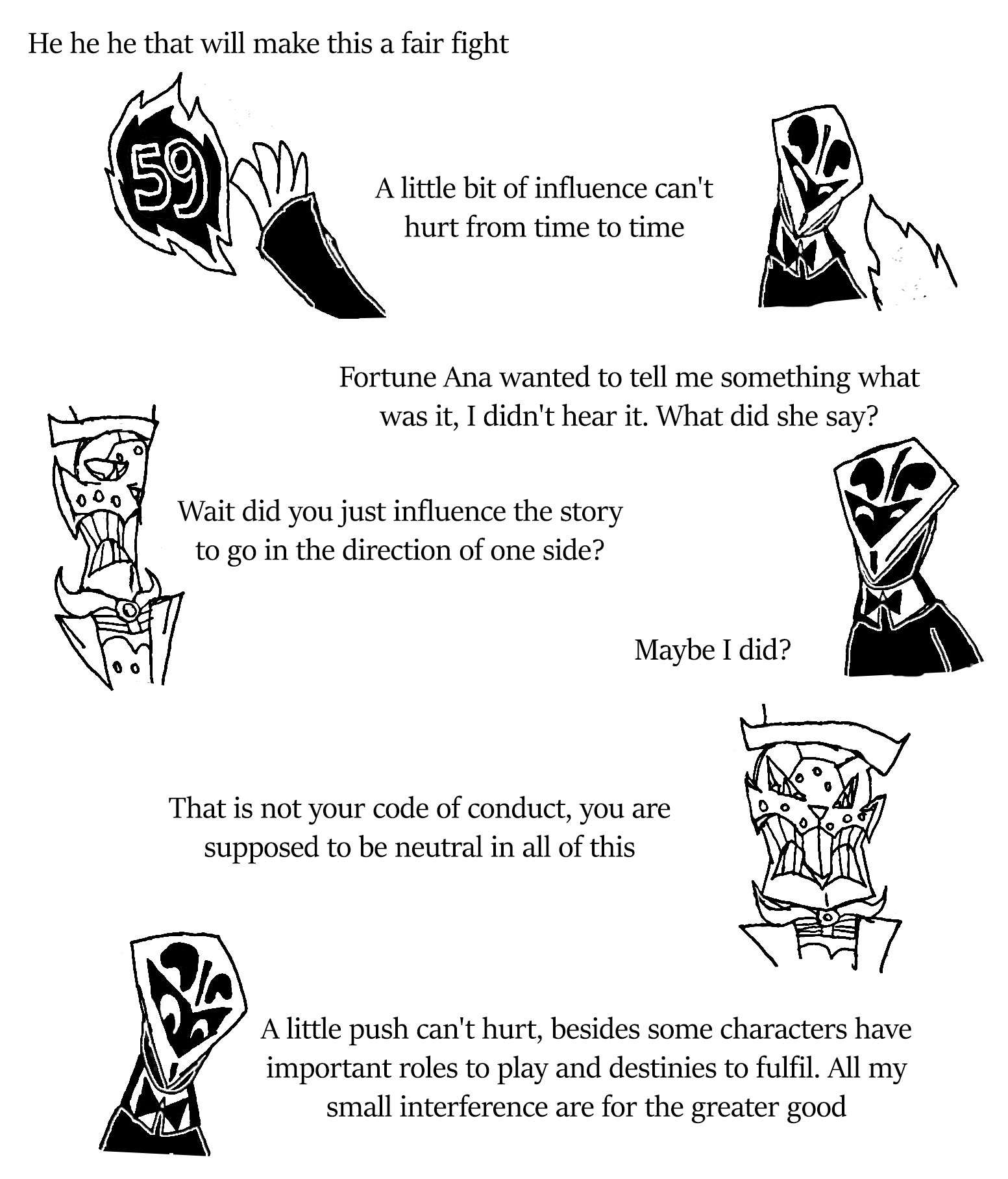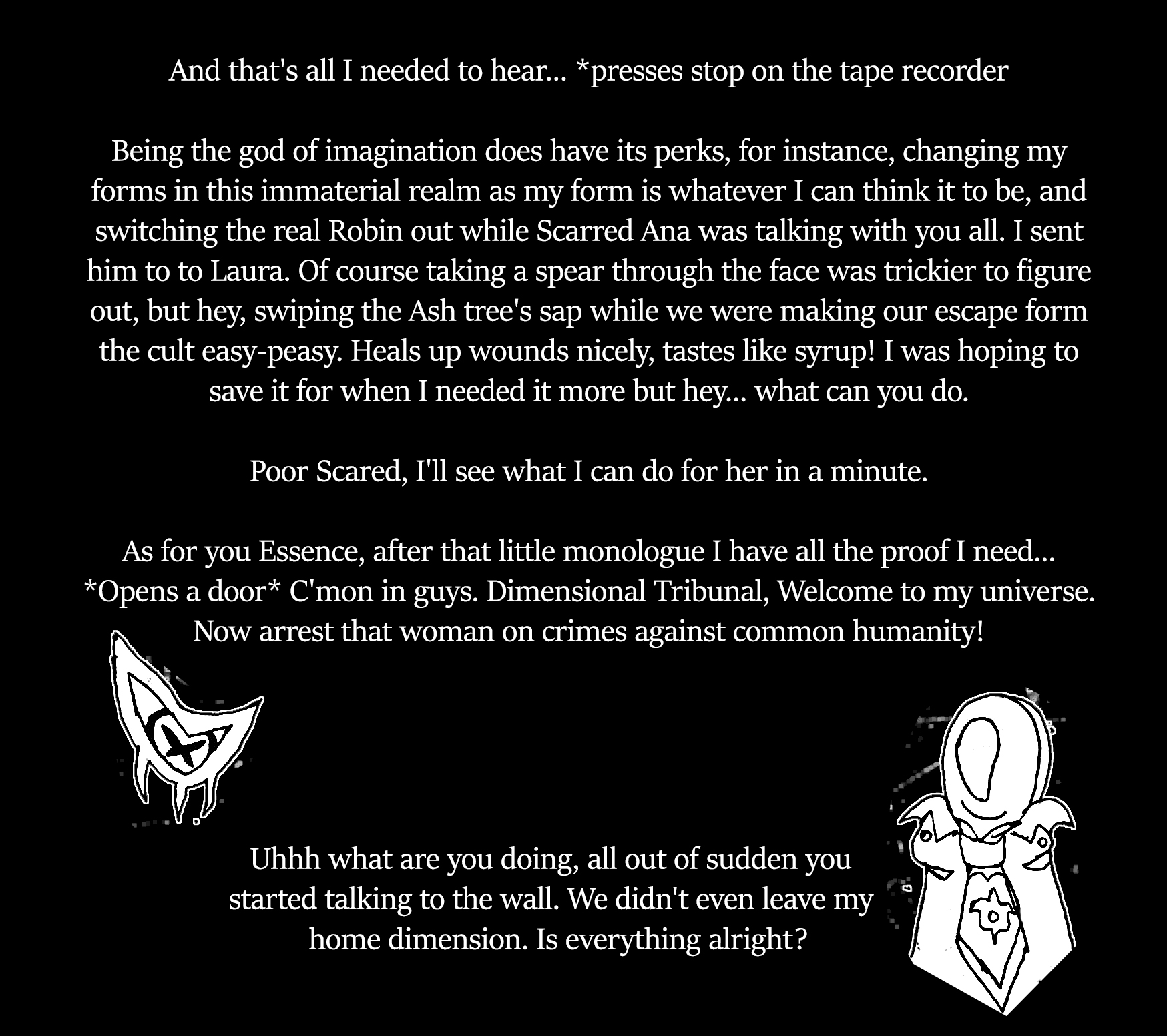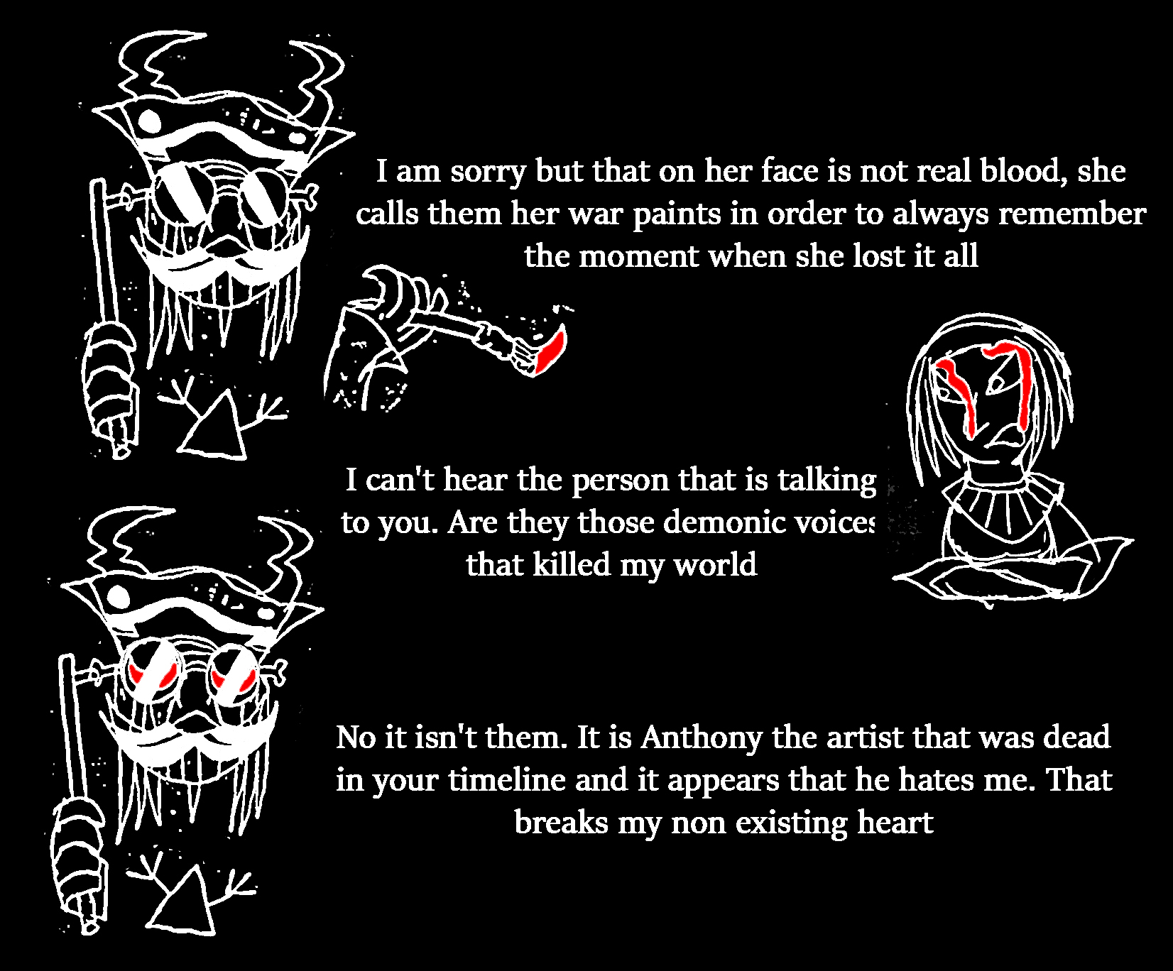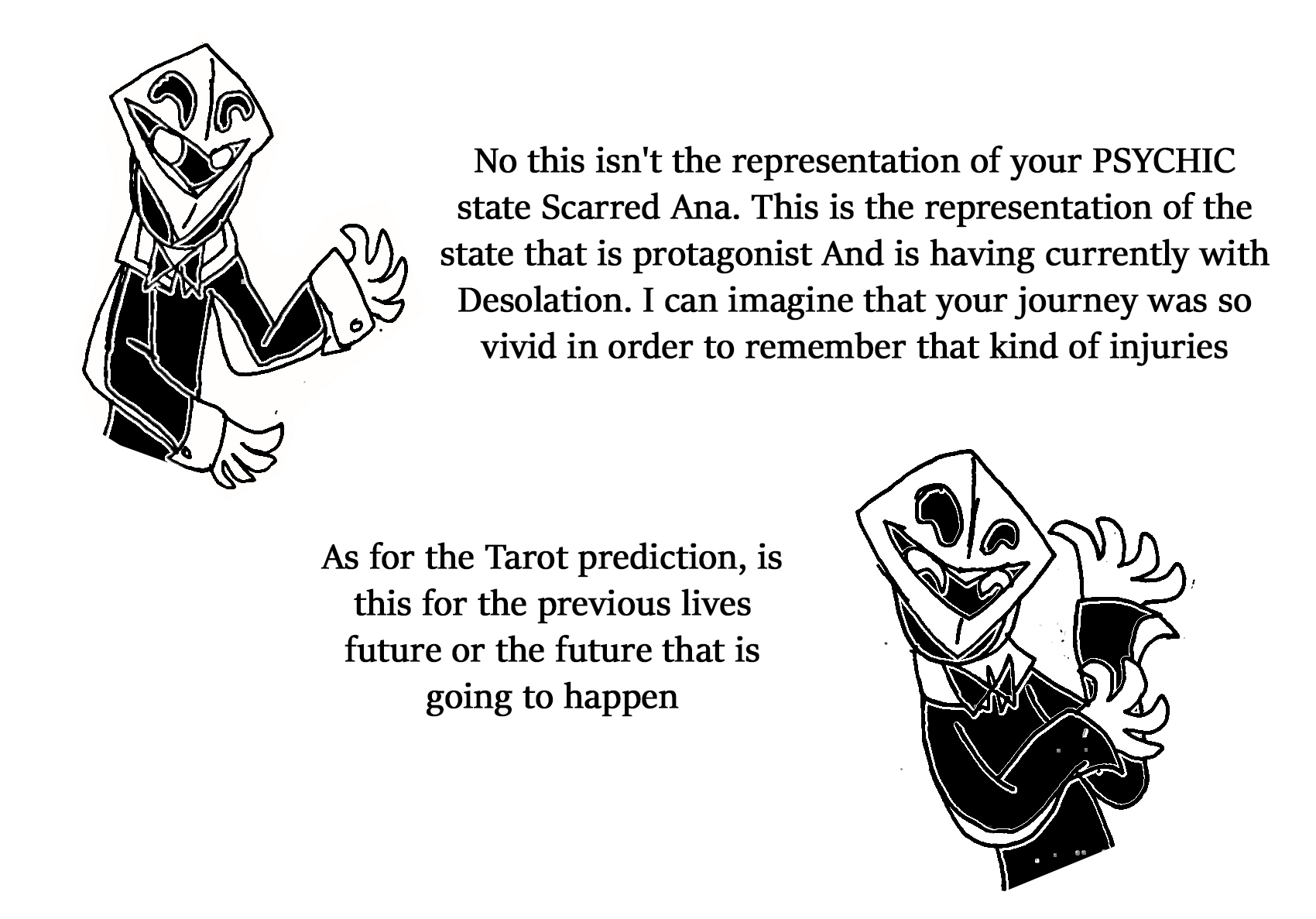Fourth: I want to know if Ana truly wants me to still help her guide her. During the time we were sent to the future, I noticed that Ana did everything she could to find Scarred Ana's totem and even try to repair it to have Scarred talk to her again, but... I don't know if she even bothered to look for mine. Also, I noticed that when Future Ana tripped and fell, her left eye popped out... I use my left eye when I use my fortune telling ability. She may have at one point removed it herself because it reminded her too much of me. After we returned to the present, she refused to hear my story I was about to tell, she ignored my request to read Robbit's note, and she took Scarred Ana's path of threatening Cera instead of trying to leave things peacefully. I'm wondering if she truly wants my help, and if not, if I have wronged her in some way. I wouldn't blame her, I've made too many choices that harmed her, and I even abandoned her at one point.