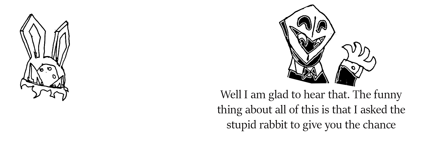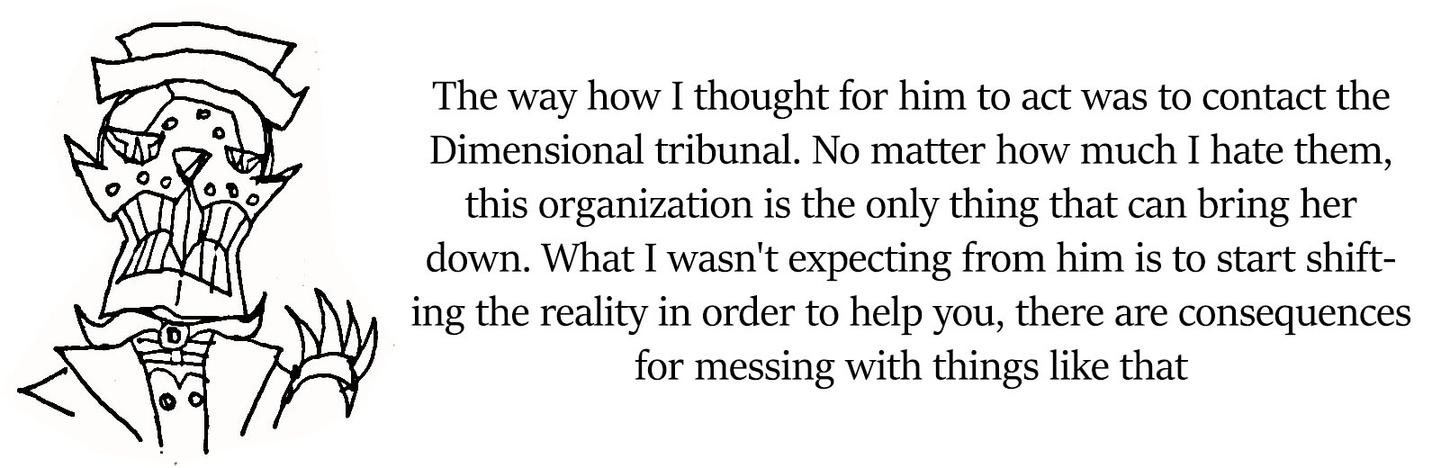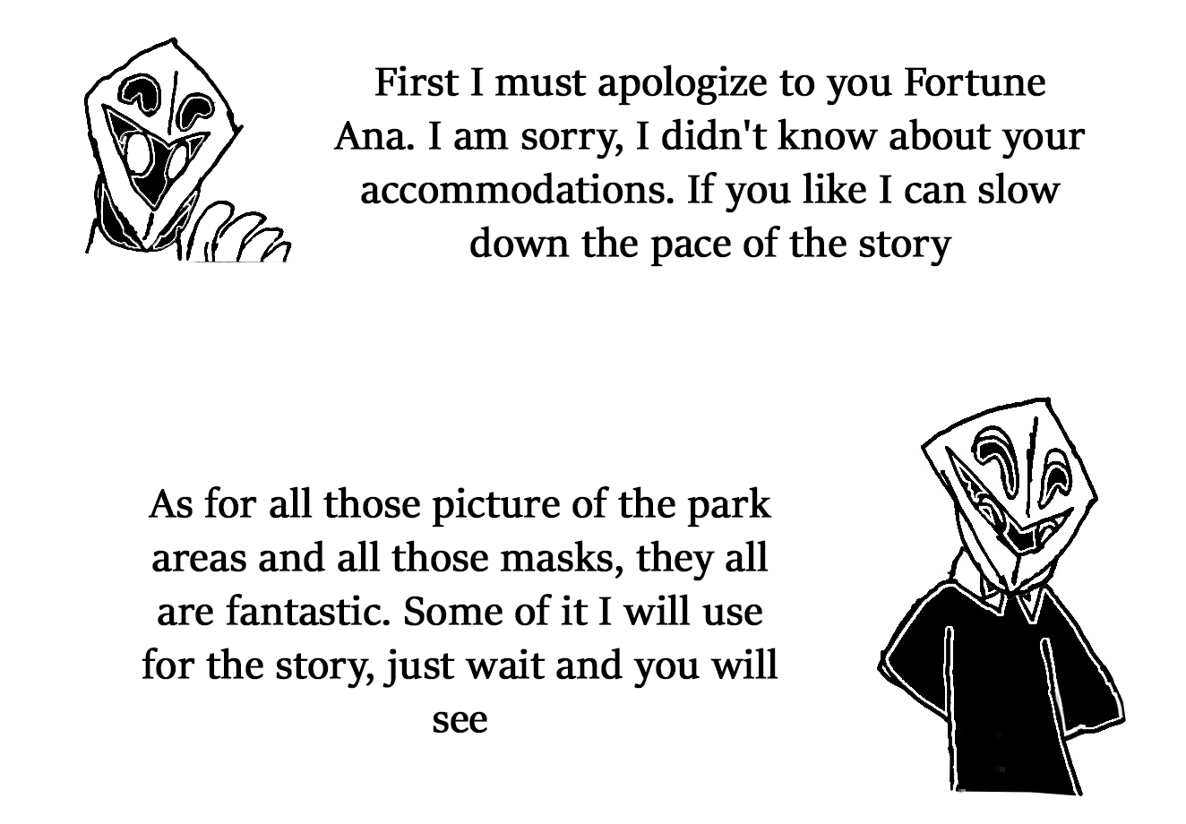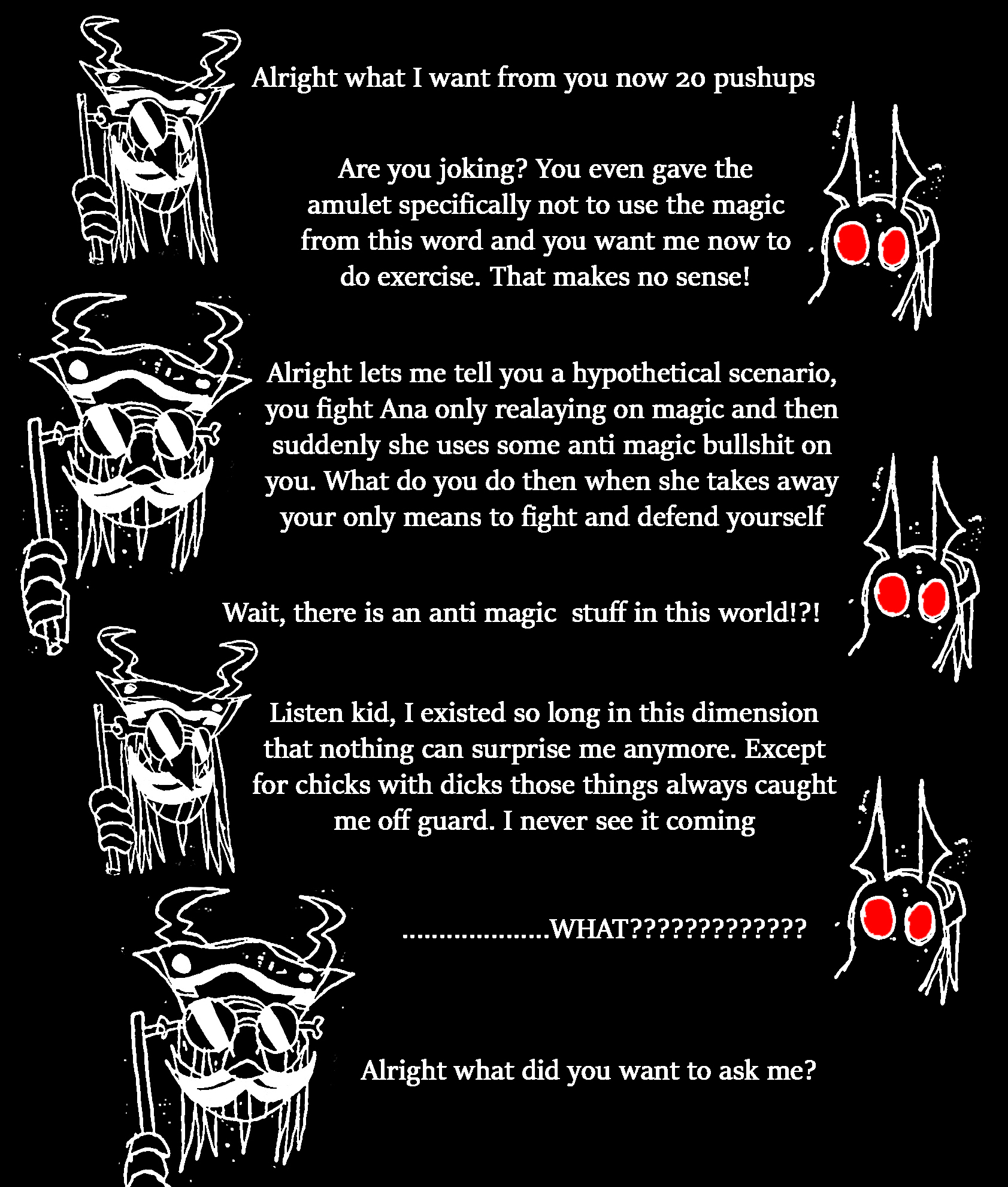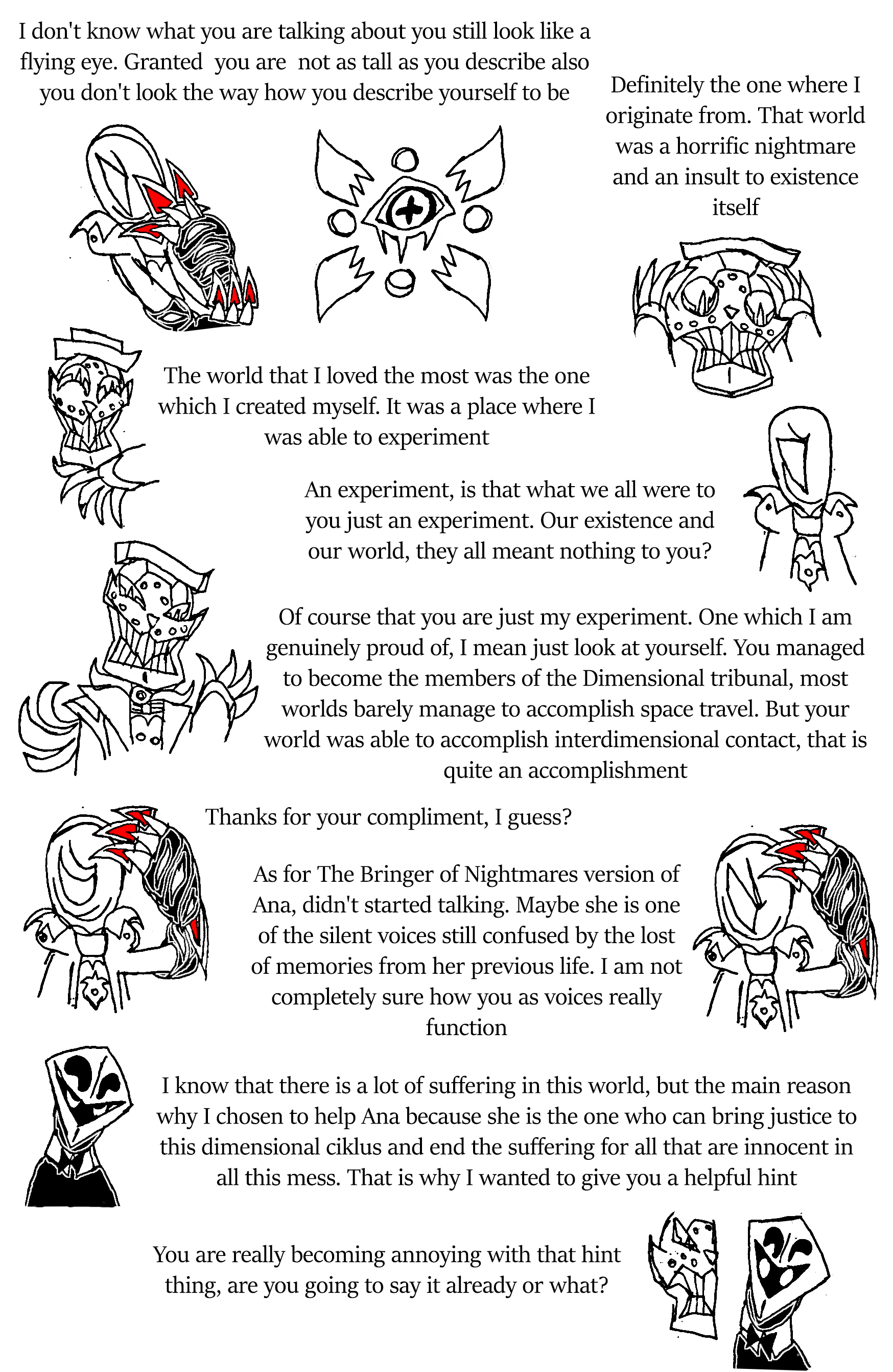 Fourth: I want to know if Ana truly wants me to still help her guide her. During the time we were sent to the future, I noticed that Ana did everything she could to find Scarred Ana's totem and even try to repair it to have Scarred talk to her again, but... I don't know if she even bothered to look for mine. Also, I noticed that when Future Ana tripped and fell, her left eye popped out... I use my left eye when I use my fortune telling ability. She may have at one point removed it herself because it reminded her too much of me. After we returned to the present, she refused to hear my story I was about to tell, she ignored my request to read Robbit's note, and she took Scarred Ana's path of threatening Cera instead of trying to leave things peacefully. I'm wondering if she truly wants my help, and if not, if I have wronged her in some way. I wouldn't blame her, I've made too many choices that harmed her, and I even abandoned her at one point.