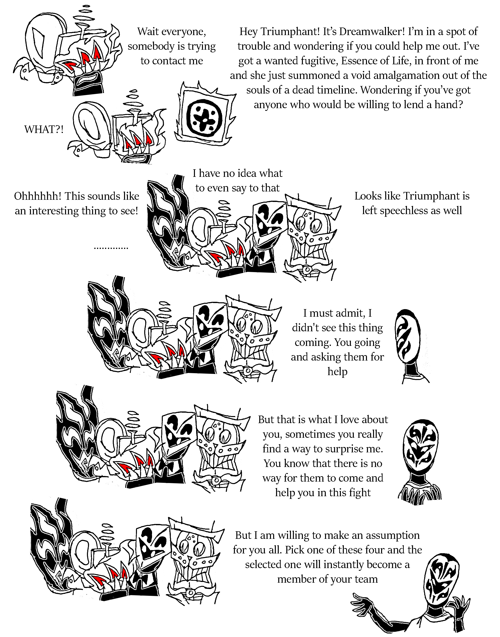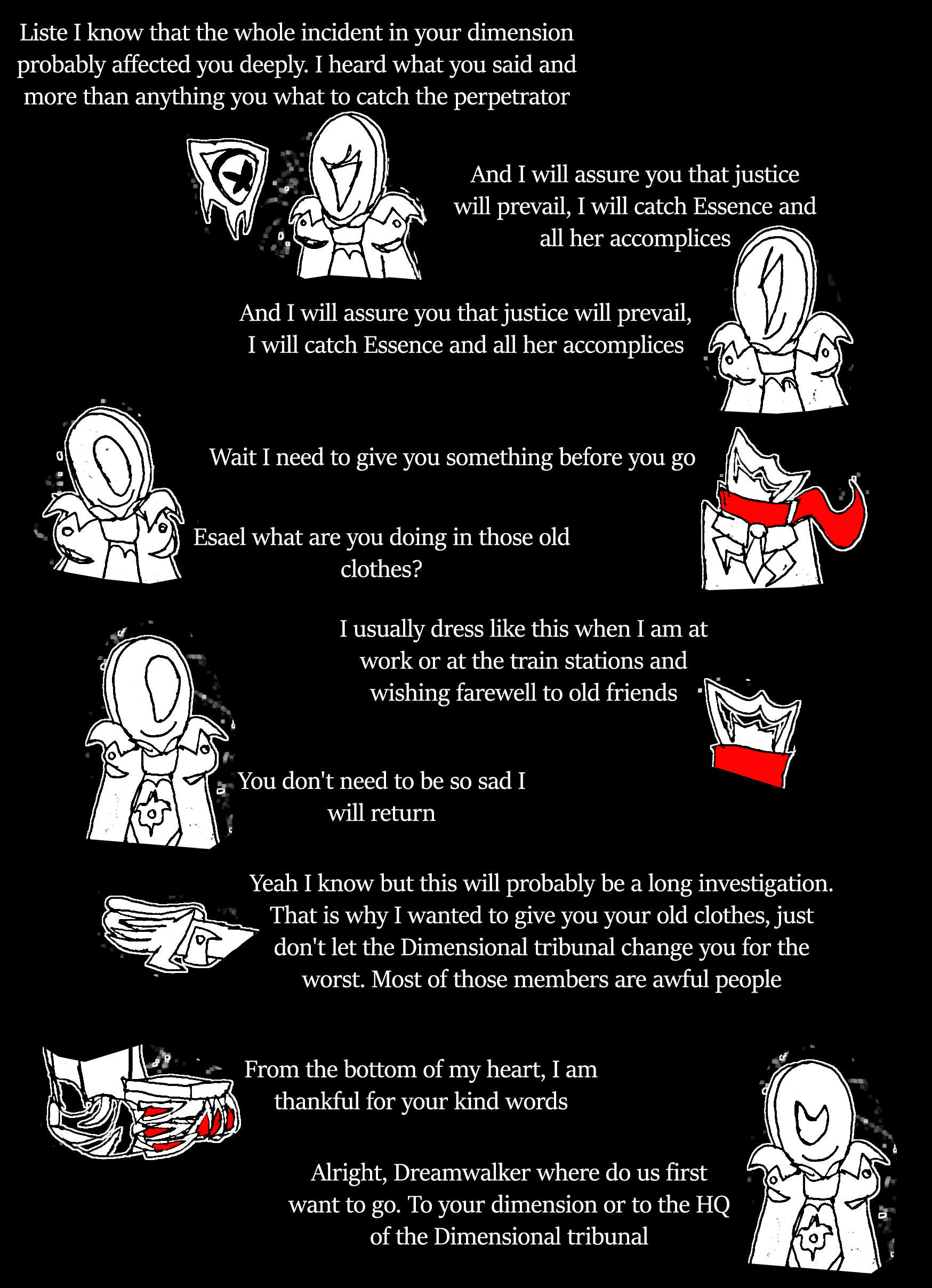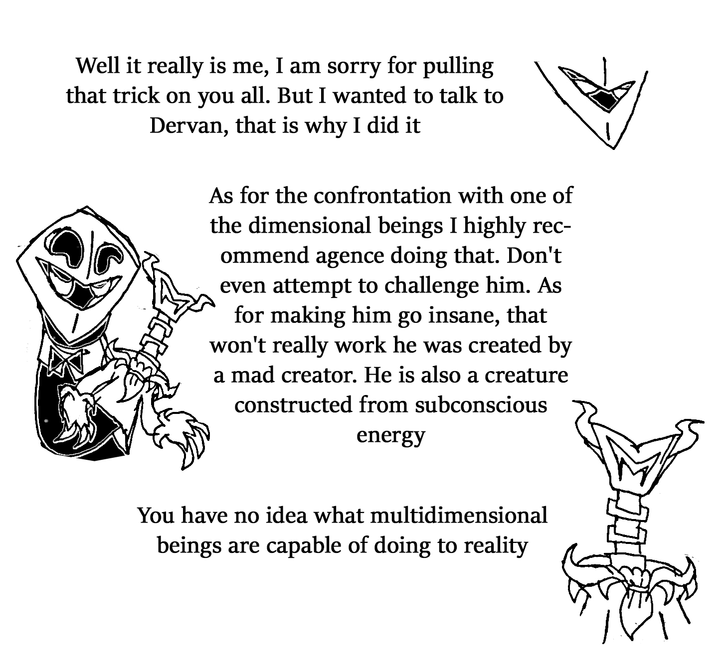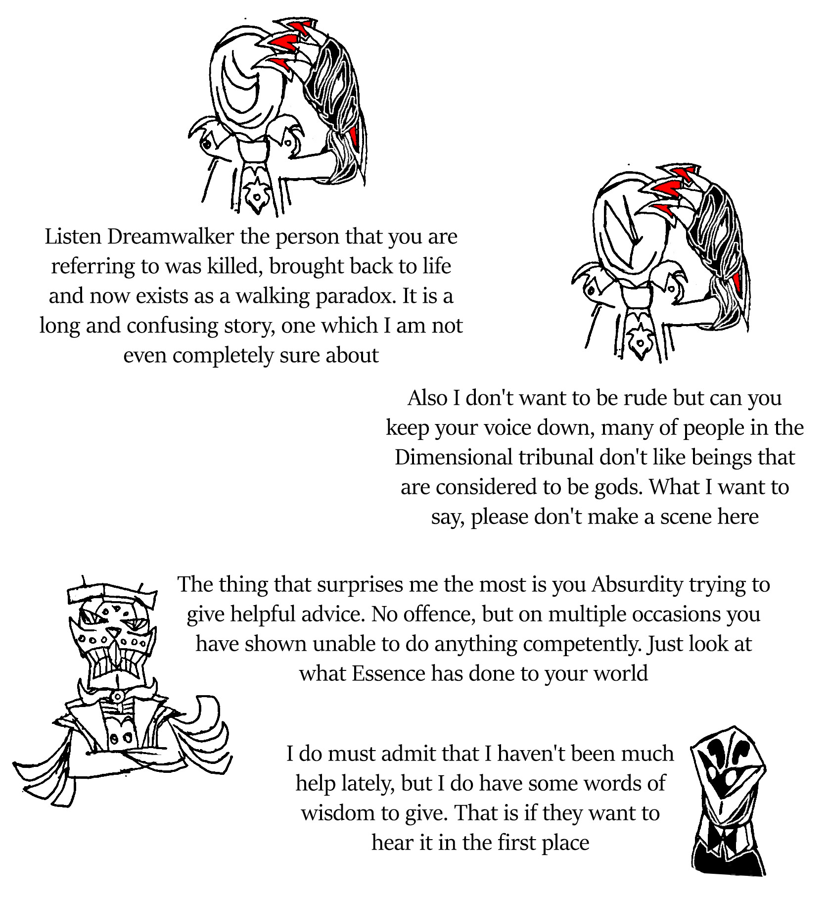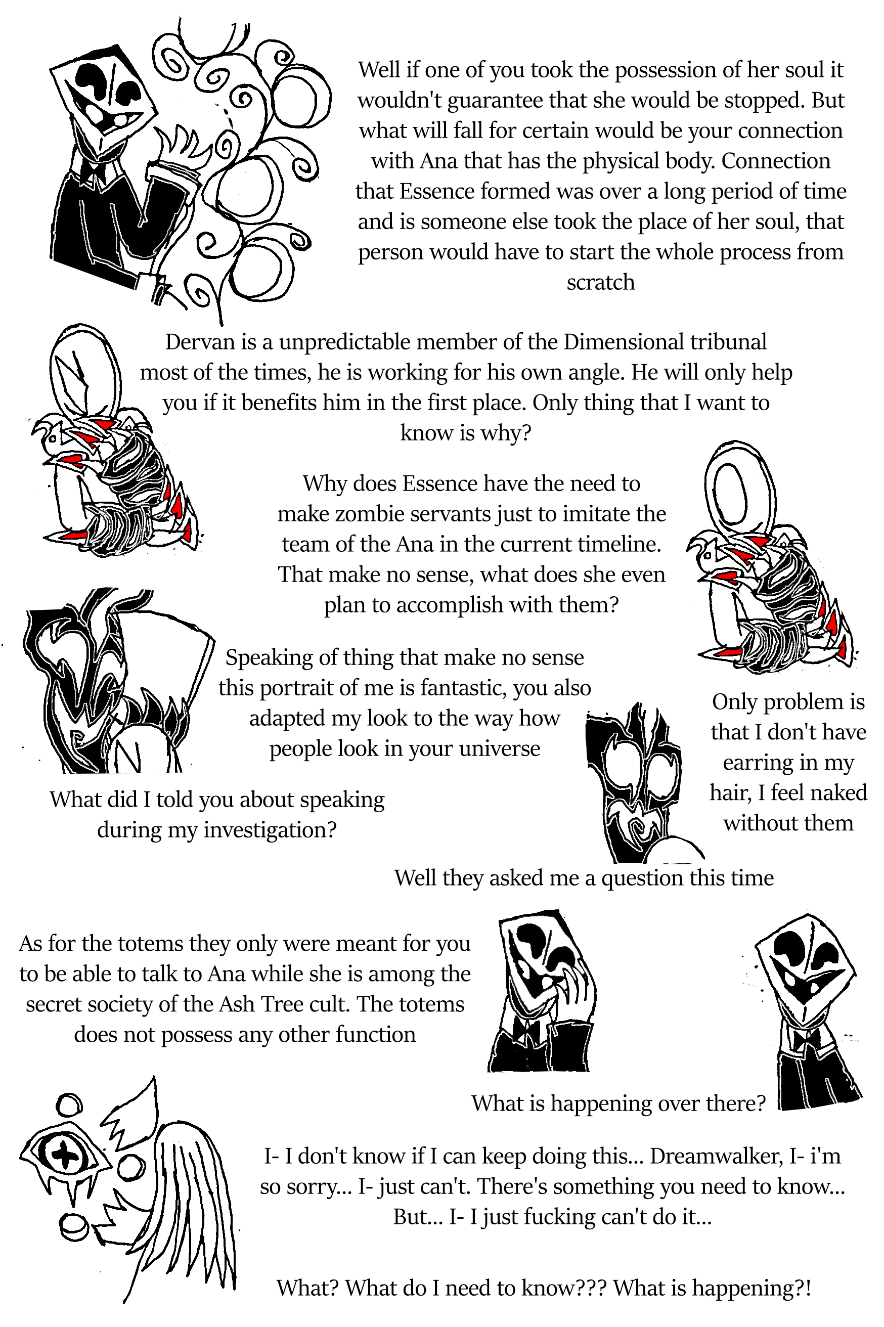 First things first: I think my voice may have been compromised. Before we spoke with Cera, Absurdity gave Ana two white totems that acted like radios for our voices to the physical world. After we went through that fiasco in the future, your friend, The Incubus Melkior, was given Scarred's white totem and her black totem, and my black Totem. However, my white totem was nowhere to be found. I do not know who has it right now, or if it has been destroyed by the future, but just in case someone who wants nothing more than to hurt us has it, I have to stay silent like this and can only communicate with my thoughts. That said, I don't know how communicating like this will effect Ana or the person you have formed a bond with, or if they will be able to hear me. That said, I may have to act not as their guides, but probably as your guide, Dreamwalker.
