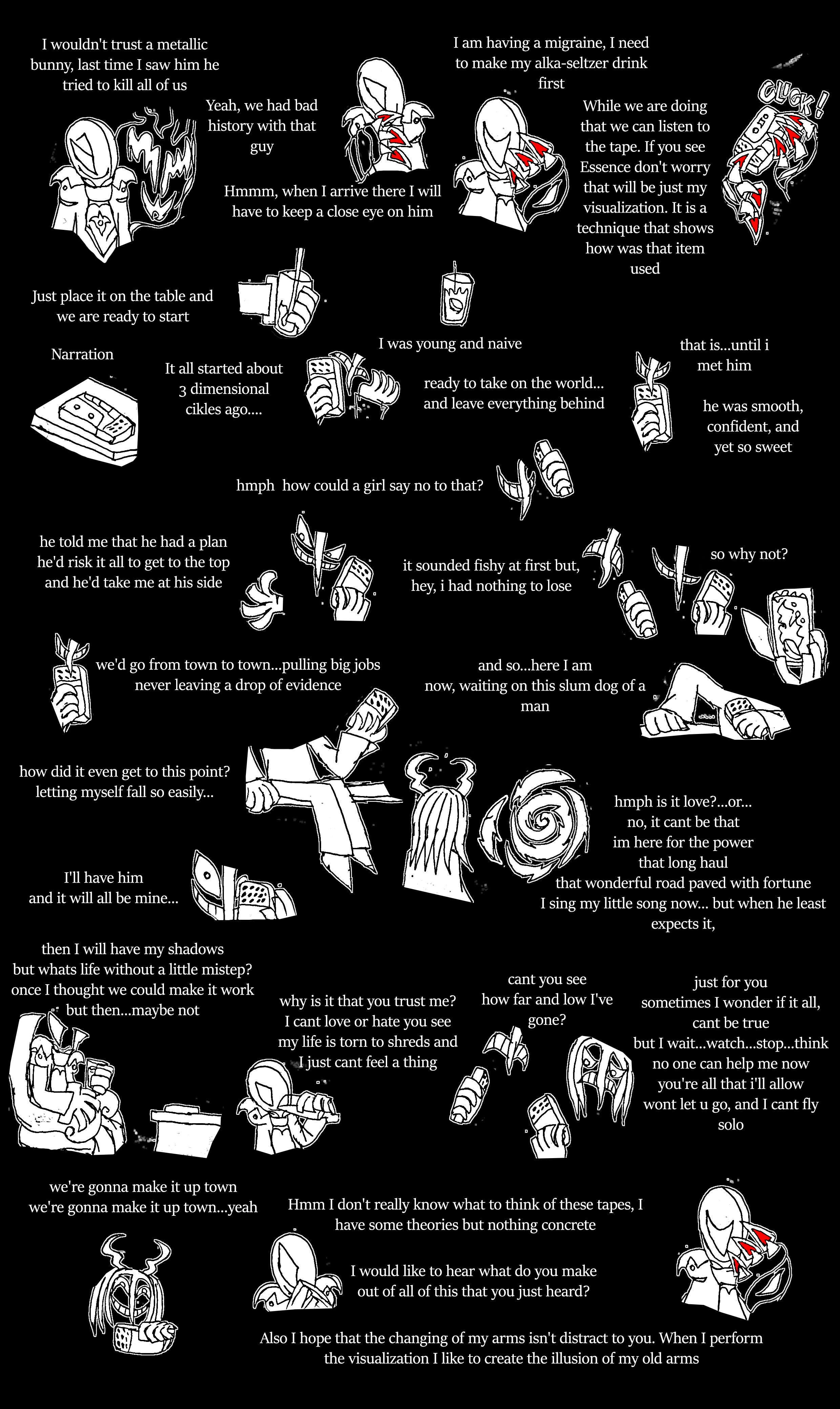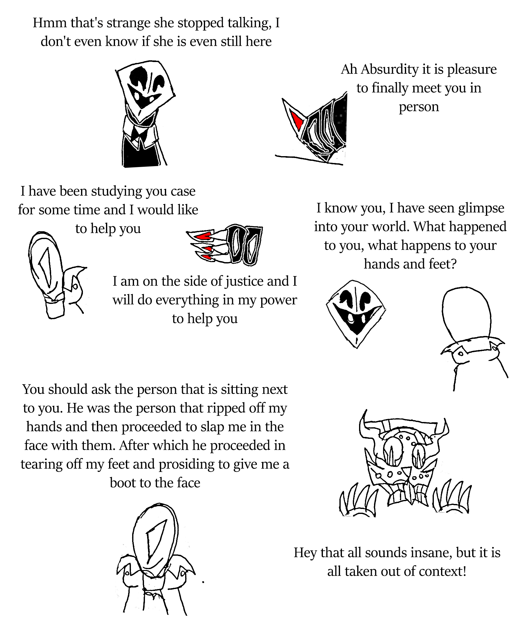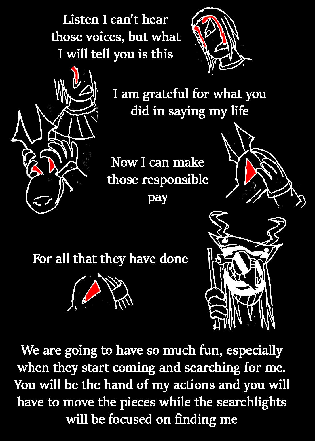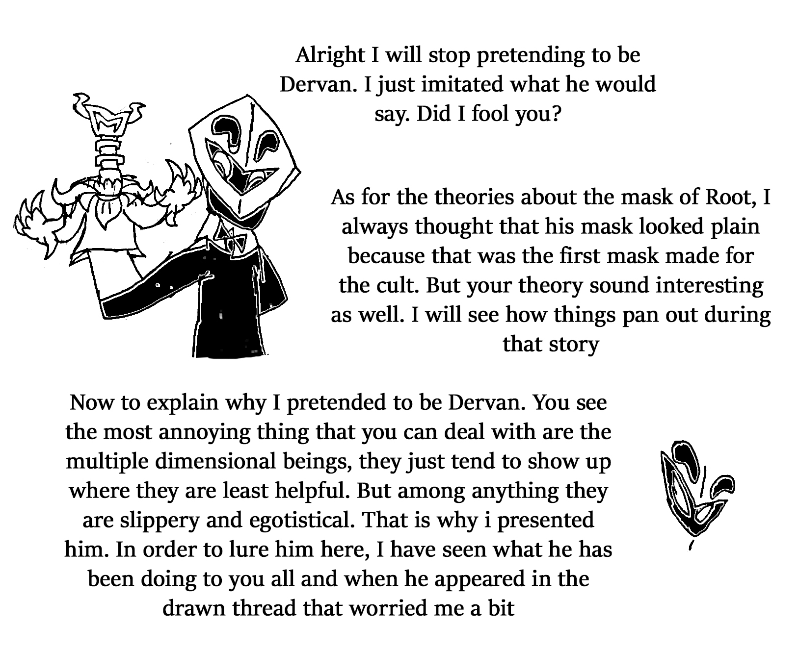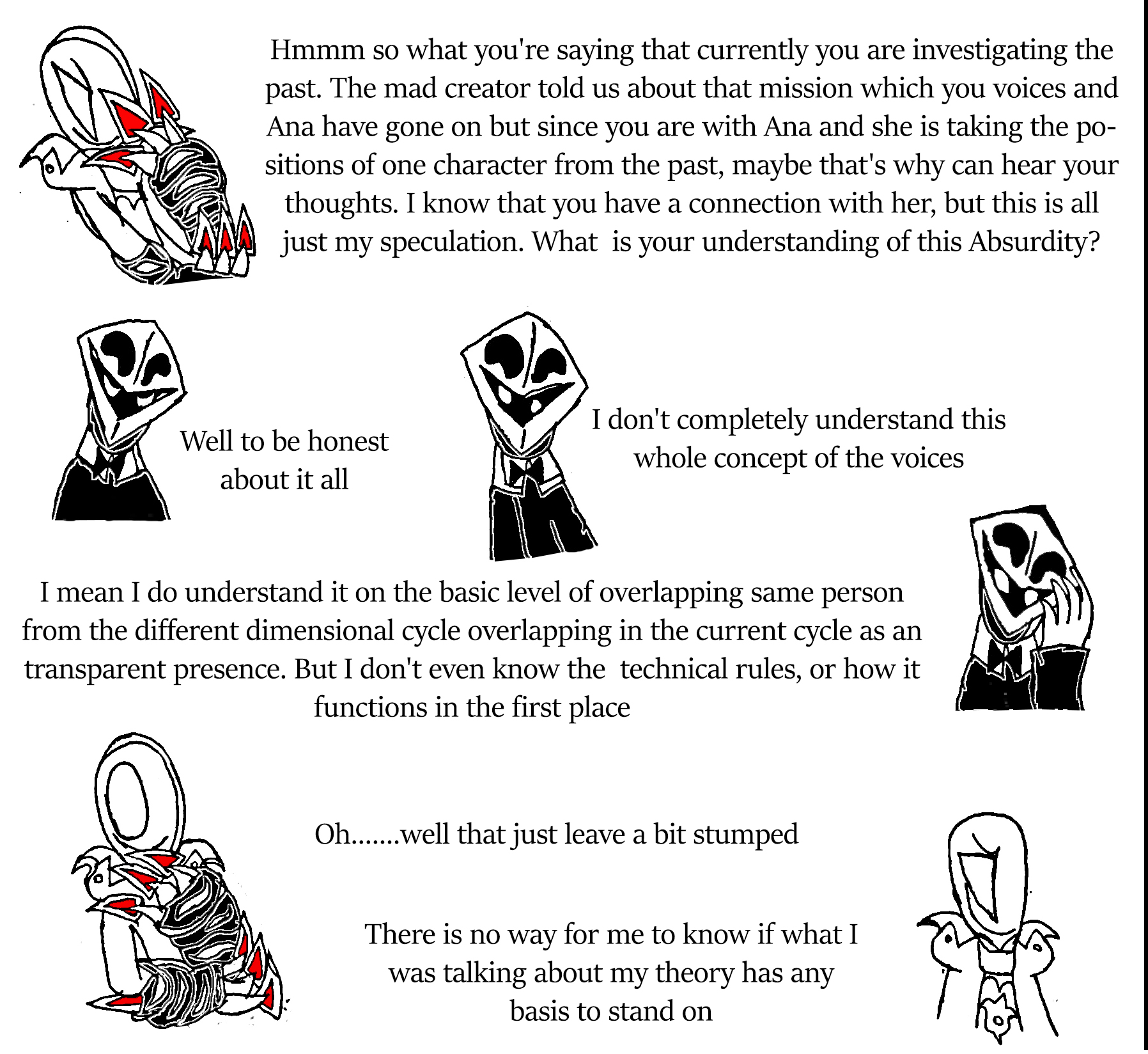 First things first: I think my voice may have been compromised. Before we spoke with Cera, Absurdity gave Ana two white totems that acted like radios for our voices to the physical world. After we went through that fiasco in the future, your friend, The Incubus Melkior, was given Scarred's white totem and her black totem, and my black Totem. However, my white totem was nowhere to be found. I do not know who has it right now, or if it has been destroyed by the future, but just in case someone who wants nothing more than to hurt us has it, I have to stay silent like this and can only communicate with my thoughts. That said, I don't know how communicating like this will effect Ana or the person you have formed a bond with, or if they will be able to hear me. That said, I may have to act not as their guides, but probably as your guide, Dreamwalker.