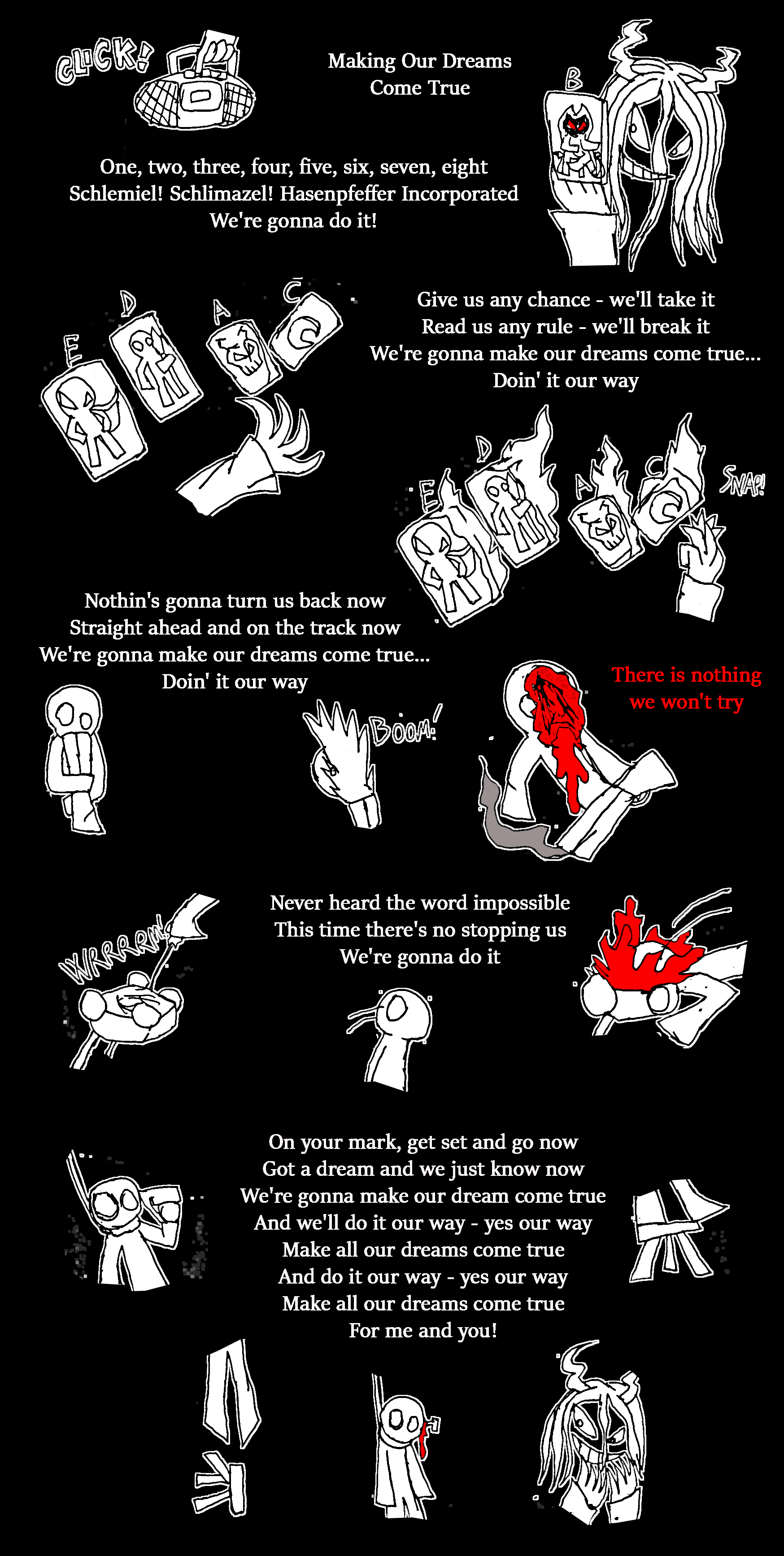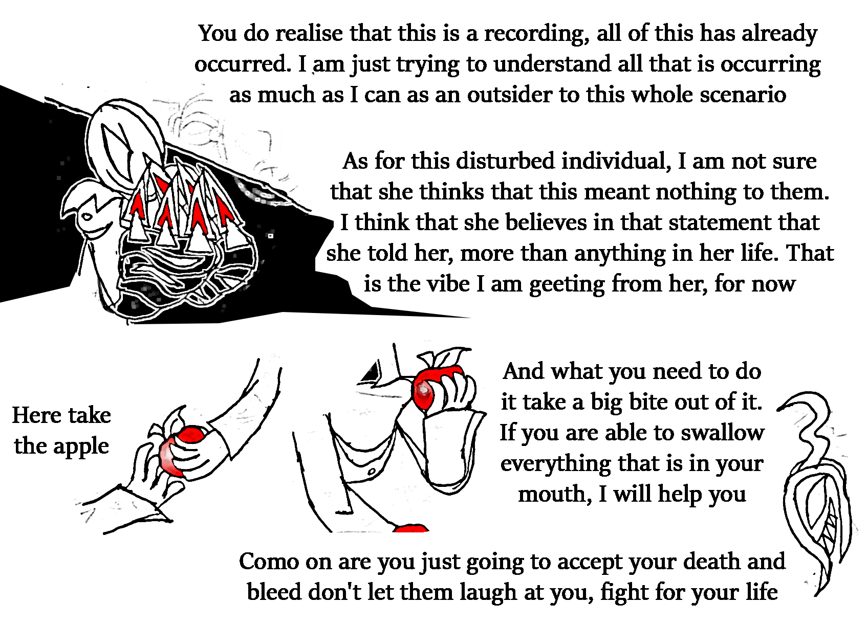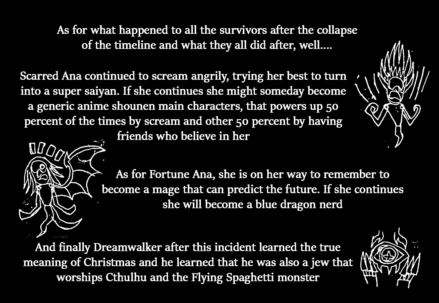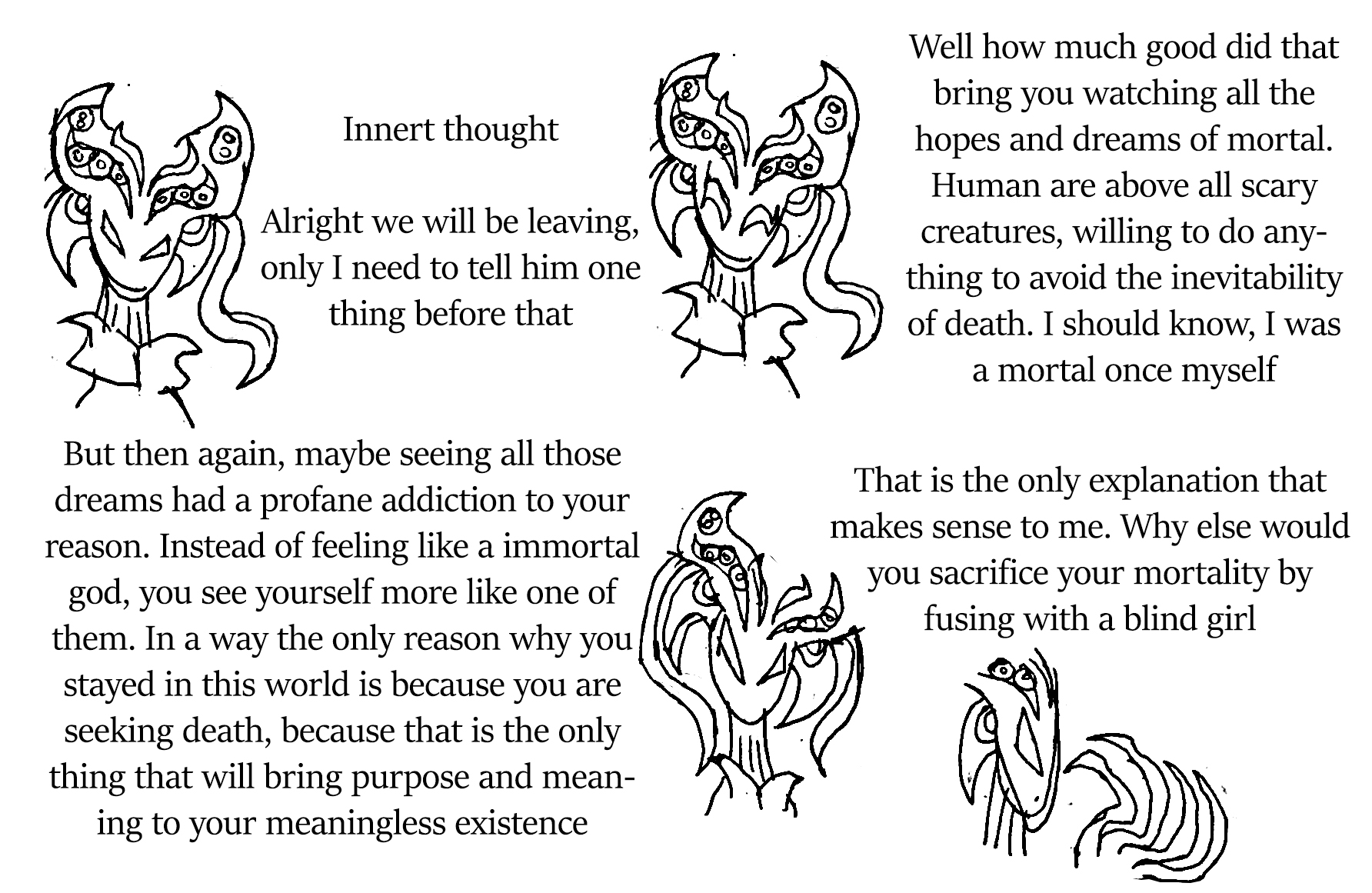 Finally: Dreamwalker, you're injured and weak. I'm worried that your condition is going to hurt Lucid in a lot of ways very badly... which is why I have a request for you: your guide has told you that you needed to consume memories to grow stronger right? well here is my request: I want you to consume my knowledge of fortune telling, and my memory of Falafaf. After what I've done to future Falafaf, I feel I don't deserve this power. I never even asked for it in the first place, I just gained it by accident. Me having and using those powers after what I've done will only fill me with guilt and be an insult to her while you on the other hand never wanted Falafaf dead. If you take and use my fortune telling knowledge, I can at least be happy that her powers will live on through you rather than someone who just threw her life away. will you please accept this offer?