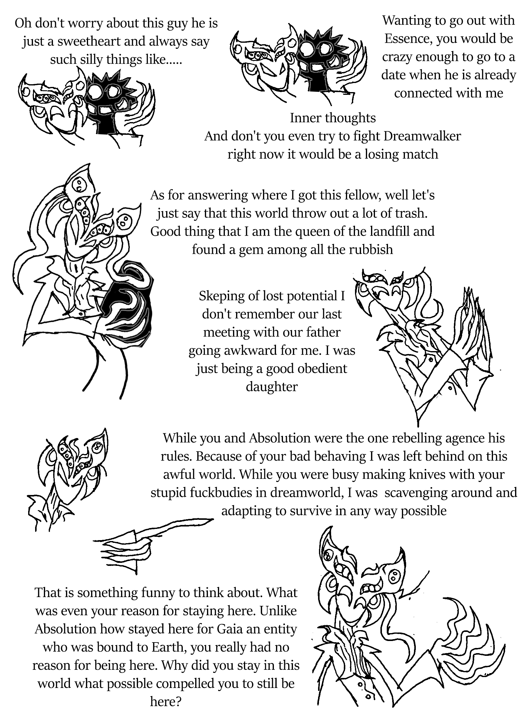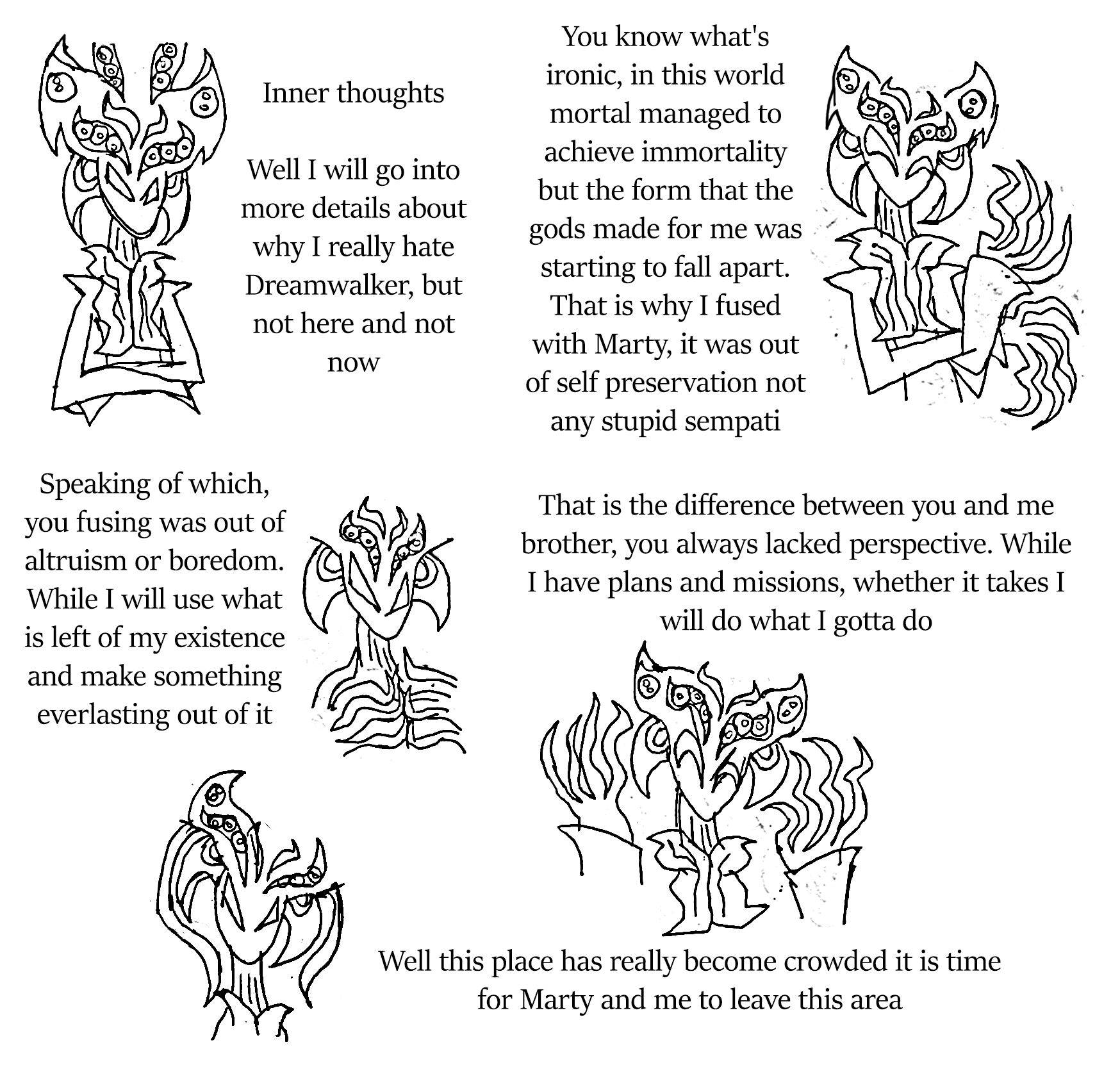 I saw what was going on through my dreams. I'm assuming you, Dreamwalker, may have been keeping me updated while I was having fun in my little dreamworld. honestly, I feel like I want to go back to sleep and forget all this. Dreams are much more comforting than reality, but I can see you need me.