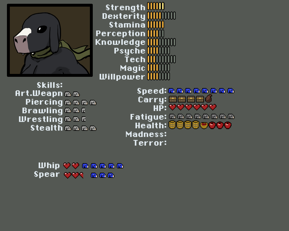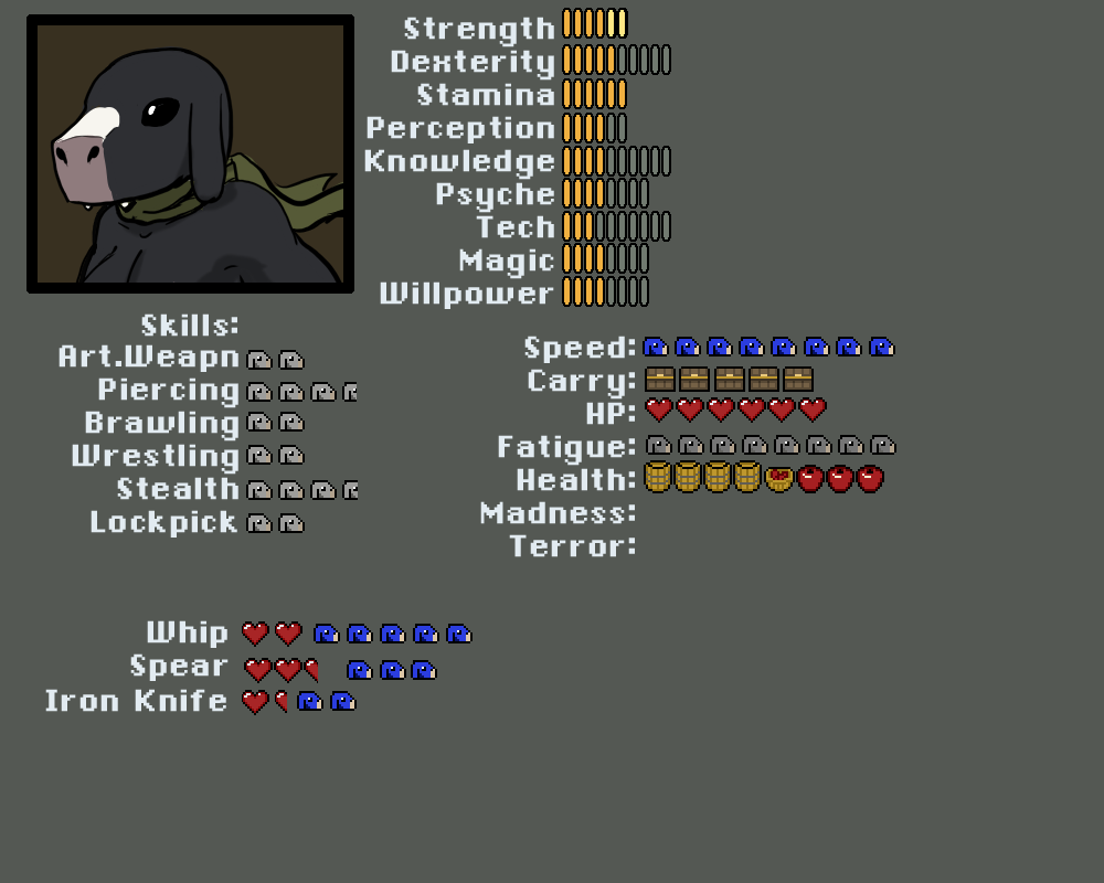 Madness, Terror. Rolled against when a kobold has to take a check for seeing something that breaks reality or is terrifying. Goes up on a failure, and also acts as resistance for future madness/terror checks. Kobolds start behaving erraticly if either one gets too high.