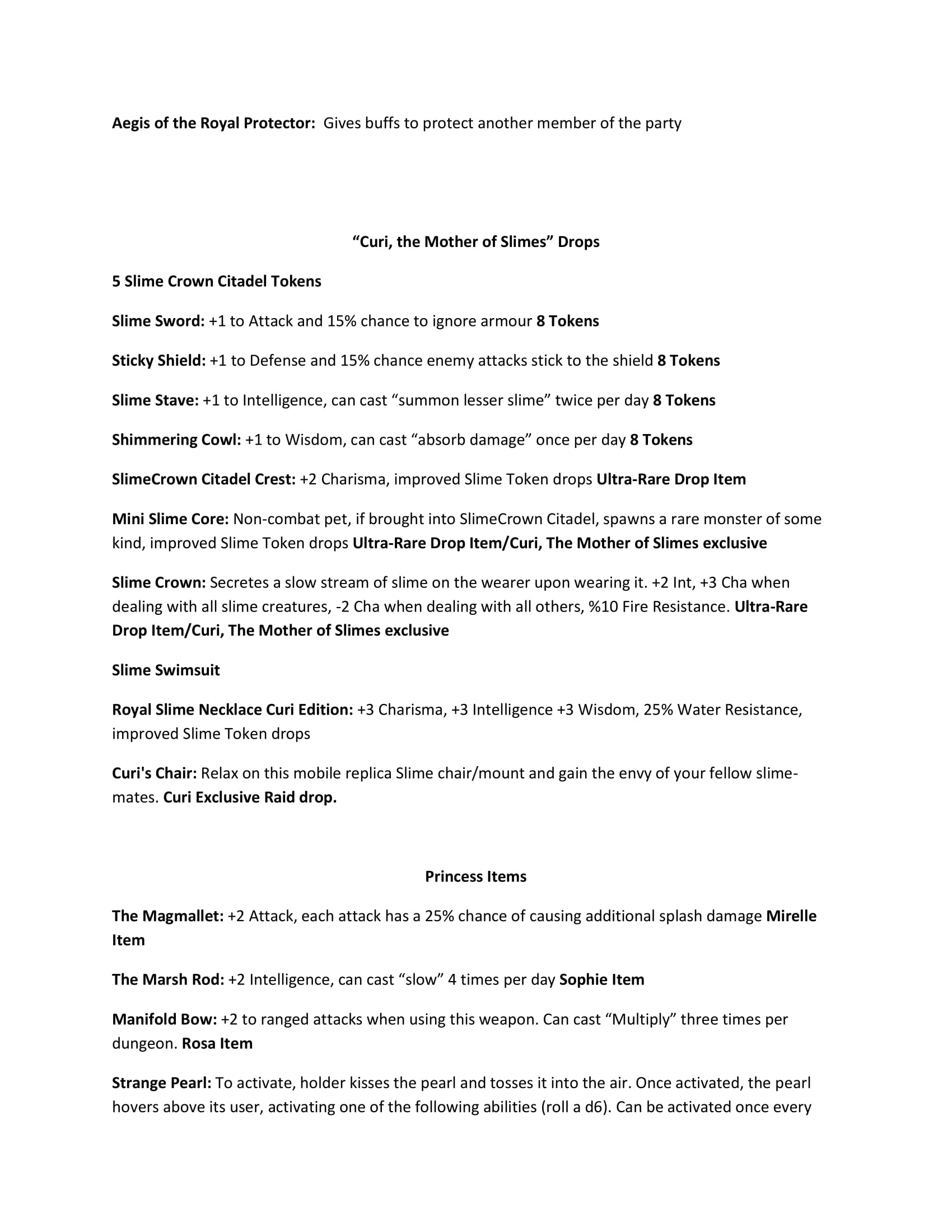 >The height of luxury, adventurers spend an hour in the chamber with the attendant, where they will find themselves at one with the slimes that live there, well rested, and truly content (Immune to Sleep, Significant increases in other resistances, slight mana/skill point regen)