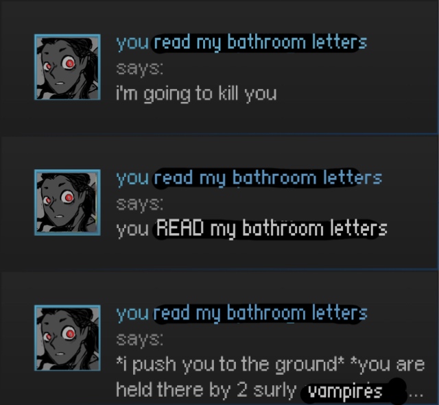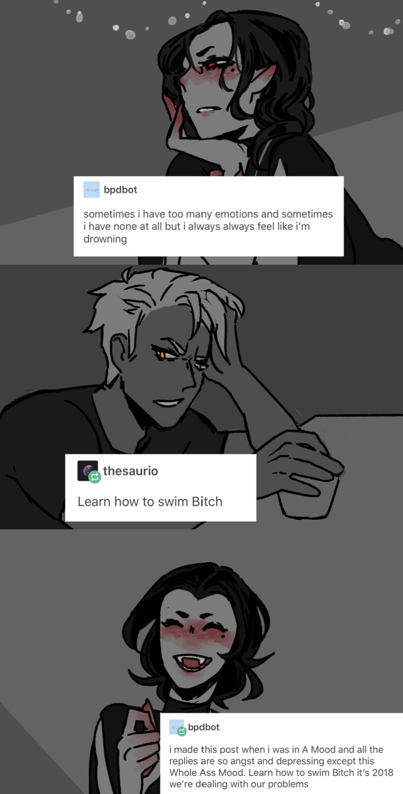 mmmmmm i think it’s more like..... things could Go badly and you guys could have a really rough time for a while, but i’m way more interested in giving you guys opportunities to fix your mistakes than i am in yelling GAME OVER, u know? and also i’m just like. fundamentally not interested in writing a story full of lgbt characters with a tragic/grimdark outcome, frankly. i’m very interested in the interactive part of tvrn being very Present, i want your suggestions to have weight and meaning and i Will enact narrative consequences when you fuck up, but i’m not interested in like. actually idk i think the best way to put this is i never want it to stop being fun. i will punish u guys for fucking up bc i think consequences are interesting and make for an engaging plot but i think that kind of punishment should always be followed by opportunities to fix things and get back on track