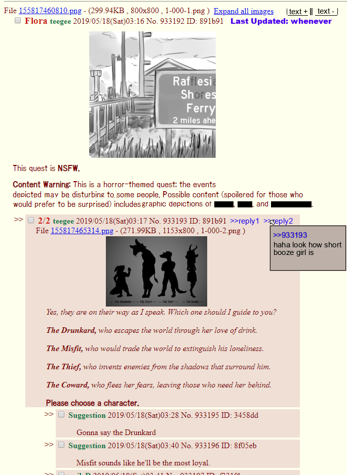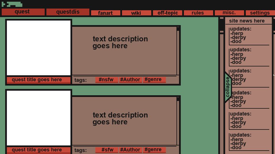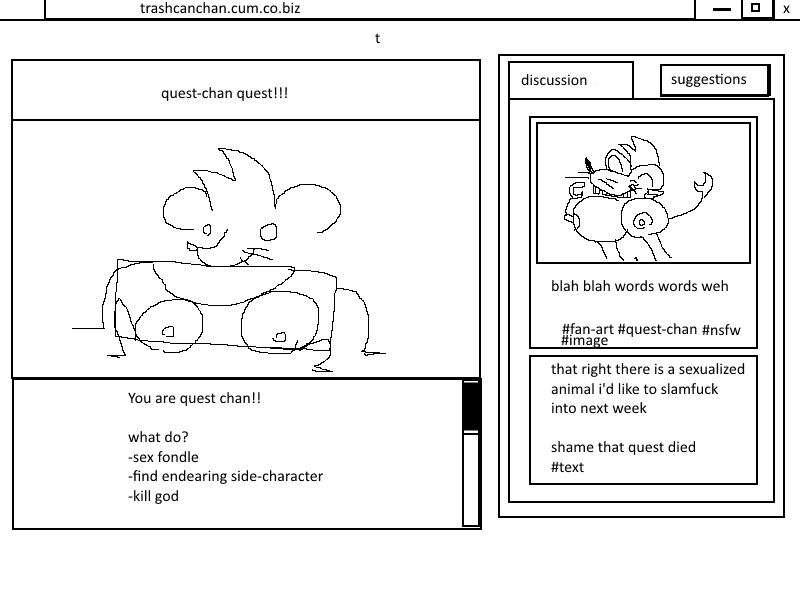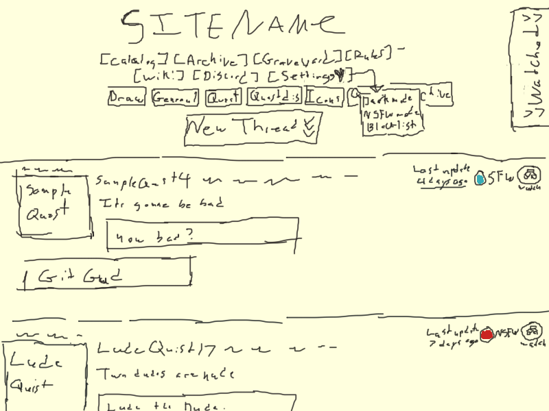 Two ideas I have: One is a direct feed to the quest author, the other is more of a mini-forum type deal that acts like a discussion thread. Similar imageboard format, though I may ask for adjustments to the layout since the way images offset text always sets my ocd off super hard. Maybe something kind of tumblr in terms of format, so people can post commented fanart or memes or what have you.
