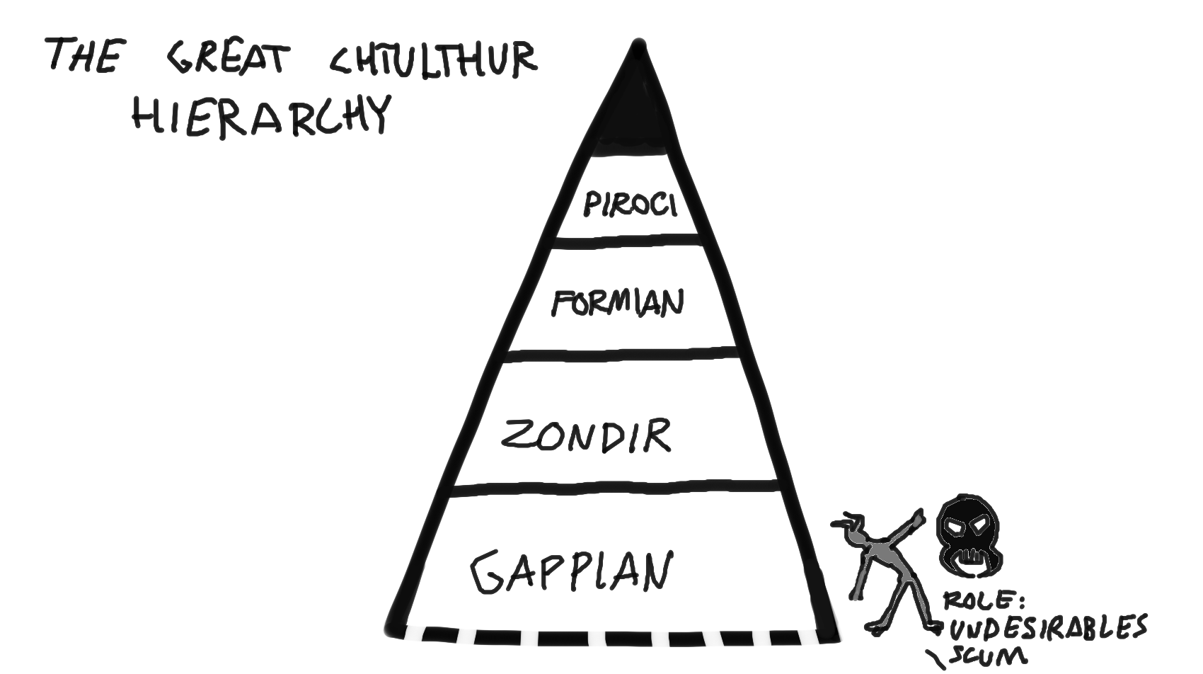 The Great Chtulthur Hierarchy is regarded just as a hive of overgrown insects by outsiders, but this is not the truth. Although structurally it is a hive mind-like colony system, it is quite far from a gestalt consciousness. It is sure very compartmentalized in that the society consists of different insect races each having their own function emerging from the racial trait. Then again also each individual insect in the colonies are compartmentalized and do not behave with hive mentality. To the lowest caste in this hierarchy it is vastly unknown what the purpose or function of the hierarchy is. There is no way of knowing how things can possibly work without a visible leadership or a line of command anywhere. There seems to be no coherence at all. Yet the Hierarchy reorganizes and exists now and forever.