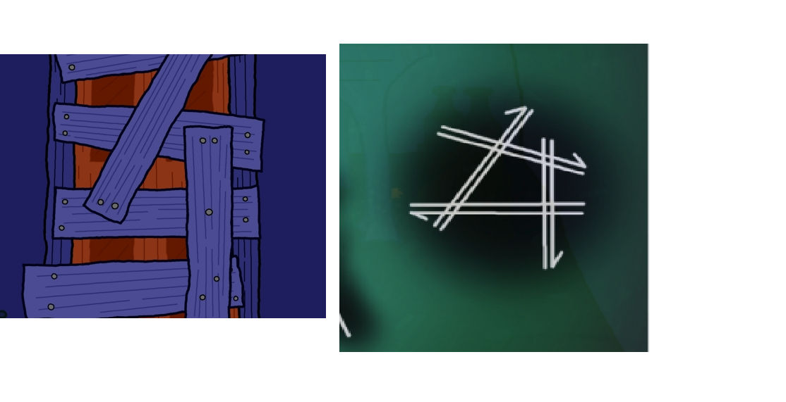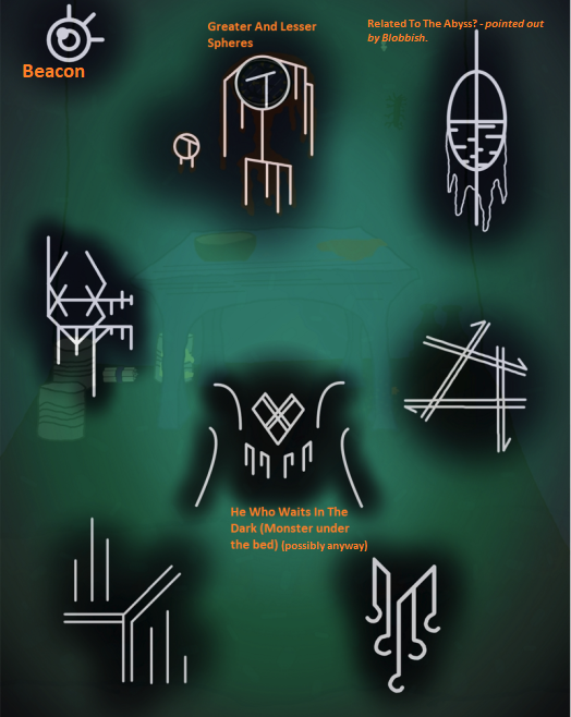 Bottom right one reminds me of the green symbols on the pot and drawer hole, all curvy. Probably has to do with dirt and rot or plant matter.