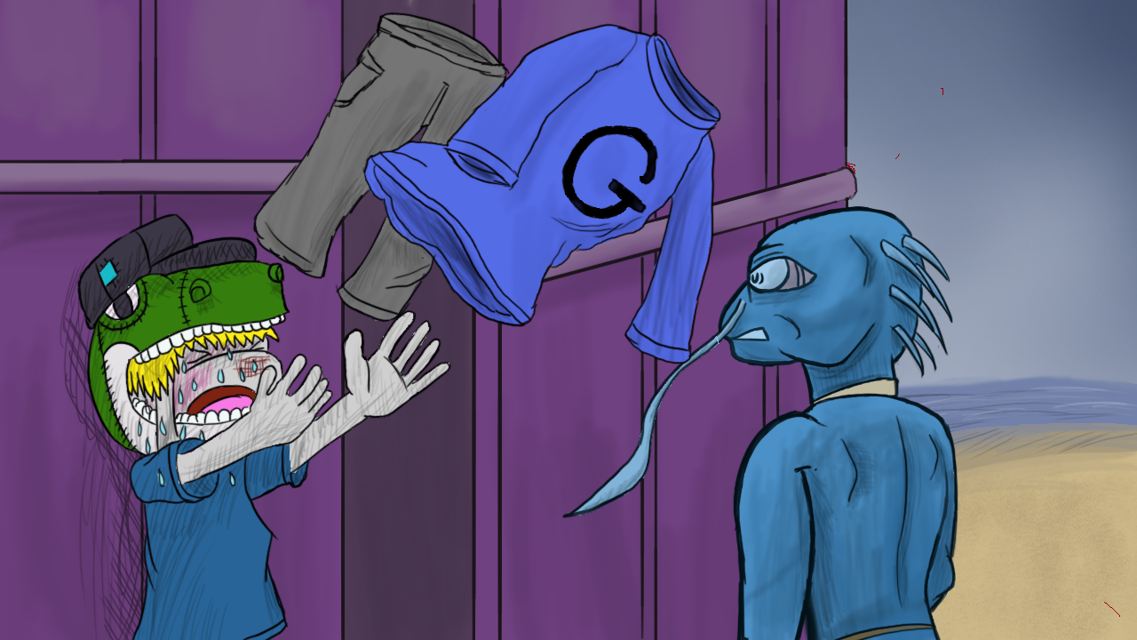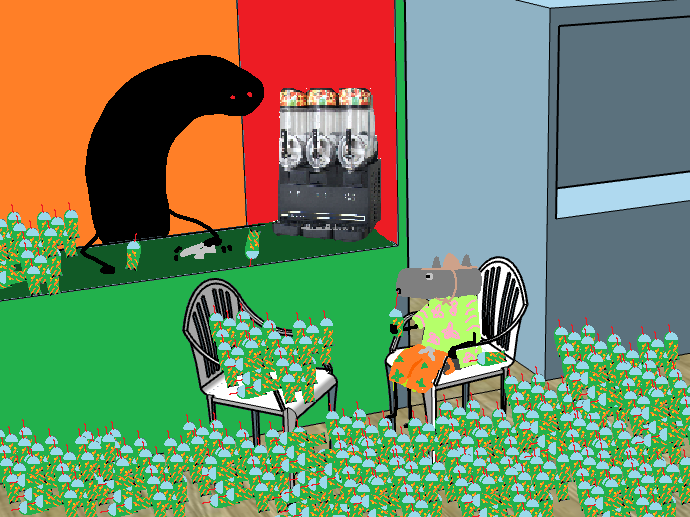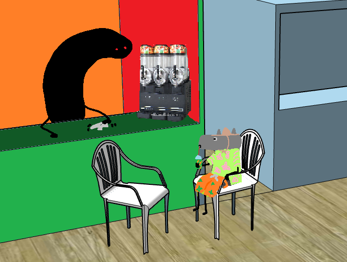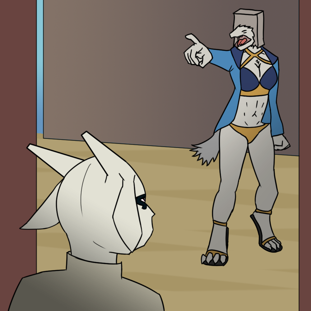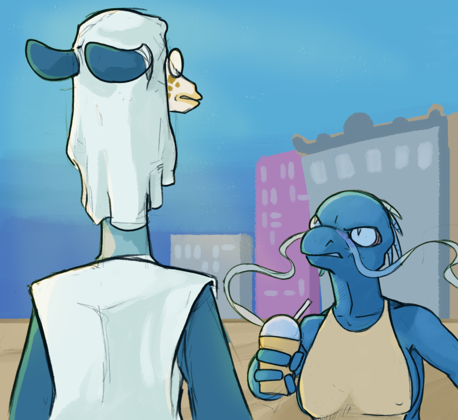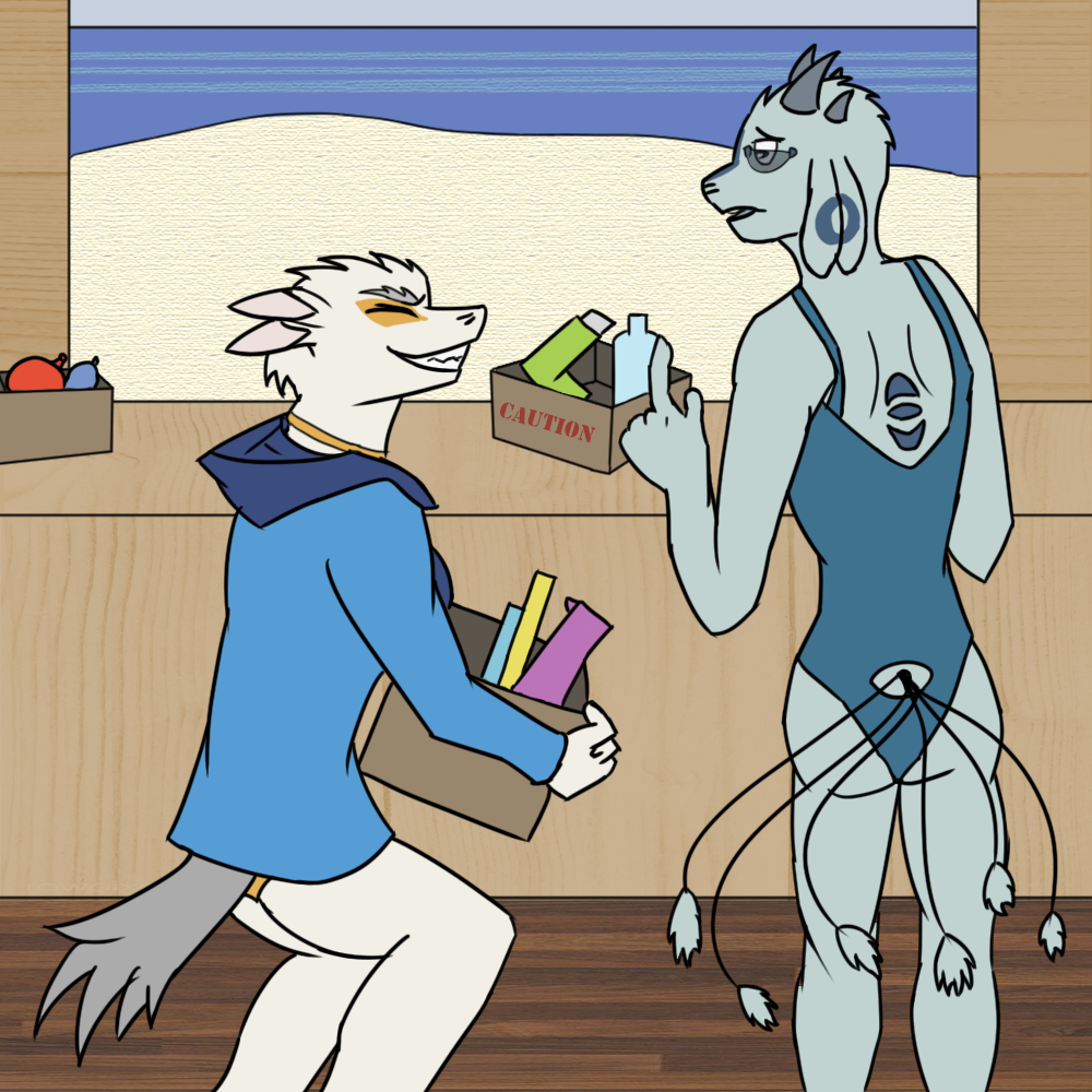 Before the blue girl can say anything, her sales partner disappears out the back, the door slamming behind her.