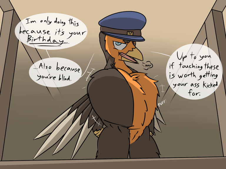 Here’s Ecoa from Return to Sender (by Rowaway). It’s a certain outpost receptionist’s special day, so she’s puffing out and flexing her chest as only a bird can!
