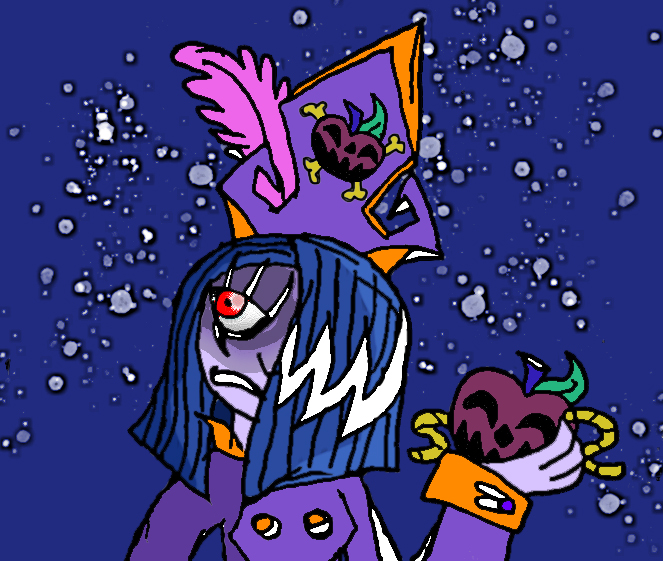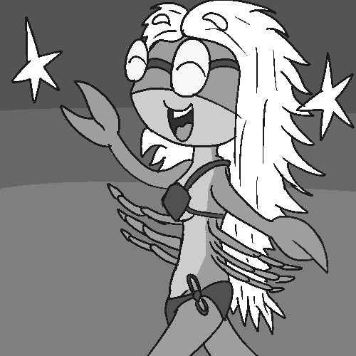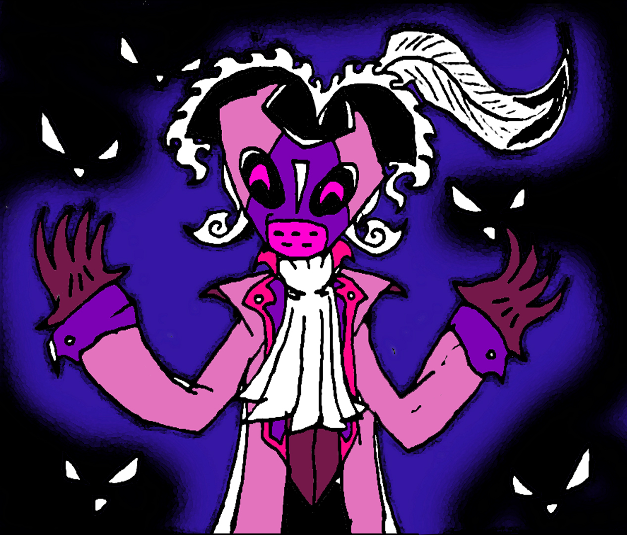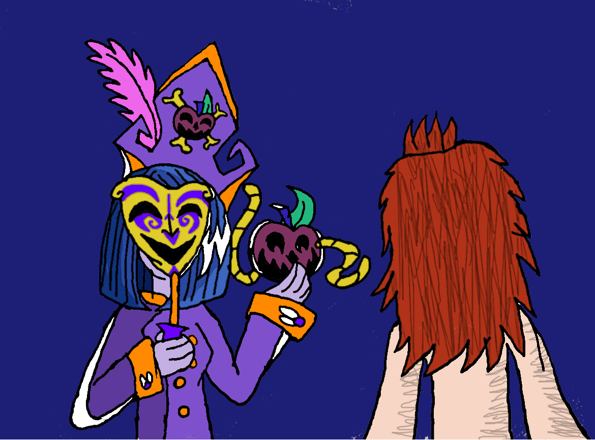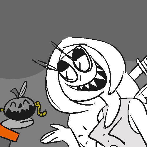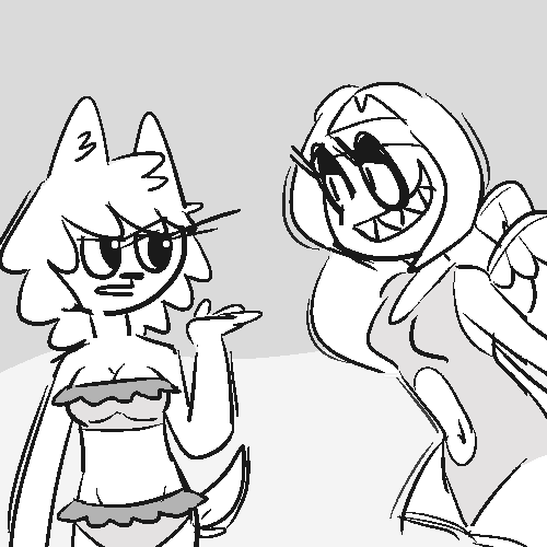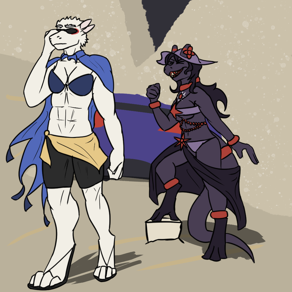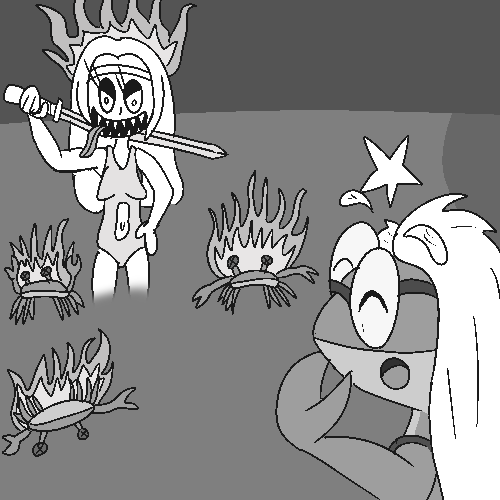 With a snap of her fingers another figure appears next to her. This one is floating and very subtly transparent. After a moment their form changes and they’re still transparent from the knee down, but are now in a one-piece swimsuit, sword floating behind their back. Their grin is menacing, their voice is piercing and seductive, like it’s being whispered inside of your eardrum.