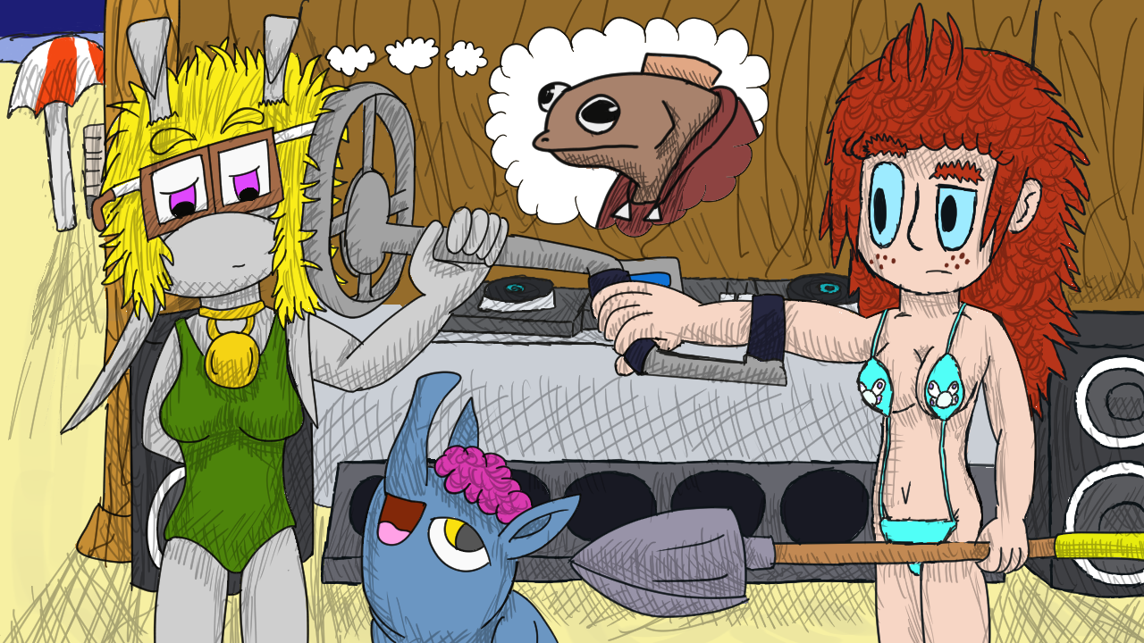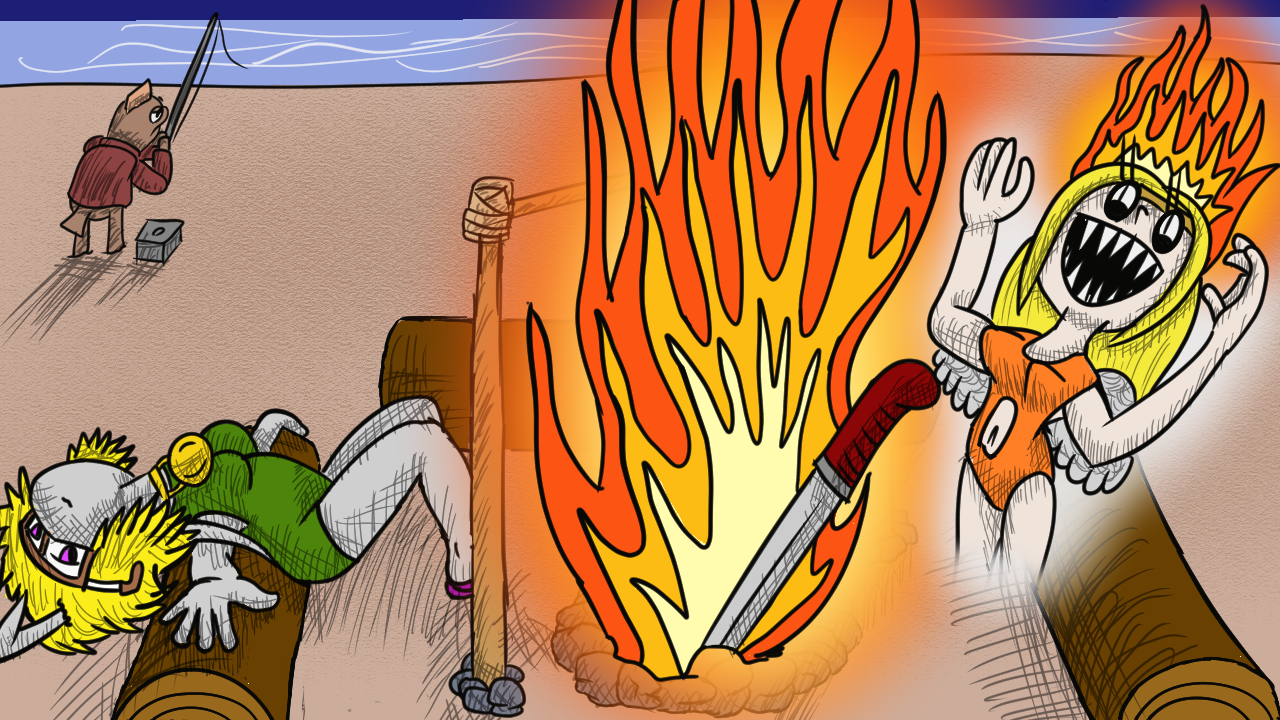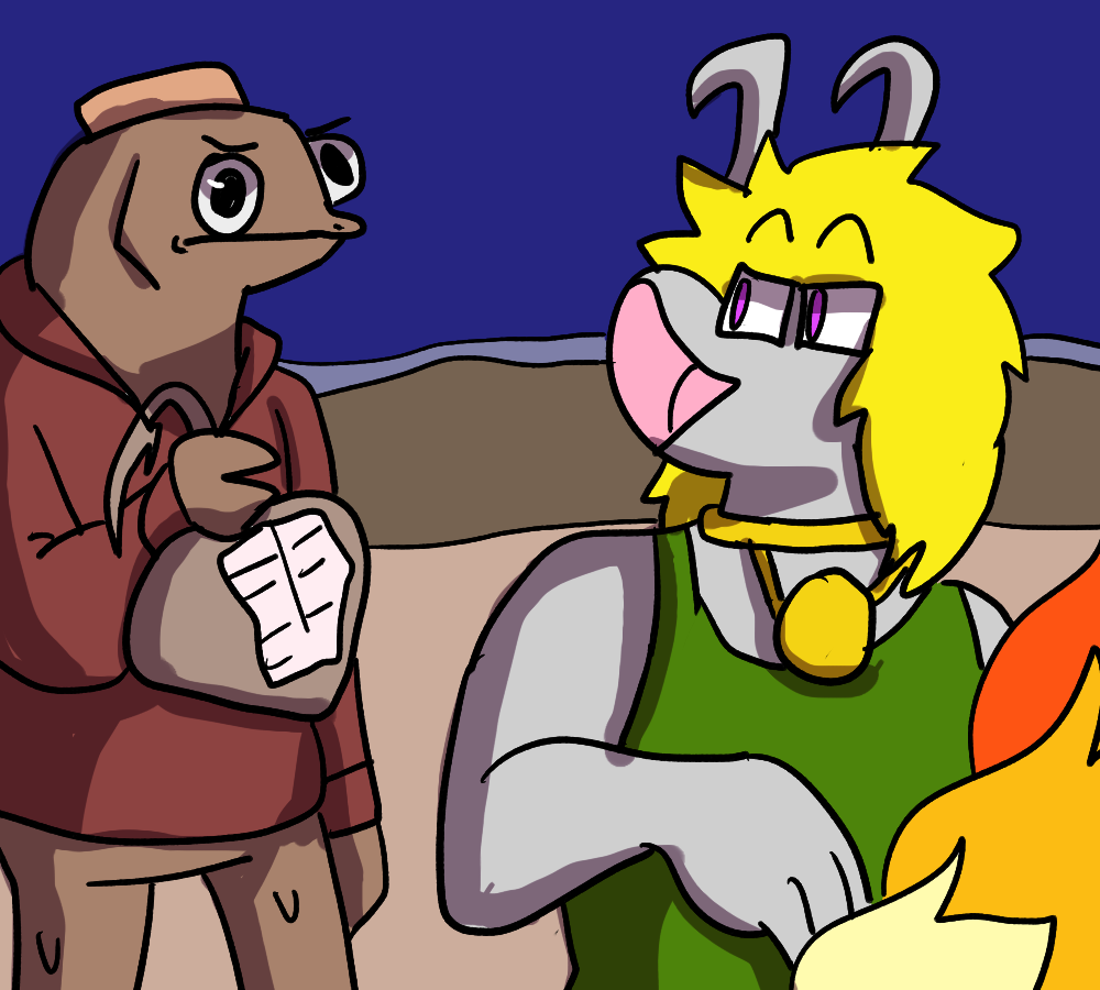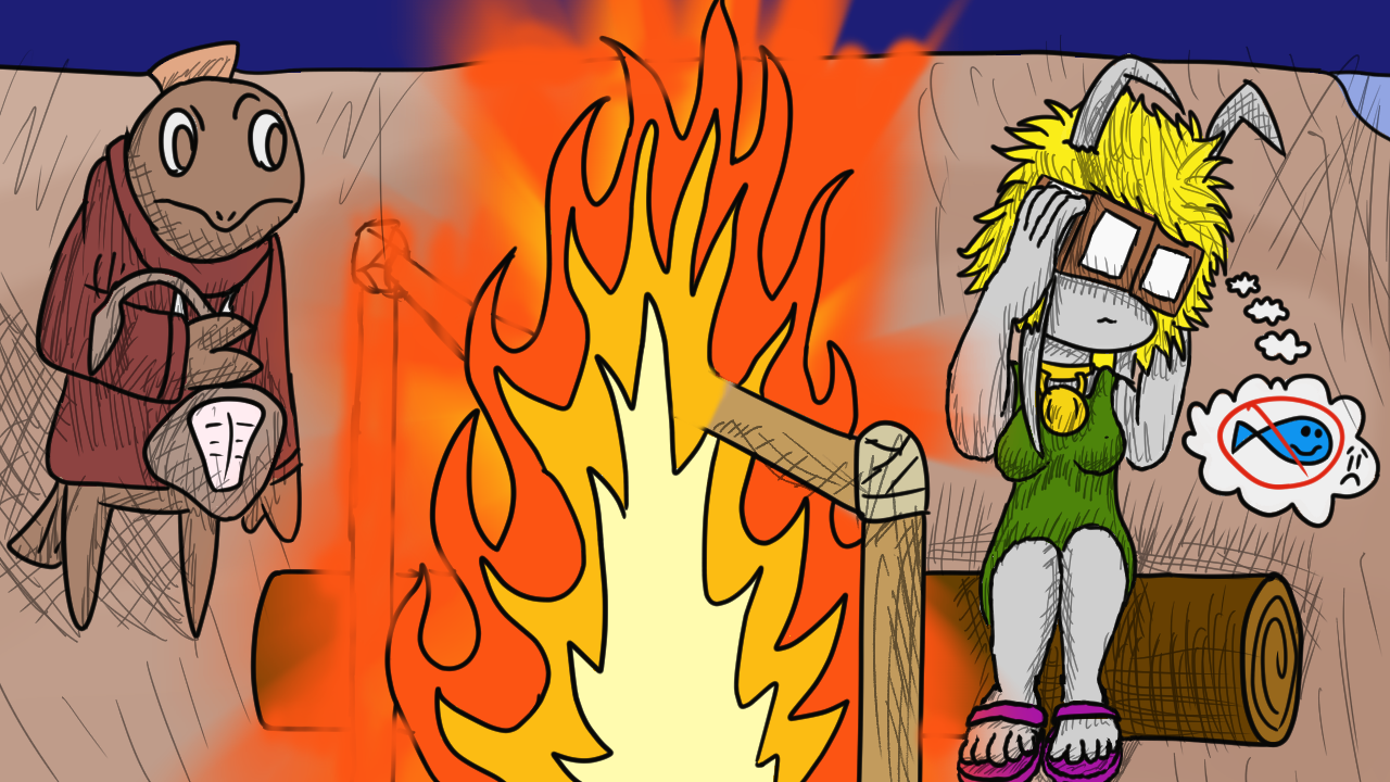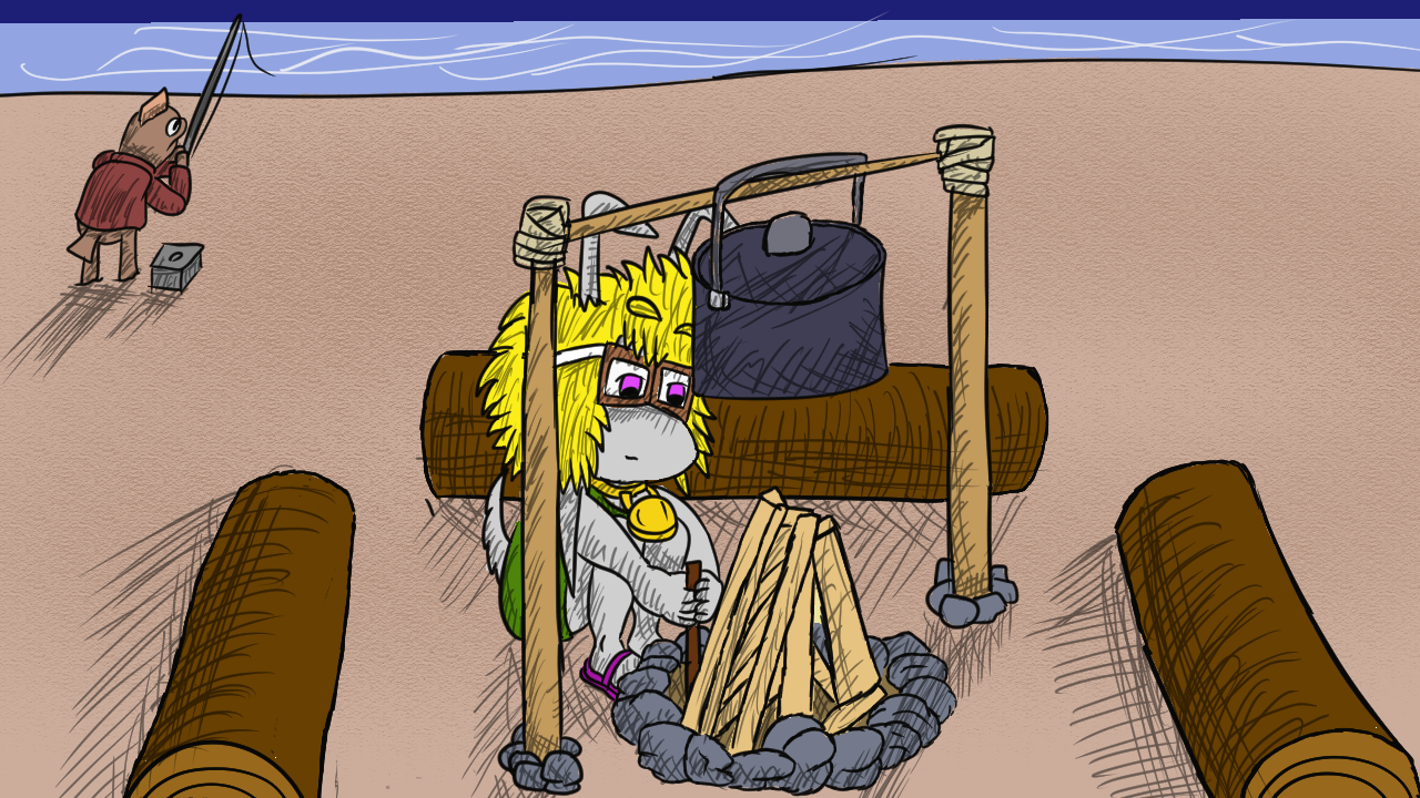 As soon as she finishes the setup however, she is disappointed to find out the fisherman is gone. She was about to give up and leave the beach hungry with no seafood when she notices the stingray the fisherman had is laying on the log between two newcomers sitting at the campfire: some kind of wolf, and some kind of elf. They seem to be more focused on each other rather than her, so she grabs the stingray, and drops it in the pot to let it cook.