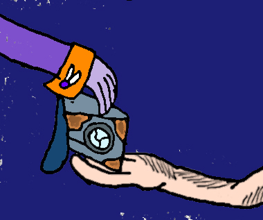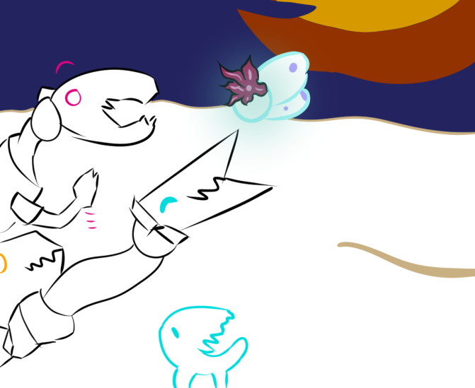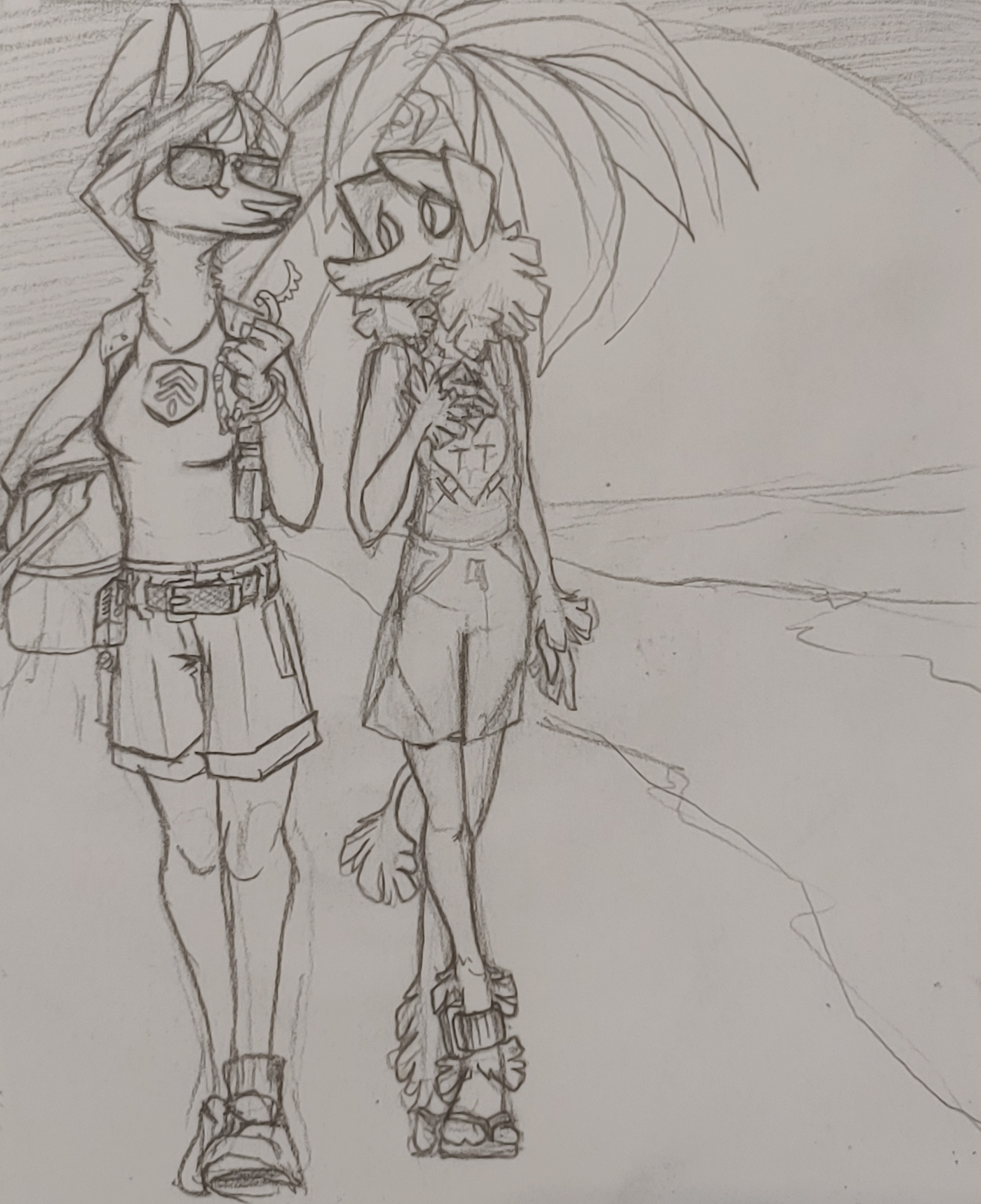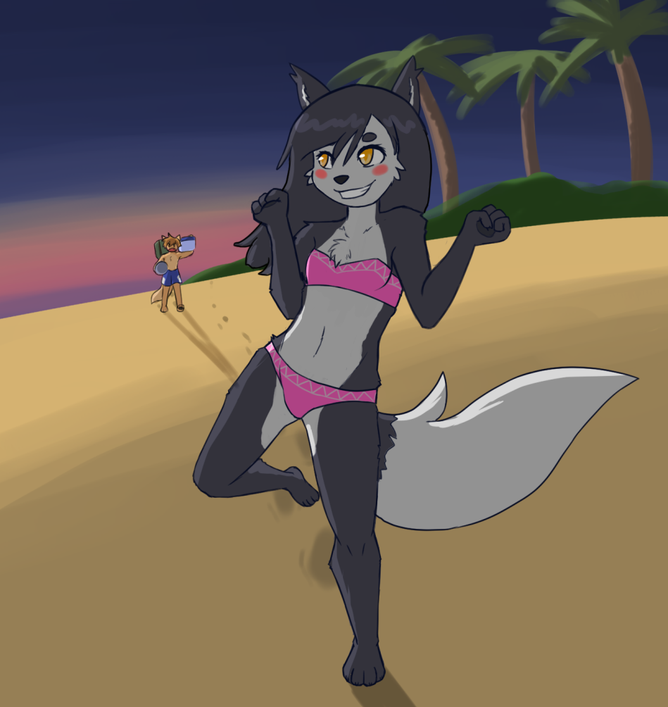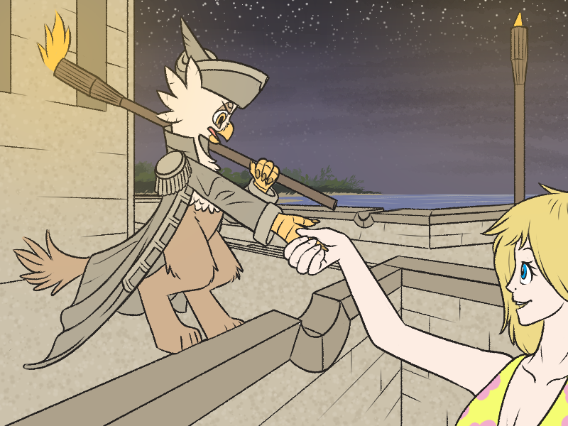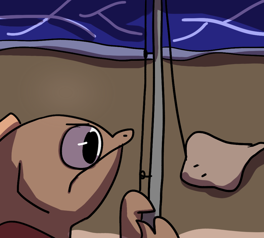 As soon as she finishes the setup however, she is disappointed to find out the fisherman is gone. She was about to give up and leave the beach hungry with no seafood when she notices the stingray the fisherman had is laying on the log between two newcomers sitting at the campfire: some kind of wolf, and some kind of elf. They seem to be more focused on each other rather than her, so she grabs the stingray, and drops it in the pot to let it cook.