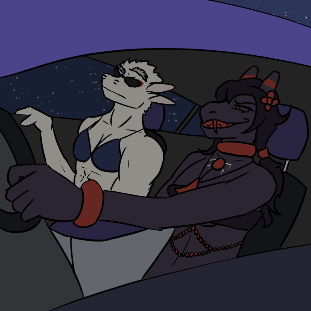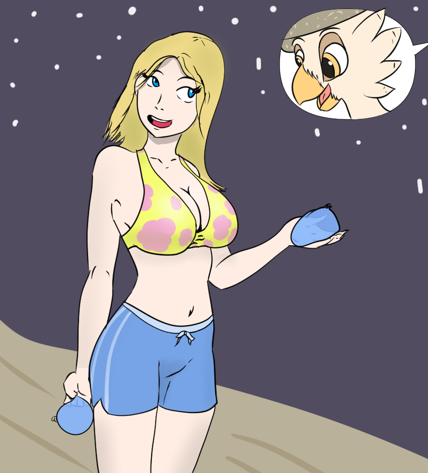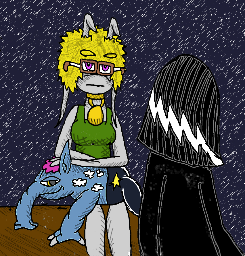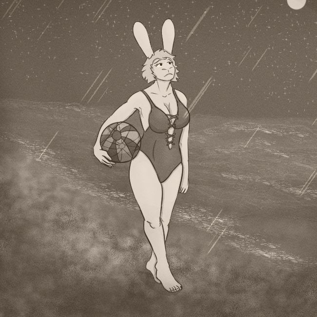Beauregard's Bawdy Beach Ball feels warm against your hip, but your long ears prick to the soft patter of raindrops -- a cool dollop splashing over the bridge of your short snout. You turn your gaze skyward, starts twinkling above midst dark and hazy clouds. Rain, dampening the evening air.
